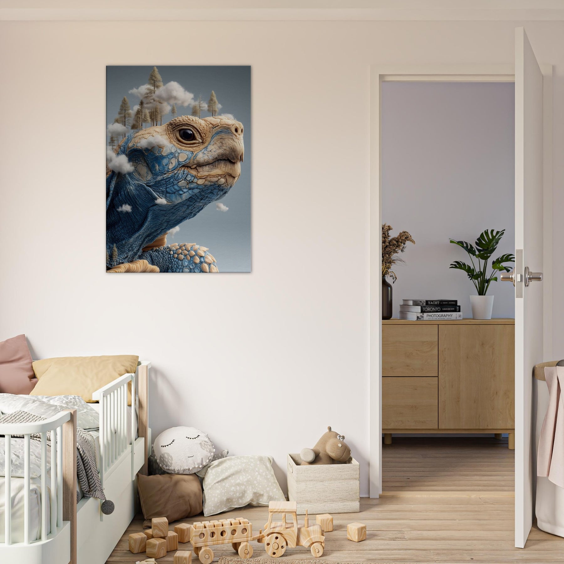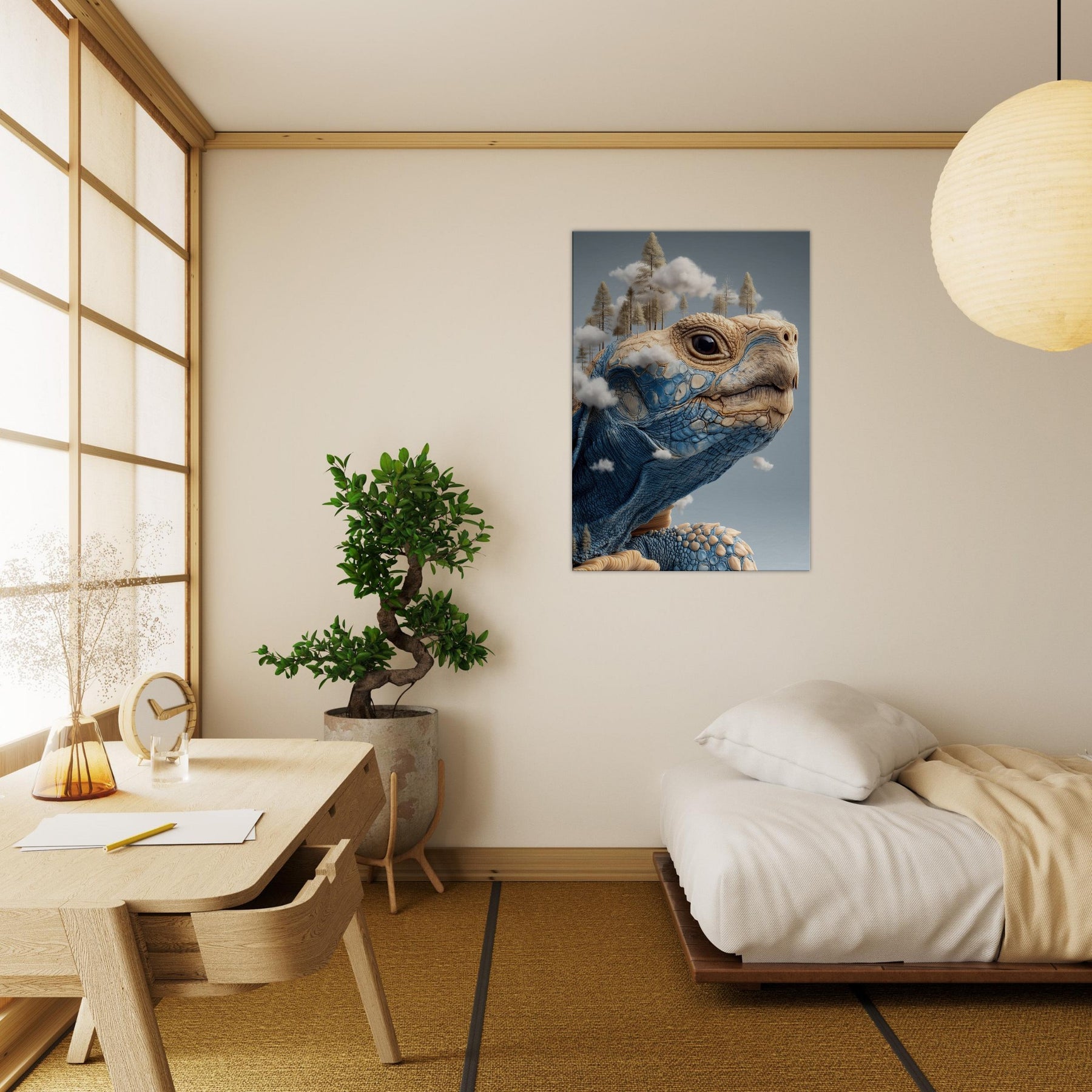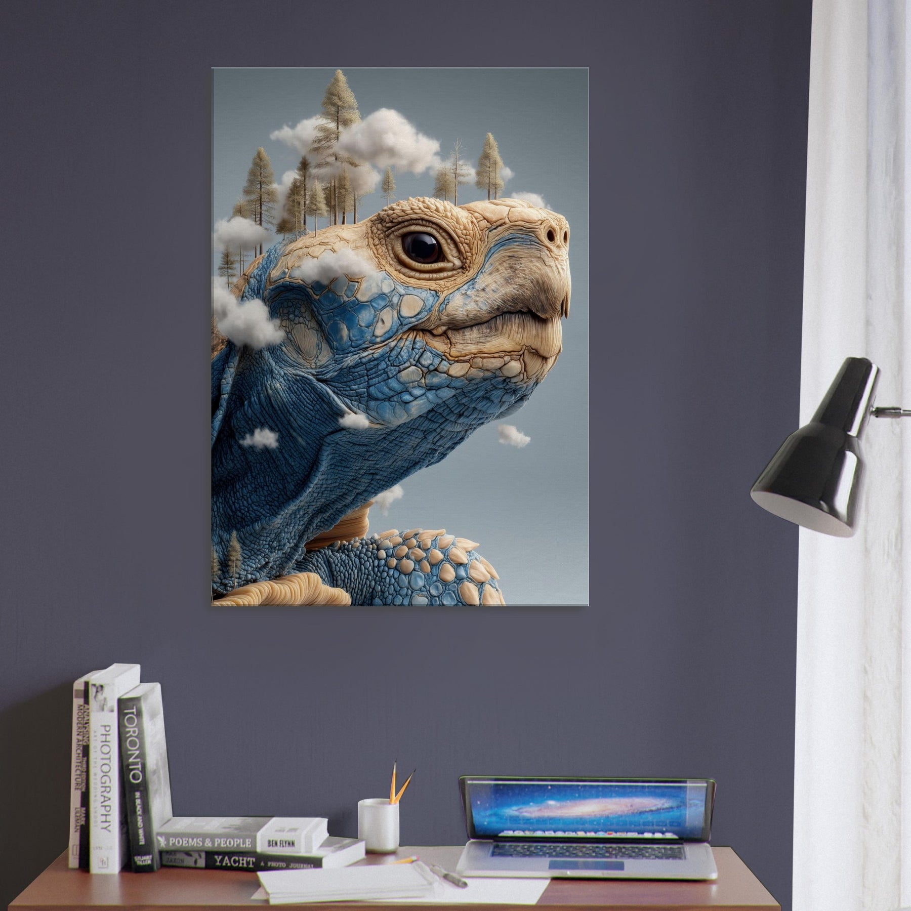 Step into a dream where time unspools across a turtle shell, its scales mapped in oceanic blues and sunlit creams. wisps of cloud drift over a treetop horizon, turning the creature into a floating island of memory and calm. The piece blooms with tactile detail and velvet depth, inviting slow, contemplative viewing from couch or chair. In a living room, it becomes a mood quiet yet expansive a surreal heartbeat that softens angles and infuses the space with imagination and grace.