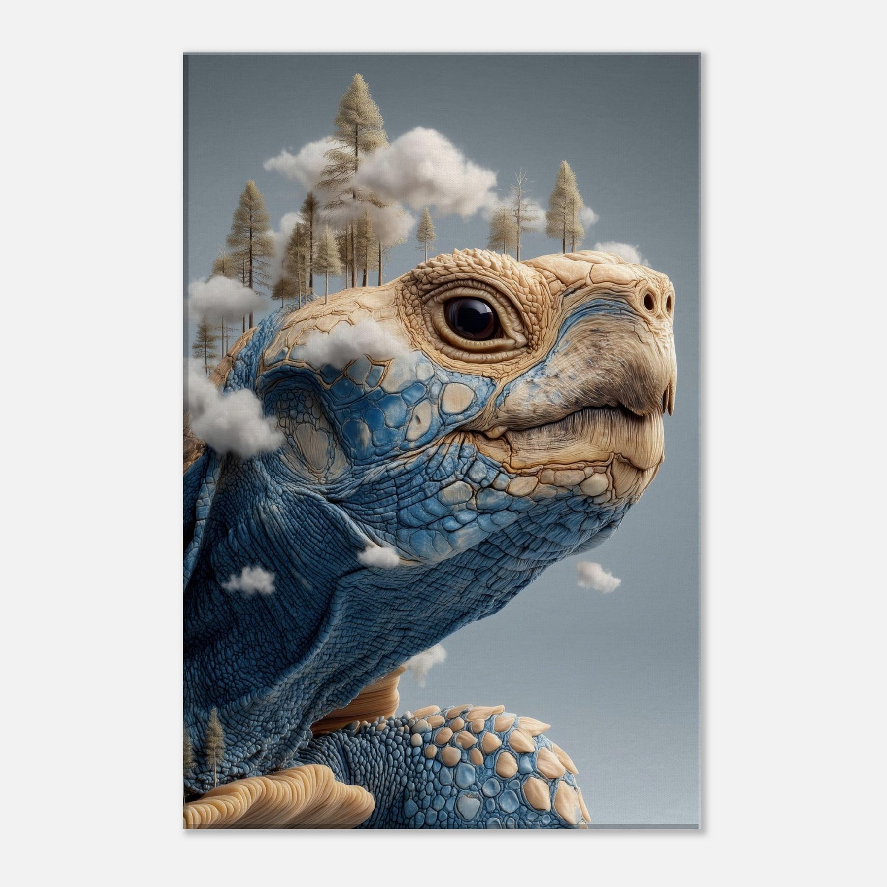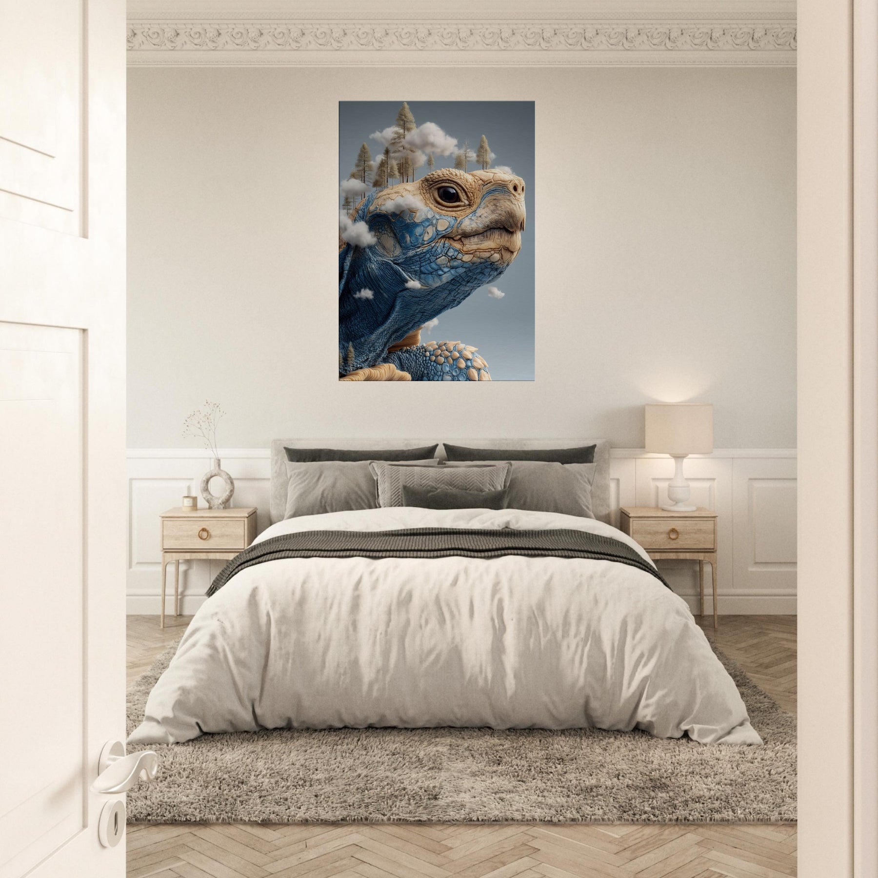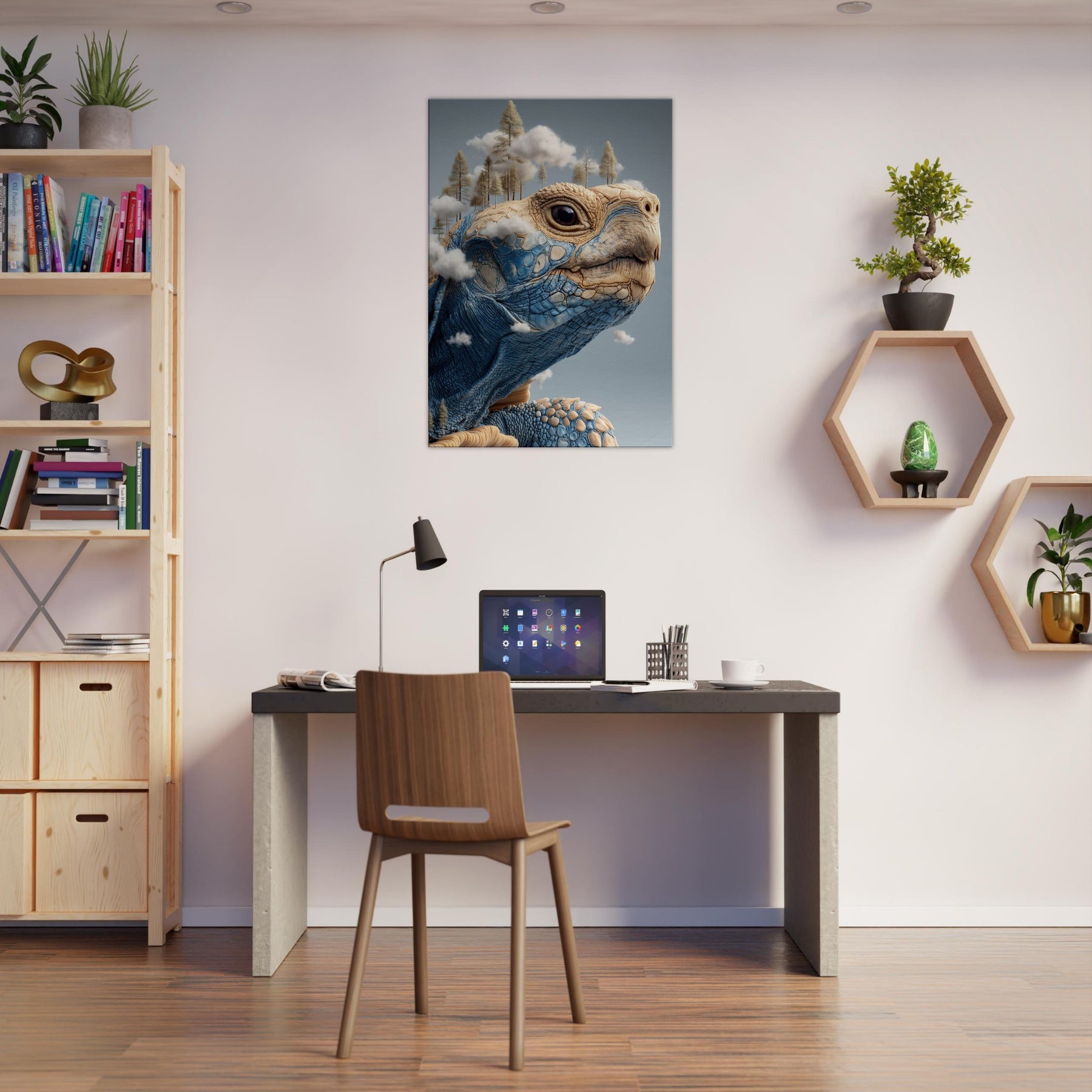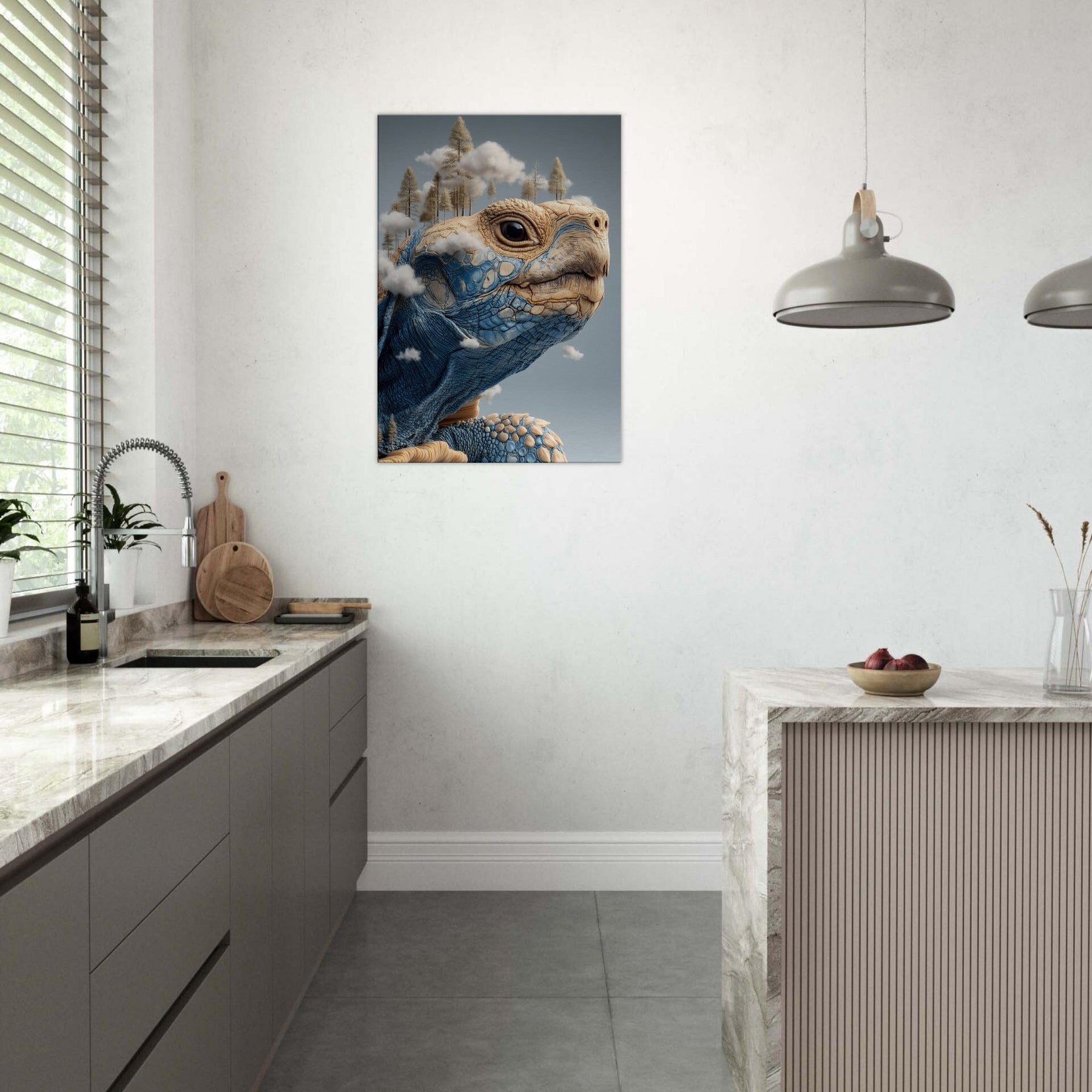 Step into a dream where time unspools across a turtle shell, its scales mapped in oceanic blues and sunlit creams. wisps of cloud drift over a treetop horizon, turning the creature into a floating island of memory and calm. The piece blooms with tactile detail and velvet depth, inviting slow, contemplative viewing from couch or chair. In a living room, it becomes a mood quiet yet expansive a surreal heartbeat that softens angles and infuses the space with imagination and grace.