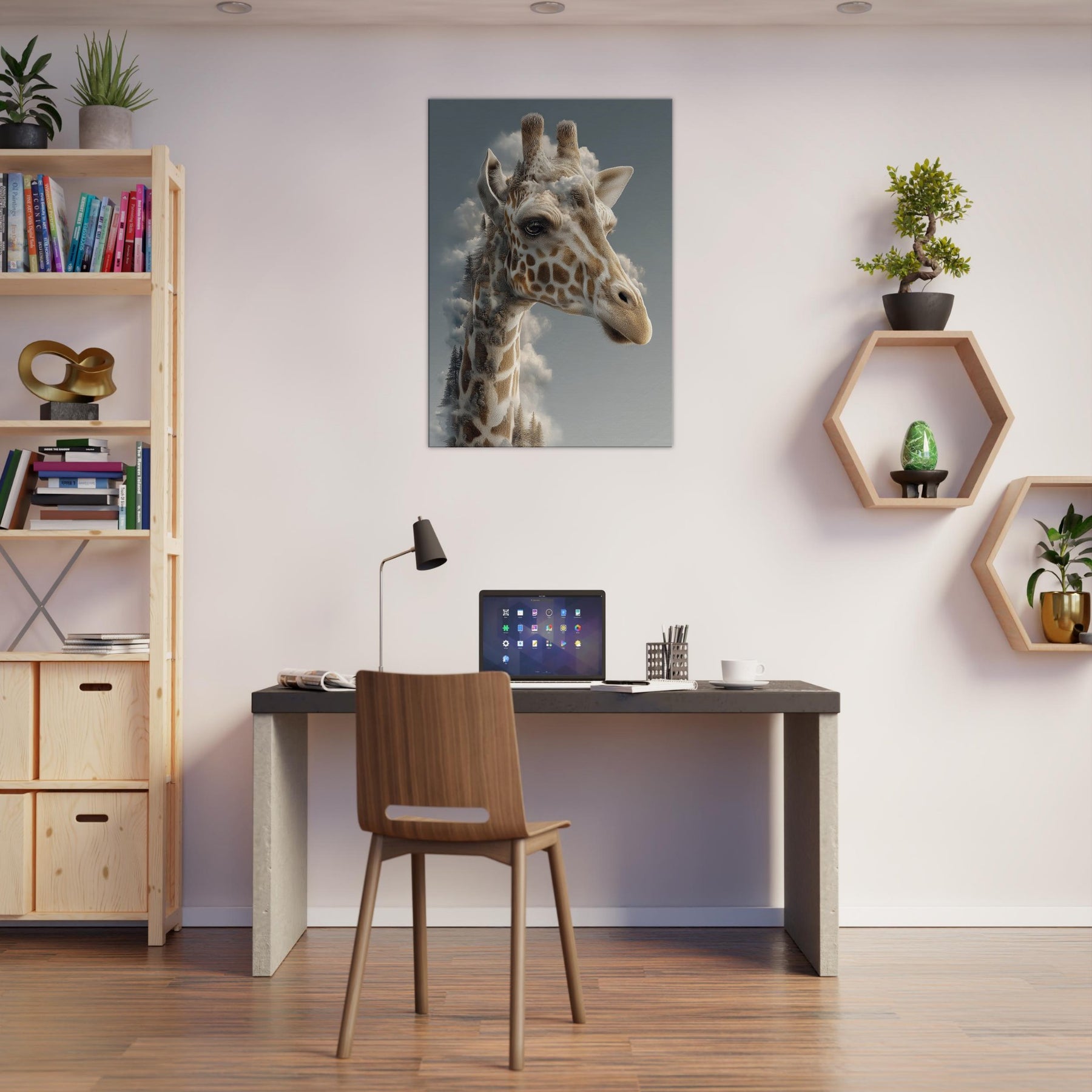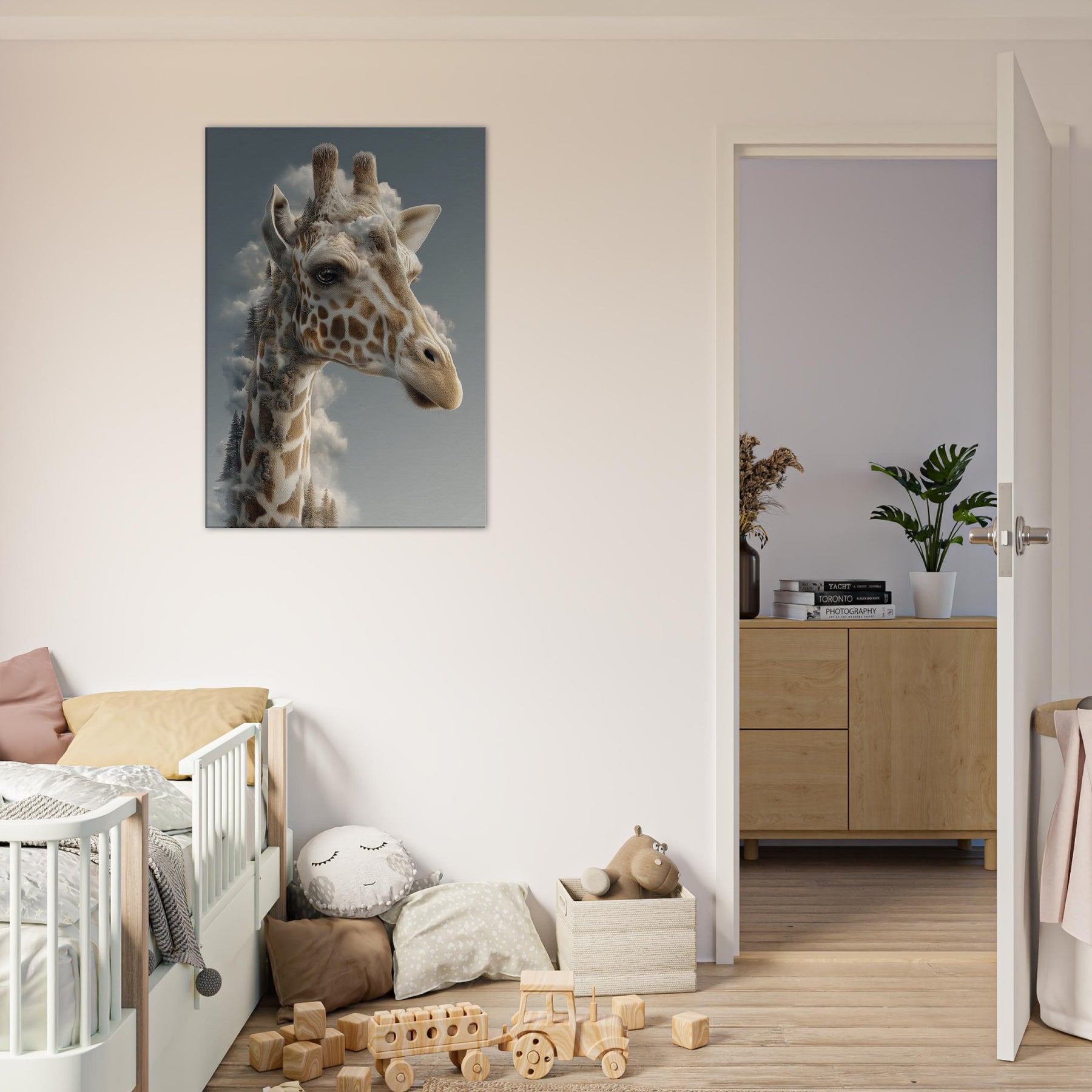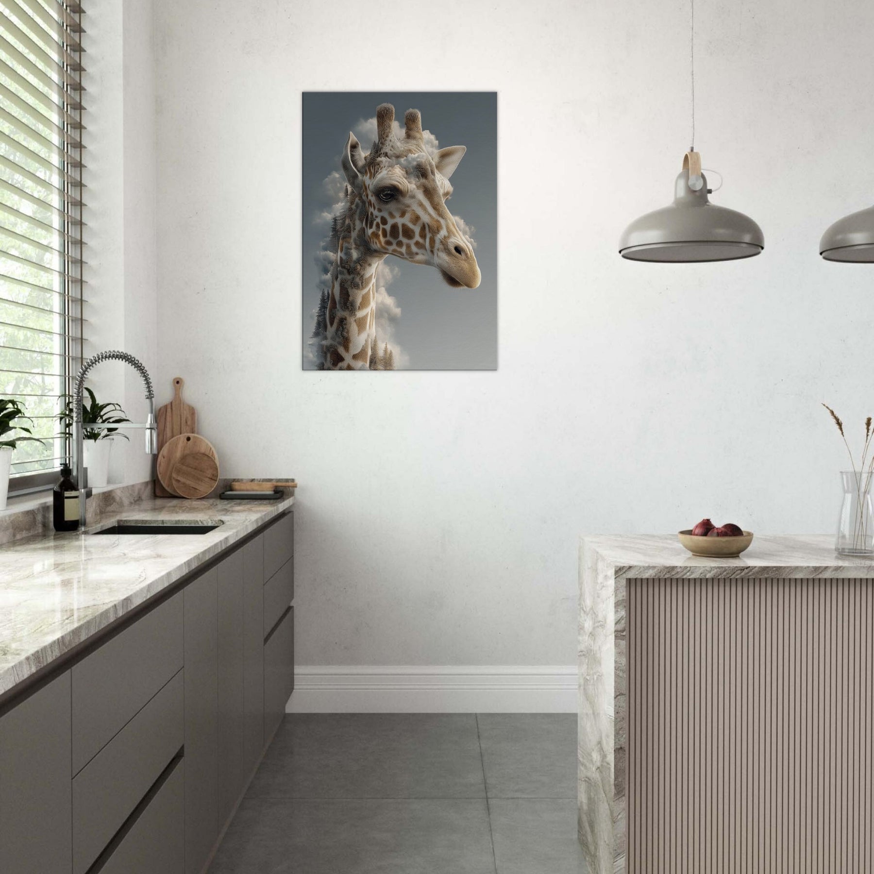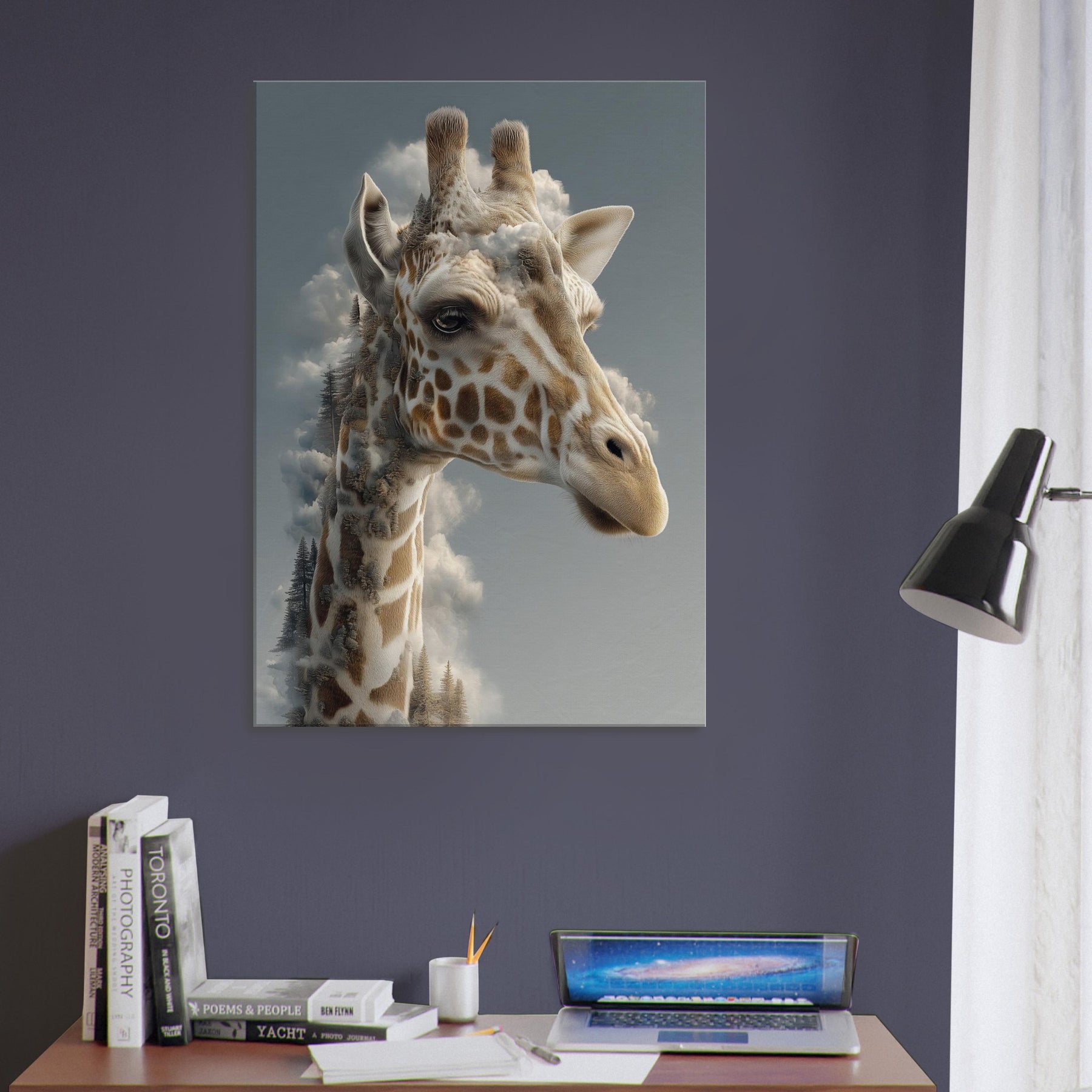 An ethereal Giraffe peeks from a dreamscape where clouds become cliffs and pine trees drift like memories. This Surrealism inspired composition folds and creature into one breathing image, inviting a quiet awe that calms a room and sparks playful thought. Its warm beige and caramel hues glow beside soft lighting, turning a wall into an ever changing window. Perfect as a statement piece in a living room or gallery wall, it invites daily wonder without shouting for attention.