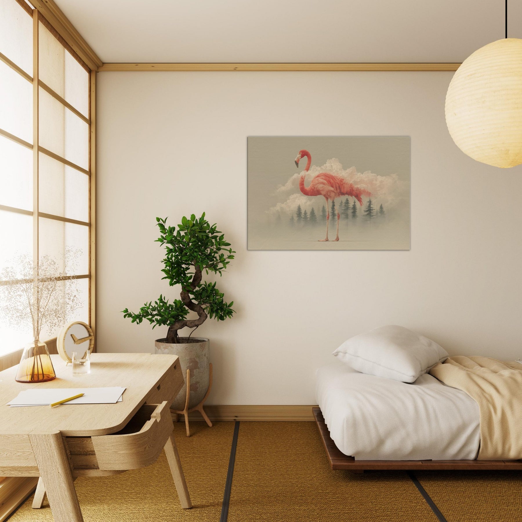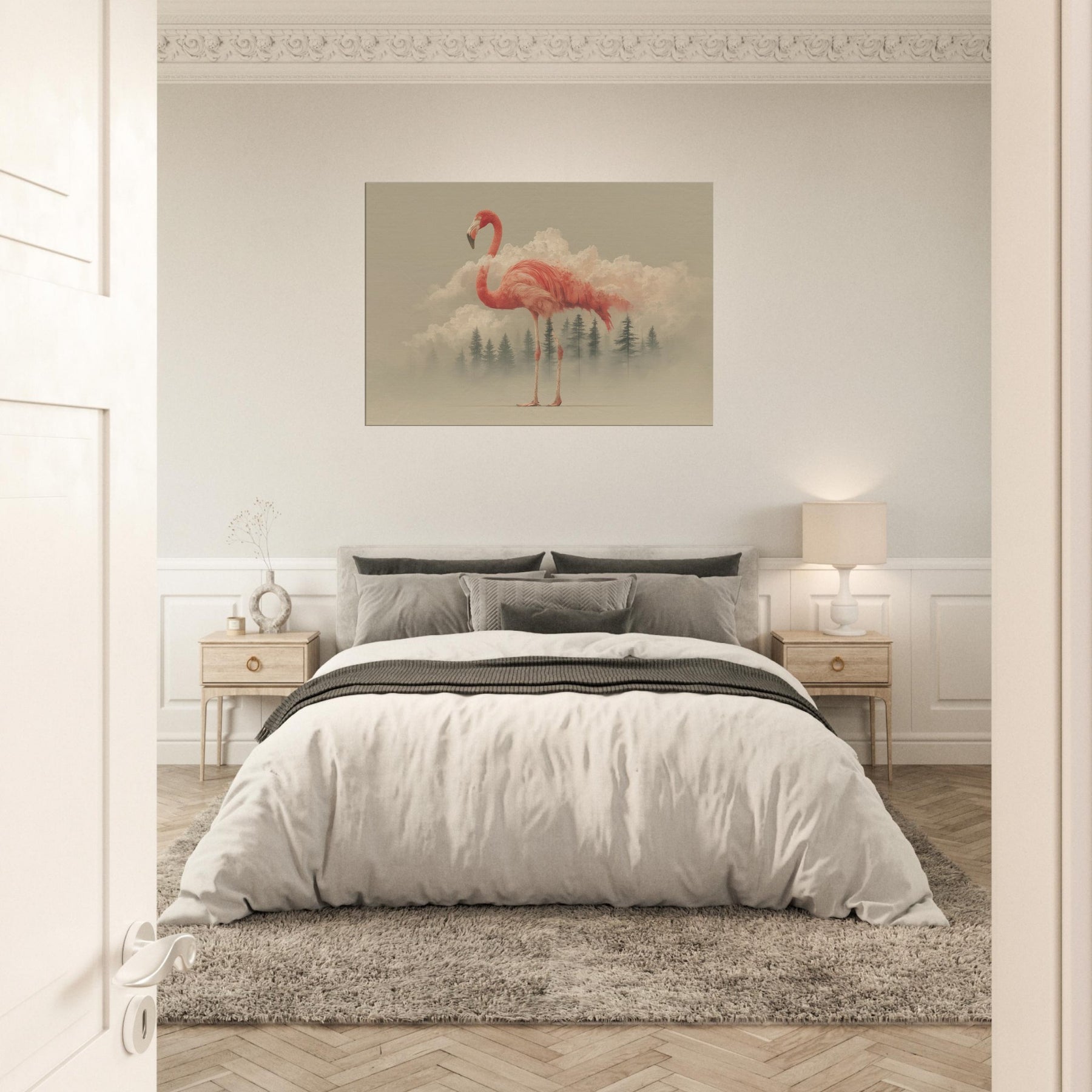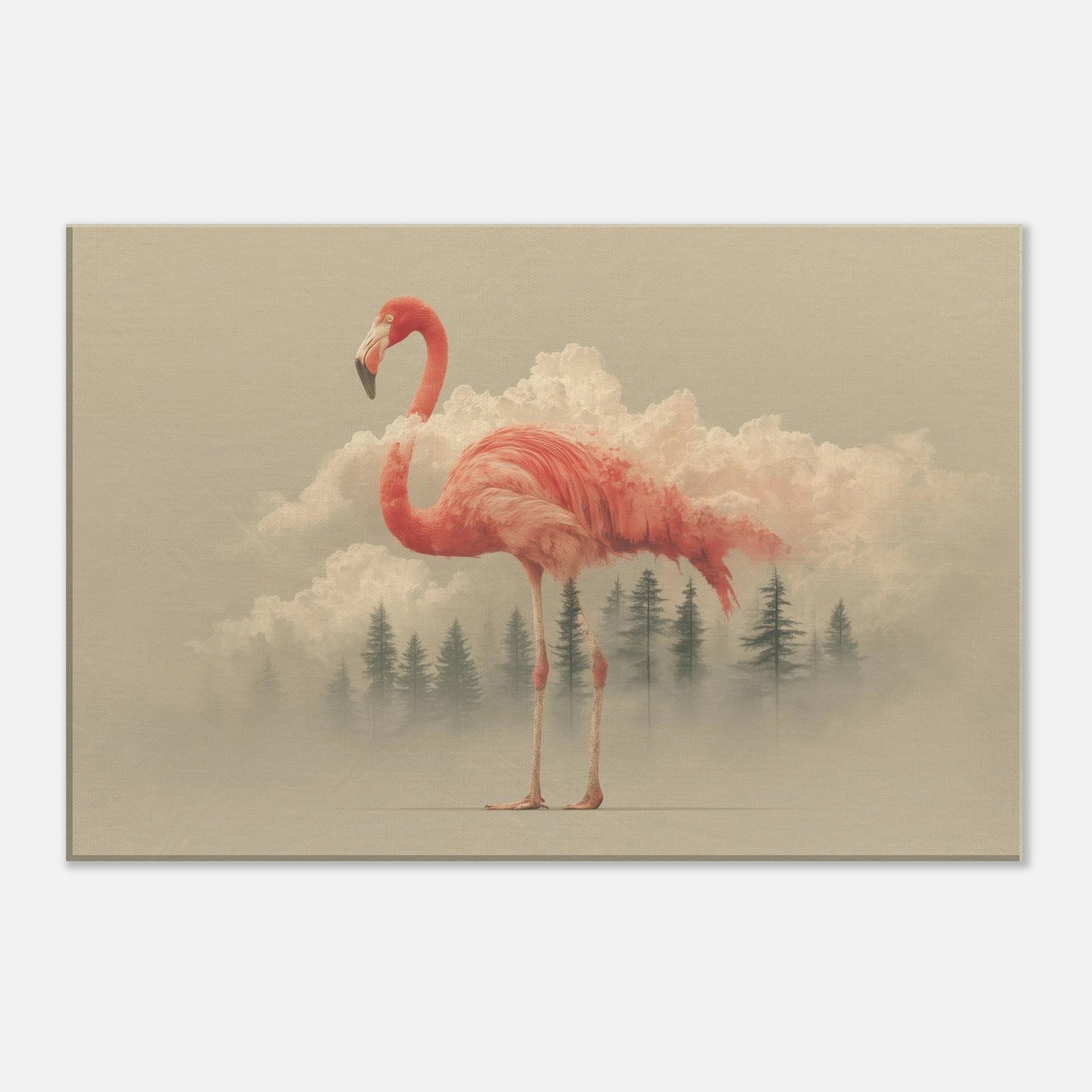 A flamingo rises from a field of dreamlike clouds, its coral plumage a living ember against a pale horizon. The scene blends soft light, mist, and delicate geometry, inviting a contemplative mood that lingers in any room. This surreal composition casts an ethereal glow across walls, turning everyday spaces into a quiet sanctuary. Perfect for entries, living rooms, or bedrooms, it invites slower breaths and gentle wonder as if a fragile creature carried a fragment of the sky into your day.
