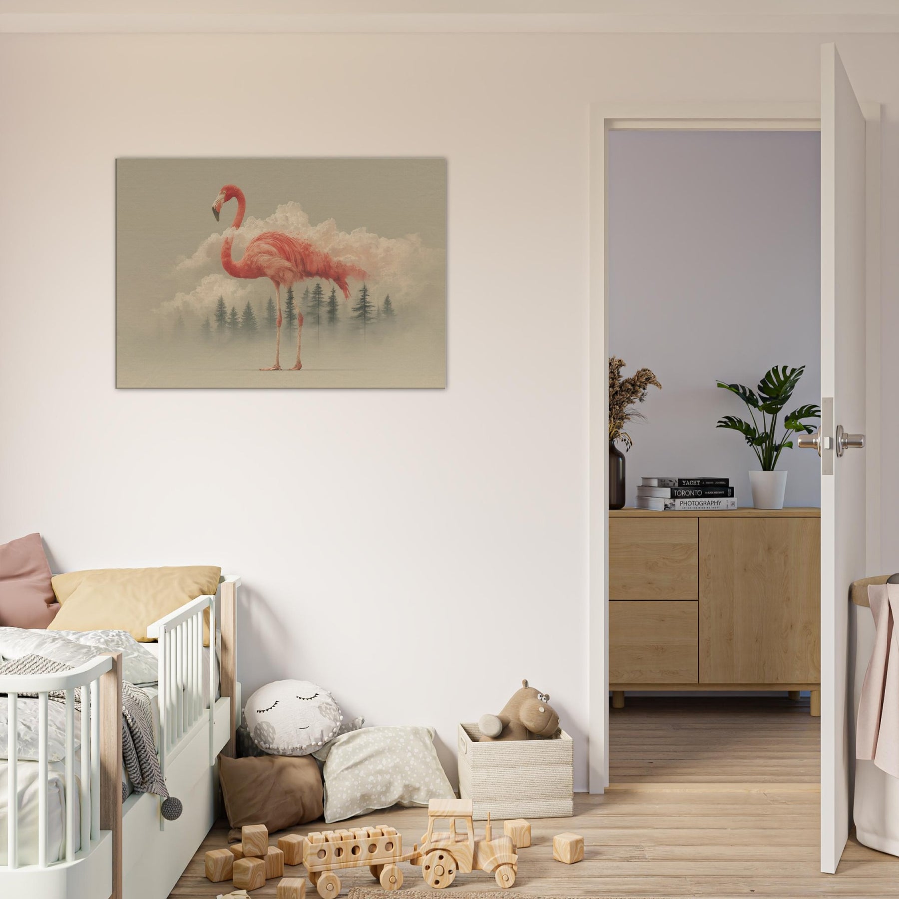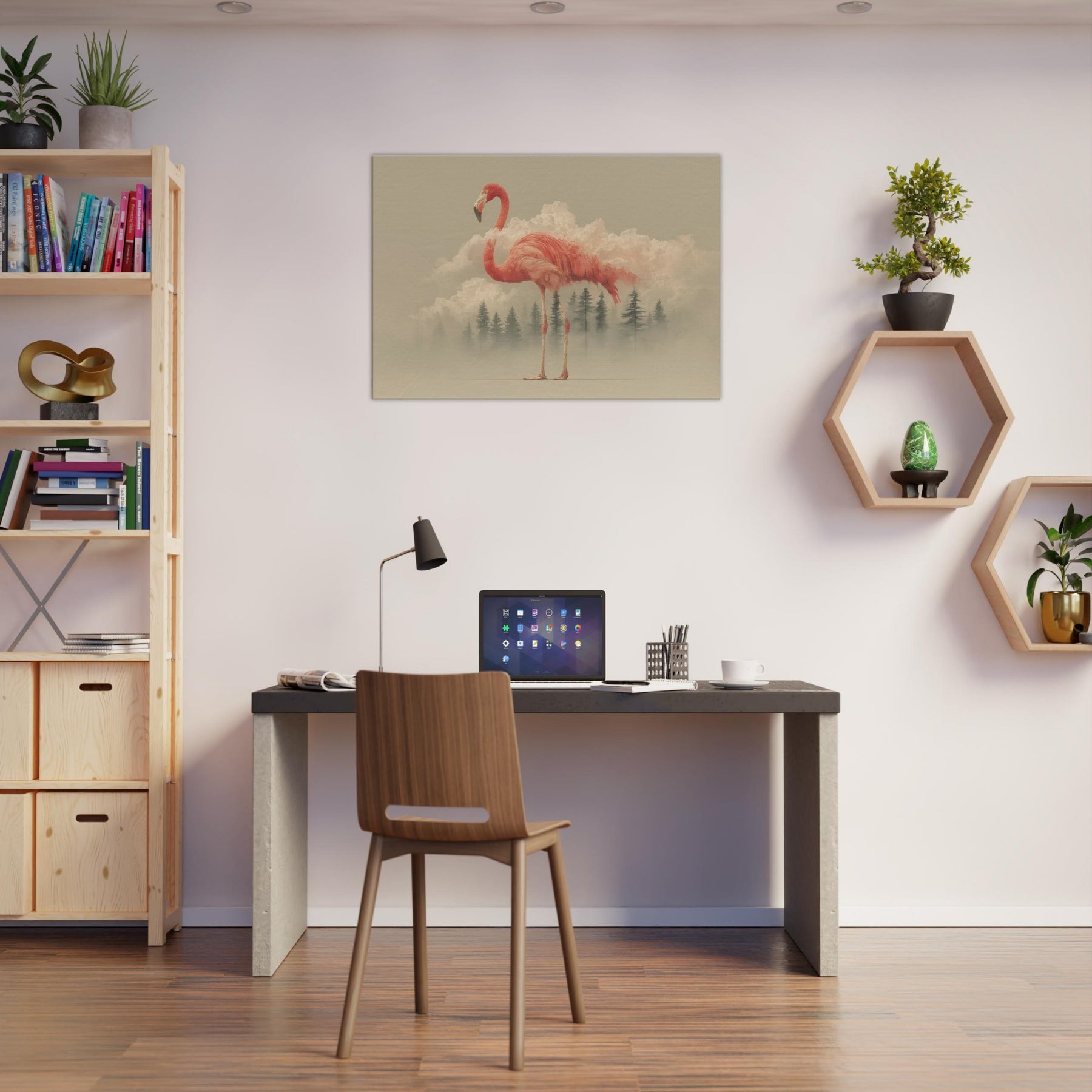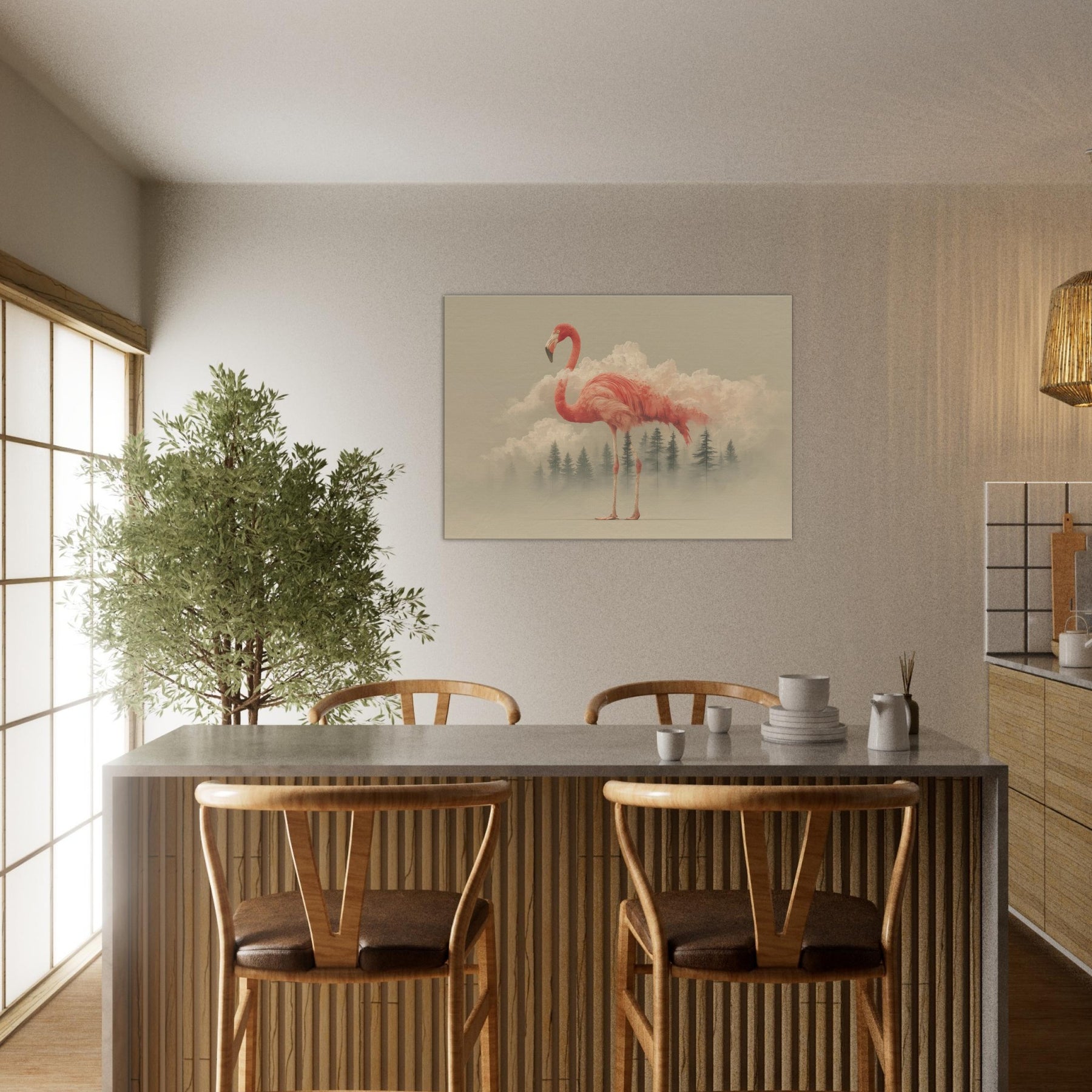 A flamingo rises from a field of dreamlike clouds, its coral plumage a living ember against a pale horizon. The scene blends soft light, mist, and delicate geometry, inviting a contemplative mood that lingers in any room. This surreal composition casts an ethereal glow across walls, turning everyday spaces into a quiet sanctuary. Perfect for entries, living rooms, or bedrooms, it invites slower breaths and gentle wonder as if a fragile creature carried a fragment of the sky into your day.