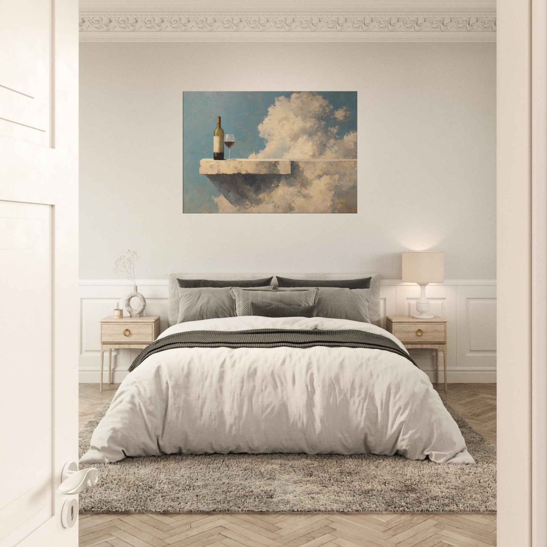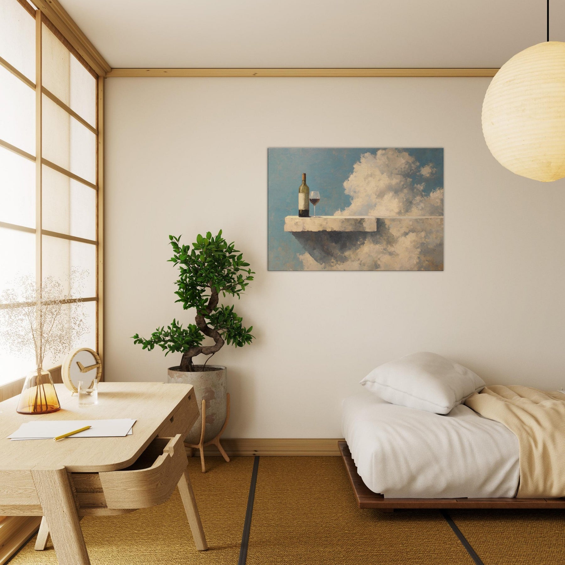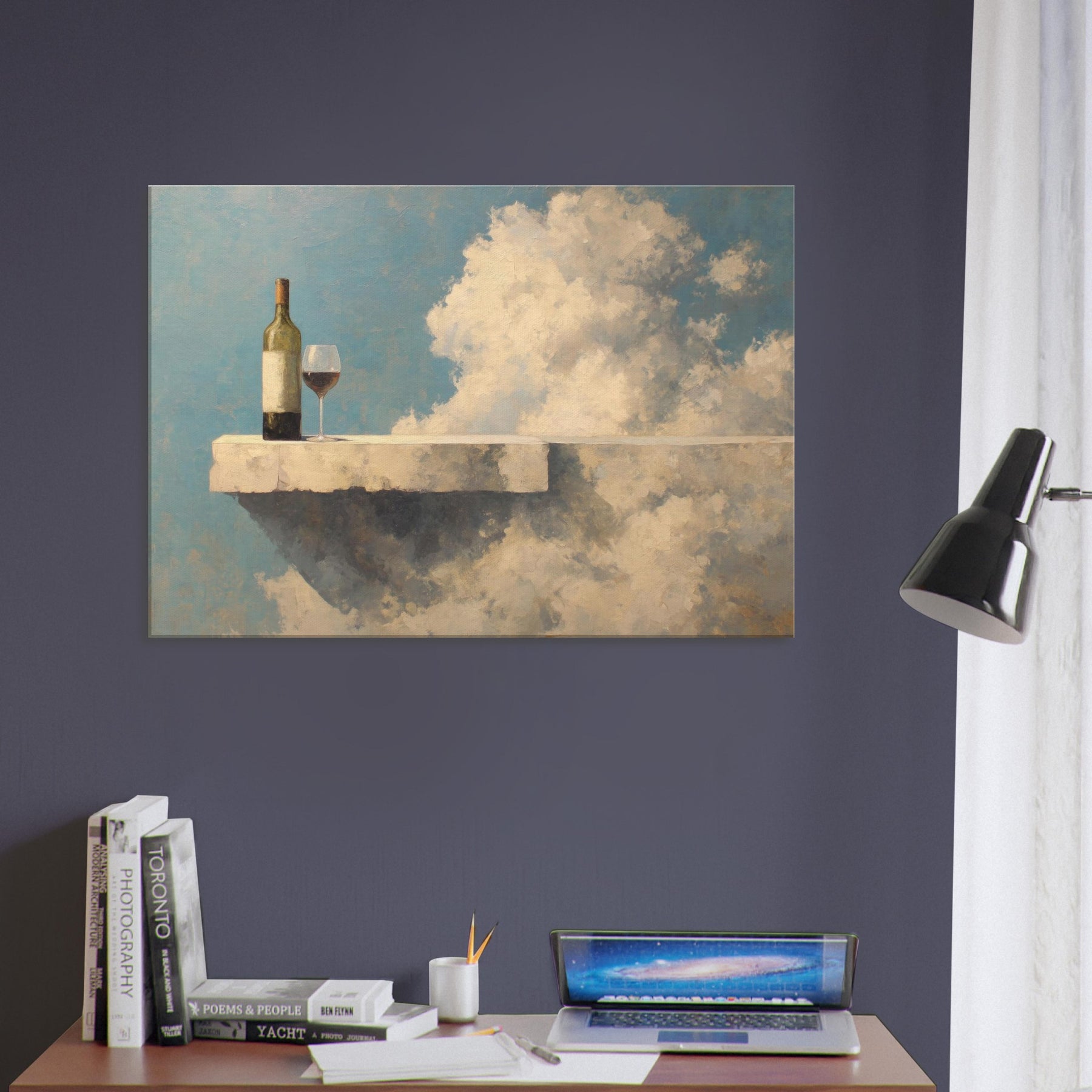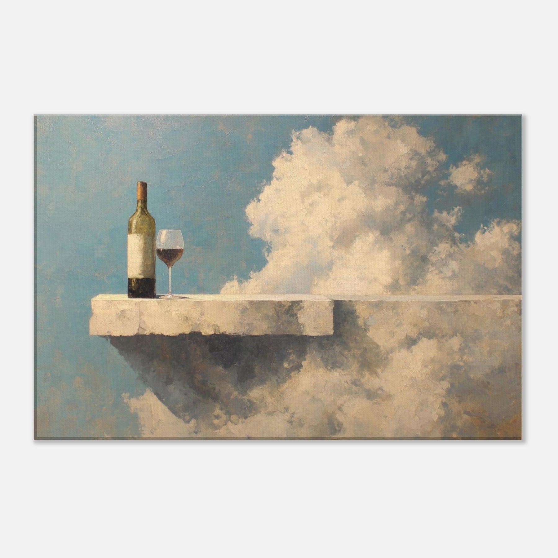 Wine Bottle and Glass lounges on a pale ledge between memory and sky. Painted with dreamlike calm, it invites a hushed reverie where gravity loosens and time stretches. The bottle silhouette and the slender wine glass catch a soft, sunlit glow, casting long shadows over a cloud swept horizon. This surreal tableau turns a simple moment into ceremony, a quiet focal point that deepens a room's atmosphere. Perfect above a sofa or in a hallway, it lends romance, introspection, and refined, ethereal warmth.