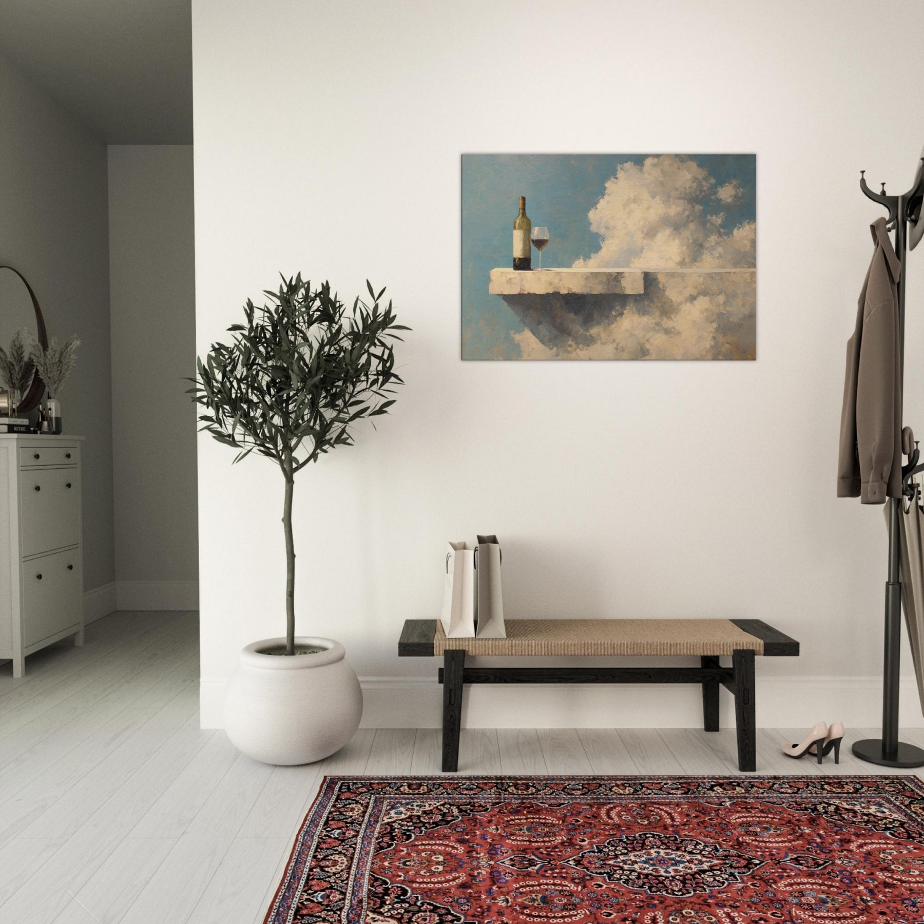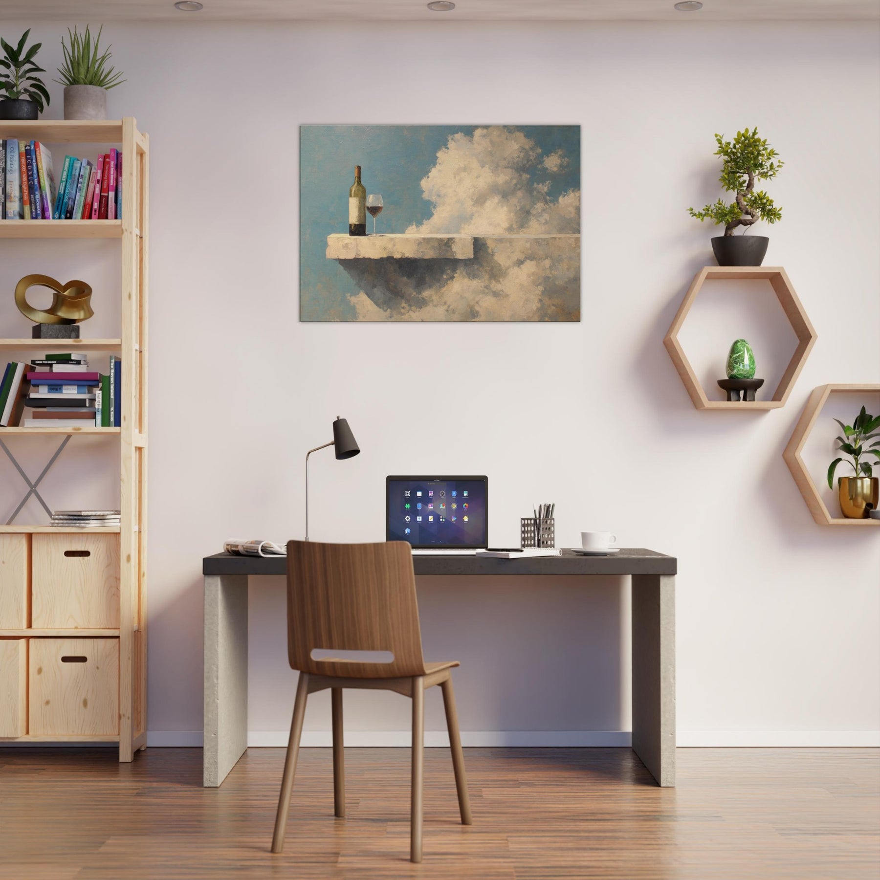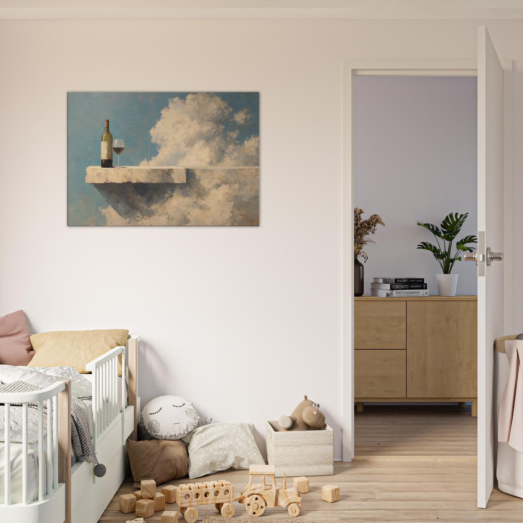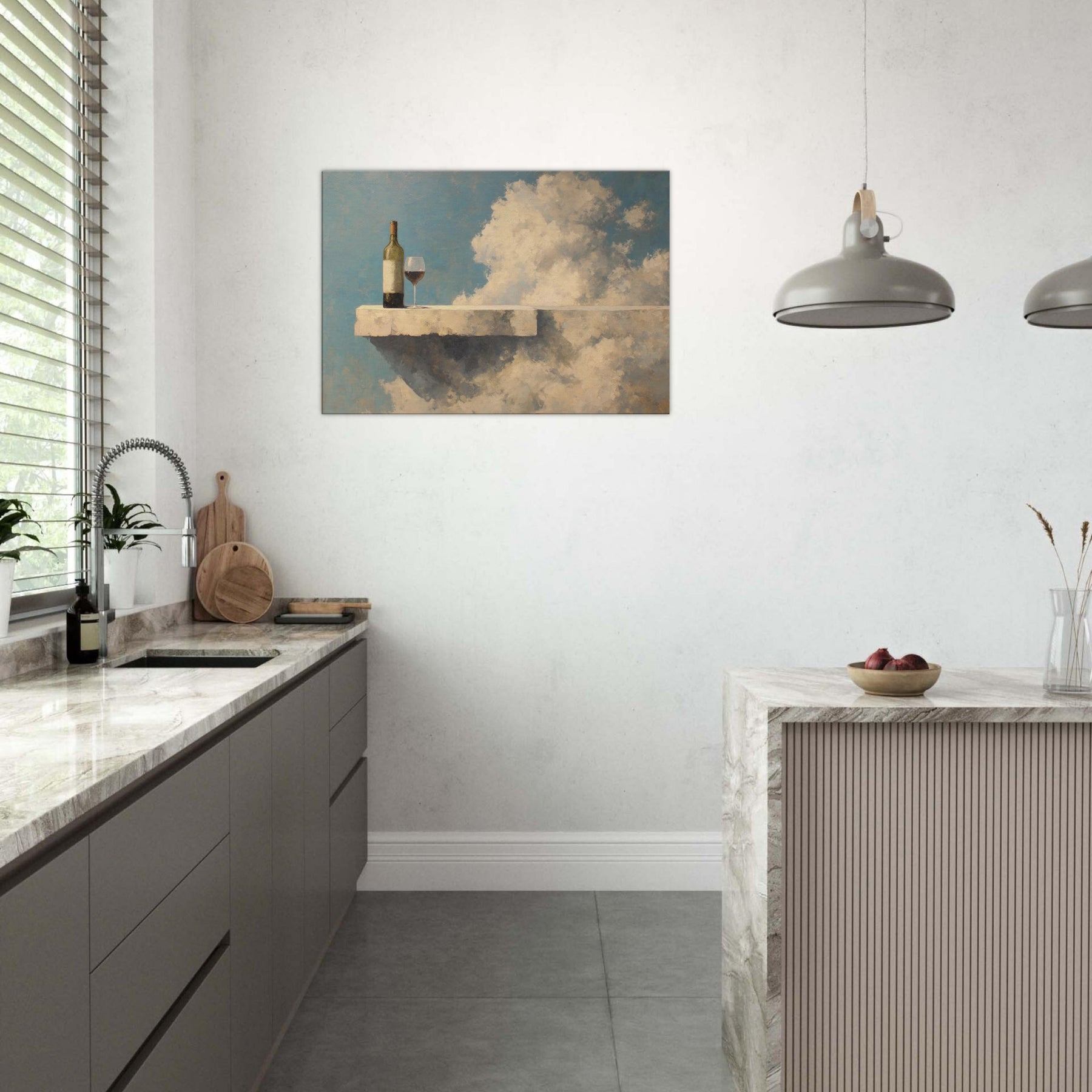 Wine Bottle and Glass lounges on a pale ledge between memory and sky. Painted with dreamlike calm, it invites a hushed reverie where gravity loosens and time stretches. The bottle silhouette and the slender wine glass catch a soft, sunlit glow, casting long shadows over a cloud swept horizon. This surreal tableau turns a simple moment into ceremony, a quiet focal point that deepens a room's atmosphere. Perfect above a sofa or in a hallway, it lends romance, introspection, and refined, ethereal warmth.