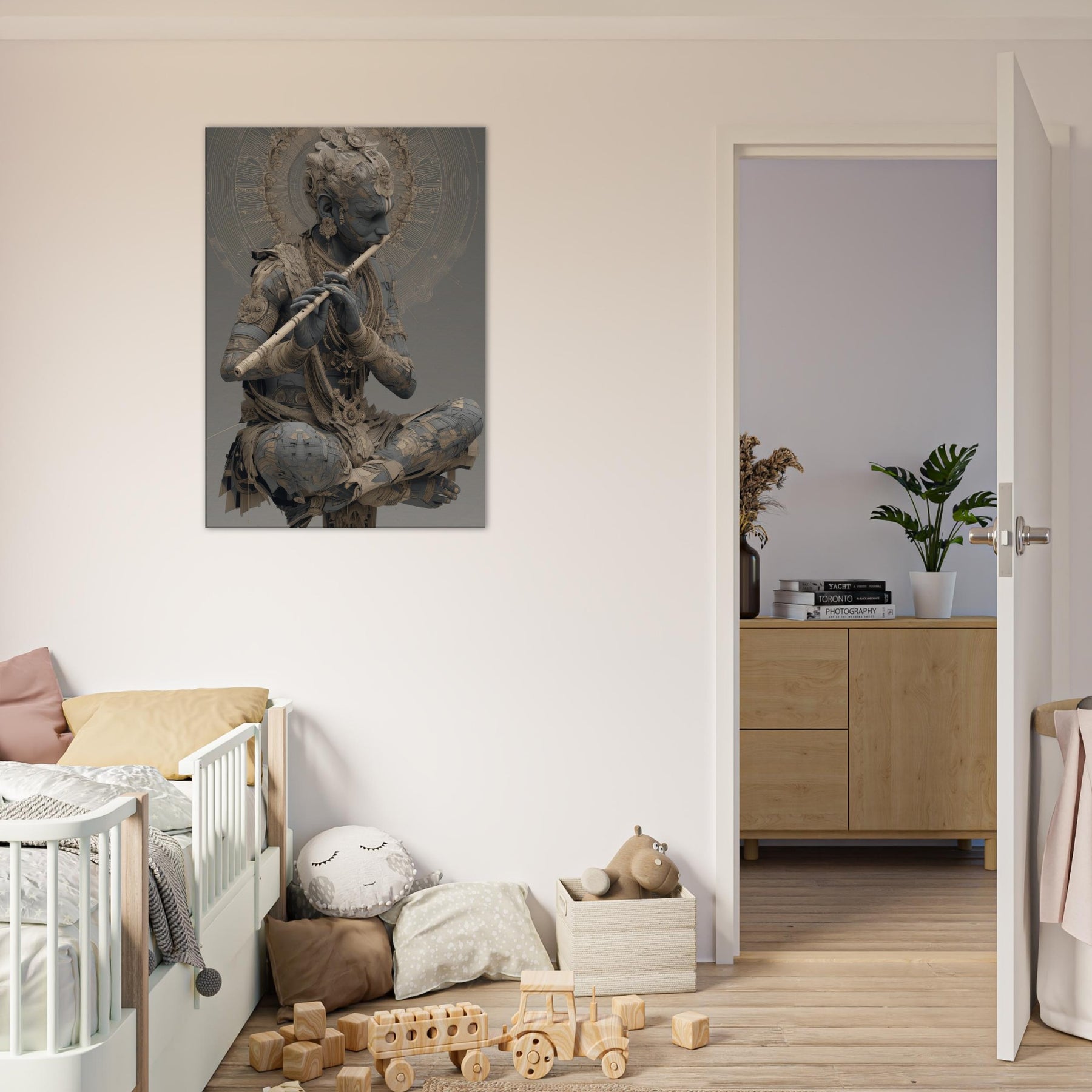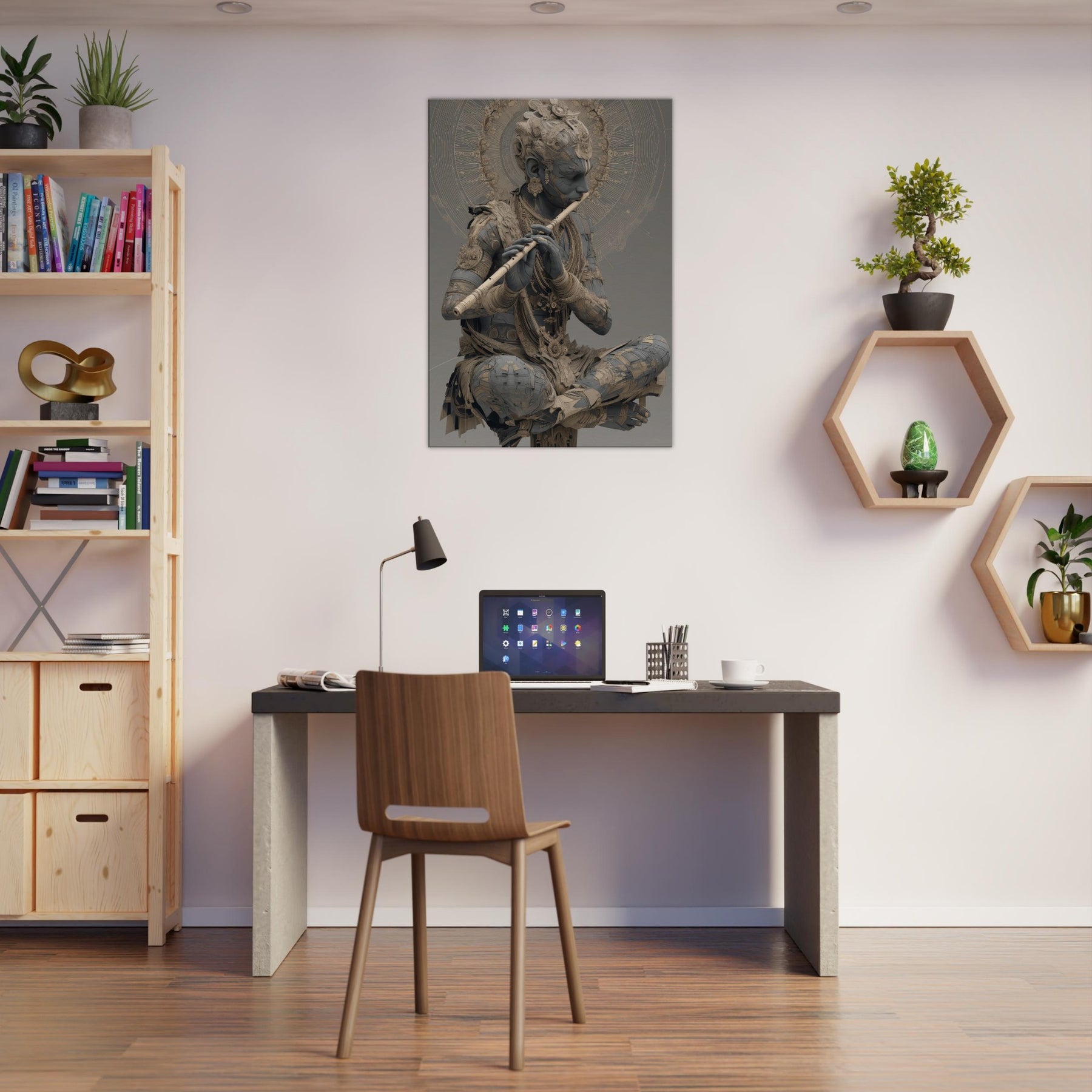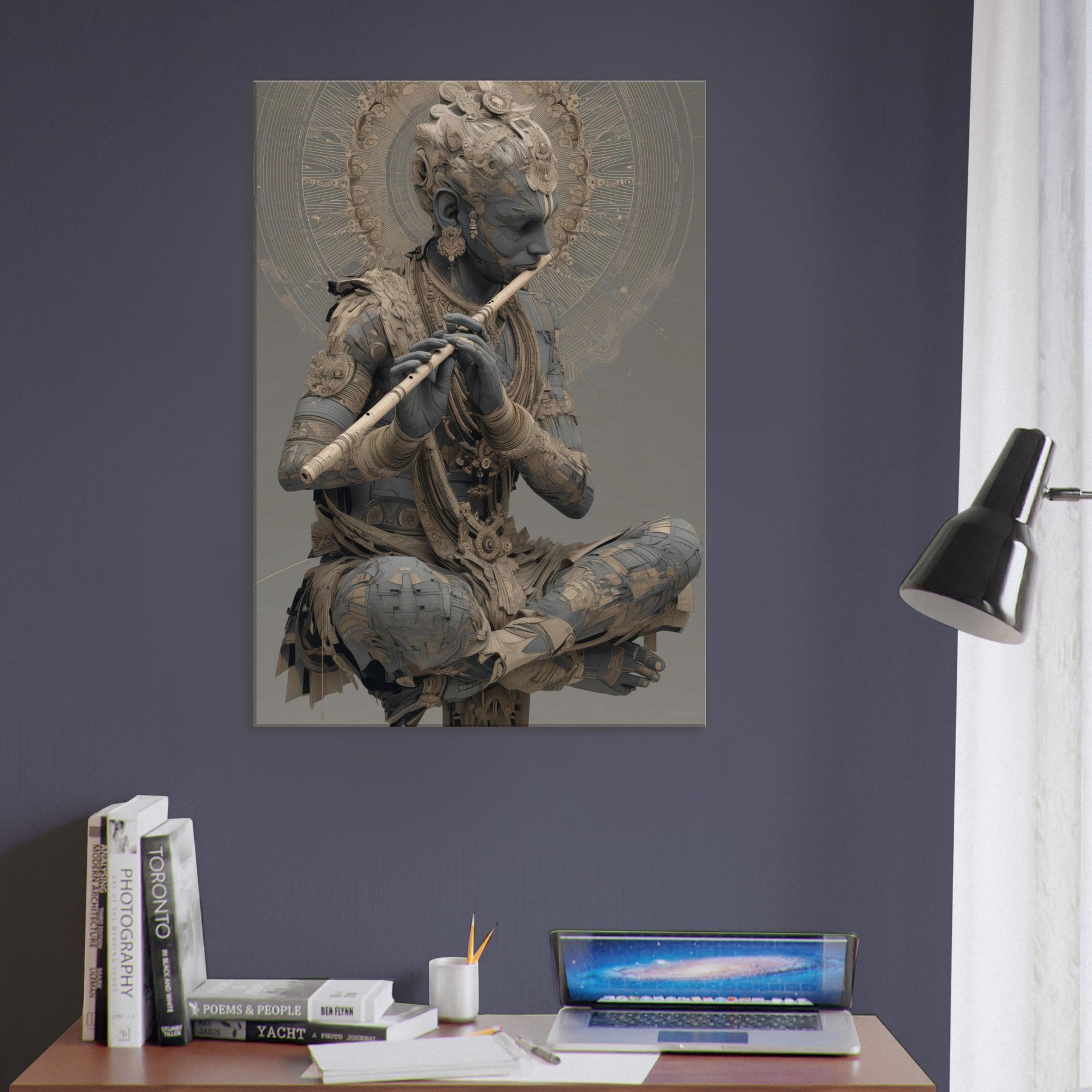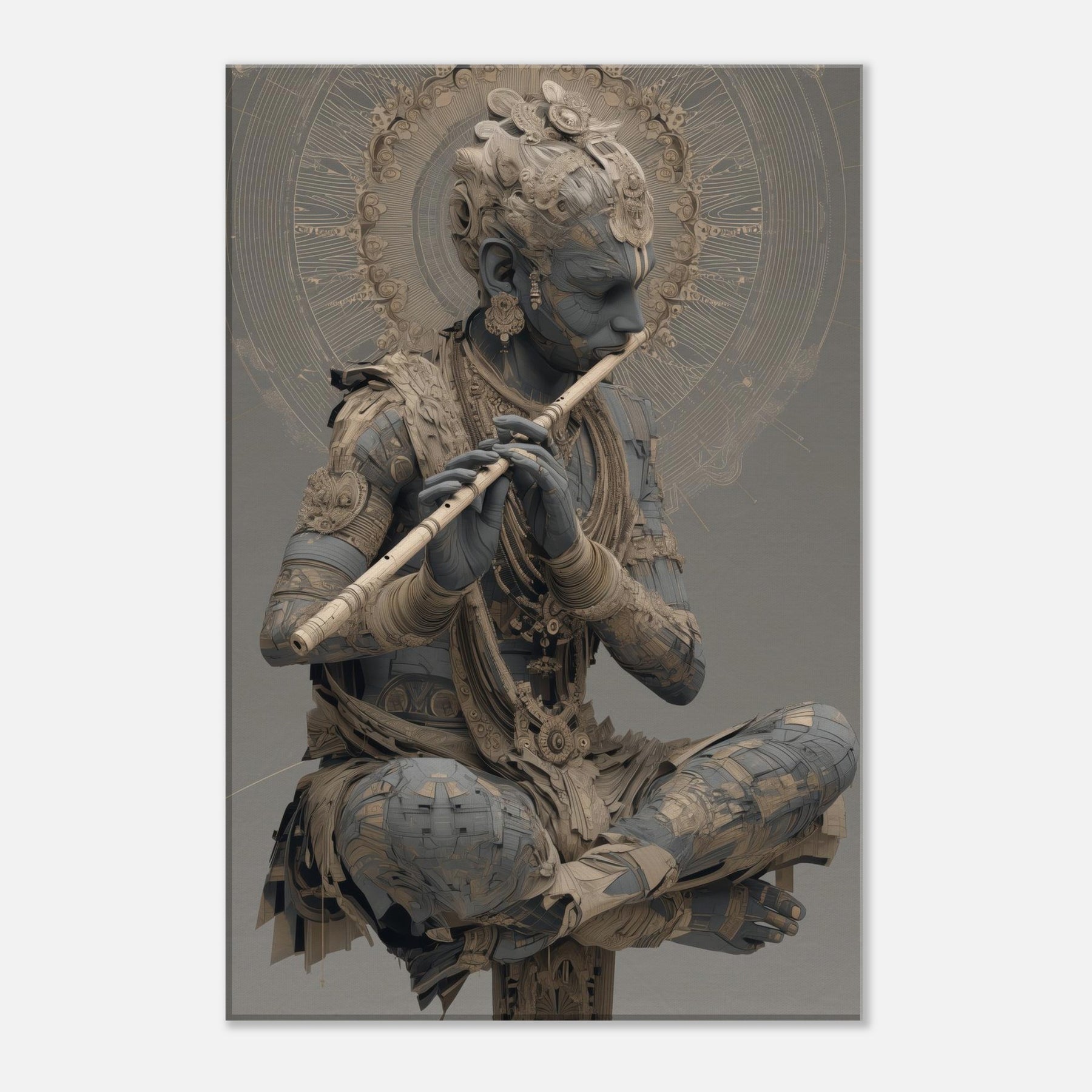 Immerse your space in a dream where melody becomes form. Krishna with Flute sits in a quiet halo, his figure woven from delicate gears and petals, as if time itself hums a soft rhythm. The air shimmers with wind swept mandalas and luminous undertones, inviting a meditative breath that slows the room and invites stillness. This piece channels mystical devotion into contemporary home ambiance, turning a wall into a sanctuary of sound, light, and memory a sculptural hymn you can live with every day.