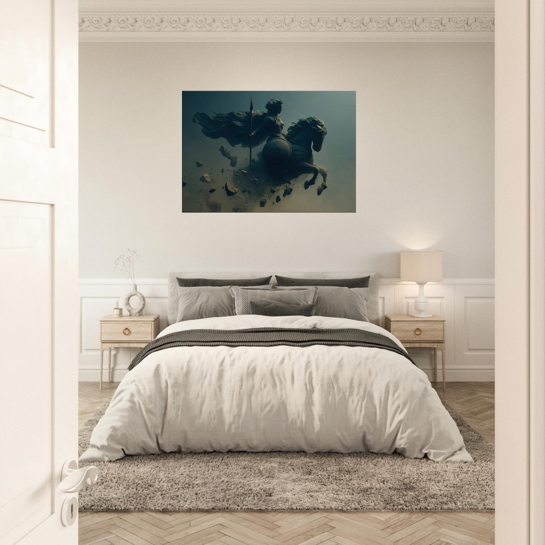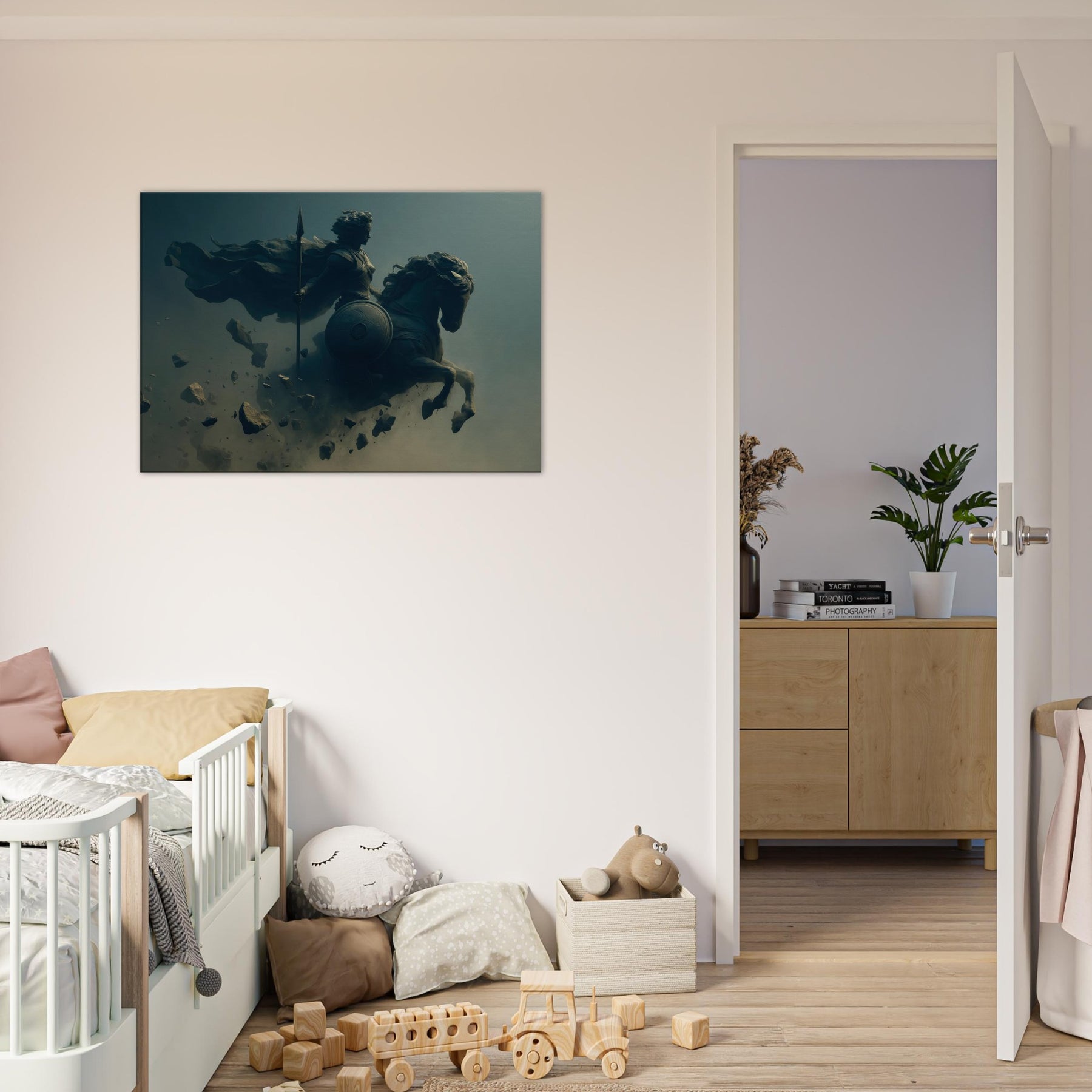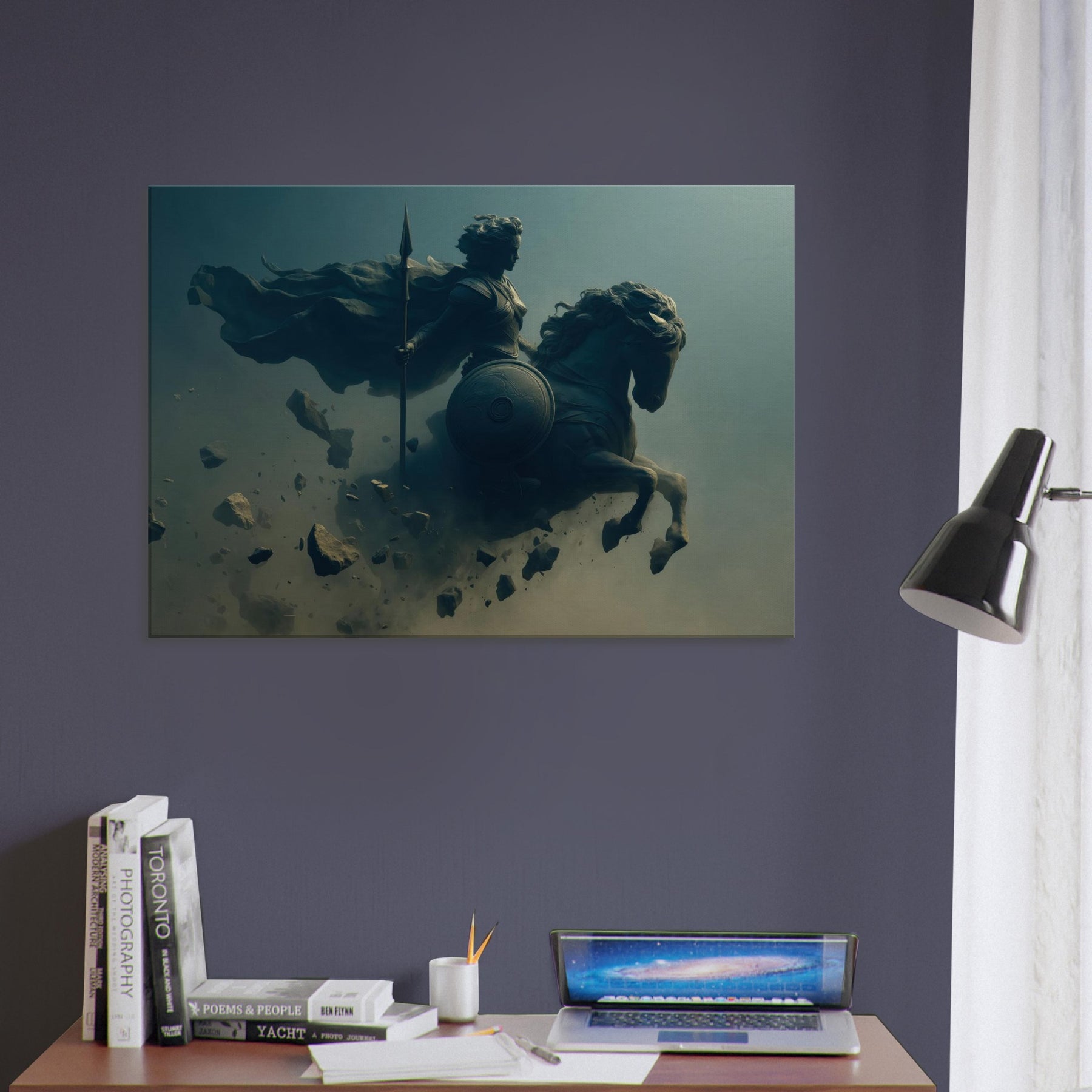 Step into a dream where a Proud Centaur Warrior charges through a mist of memories and broken stone. Surreal currents ripple around his cloak as he holds a spear and shield, a silhouette carved from myth and moonlight. The scene hums with quiet power, blending cool blues with embered gold to make a living room feel like a doorway to another realm. Hang this piece and let the air become charged with courage, wonder, and the invitation to fearless imagination.