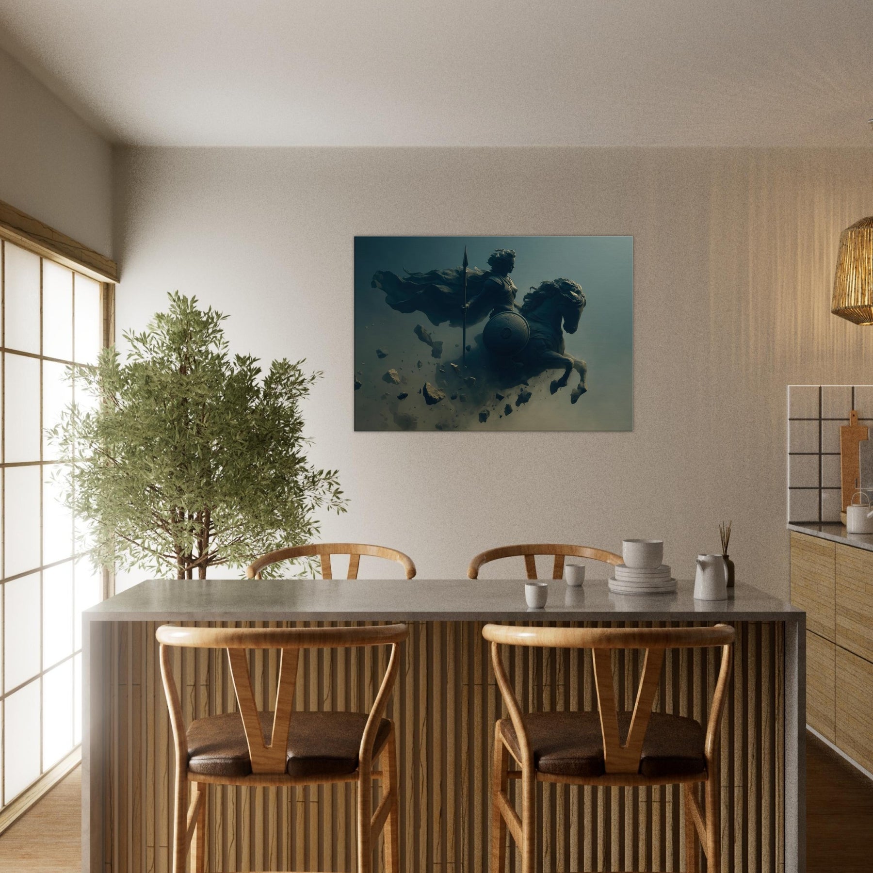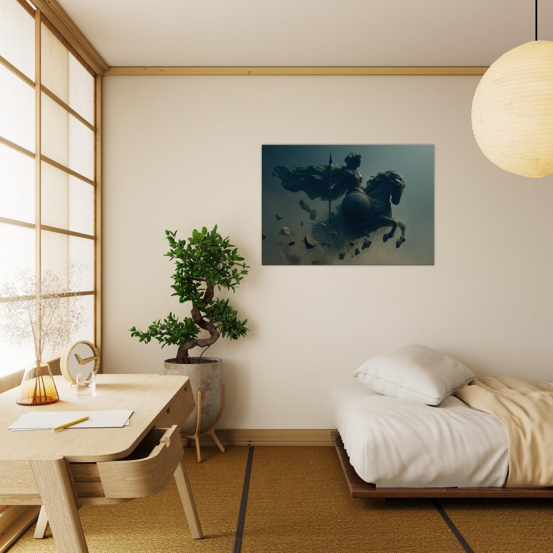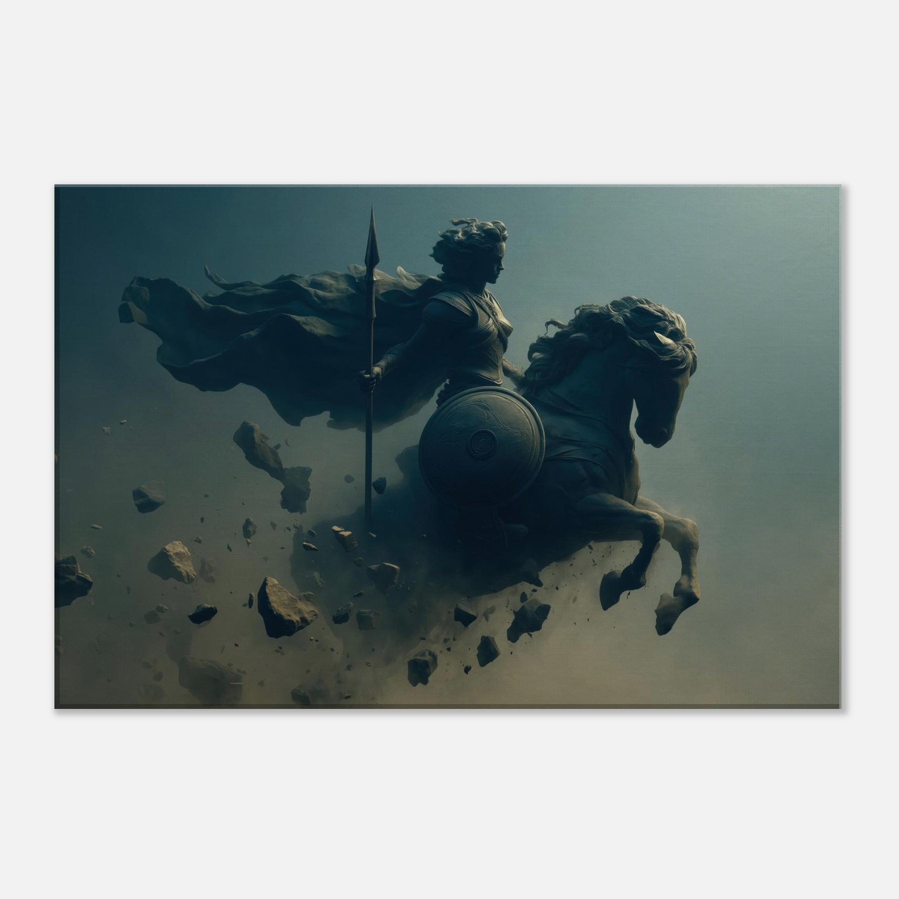 Step into a dream where a Proud Centaur Warrior charges through a mist of memories and broken stone. Surreal currents ripple around his cloak as he holds a spear and shield, a silhouette carved from myth and moonlight. The scene hums with quiet power, blending cool blues with embered gold to make a living room feel like a doorway to another realm. Hang this piece and let the air become charged with courage, wonder, and the invitation to fearless imagination.