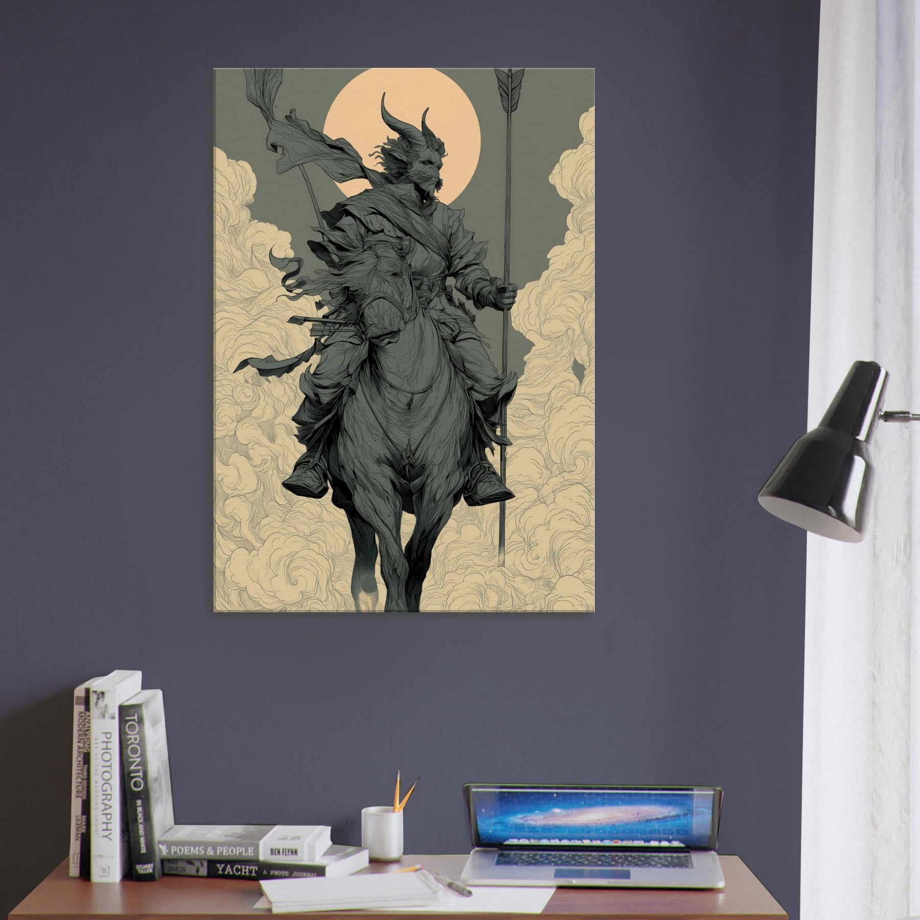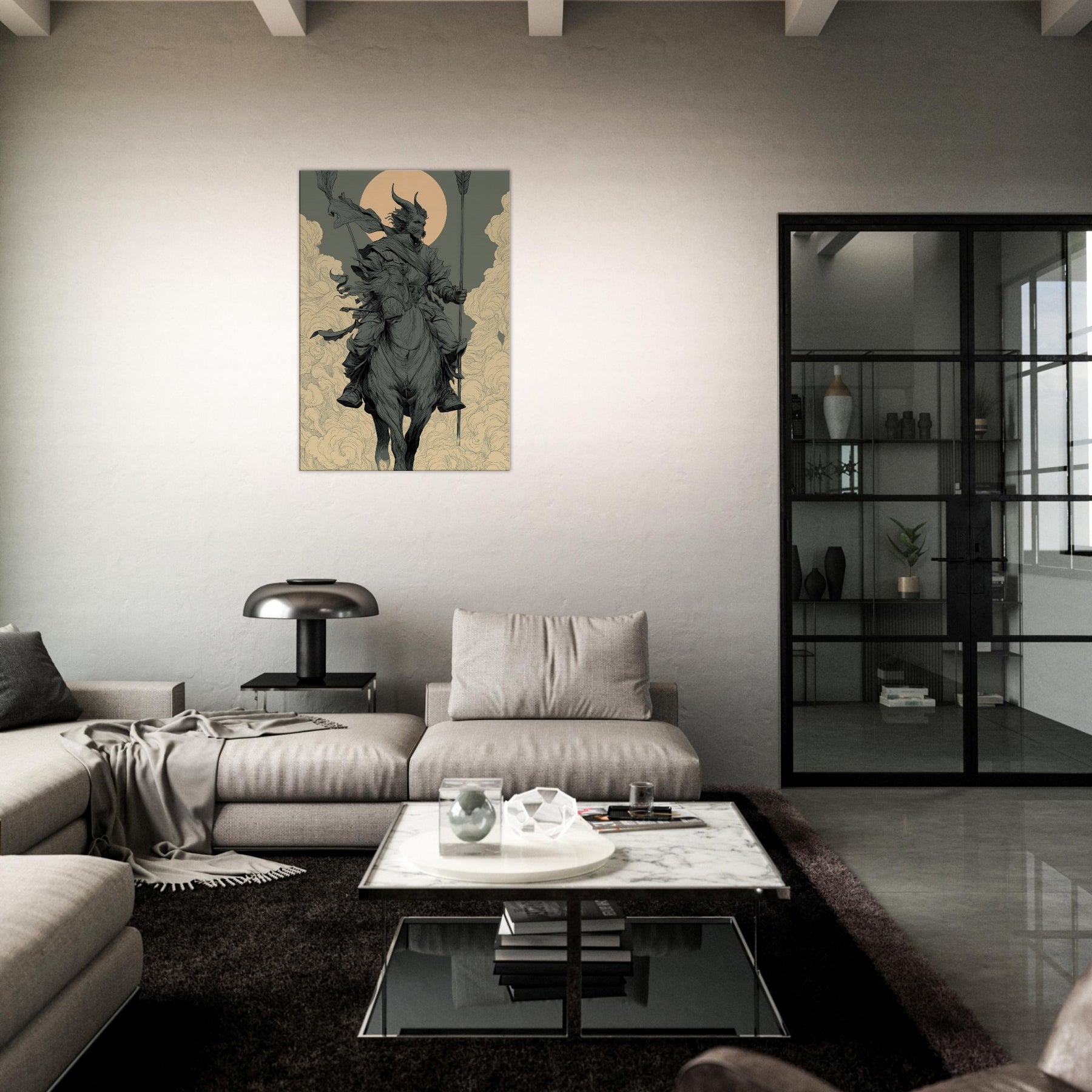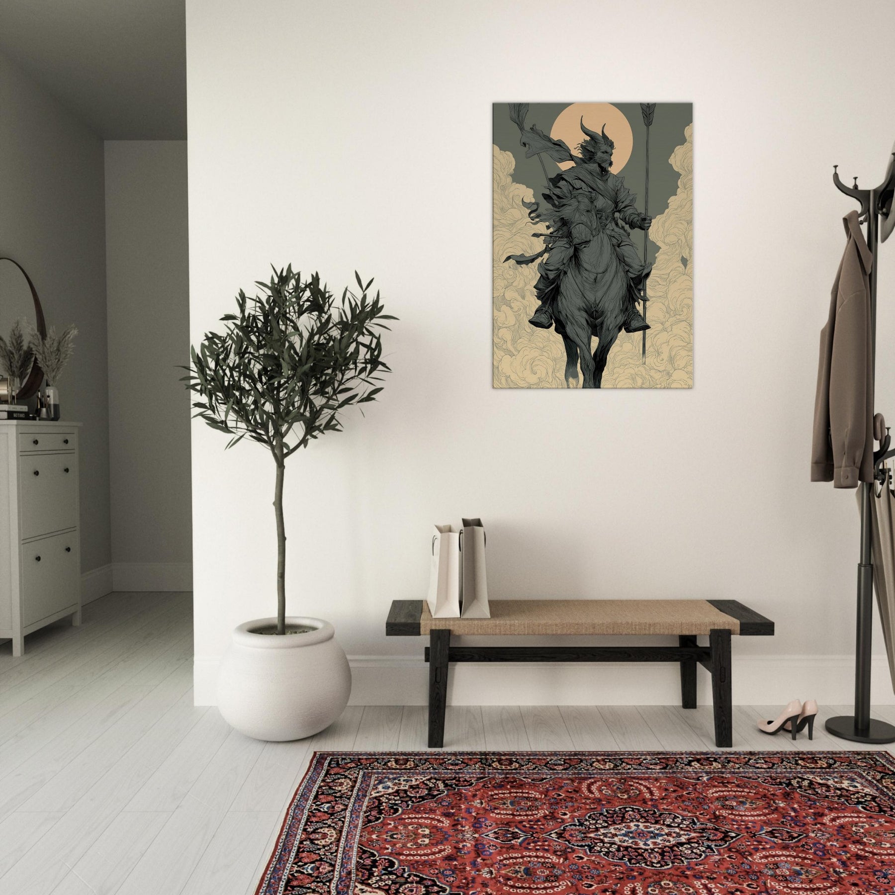 Rising from cloud wreathed plains, the Proud Centaur Warrior commands the room with quiet, moonlit authority. This surreal composition fuses myth and shadow, where armor folds into wind, and a spear pins the horizon. The muted palette sage, graphite, and pale ochre wraps a living space in a hushed, contemplative glow, inviting long evenings of reflection. Hung above a sofa or in a study nook, it becomes a steady, kinetic focal point that nourishes courage, imagination, and dream filled conversation.