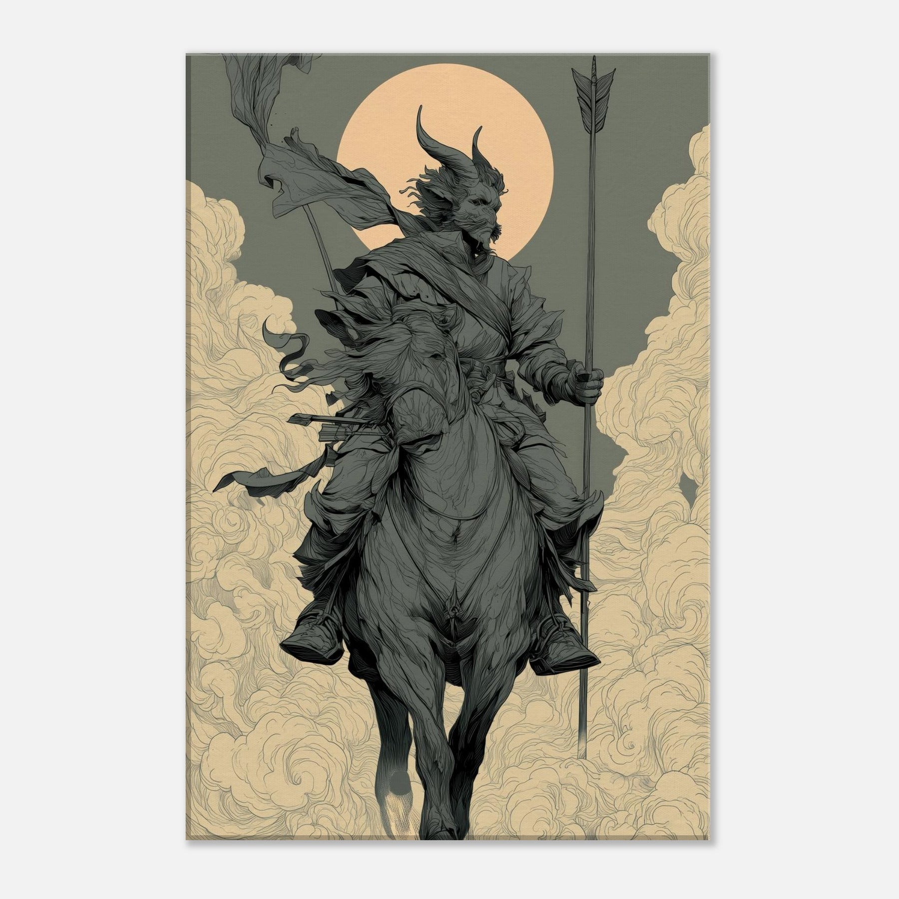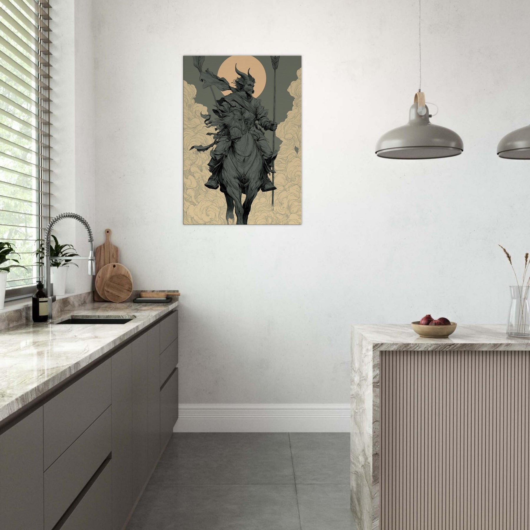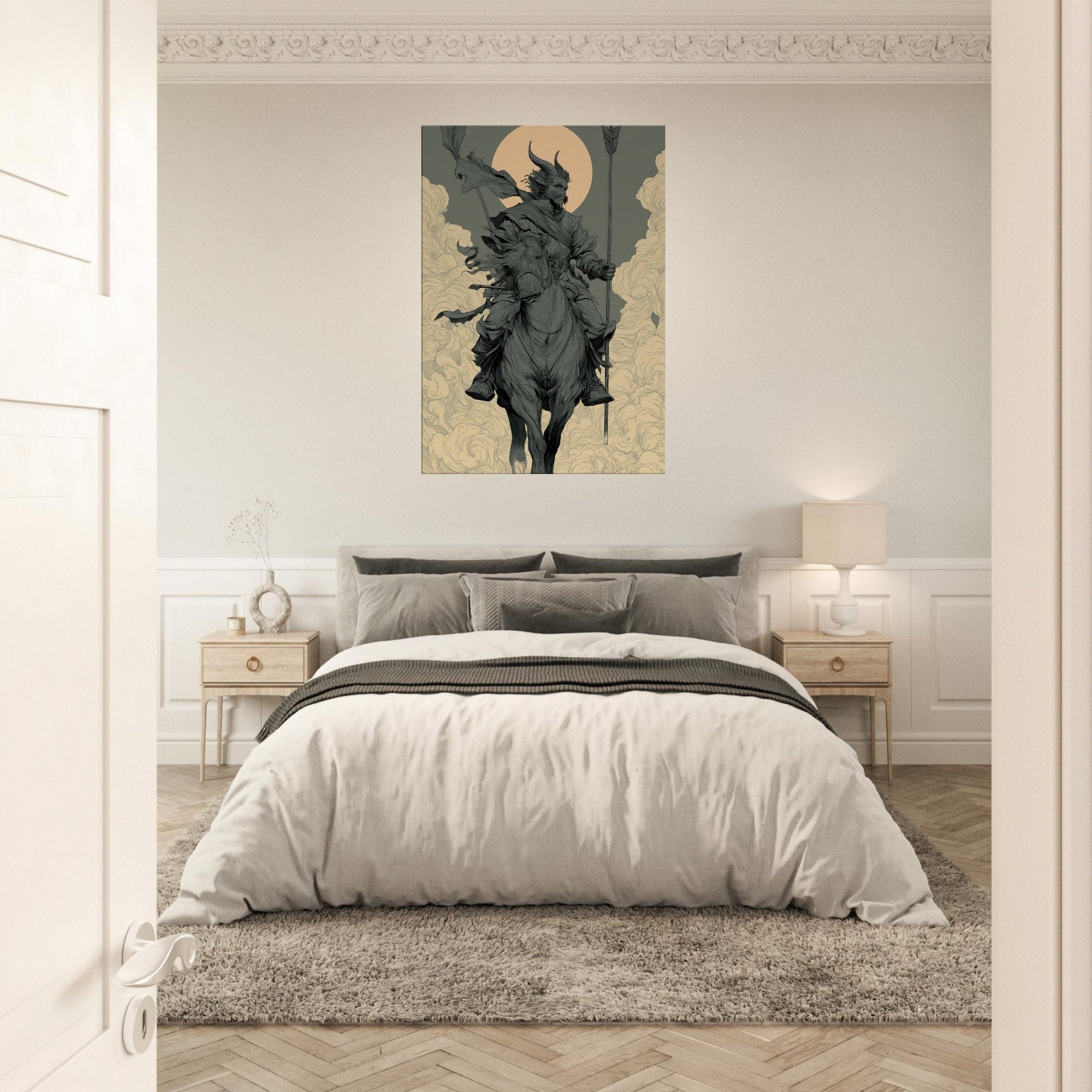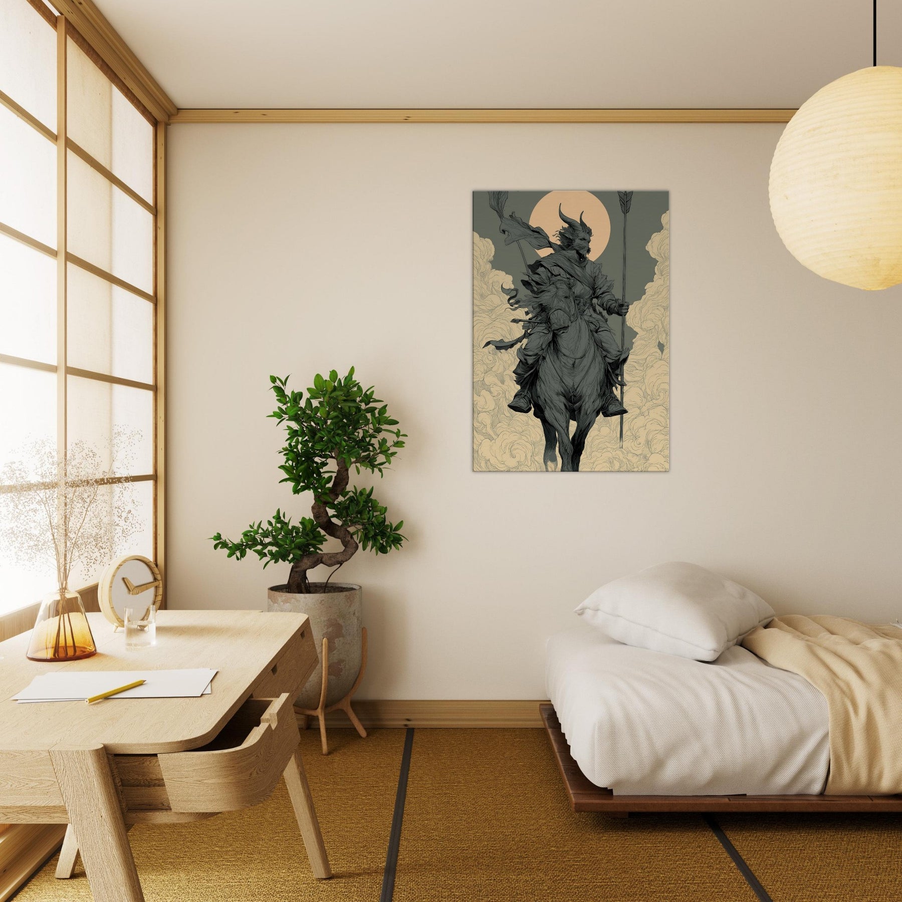 Rising from cloud wreathed plains, the Proud Centaur Warrior commands the room with quiet, moonlit authority. This surreal composition fuses myth and shadow, where armor folds into wind, and a spear pins the horizon. The muted palette sage, graphite, and pale ochre wraps a living space in a hushed, contemplative glow, inviting long evenings of reflection. Hung above a sofa or in a study nook, it becomes a steady, kinetic focal point that nourishes courage, imagination, and dream filled conversation.