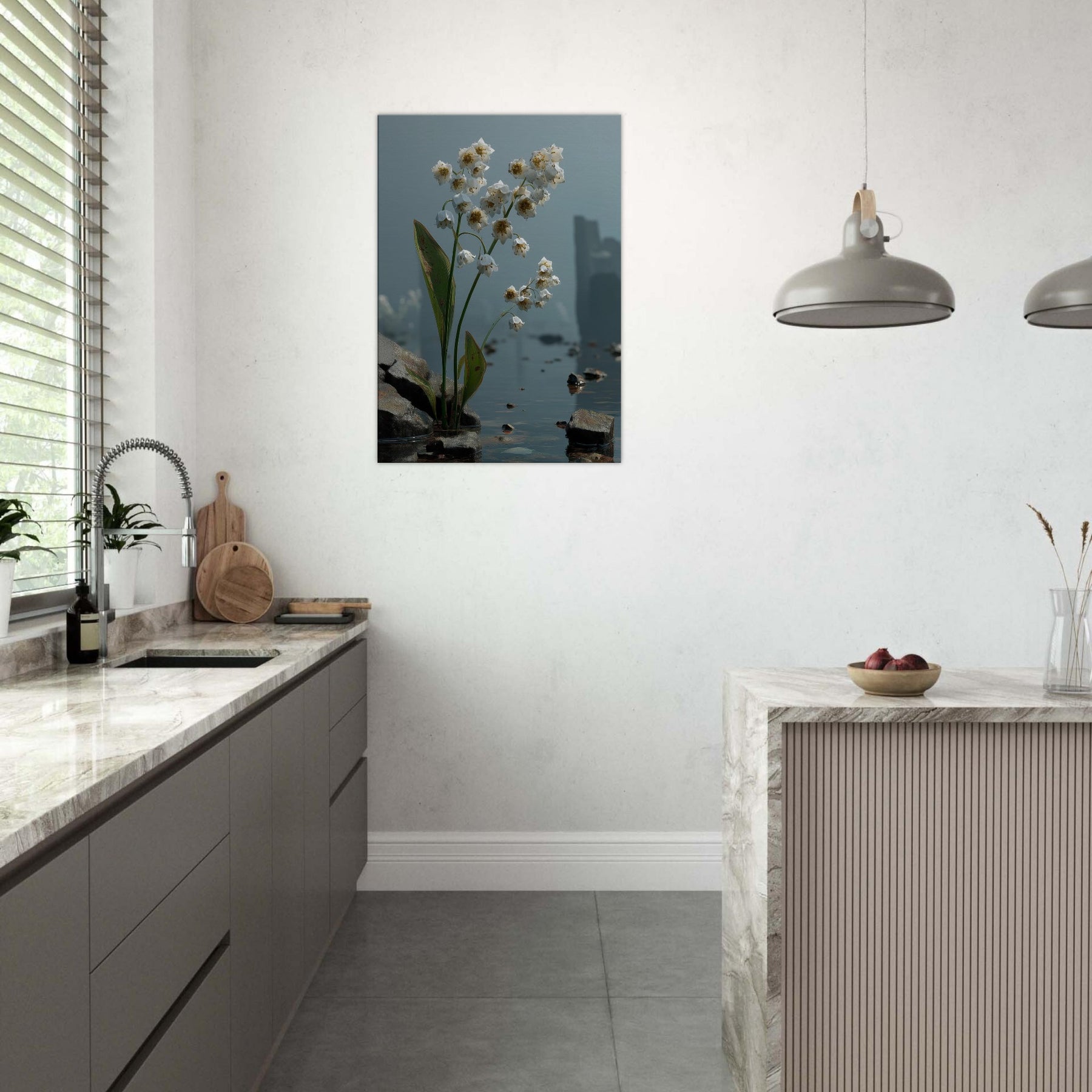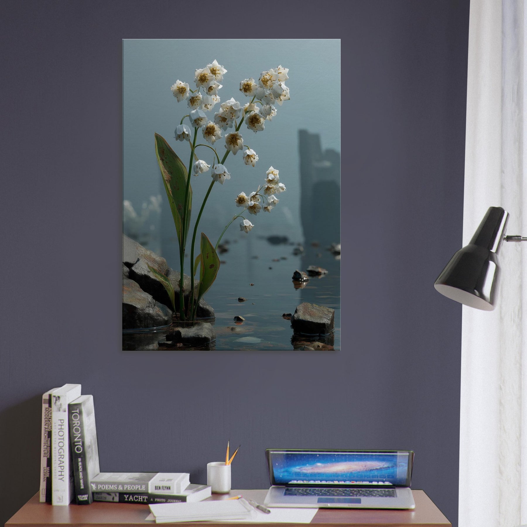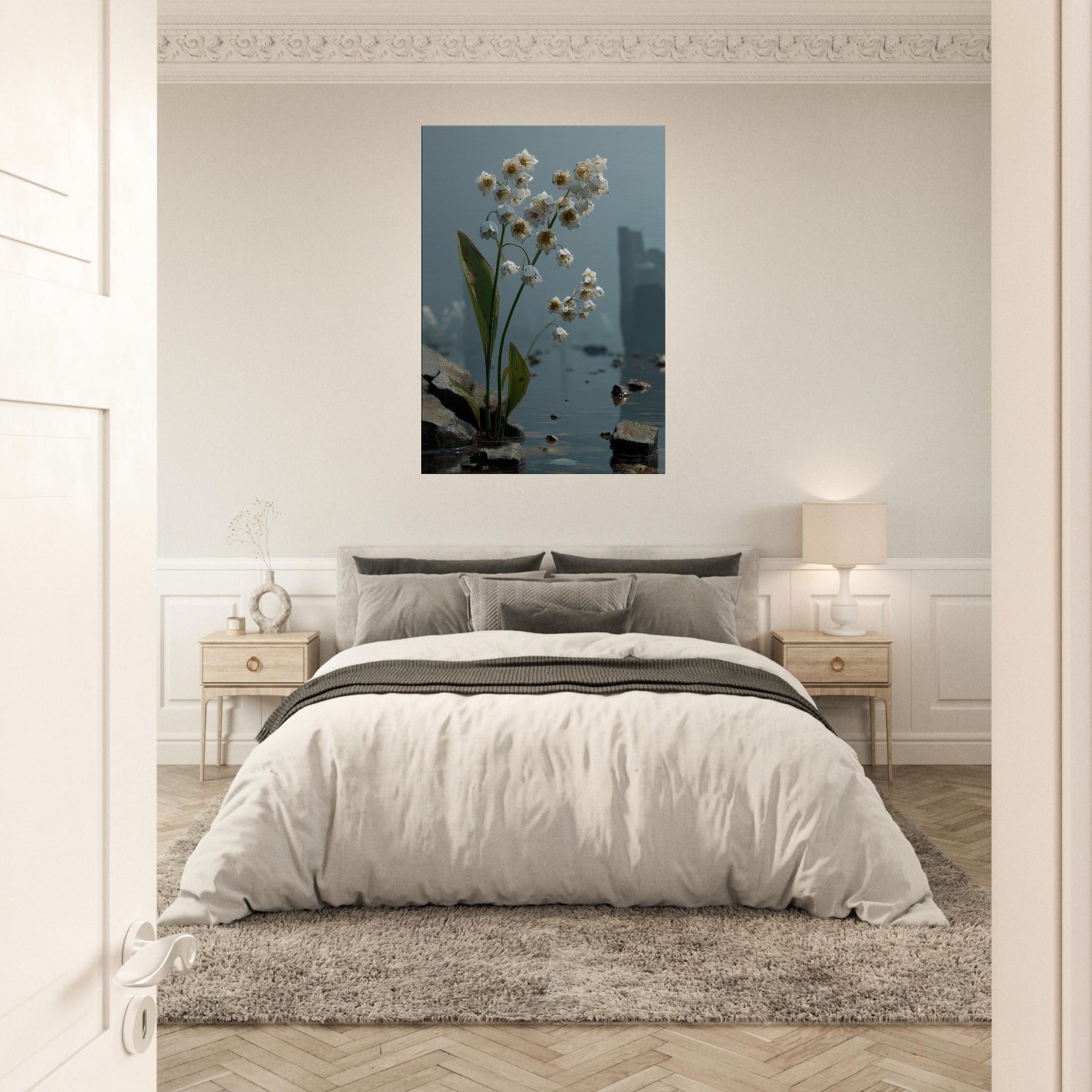 An improbable bouquet rises from quiet waters, the Lily of the Valley crowned with pale bells that seem to hush the room with their fragrance of memory and rain. In this surreal moment, slender stems bend toward a pale horizon, where city glass blurs into mist, inviting calm and reflection. The artwork invites soft light, a whisper of nature in a modern interior, turning a wall into a window to dreamlike tides. Perfect for living rooms and bedrooms seeking a serene, poetic focal point.