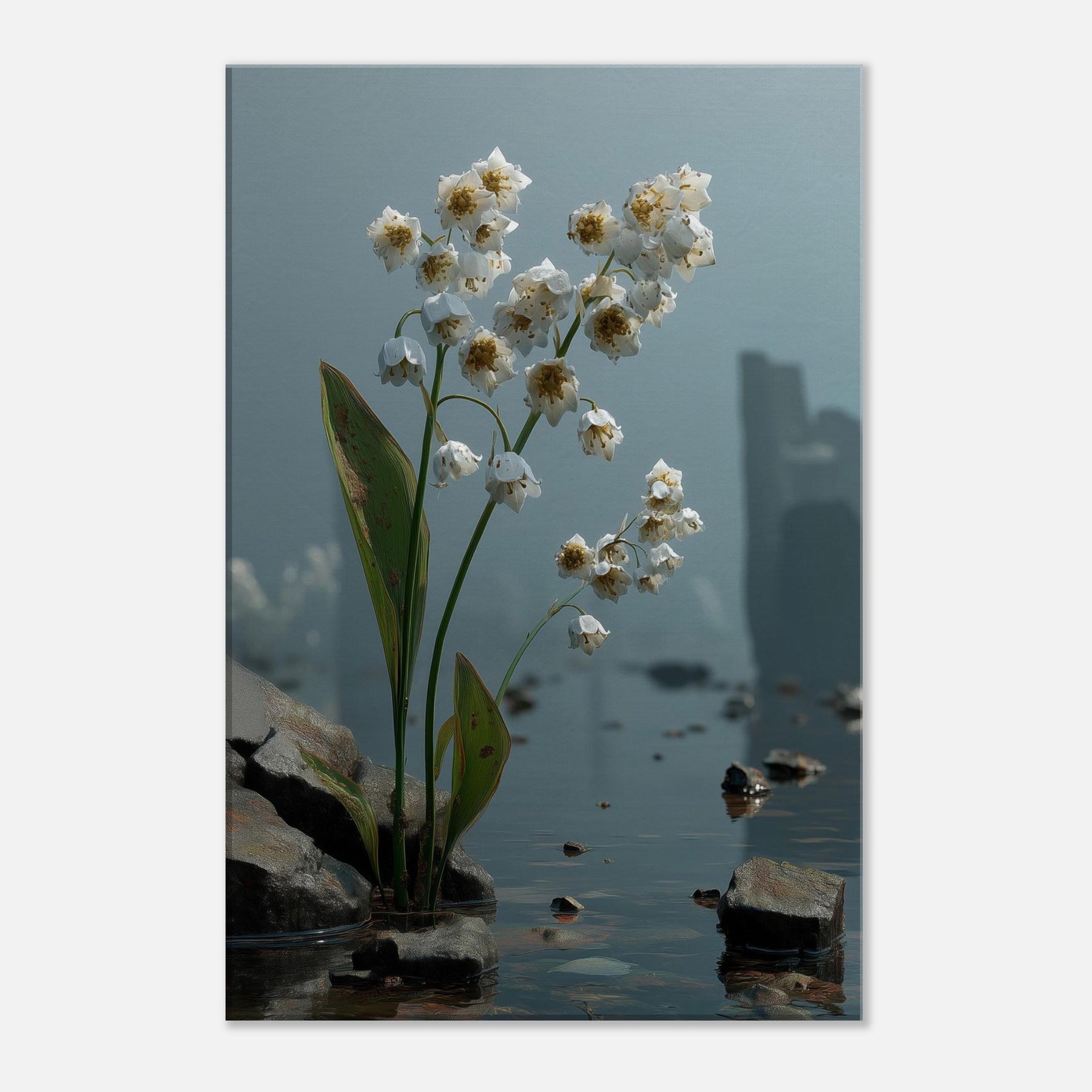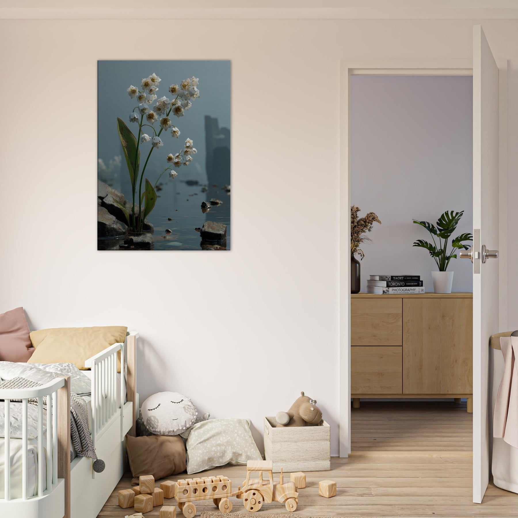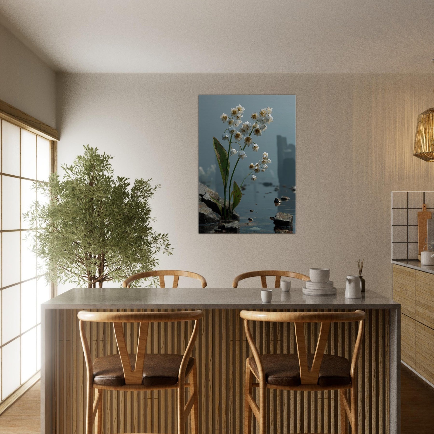 An improbable bouquet rises from quiet waters, the Lily of the Valley crowned with pale bells that seem to hush the room with their fragrance of memory and rain. In this surreal moment, slender stems bend toward a pale horizon, where city glass blurs into mist, inviting calm and reflection. The artwork invites soft light, a whisper of nature in a modern interior, turning a wall into a window to dreamlike tides. Perfect for living rooms and bedrooms seeking a serene, poetic focal point.