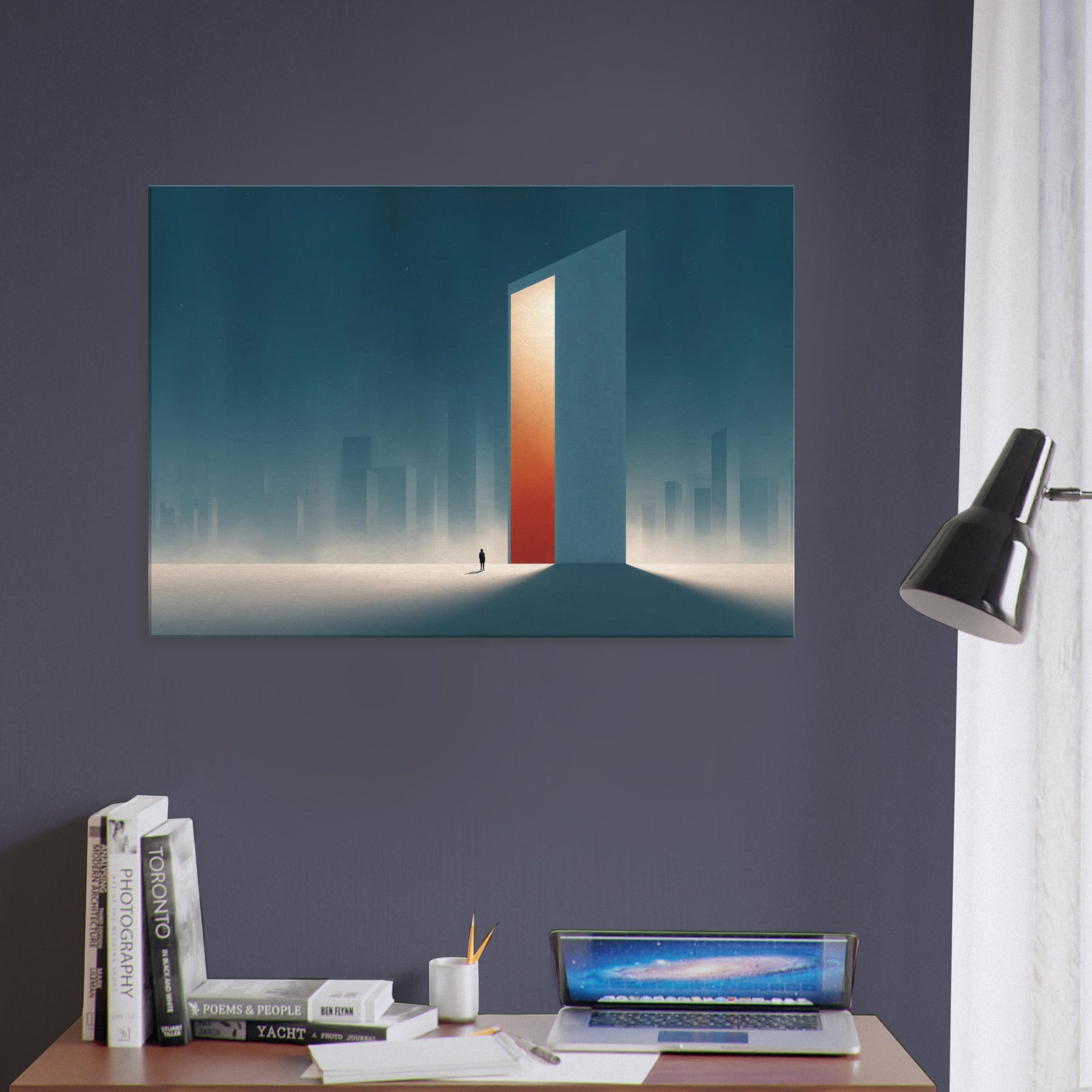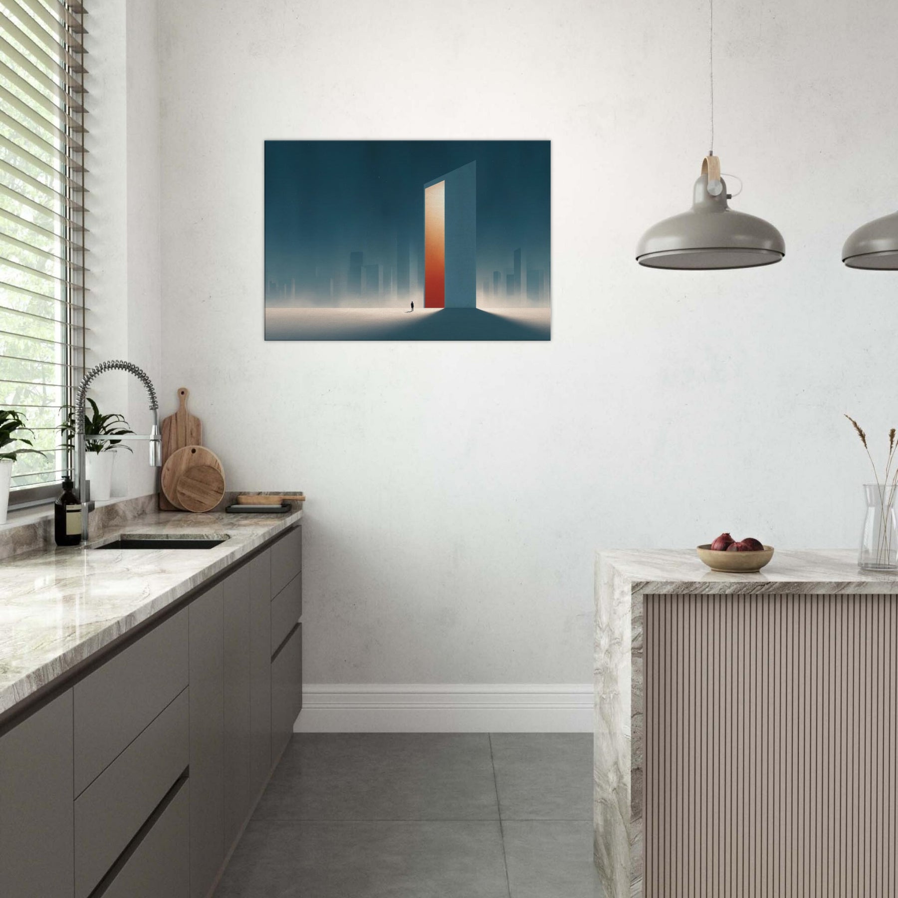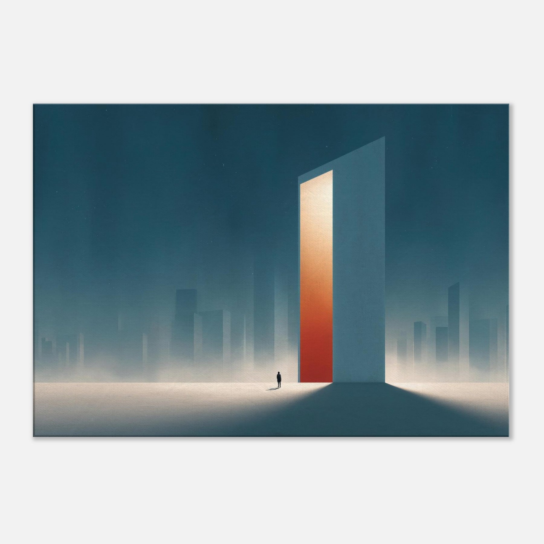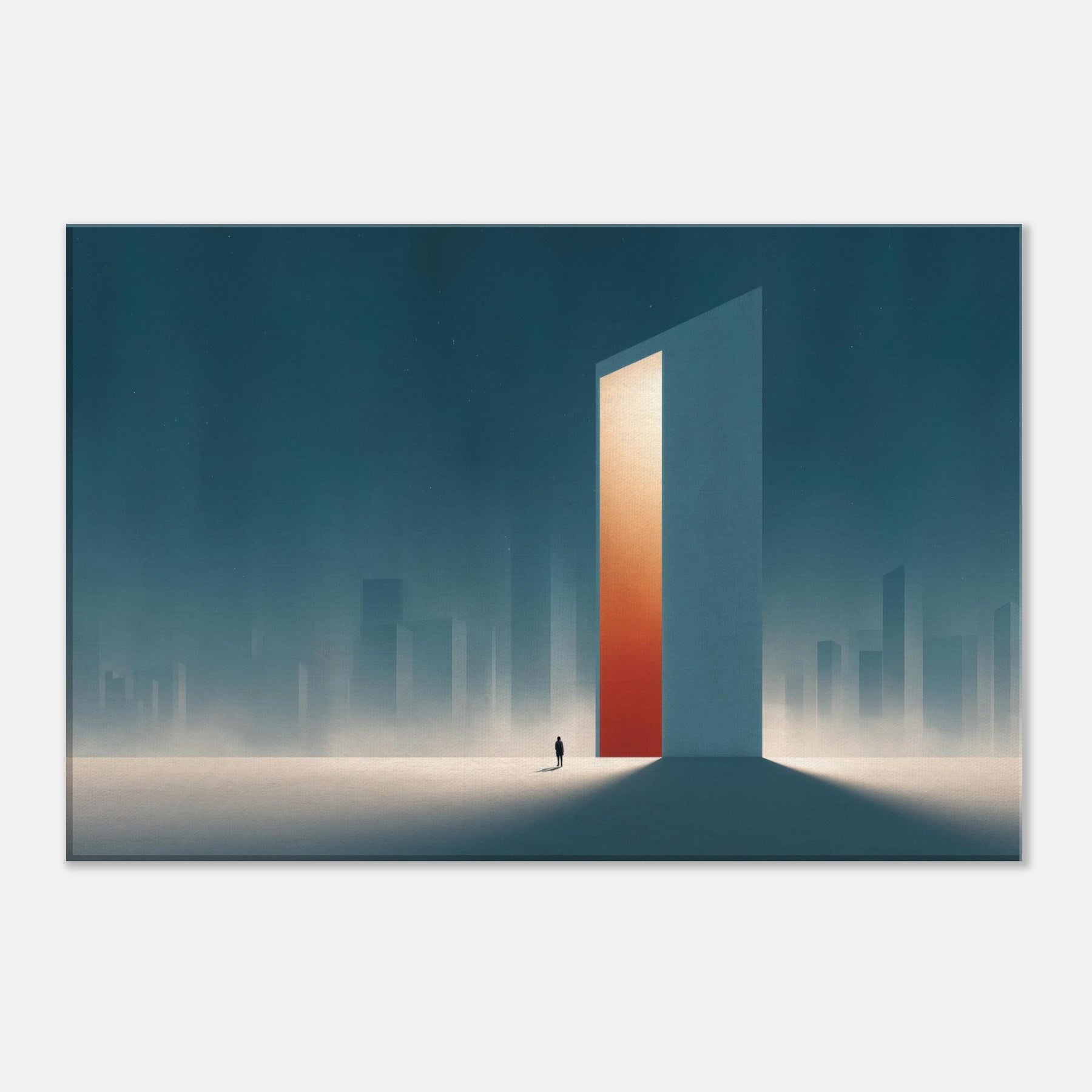 On the canvas, the Minimal City Map dissolves into dream and distance. A colossal, door like tower glows with a warm orange core, casting long shadows across a frost lit plane. Surrounded by misty skyscrapers, the scene feels both urban and ethereal, inviting contemplation and calm. This piece transforms a living space into a quiet horizon, where memory and place mingle, and the city breathes at your pace.