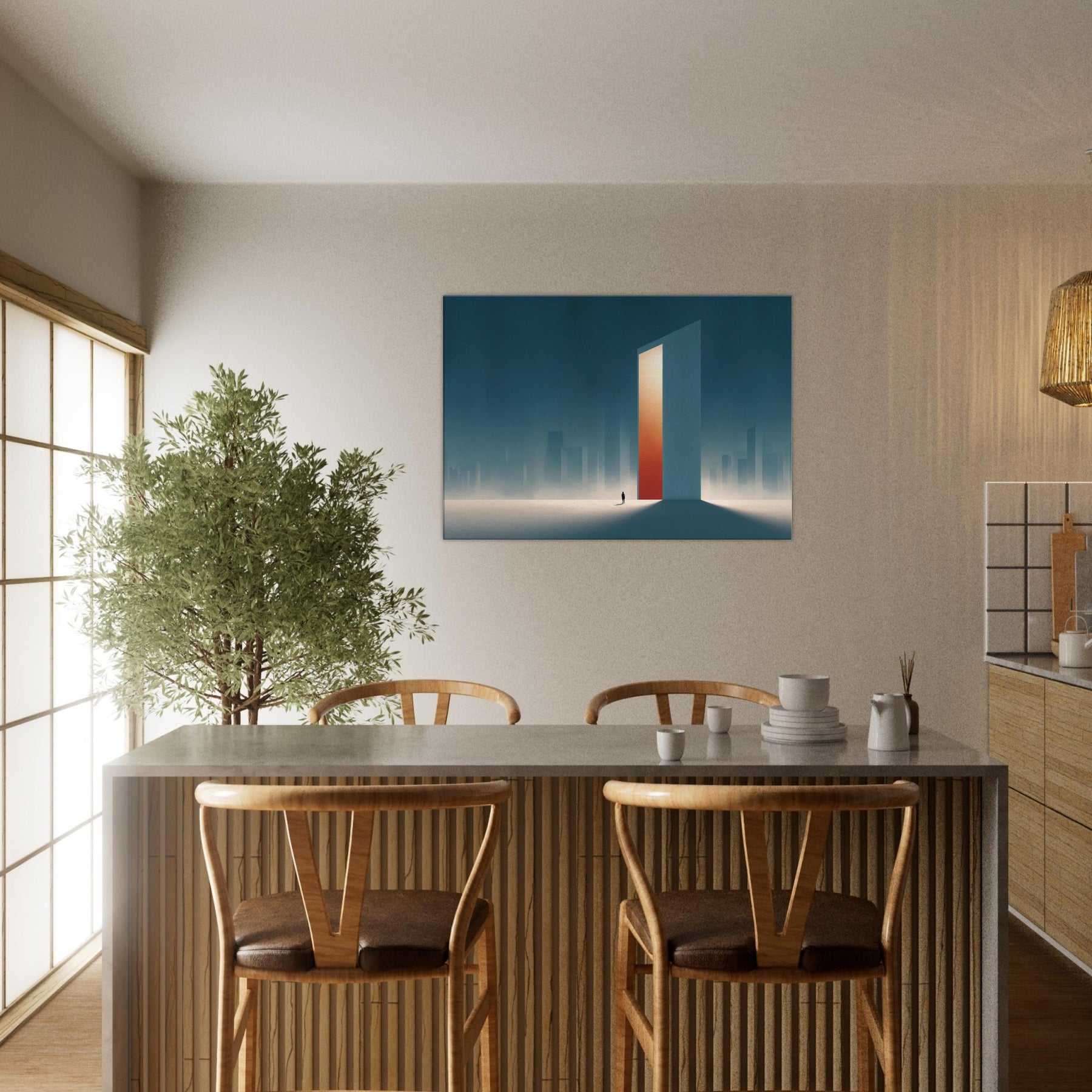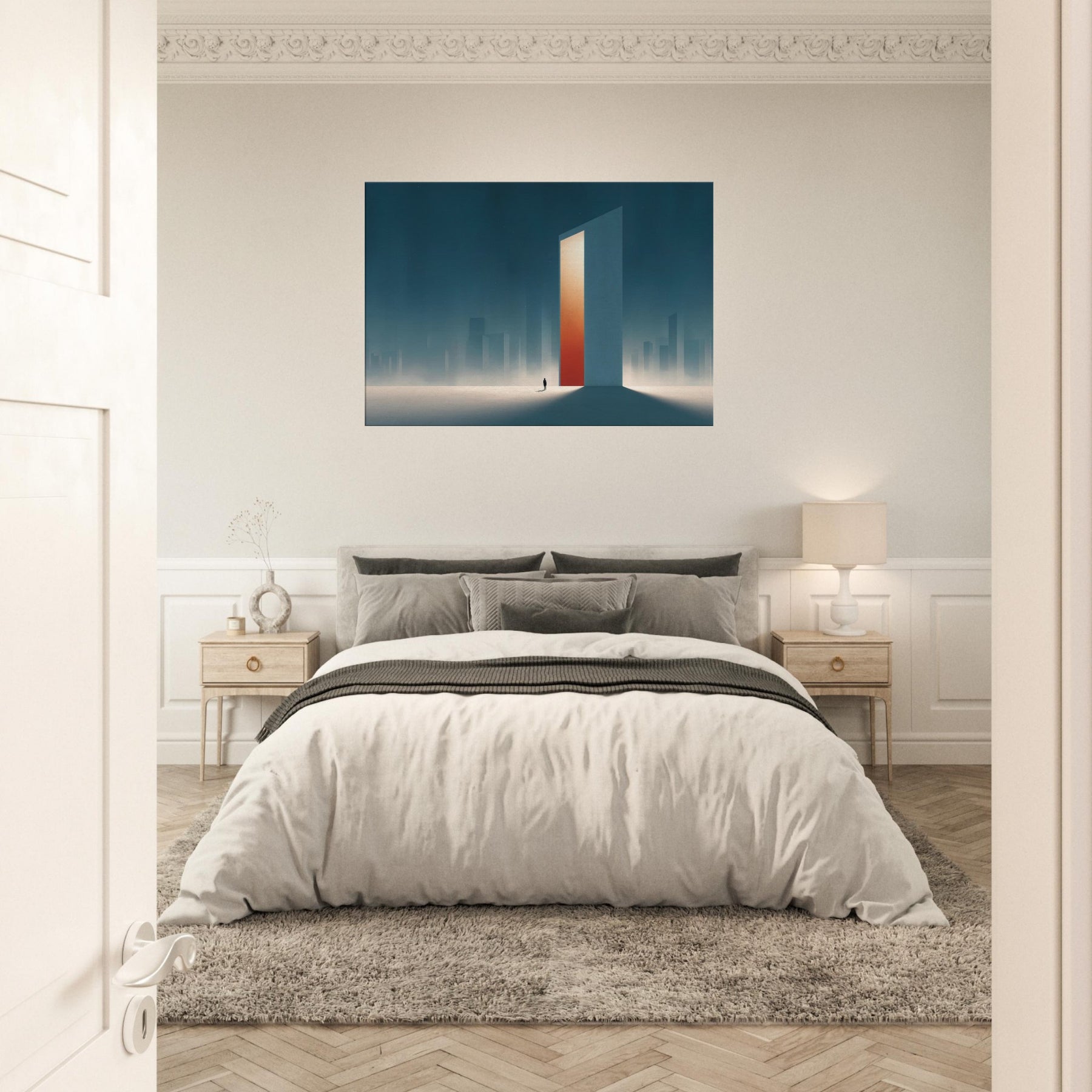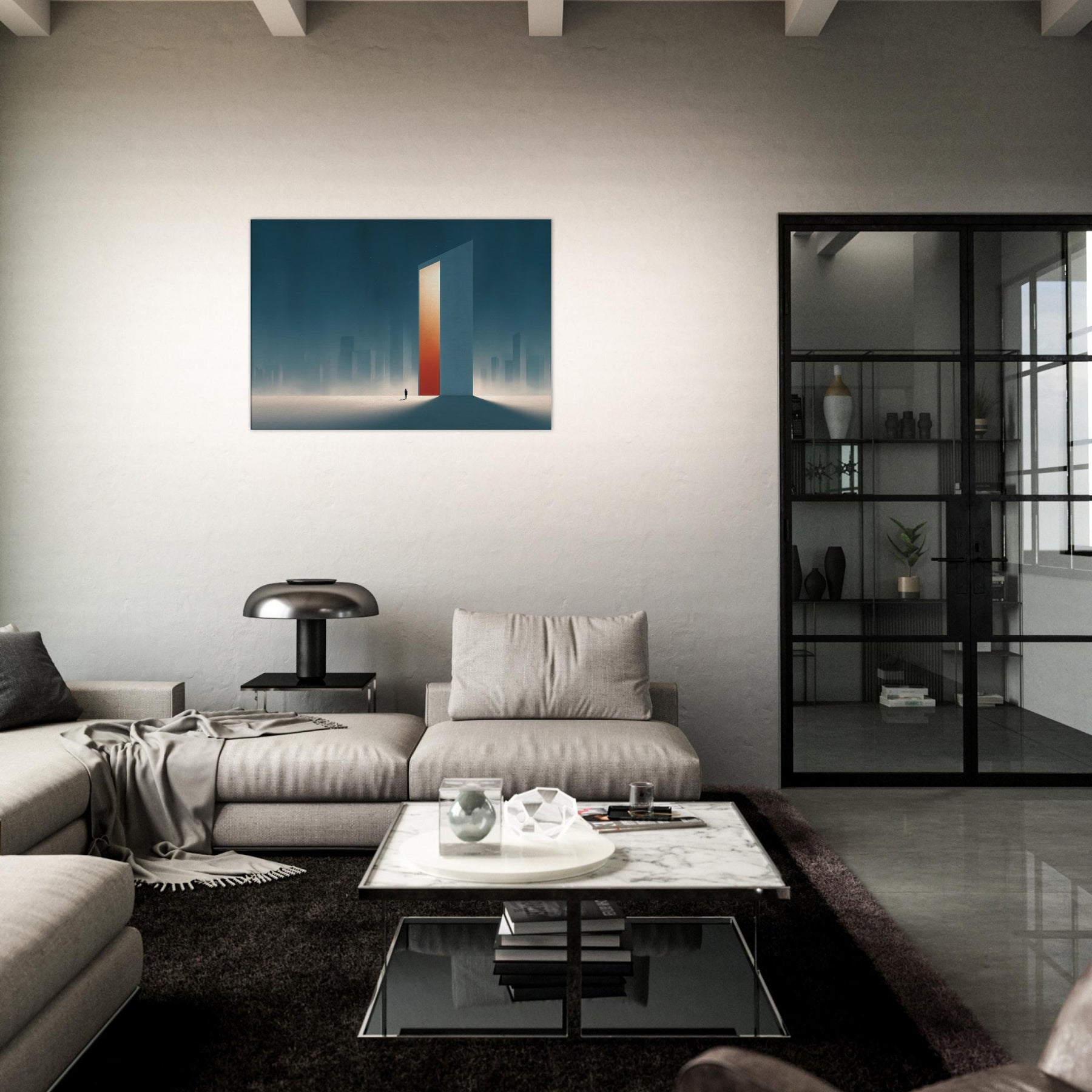 On the canvas, the Minimal City Map dissolves into dream and distance. A colossal, door like tower glows with a warm orange core, casting long shadows across a frost lit plane. Surrounded by misty skyscrapers, the scene feels both urban and ethereal, inviting contemplation and calm. This piece transforms a living space into a quiet horizon, where memory and place mingle, and the city breathes at your pace.