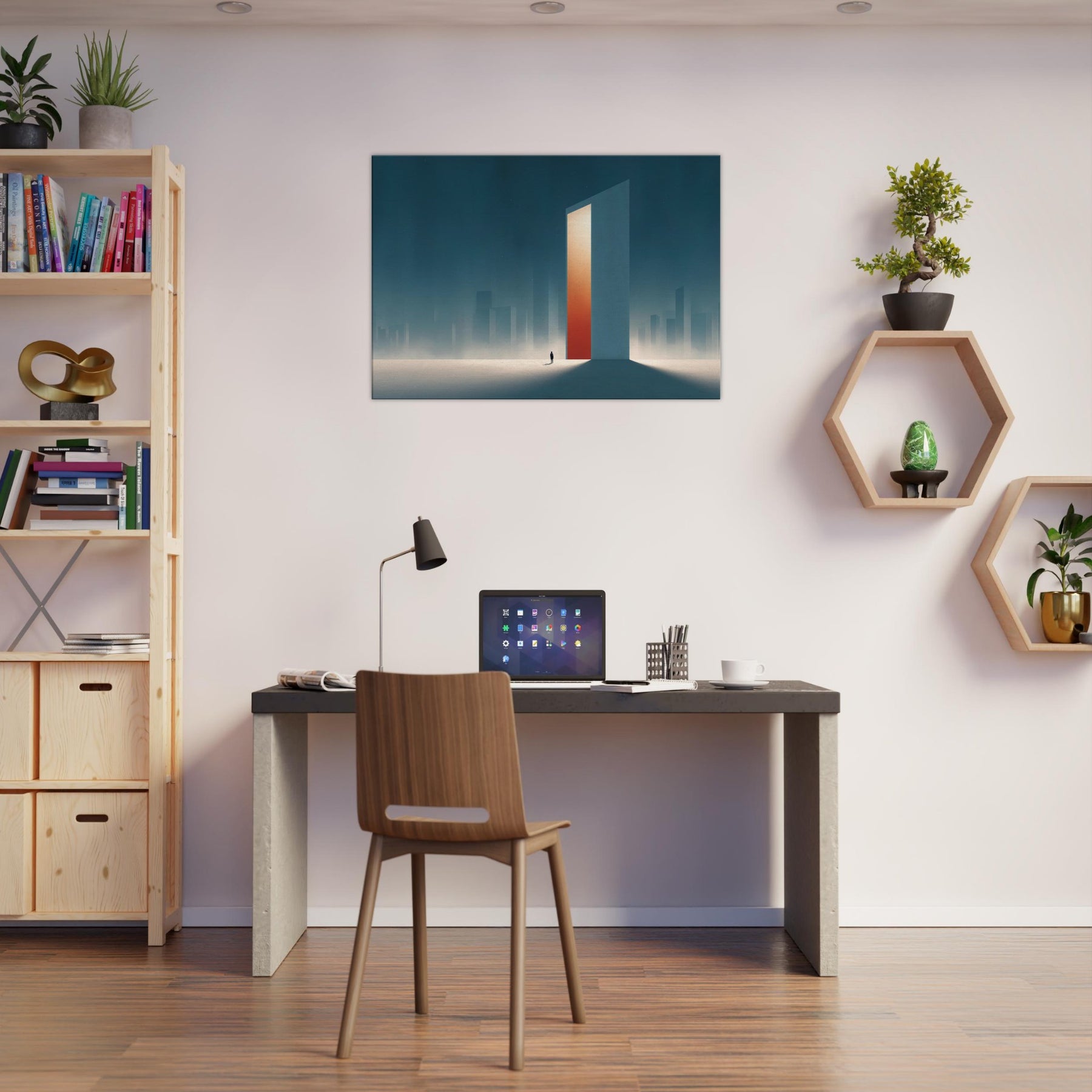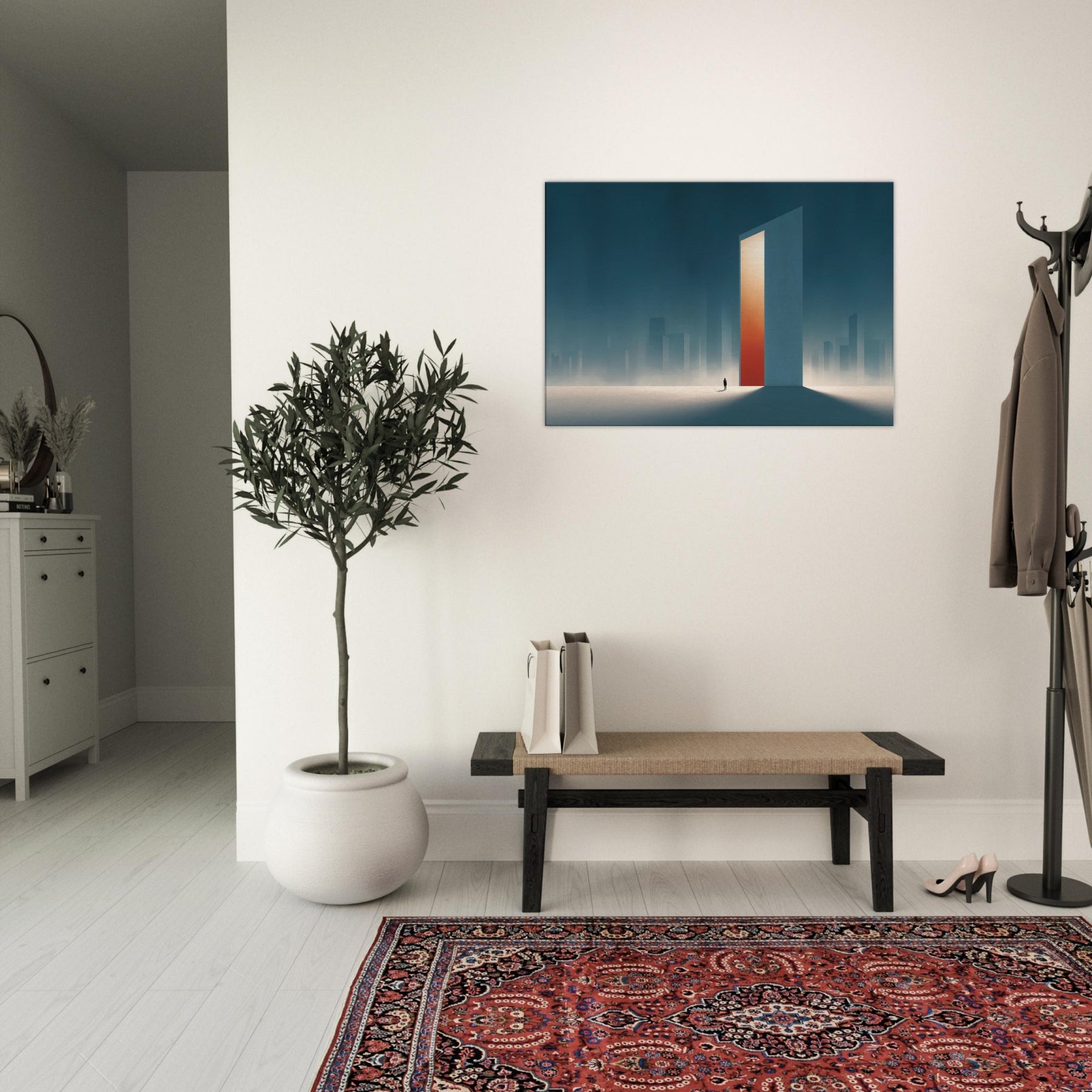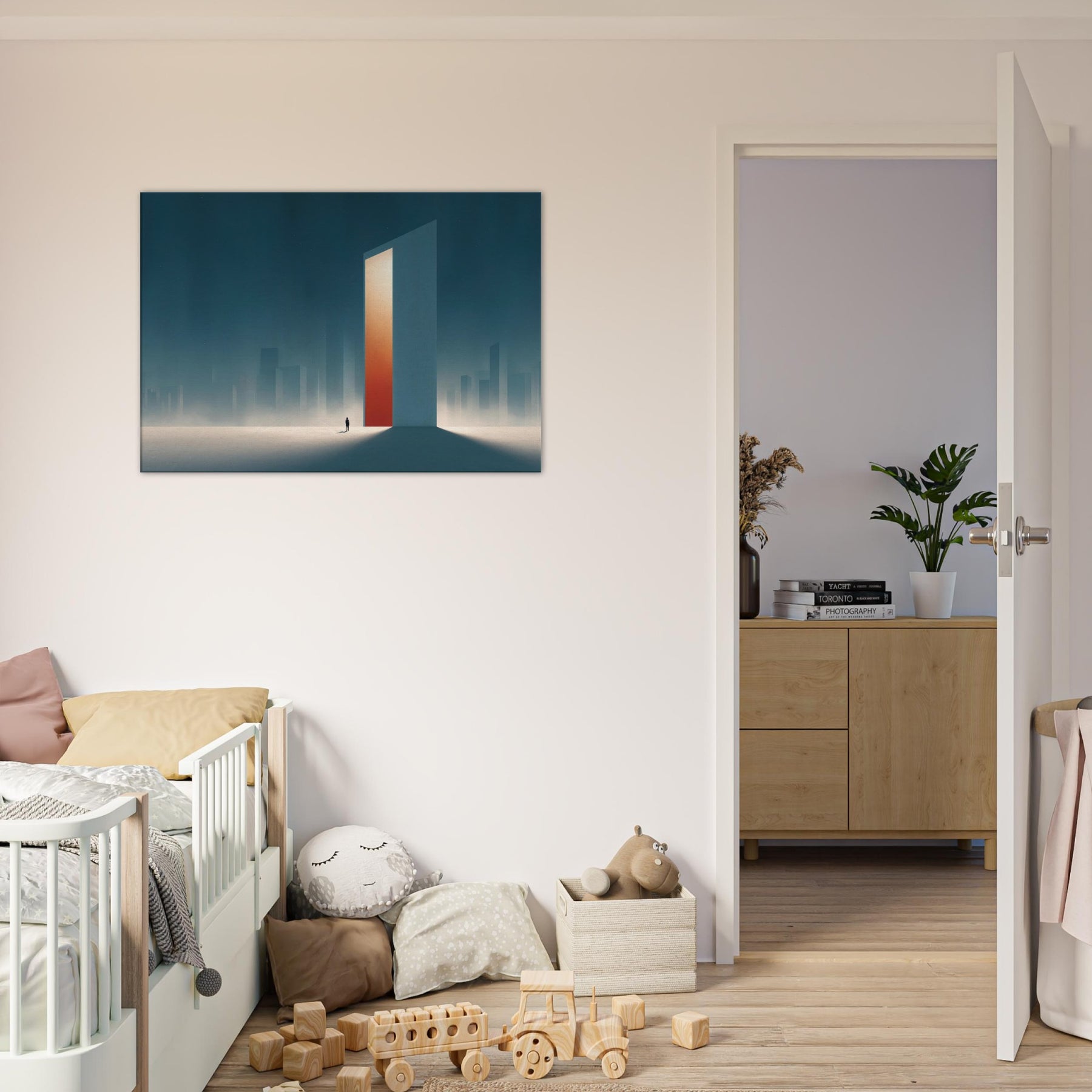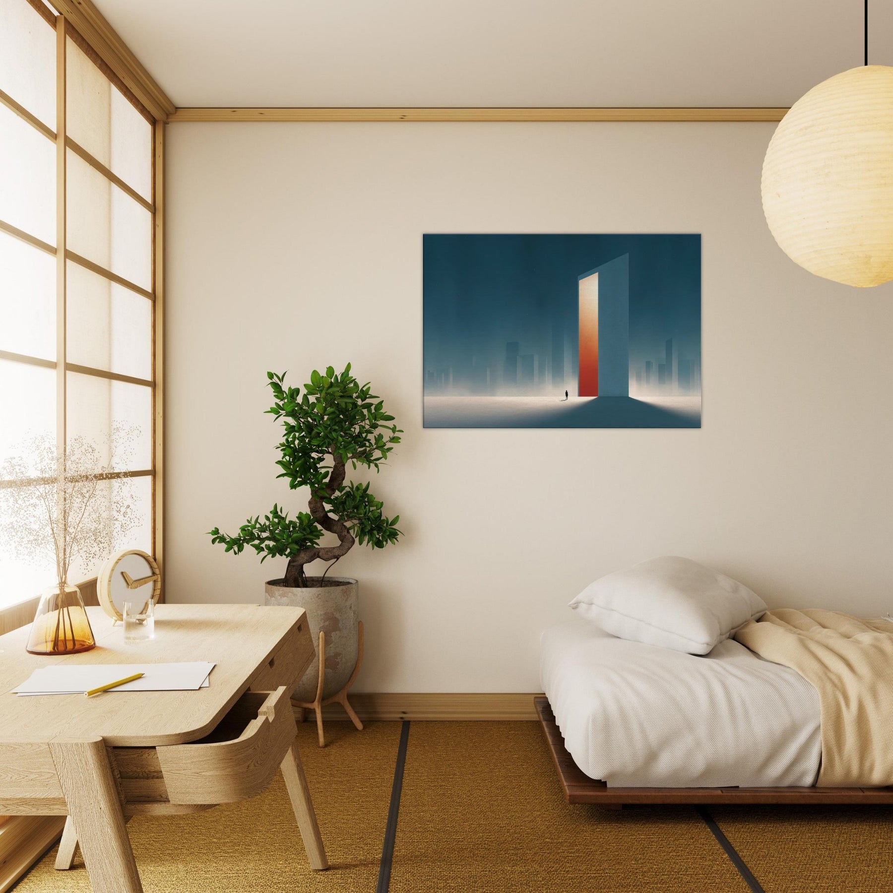 On the canvas, the Minimal City Map dissolves into dream and distance. A colossal, door like tower glows with a warm orange core, casting long shadows across a frost lit plane. Surrounded by misty skyscrapers, the scene feels both urban and ethereal, inviting contemplation and calm. This piece transforms a living space into a quiet horizon, where memory and place mingle, and the city breathes at your pace.