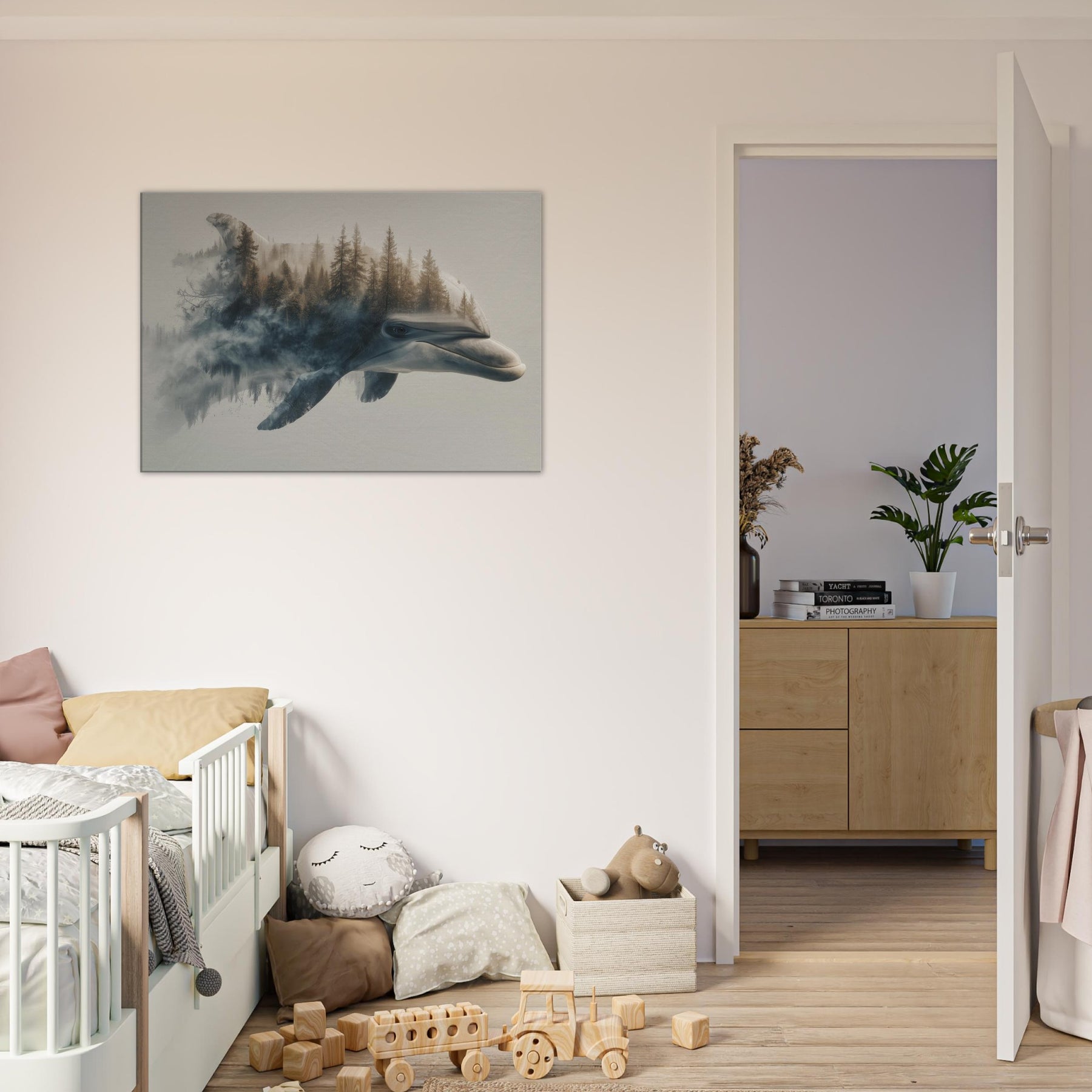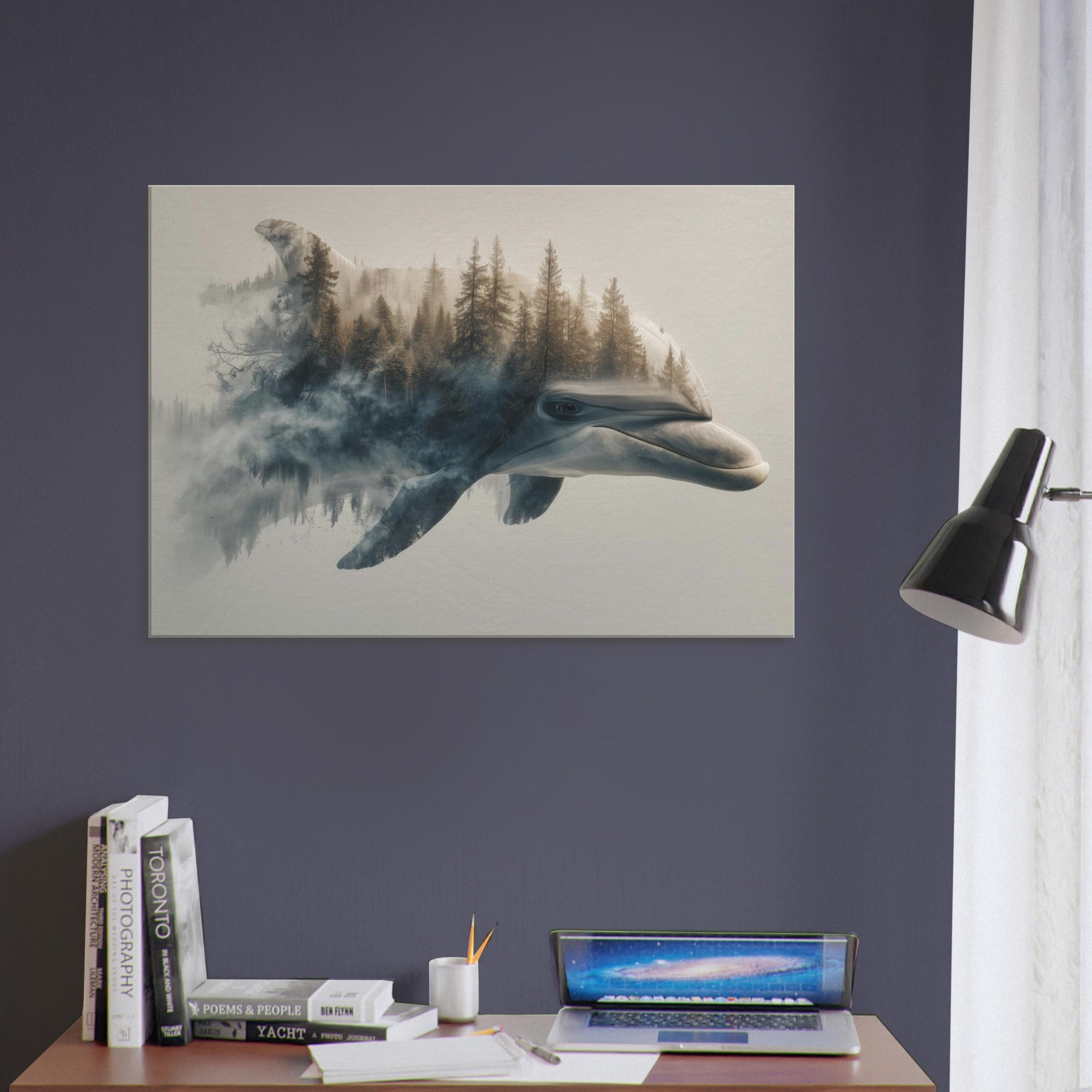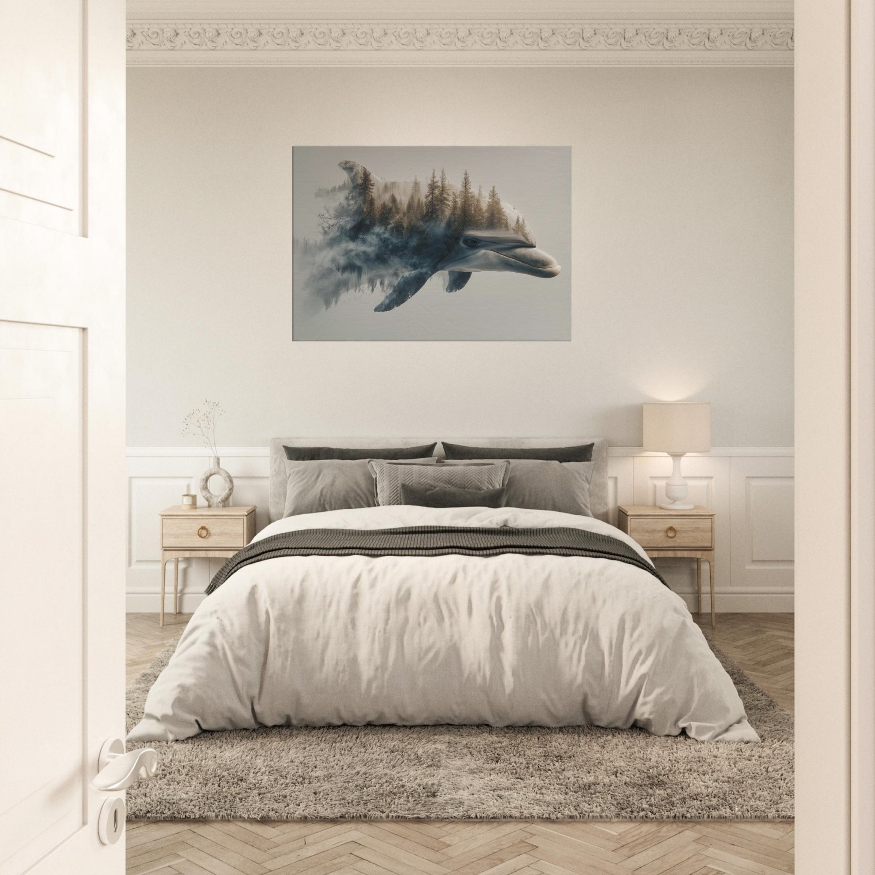 This surreal scene glides between sea and shore, where a Dolphin pauses within a whispering forest. Mist, pine silhouettes, and a gently dreamlike palette fold into the creature's calm expression, creating an atmosphere of quiet wonder. Perfect for a living space or study, it invites slow gaze, soft focus, and reflective calm. As light shifts, the image feels both distant and intimate, a memory of water and woods you can live with every day.