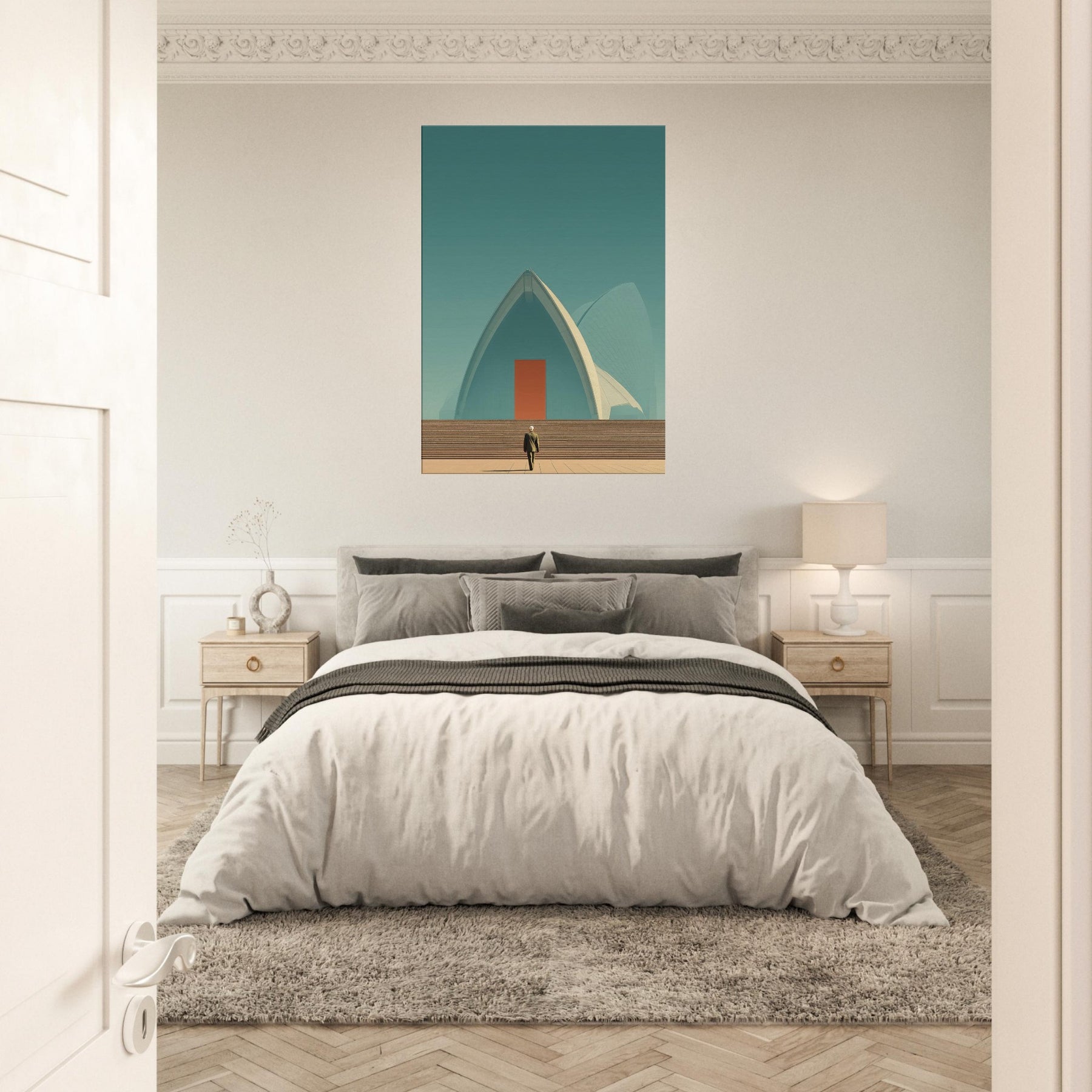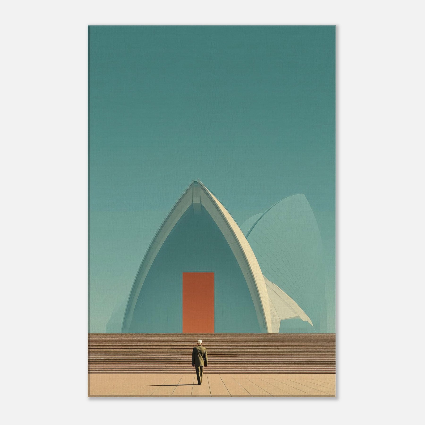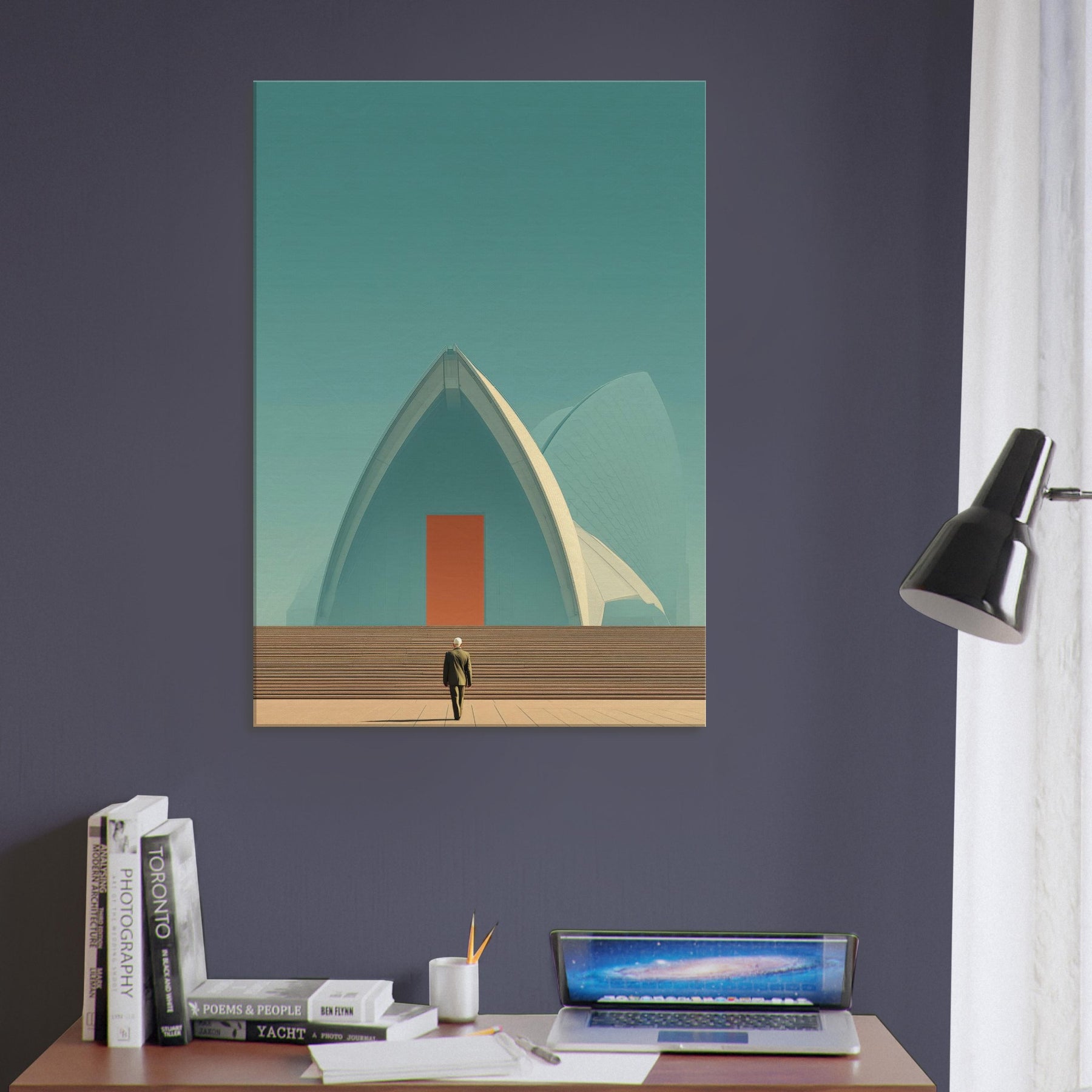 Step forward into a dream of Sydney where architecture leans toward the horizon and time loosens its grip. This surreal composition places a bold, orange doorway before the curved silhouette of a famed landmark, set against a serene teal sky. The long steps invite a measured, devotional pace, while the soft gradient washes wrap the room in calm. A striking centerpiece that elevates a living space, it awakens curiosity, inspires contemplation, and makes every evening feel like a quiet, cinematic stroll through Sydney.