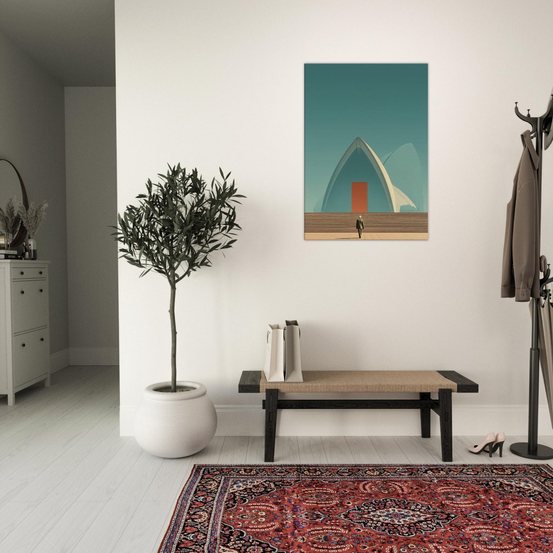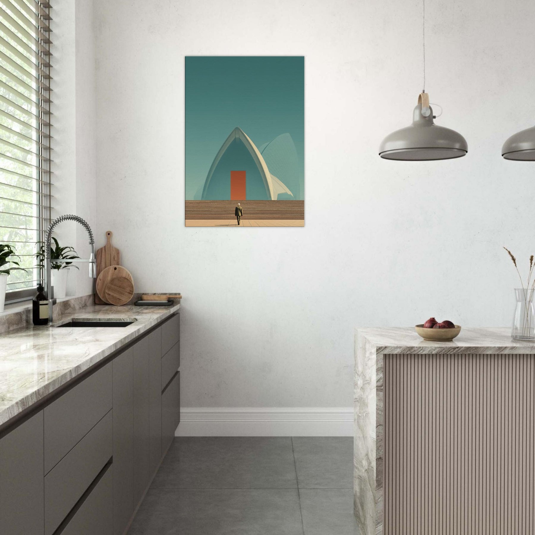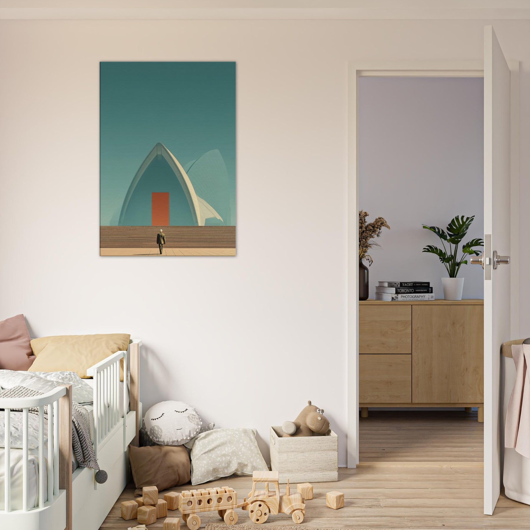 Step forward into a dream of Sydney where architecture leans toward the horizon and time loosens its grip. This surreal composition places a bold, orange doorway before the curved silhouette of a famed landmark, set against a serene teal sky. The long steps invite a measured, devotional pace, while the soft gradient washes wrap the room in calm. A striking centerpiece that elevates a living space, it awakens curiosity, inspires contemplation, and makes every evening feel like a quiet, cinematic stroll through Sydney.