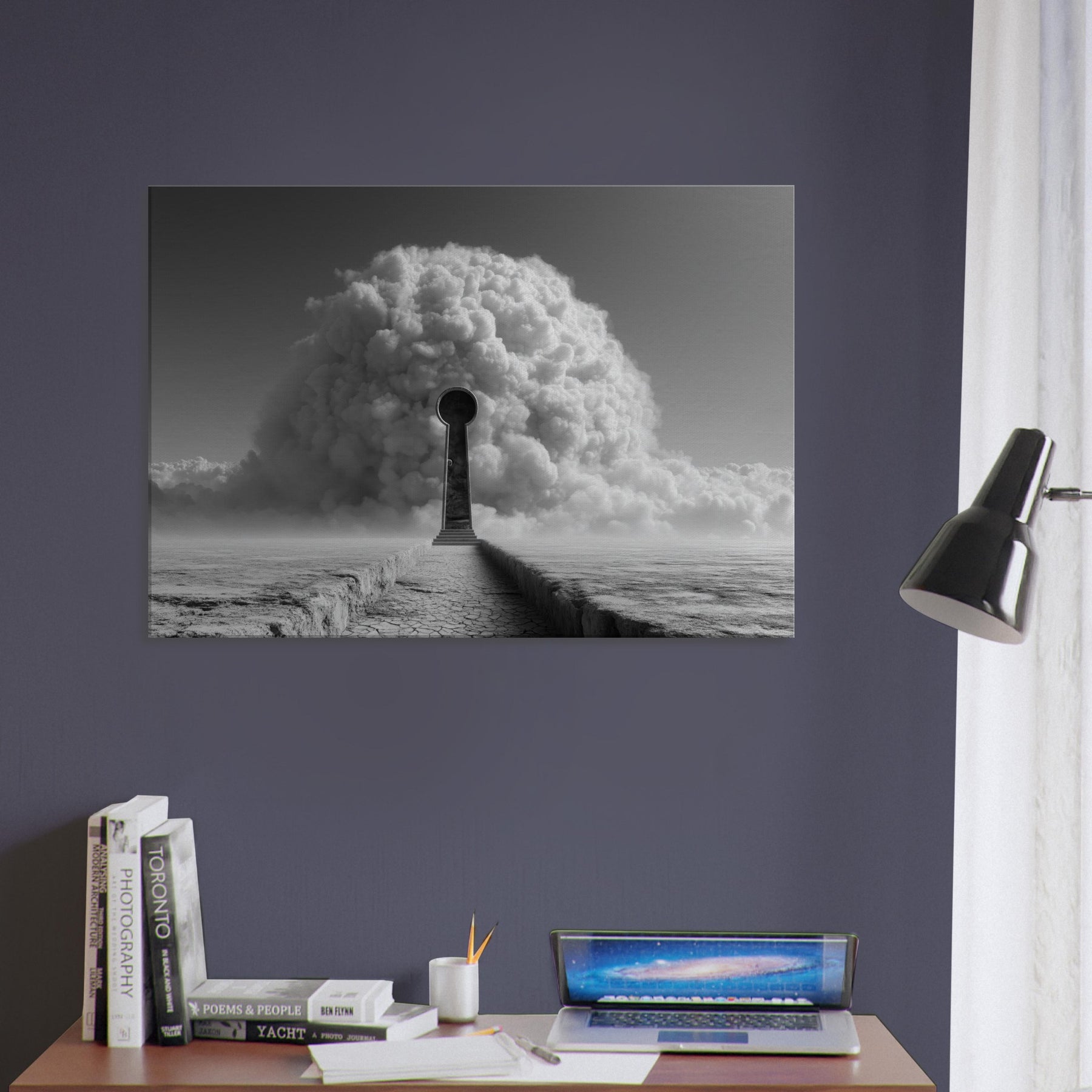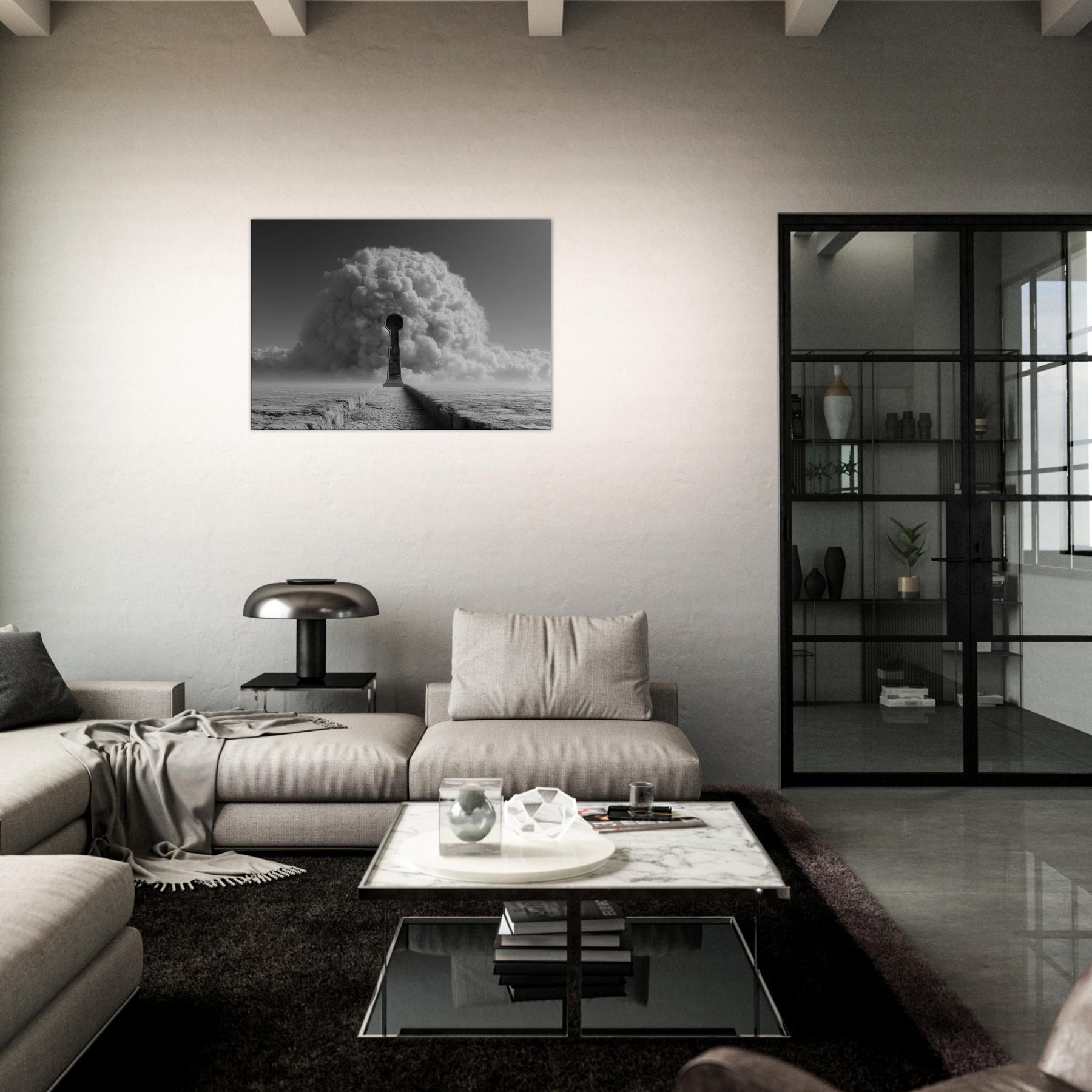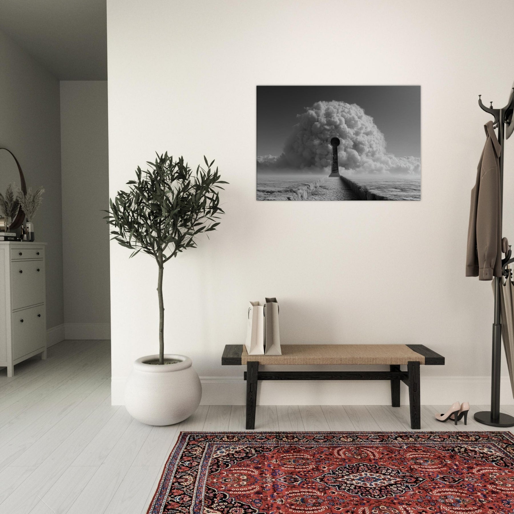Key & Keyhole opens a quiet horizon in your living room, where a long, cracked path slices through a frost lit plain toward a monumental doorway. The black and white tones hum with memory and mystery, inviting stillness and curiosity in equal measure. This surreal composition reframes the everyday as ceremony every glance reveals a new gesture of longing, invitation, and release. Hang it above a sofa or desk to anchor conversations, layering light, texture, and imagination into your space.