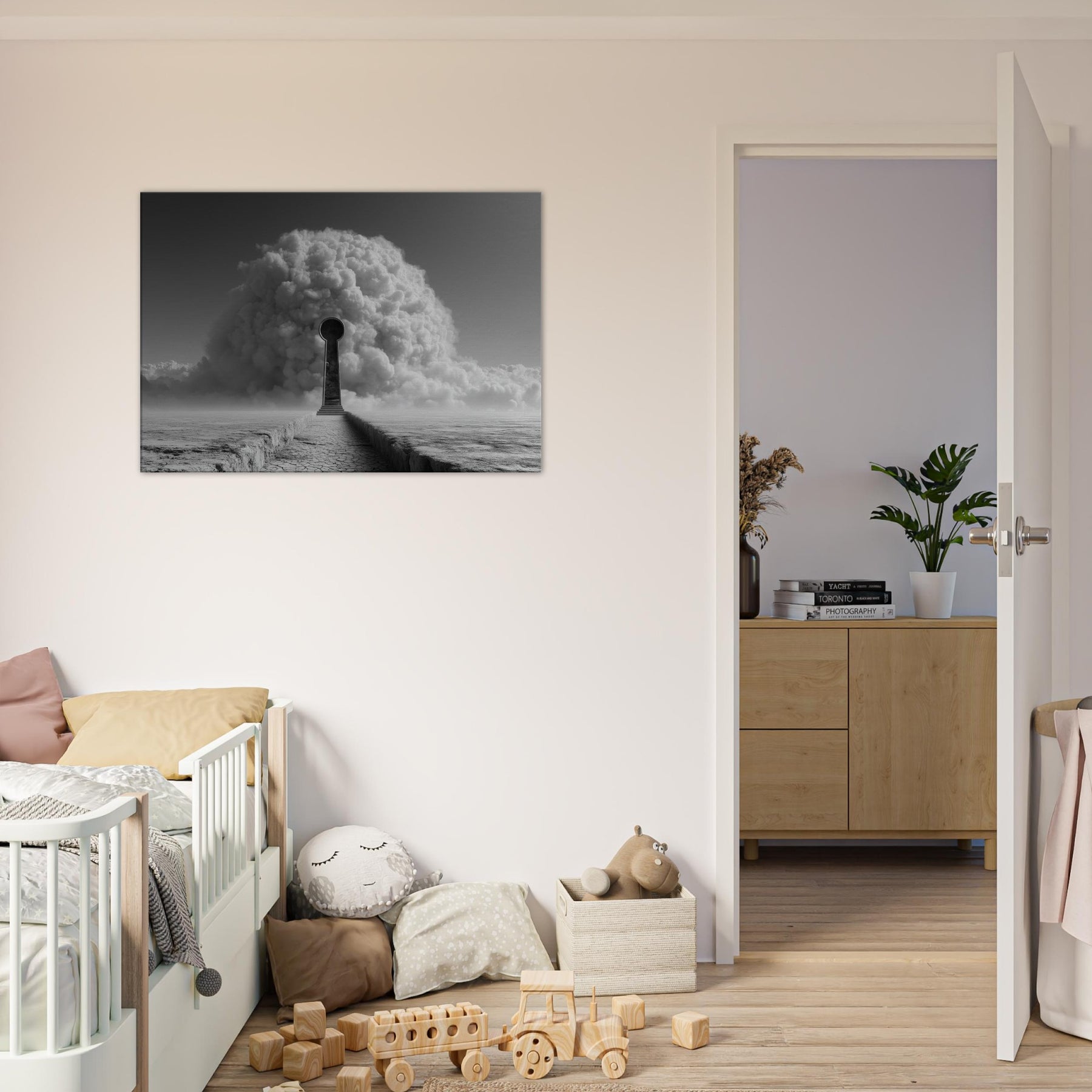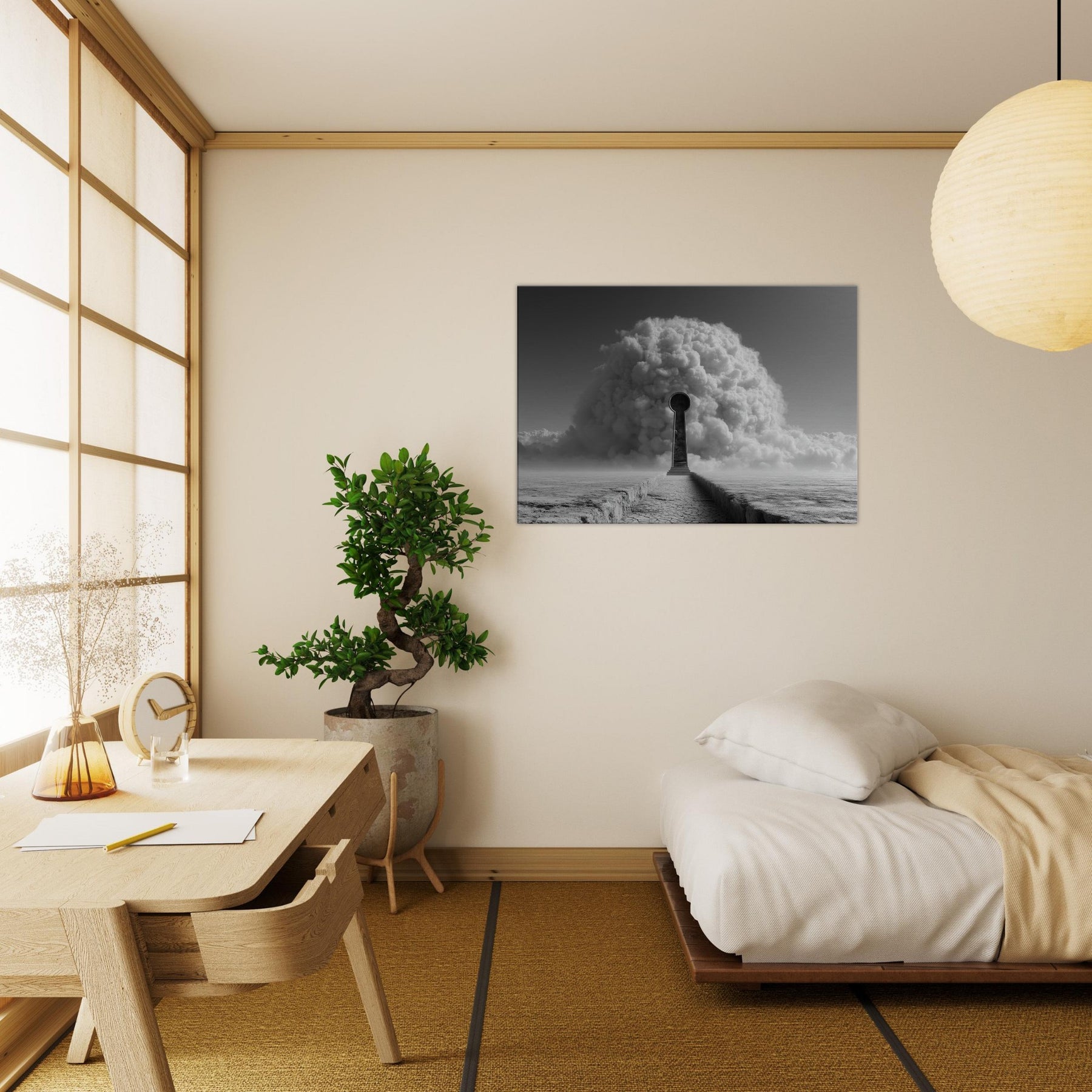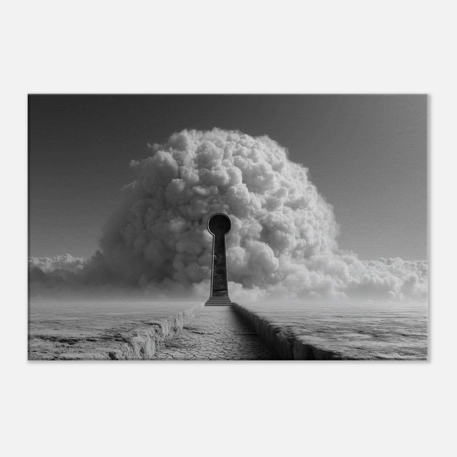 Key & Keyhole opens a quiet horizon in your living room, where a long, cracked path slices through a frost lit plain toward a monumental doorway. The black and white tones hum with memory and mystery, inviting stillness and curiosity in equal measure. This surreal composition reframes the everyday as ceremony every glance reveals a new gesture of longing, invitation, and release. Hang it above a sofa or desk to anchor conversations, layering light, texture, and imagination into your space.