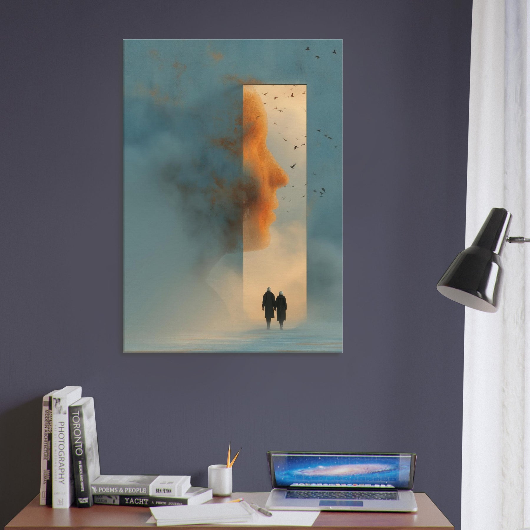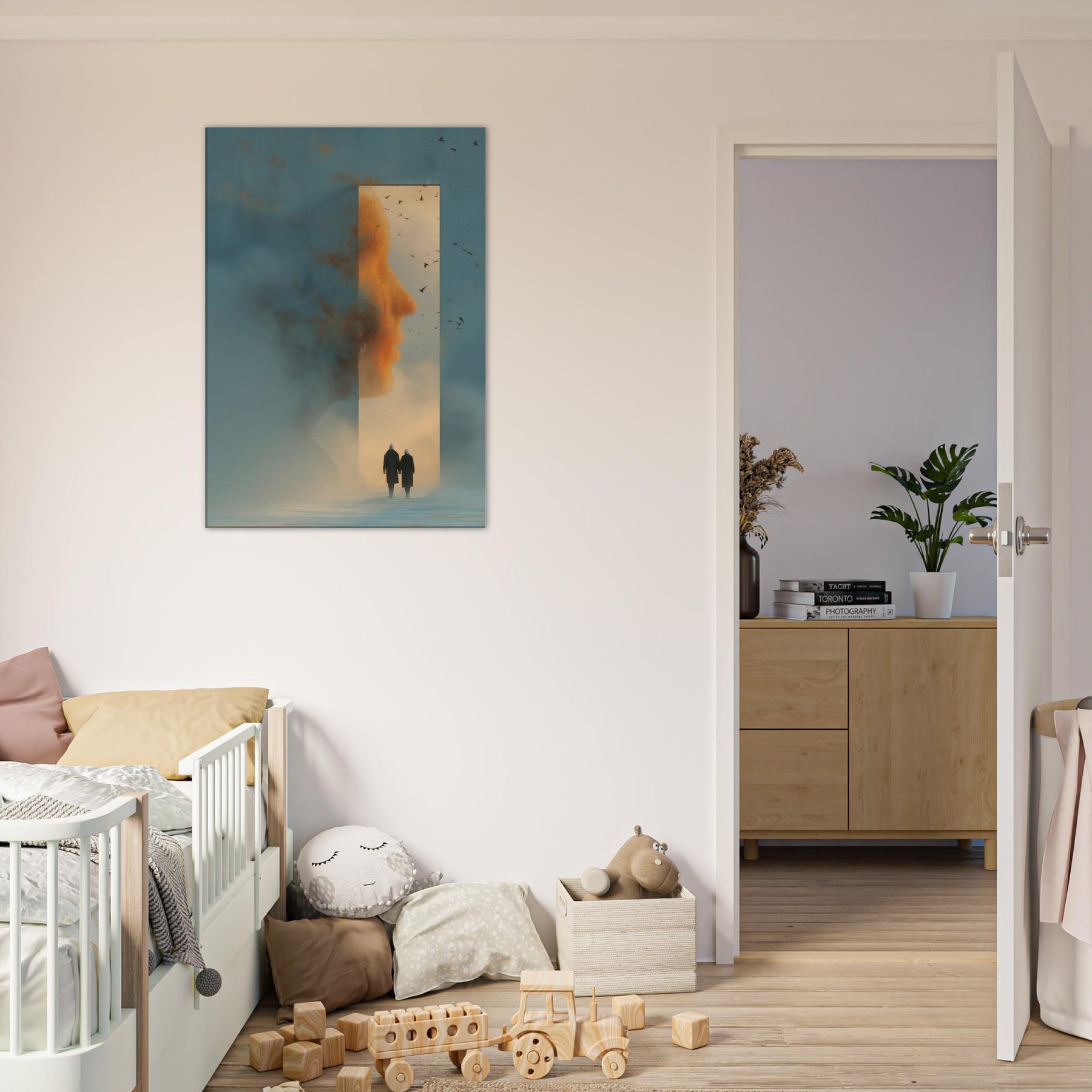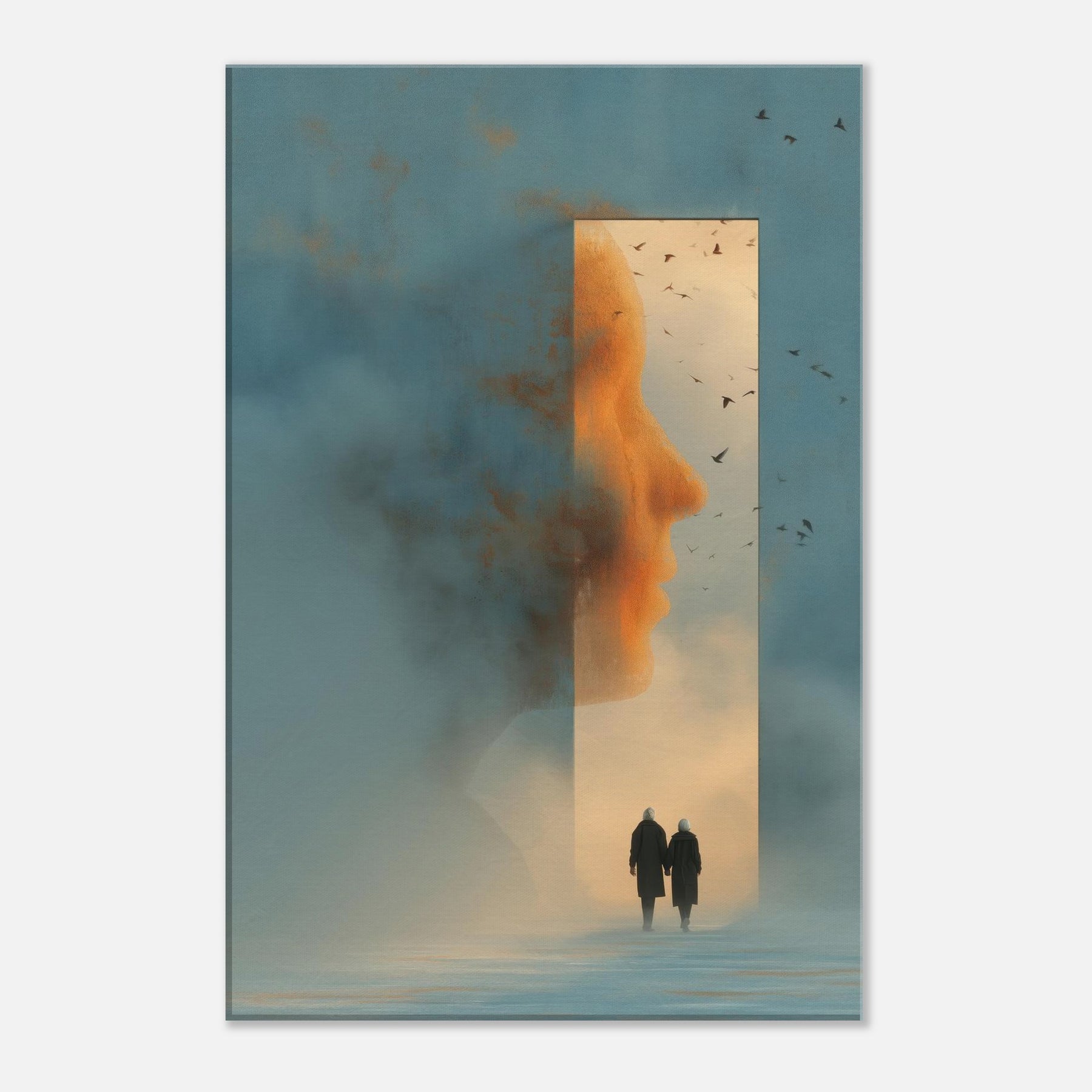 Step into a quiet threshold where a towering profile emerges from mist, and a couple walking hand in hand become witnesses to a living dream. This surreal composition threads warm, sunlit flesh through a slender doorway, echoing memory and distance as birds skim a pale sky. The soft fog and bold blue surround the scene, inviting contemplation and conversation. Hung in your space, it lends a sculptural presence, turning walls into an intimate horizon and elevating everyday spaces with a tranquil, cinematic glow.