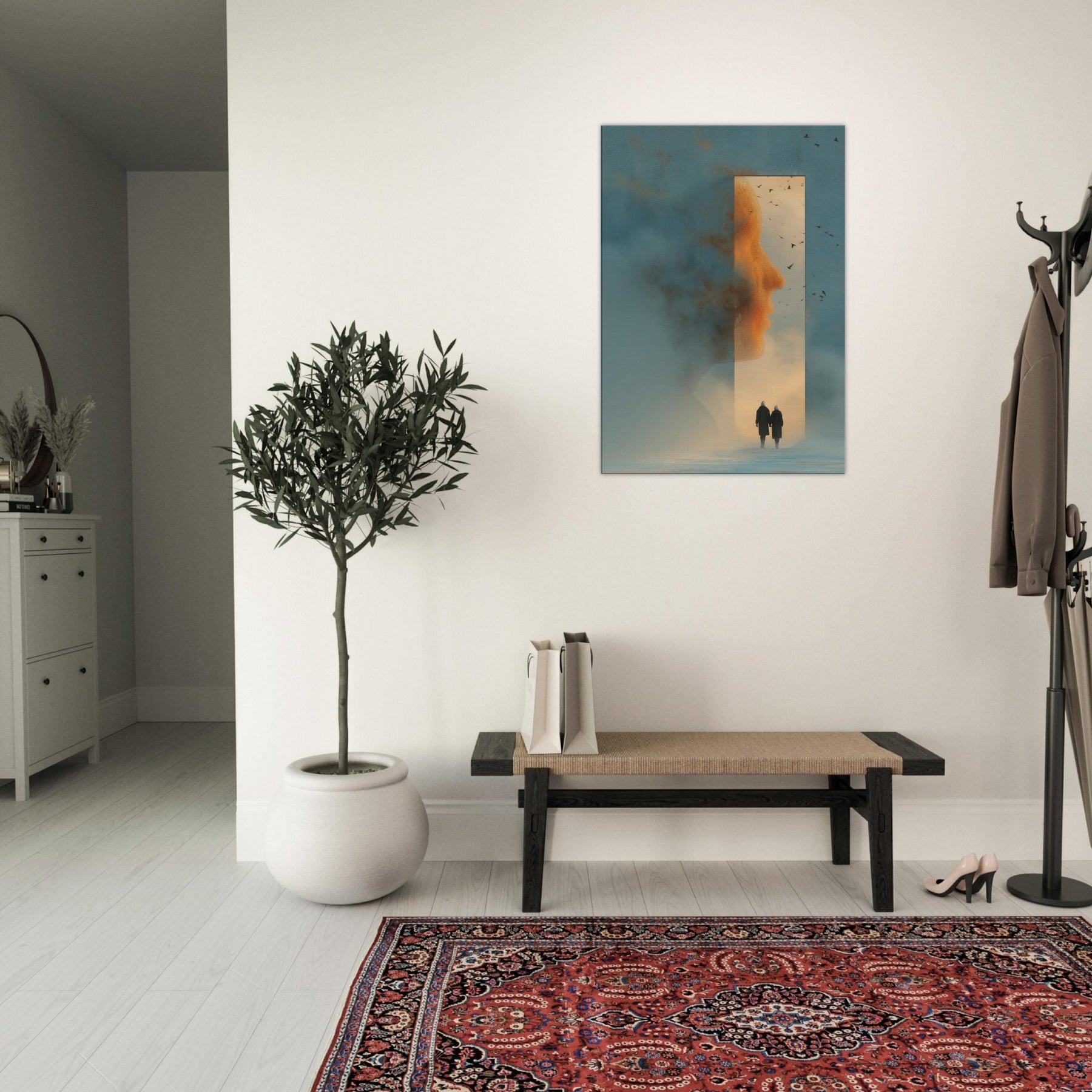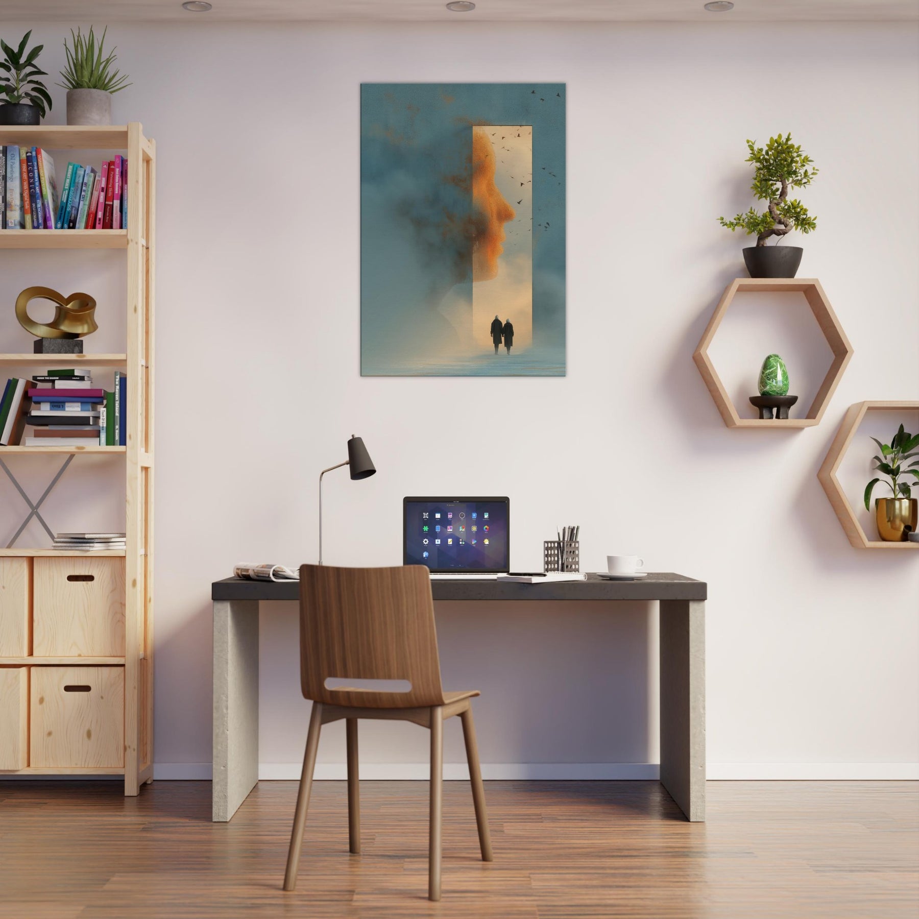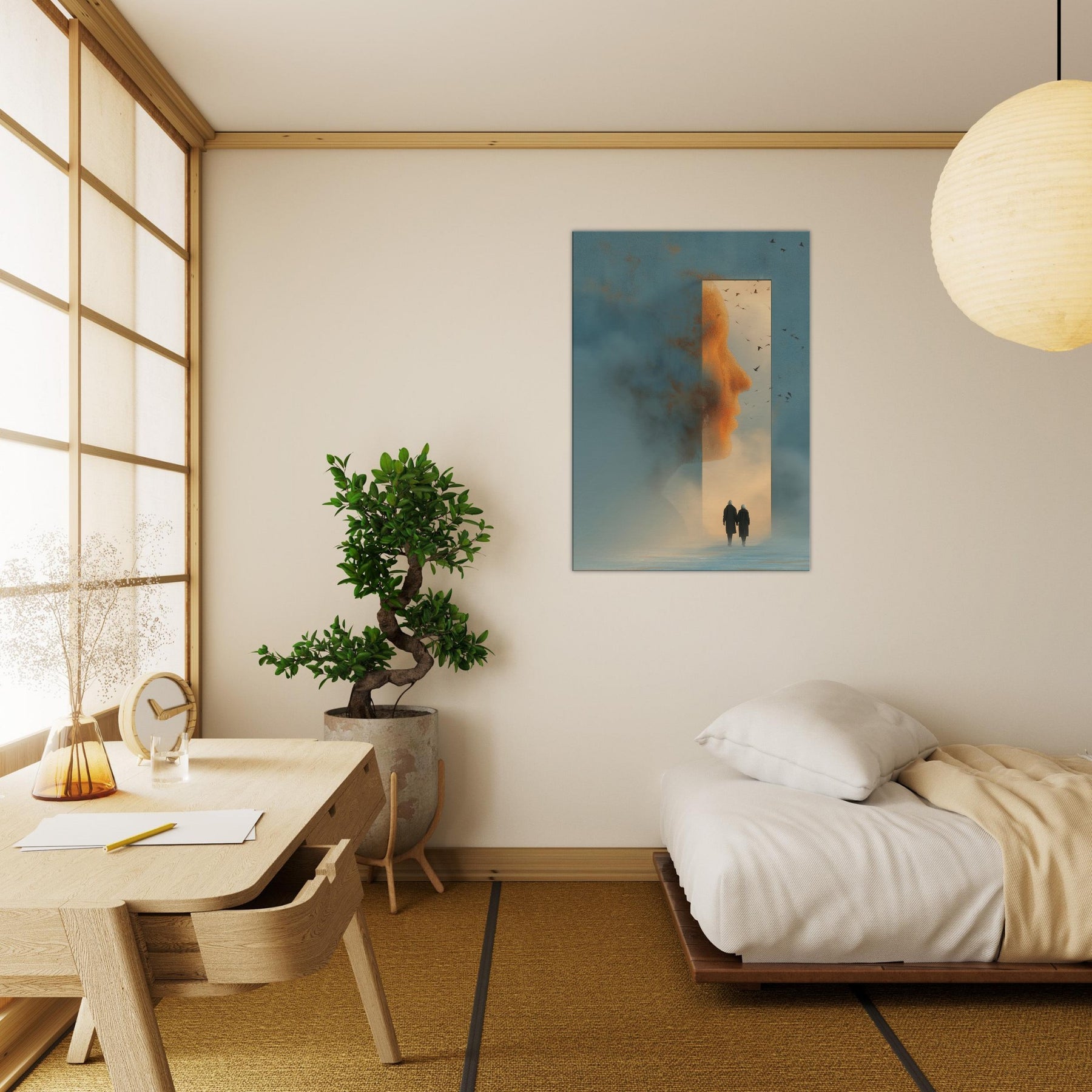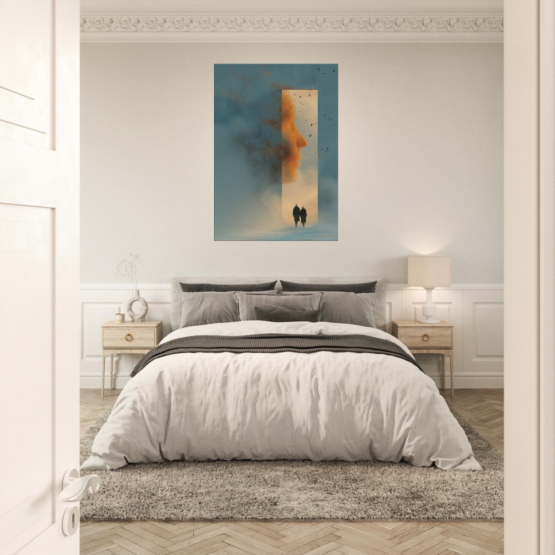 Step into a quiet threshold where a towering profile emerges from mist, and a couple walking hand in hand become witnesses to a living dream. This surreal composition threads warm, sunlit flesh through a slender doorway, echoing memory and distance as birds skim a pale sky. The soft fog and bold blue surround the scene, inviting contemplation and conversation. Hung in your space, it lends a sculptural presence, turning walls into an intimate horizon and elevating everyday spaces with a tranquil, cinematic glow.