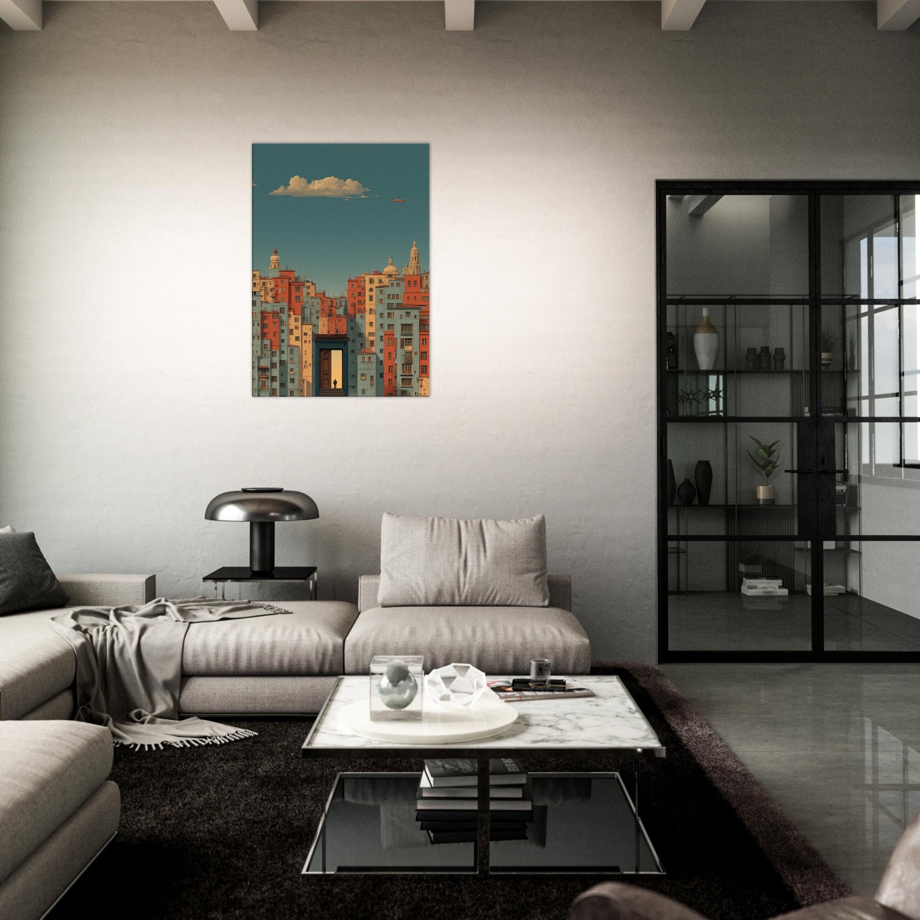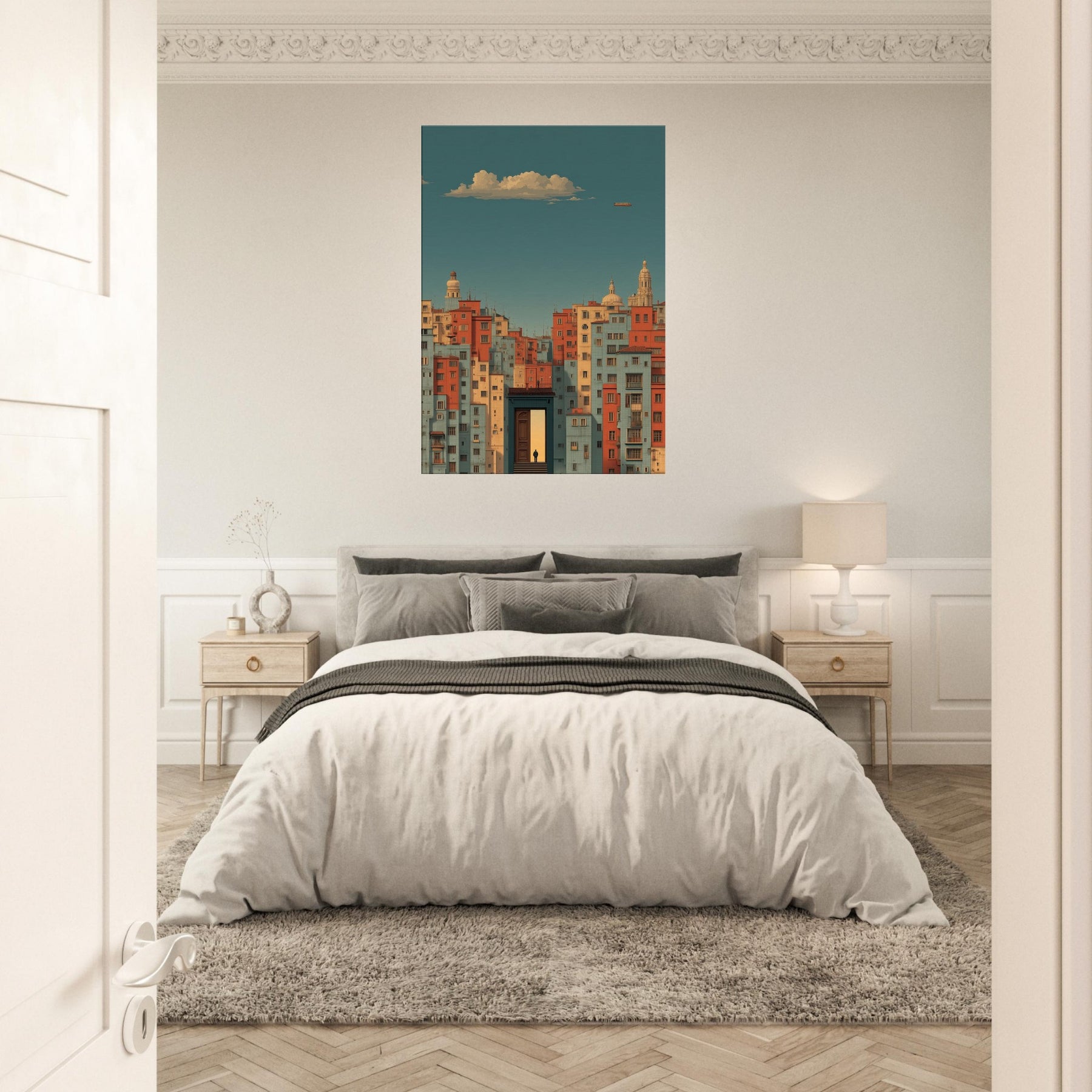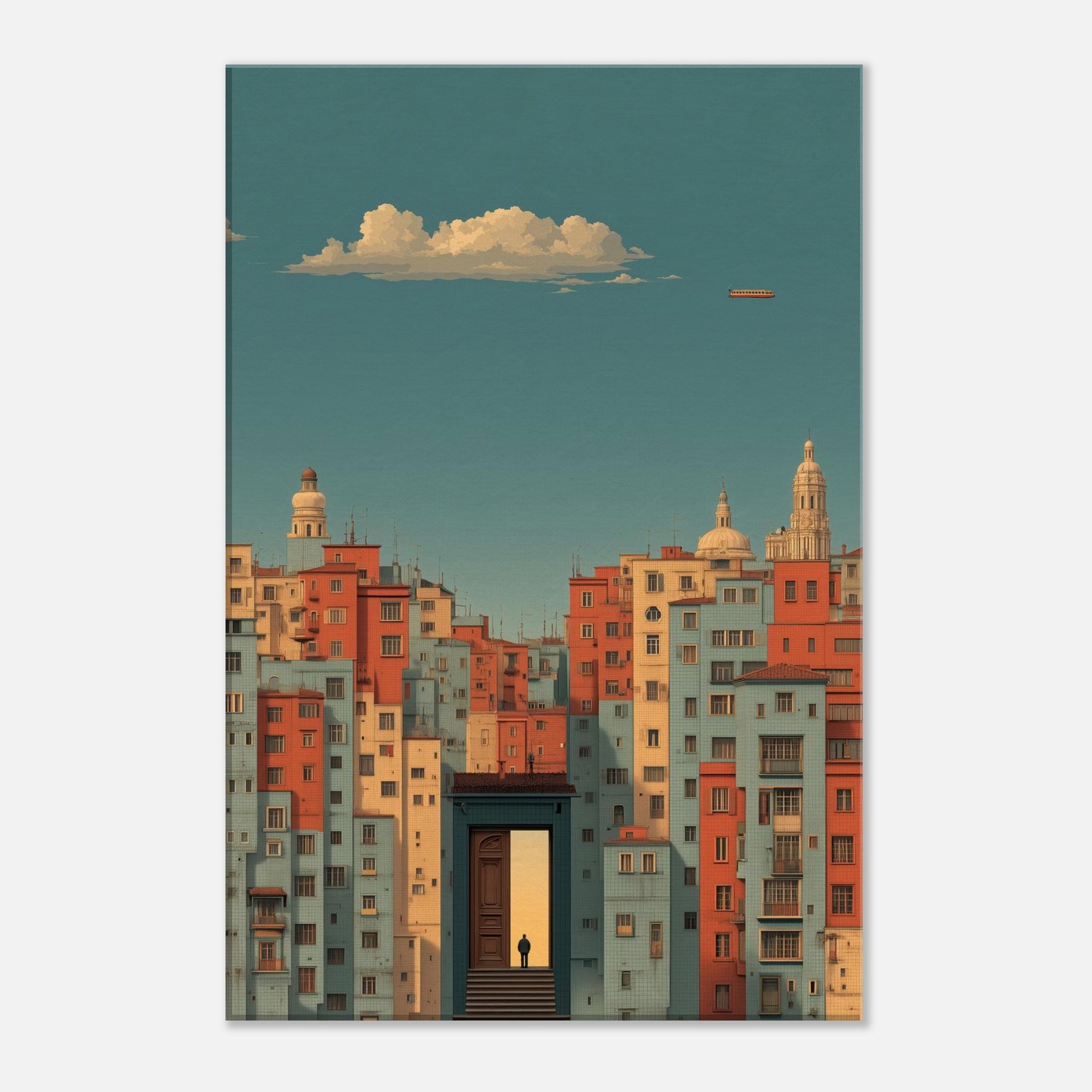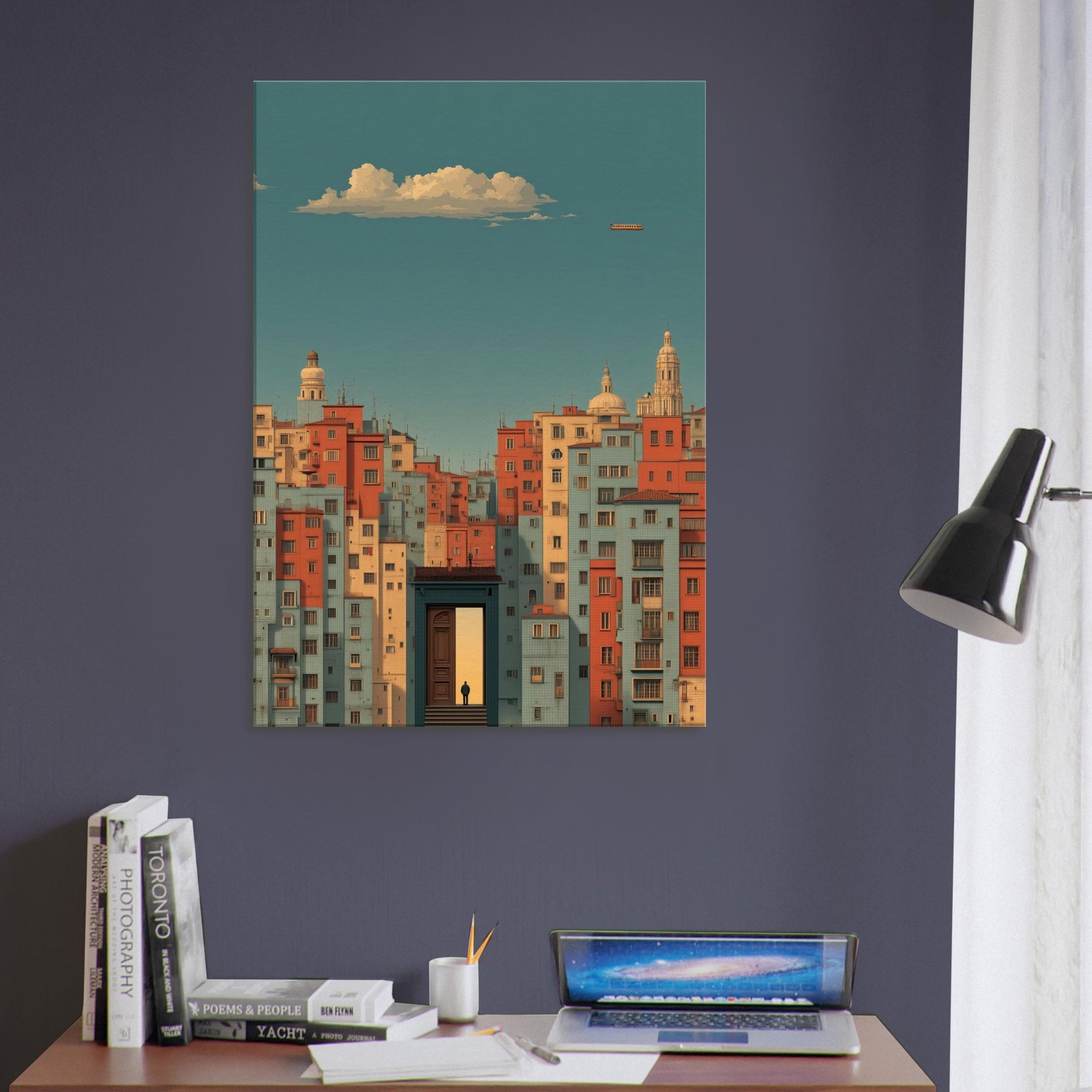 Prague unfolds within a dream: a street of color blocked towers that thins into a doorway, where a lone silhouette steps into light. This surreal composition blends memory and architecture, turning the city into a living, breathing . The air seems to hum with warm amber and cool blue, inviting quiet contemplation. Hang it in a living room or study to conjure a sense of scale, wonder, and gravity defying calm a visual poem that makes every evening feel cinematic.