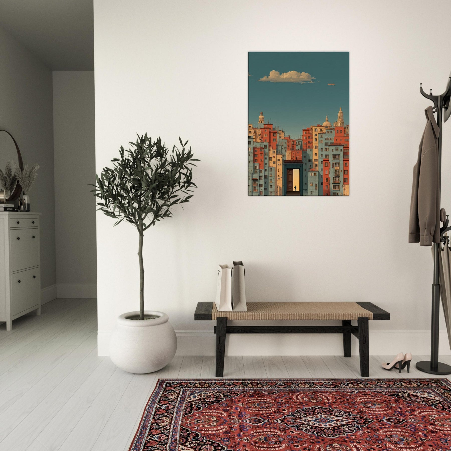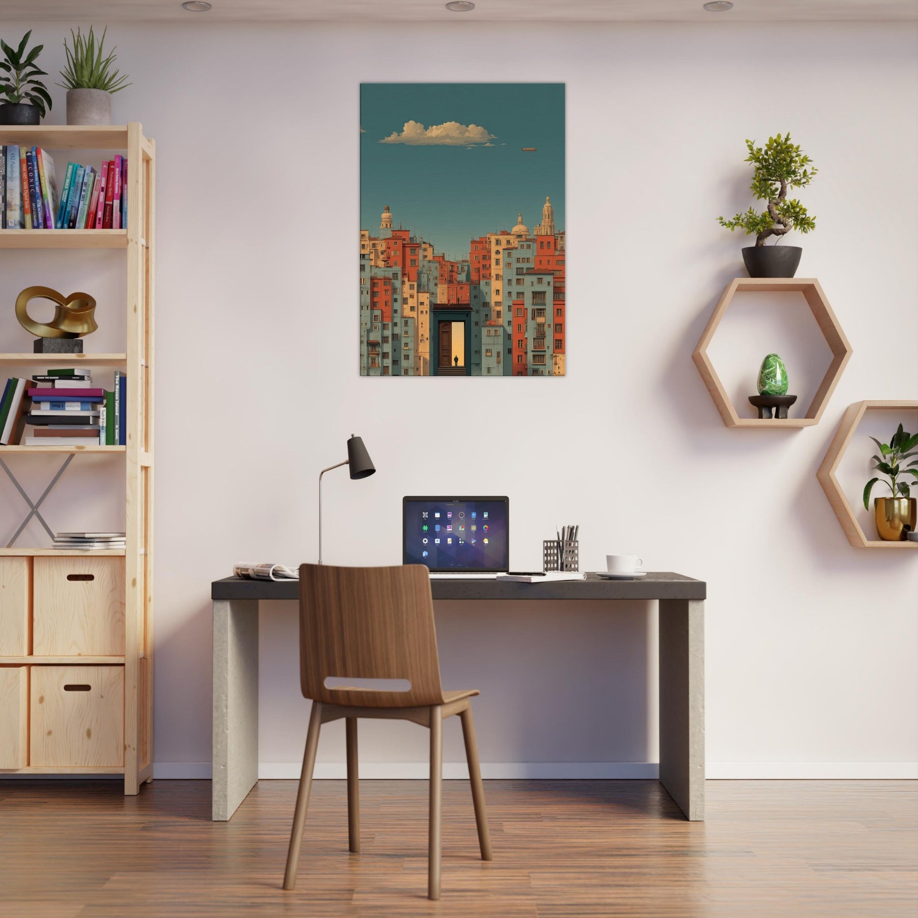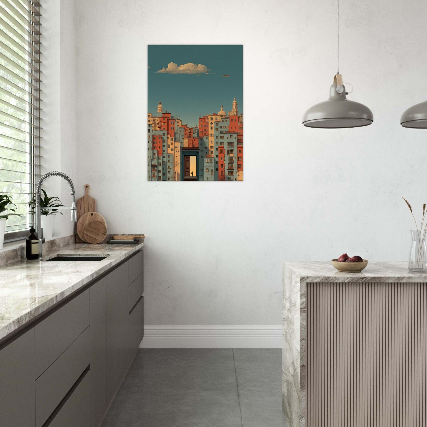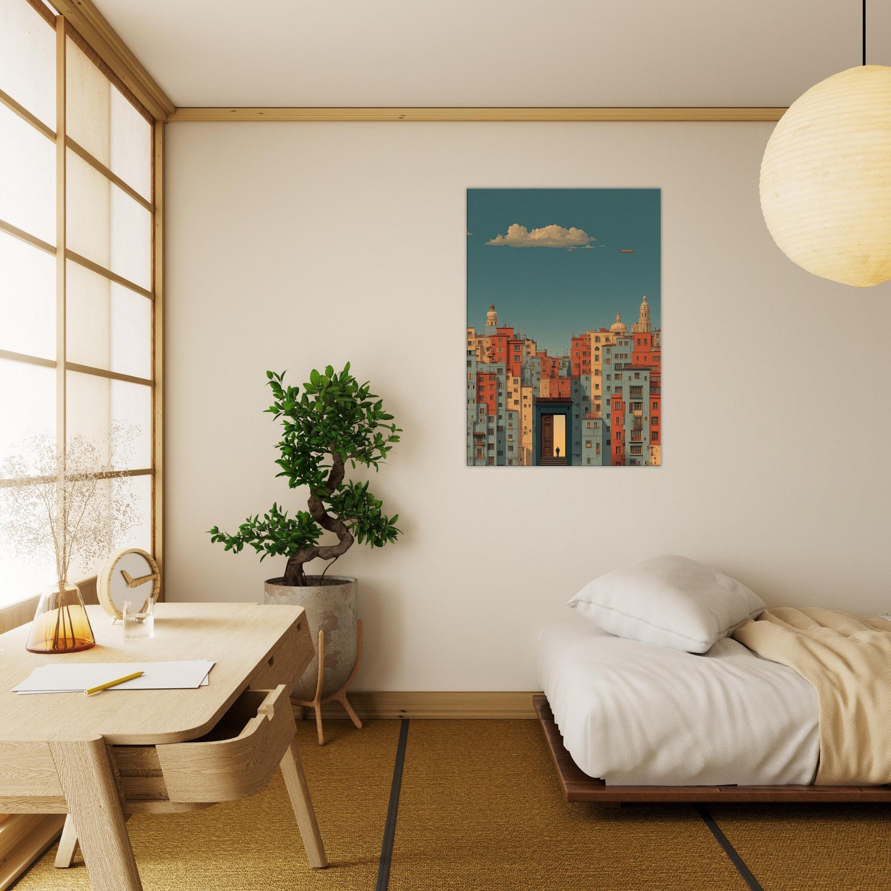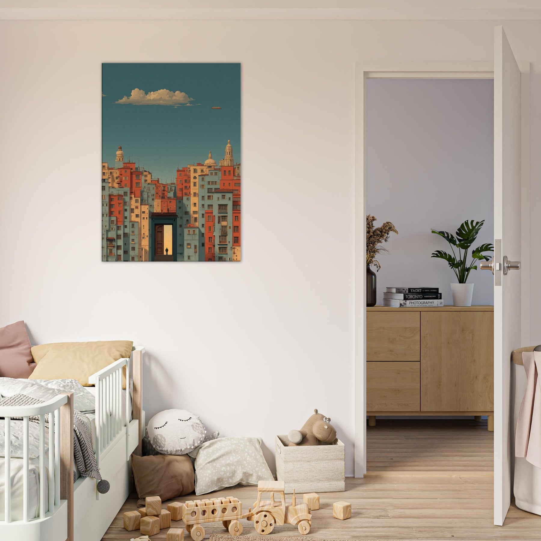 Prague unfolds within a dream: a street of color blocked towers that thins into a doorway, where a lone silhouette steps into light. This surreal composition blends memory and architecture, turning the city into a living, breathing . The air seems to hum with warm amber and cool blue, inviting quiet contemplation. Hang it in a living room or study to conjure a sense of scale, wonder, and gravity defying calm a visual poem that makes every evening feel cinematic.