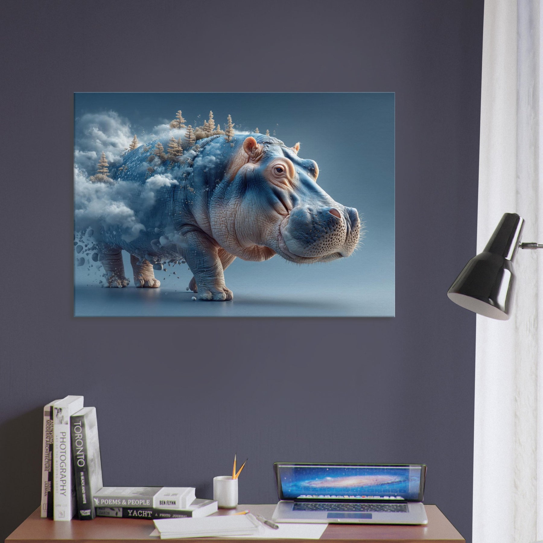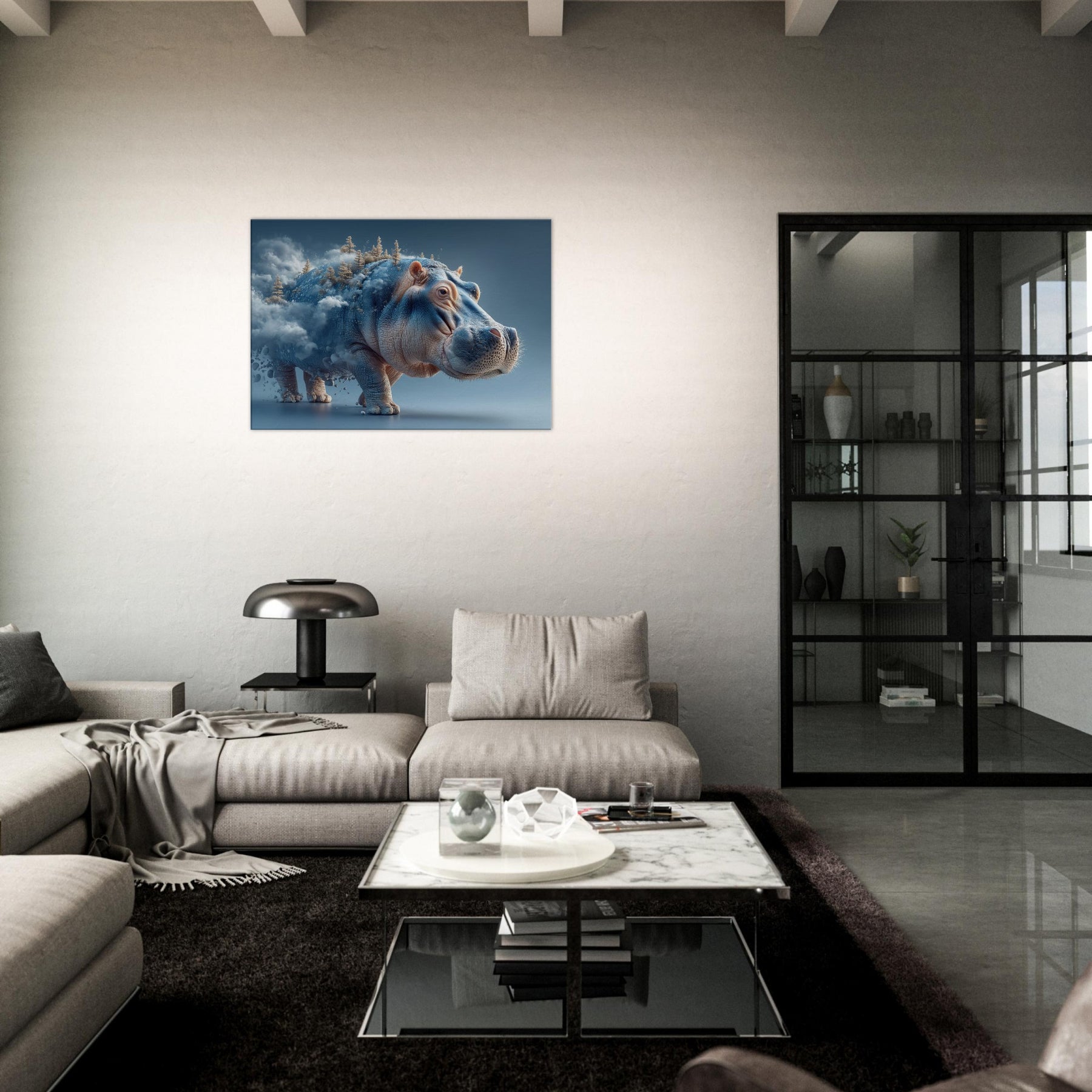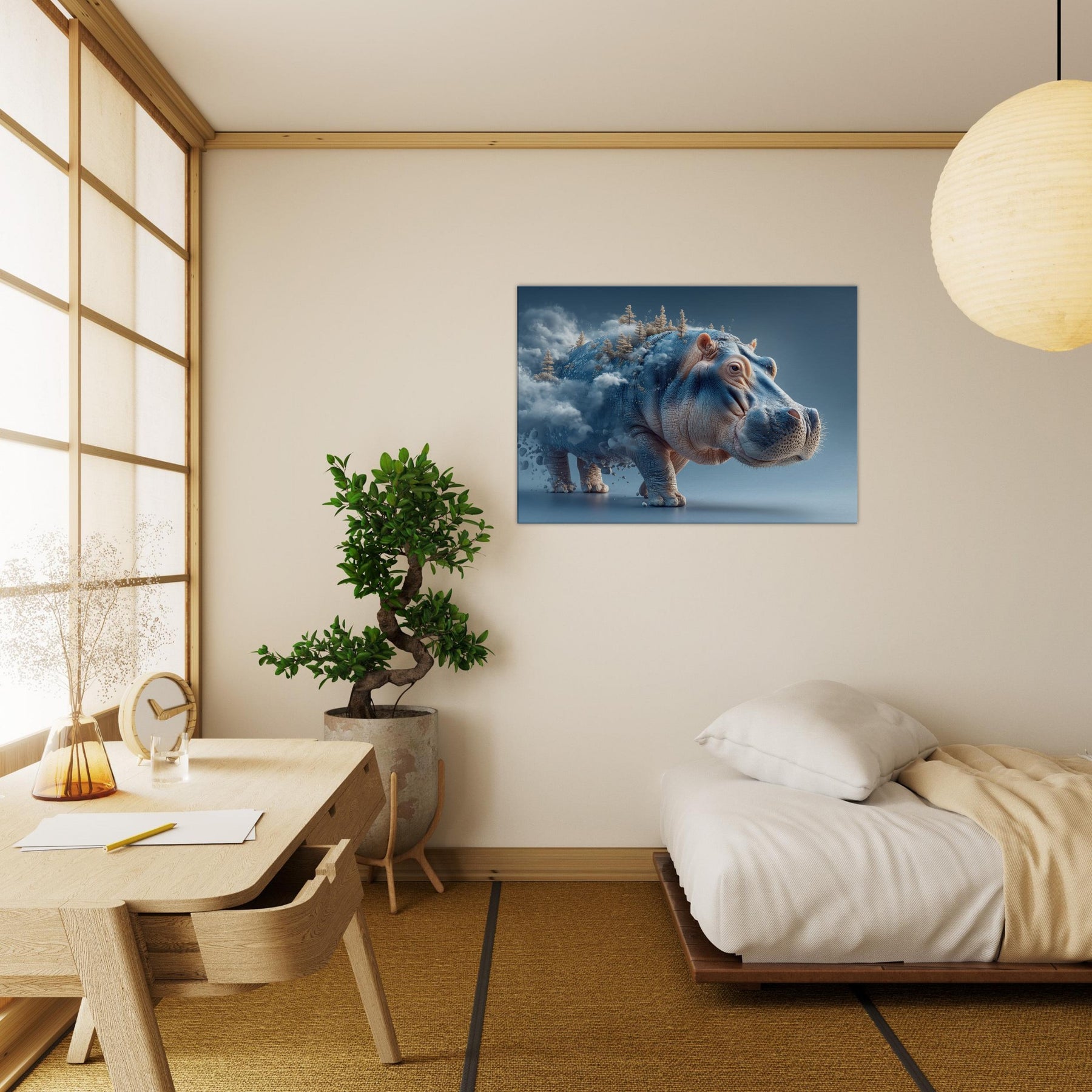 Within this dreamlike , a Hippopotamus becomes a living canvas for a floating clouds drift over its rugged hide, and pine topped hills bloom along its spine. The surreal fusion of creature and atmosphere invites a sense of stillness, as if time itself has paused to listen. The cool blues and warm, sunset accents lend serenity to any room, turning walls into a window of quiet majesty. Perfect above a sofa or console, it enriches space with imagination and a breathable, tranquil mood.