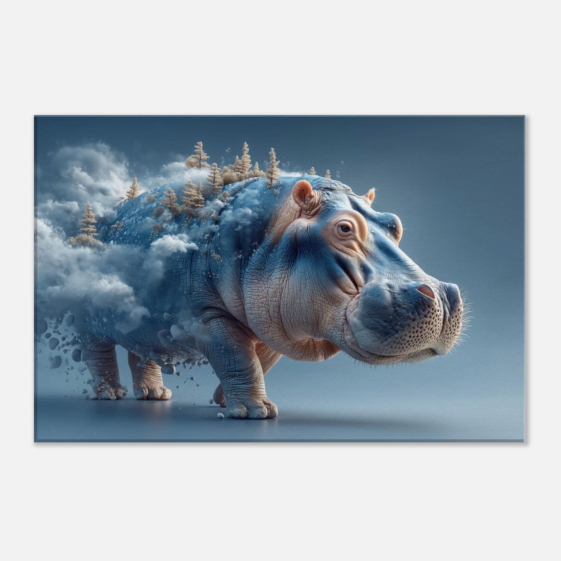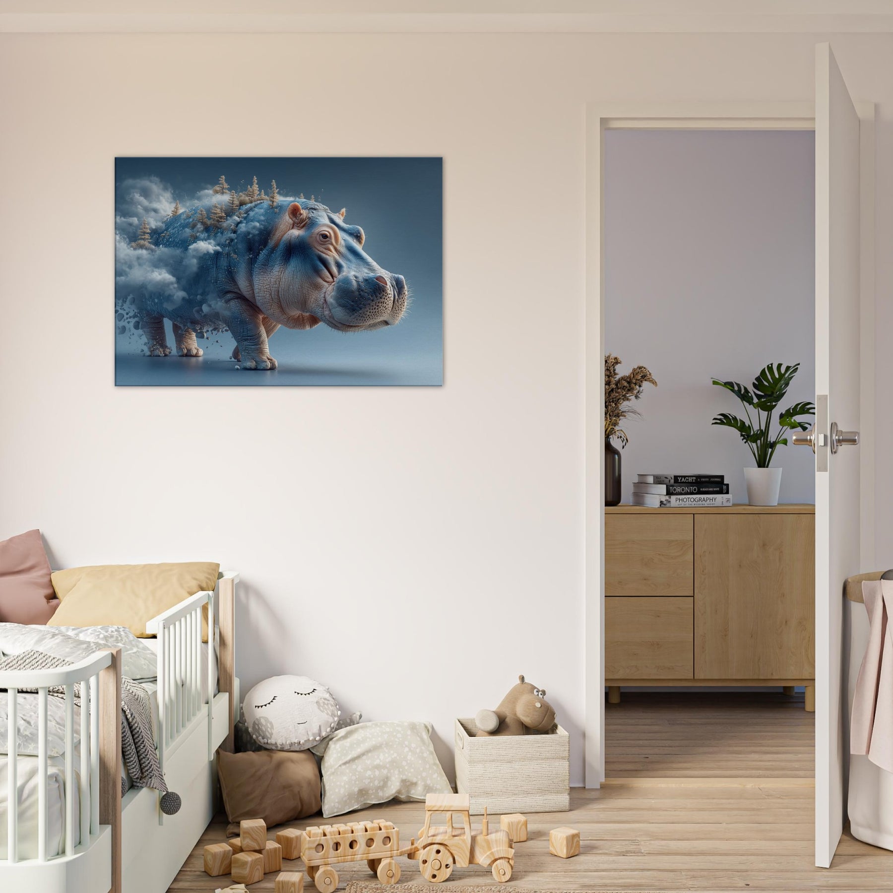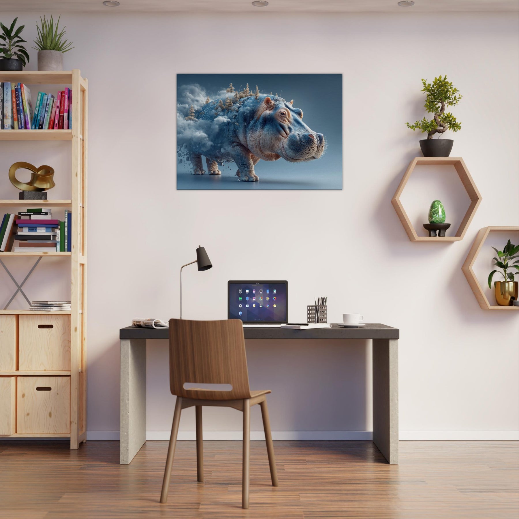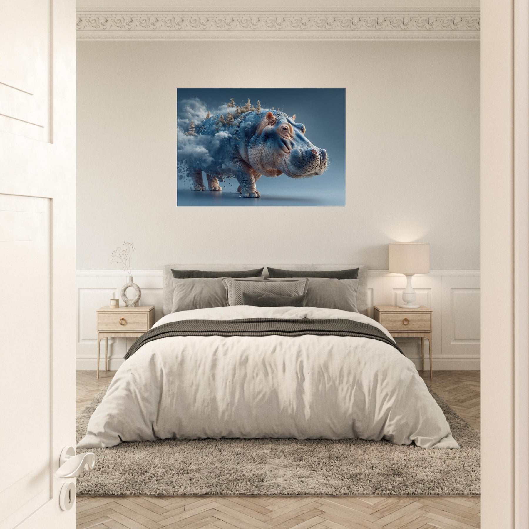 Within this dreamlike , a Hippopotamus becomes a living canvas for a floating clouds drift over its rugged hide, and pine topped hills bloom along its spine. The surreal fusion of creature and atmosphere invites a sense of stillness, as if time itself has paused to listen. The cool blues and warm, sunset accents lend serenity to any room, turning walls into a window of quiet majesty. Perfect above a sofa or console, it enriches space with imagination and a breathable, tranquil mood.