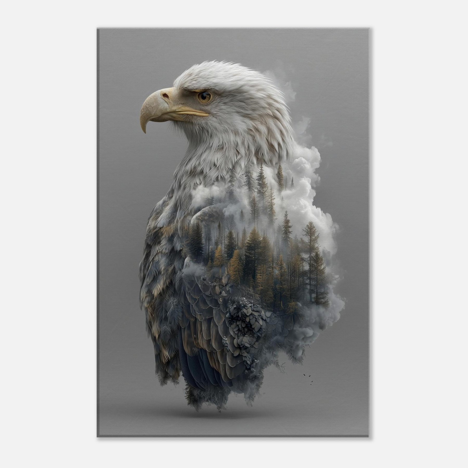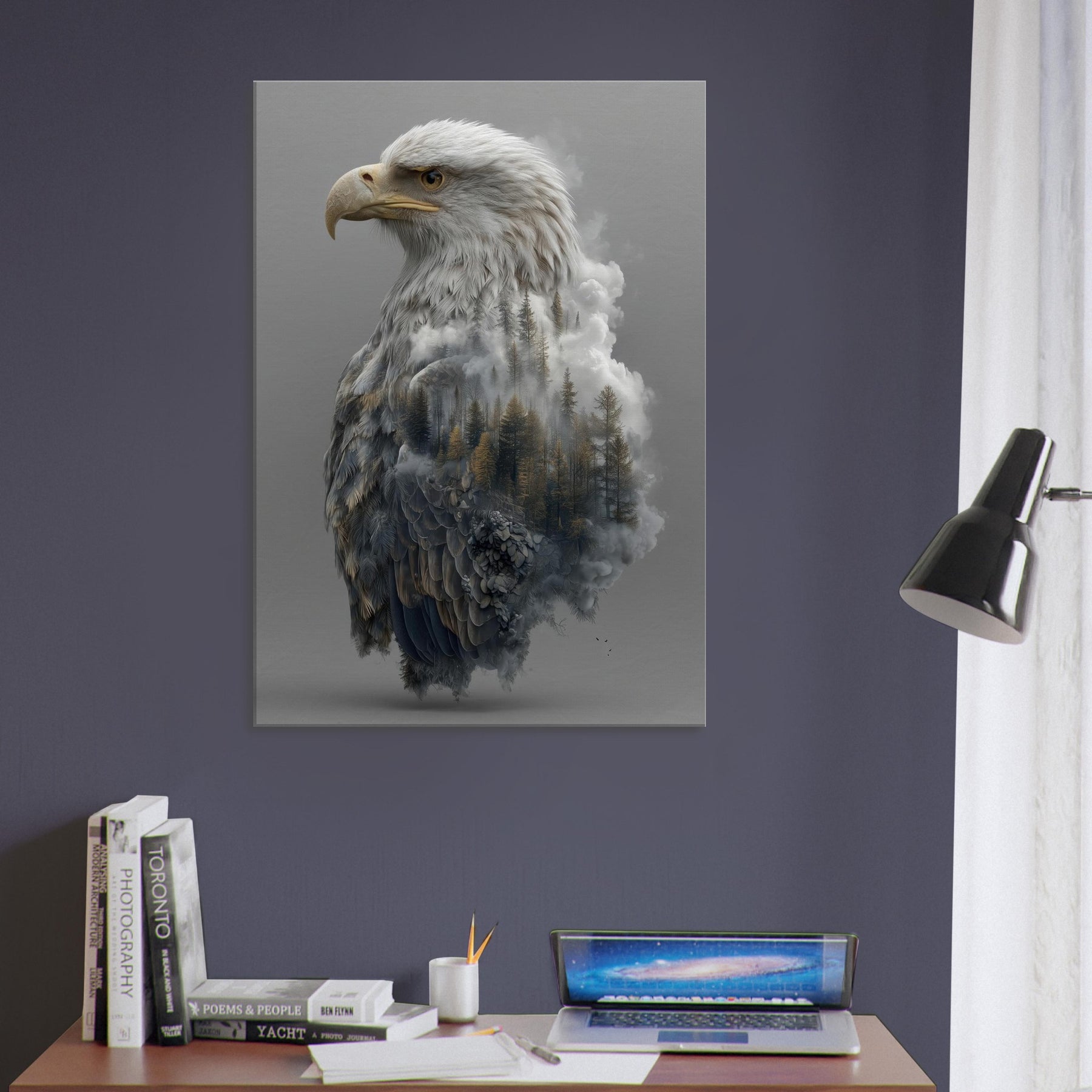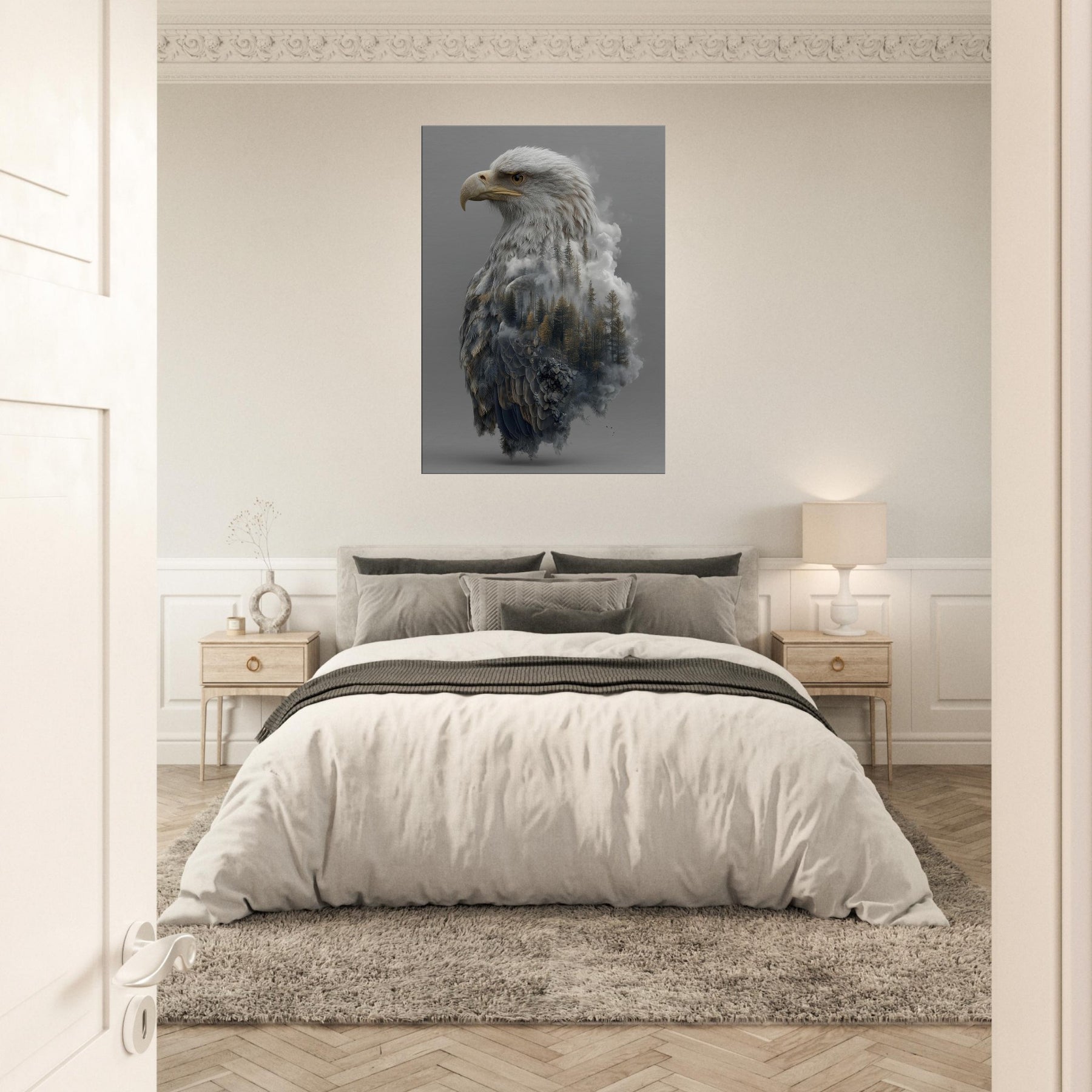 An Eagle rises from fog and firs in a dreamlike procession of air and earth. This surreal composition threads a stately gaze through the room, where feather detail shifts into mist and pines, creating a living moment you can walk into. The atmosphere is calm, cinematic, and rich with texture like a window into a quiet frontier. Perfect for a living room, study, or bedroom, it anchors your space with restrained grandeur and a sense of endless skies.