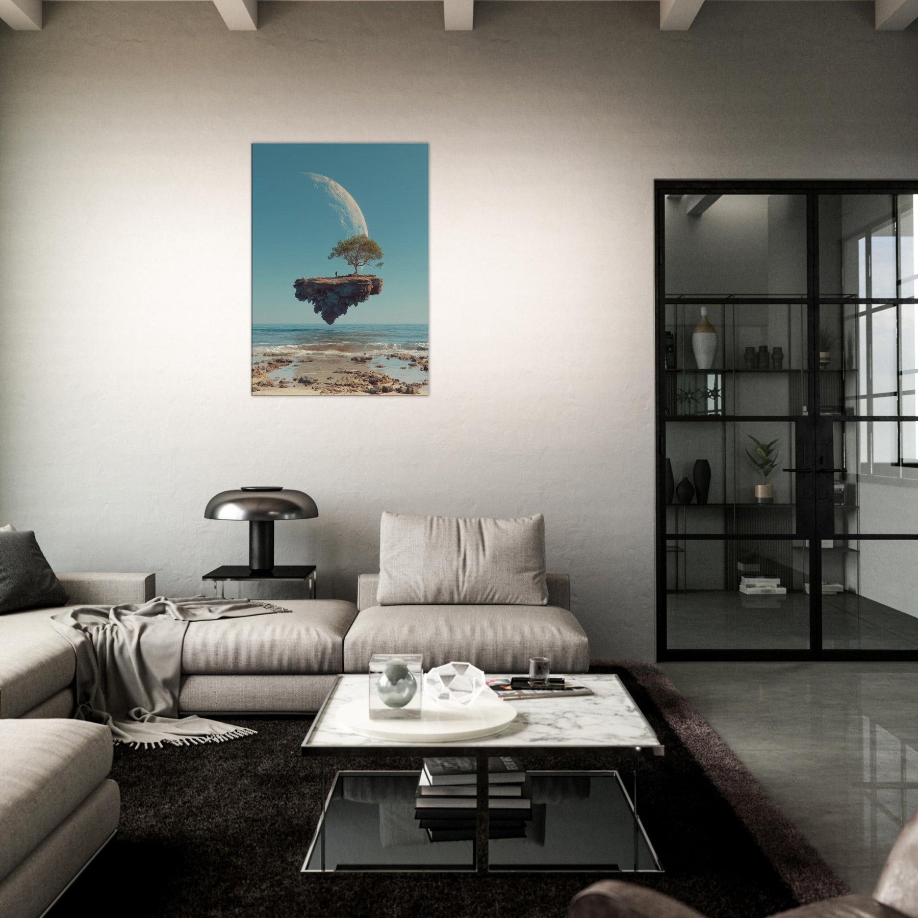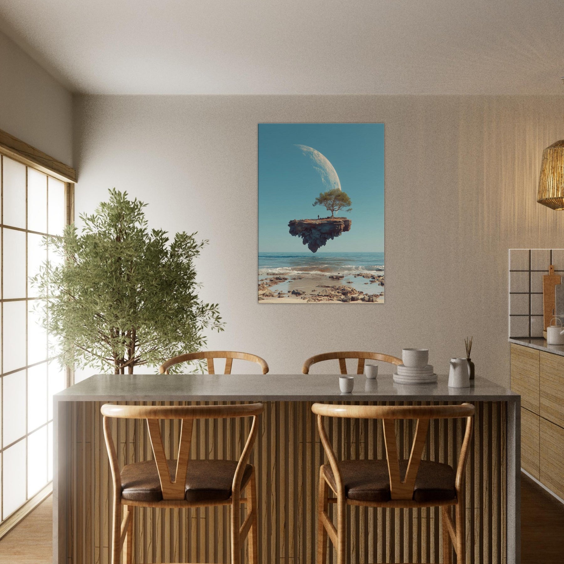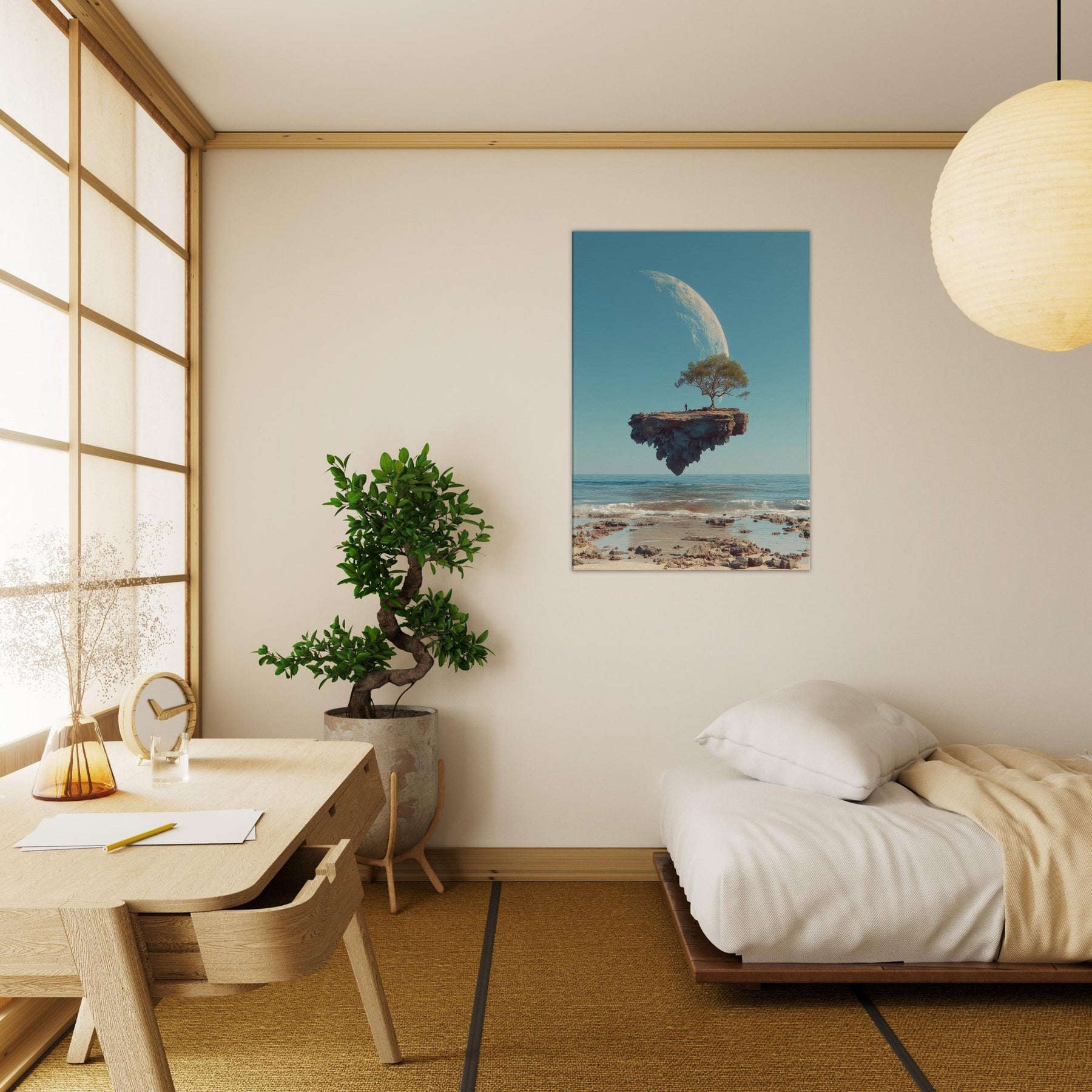 A dream made tangible, this image centers a Lone Tree perched on a suspended island, cradled by a pale, endless sky. The Surrealist echo of gravity loosens as ocean spray and wind seem to linger at the cliff's edge, inviting quiet reflection. The scene unfurls like a meditation in blue and copper, granting a room a horizon you can enter. Hang it in a living room or bedroom to soften walls with atmosphere, wonder, and a whisper of otherworldly calm.