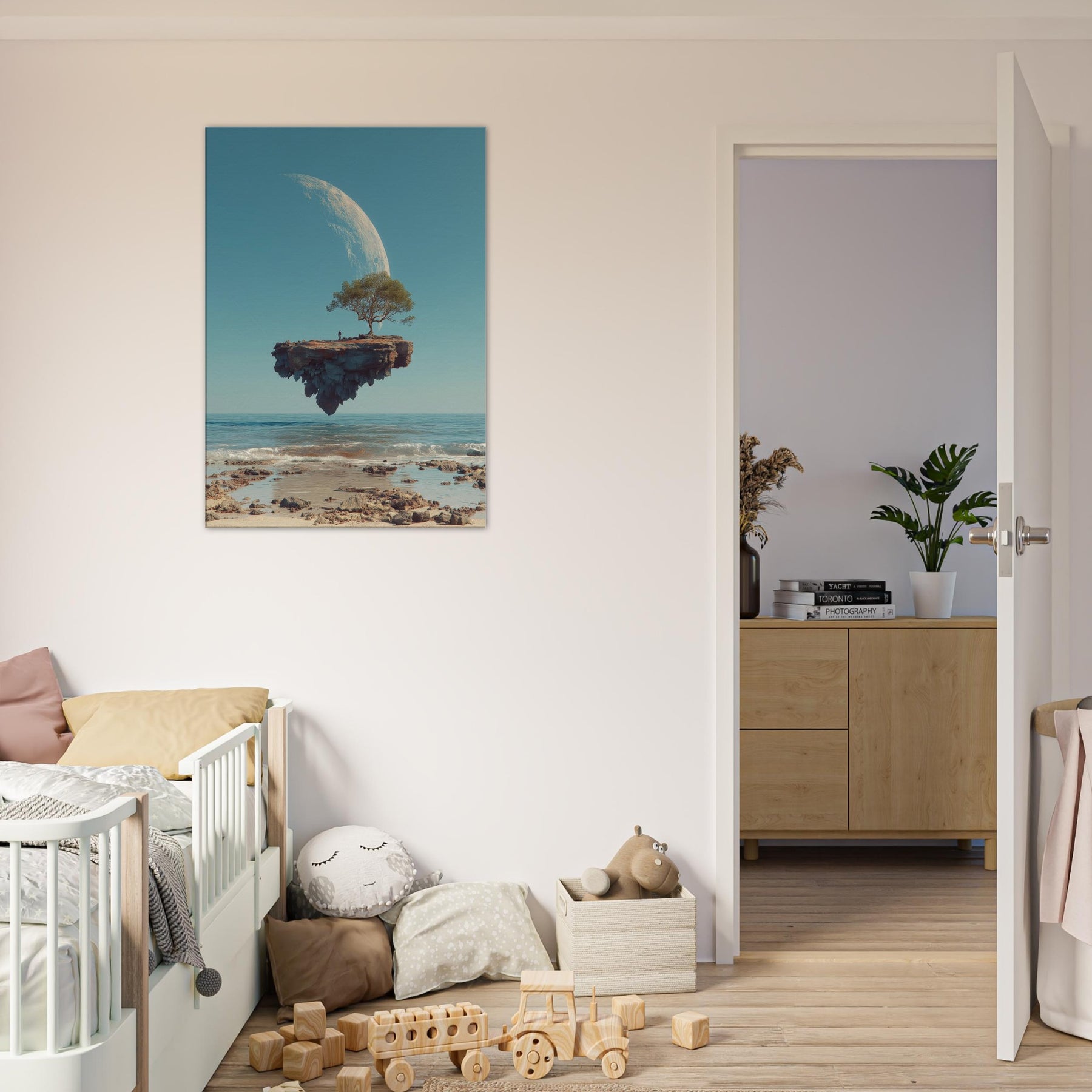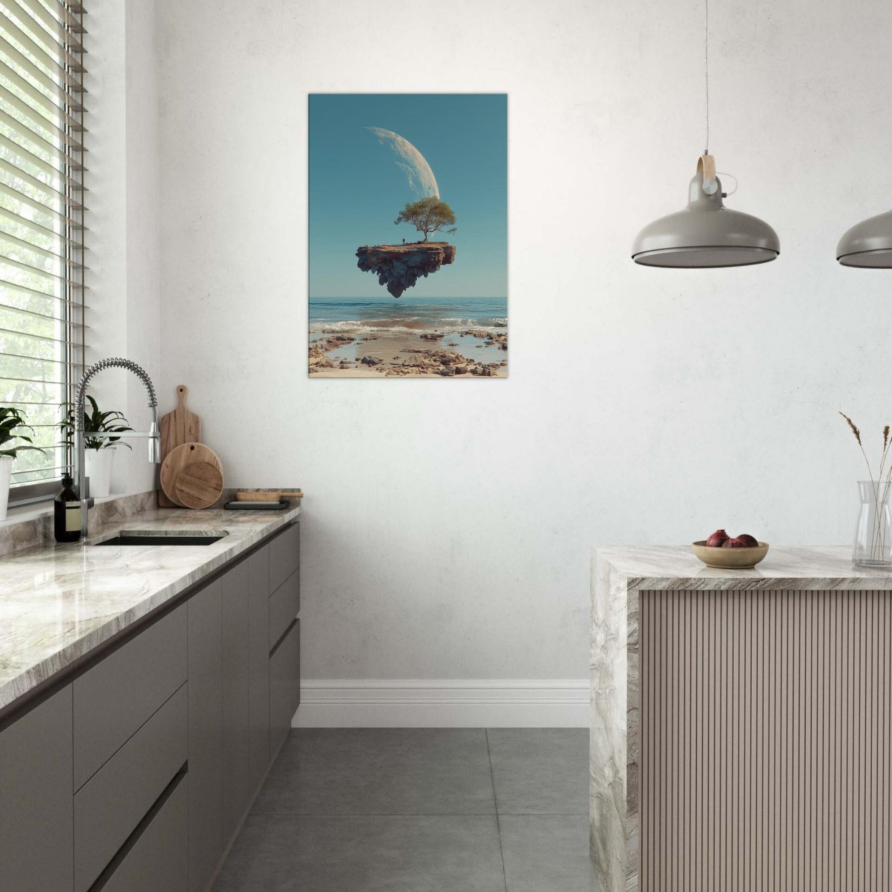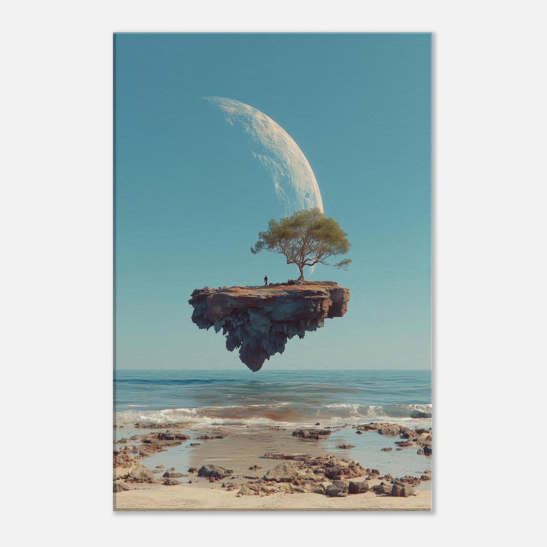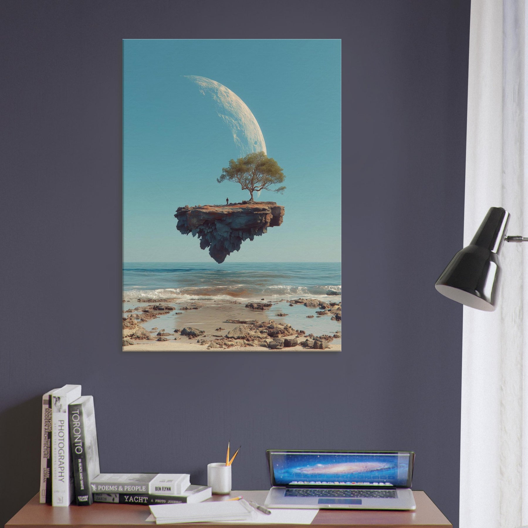 A dream made tangible, this image centers a Lone Tree perched on a suspended island, cradled by a pale, endless sky. The Surrealist echo of gravity loosens as ocean spray and wind seem to linger at the cliff's edge, inviting quiet reflection. The scene unfurls like a meditation in blue and copper, granting a room a horizon you can enter. Hang it in a living room or bedroom to soften walls with atmosphere, wonder, and a whisper of otherworldly calm.