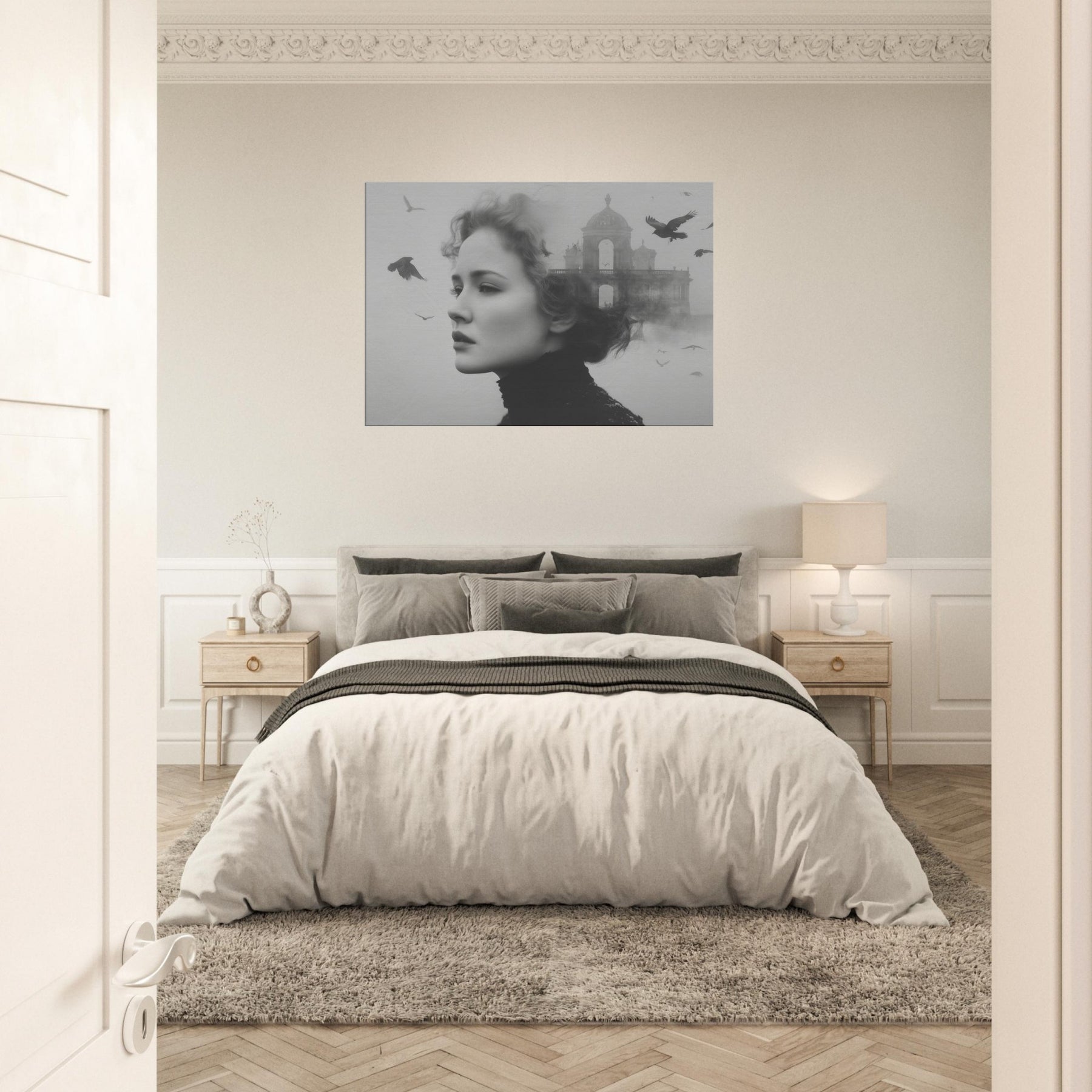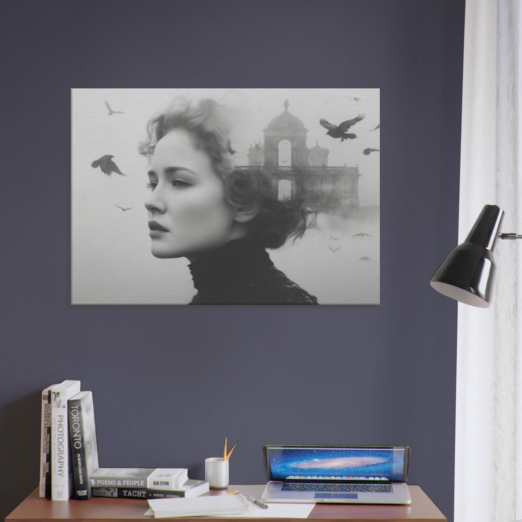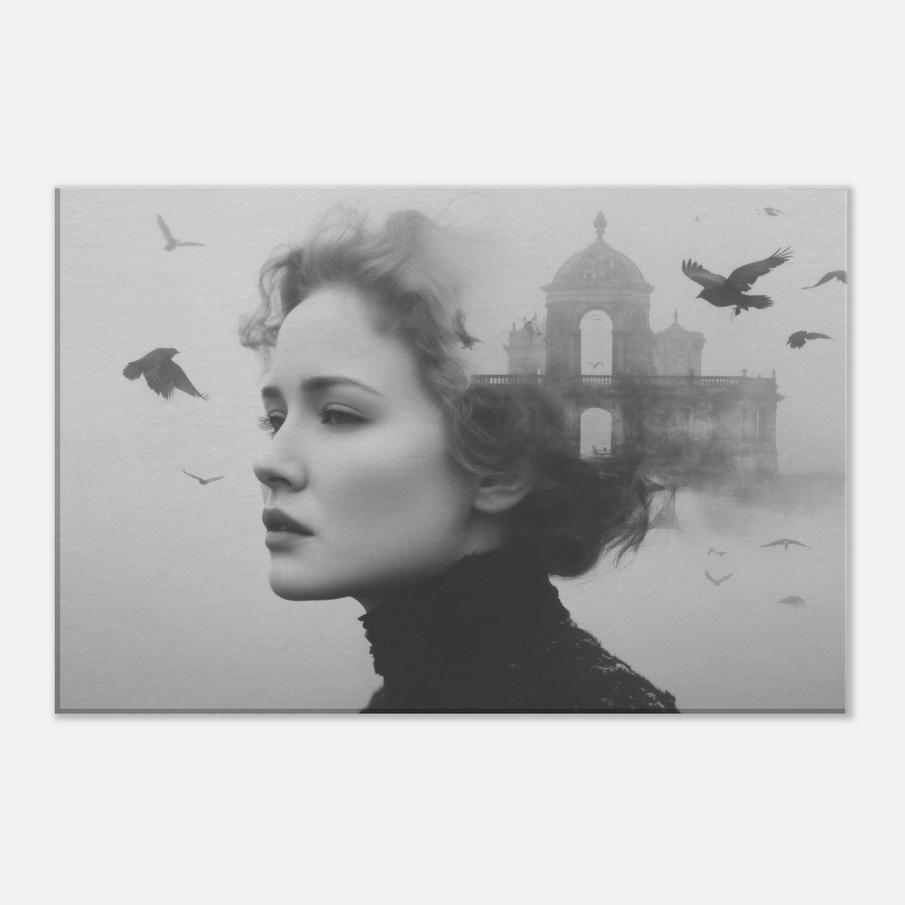 Mist wraps a poised European Woman in a hush of memory and wind. Surrounded by a ghostly arch and flocking crows, the scene dissolves the line between sitter and place, inviting quiet contemplation. Printed on archival fine art paper, the image carries a subtle, cinematic glow that enriches a living room or study with ethereal atmosphere. Ideal for spaces craving introspection, romance, and otherworldly grace, it becomes a focal point for conversation and reflection.
