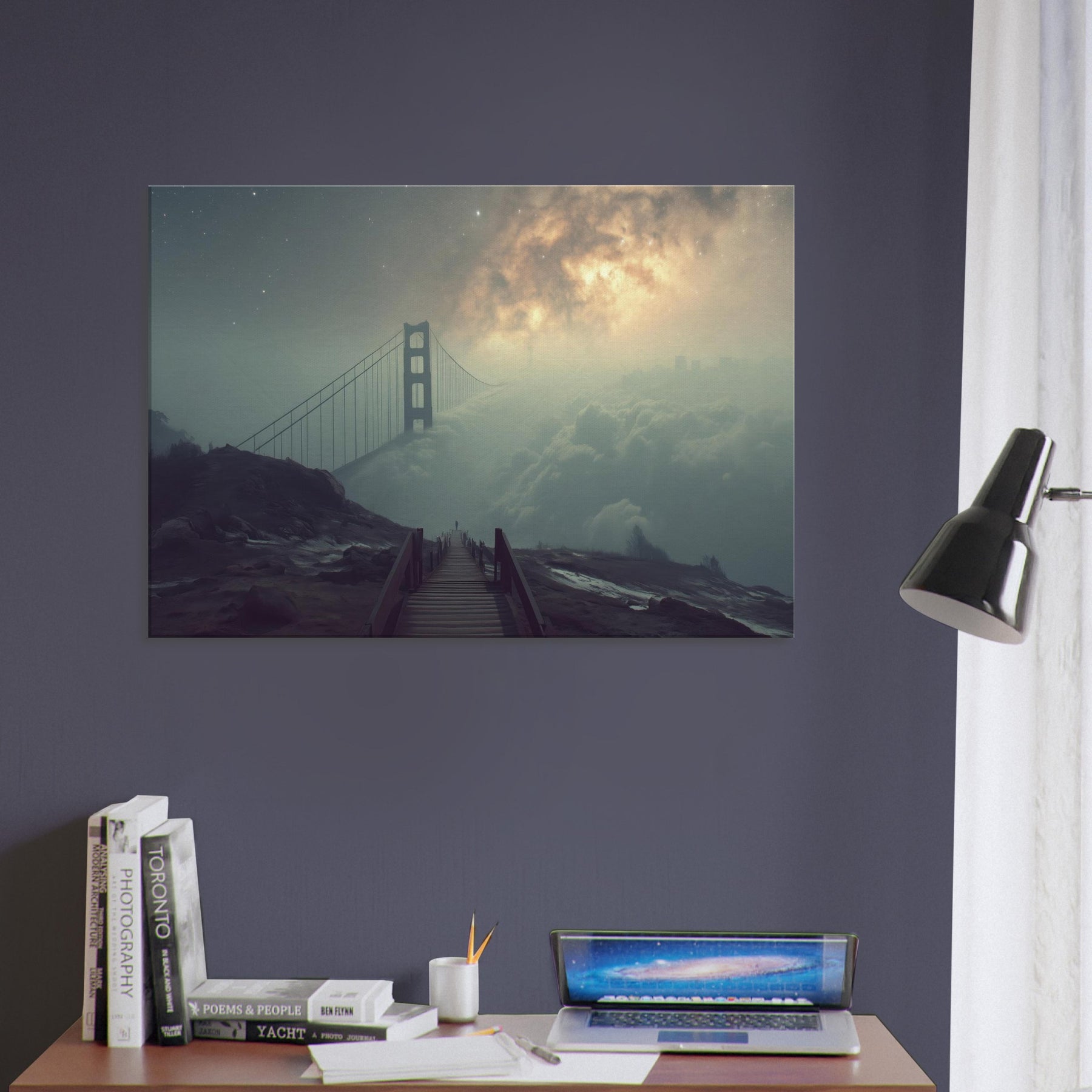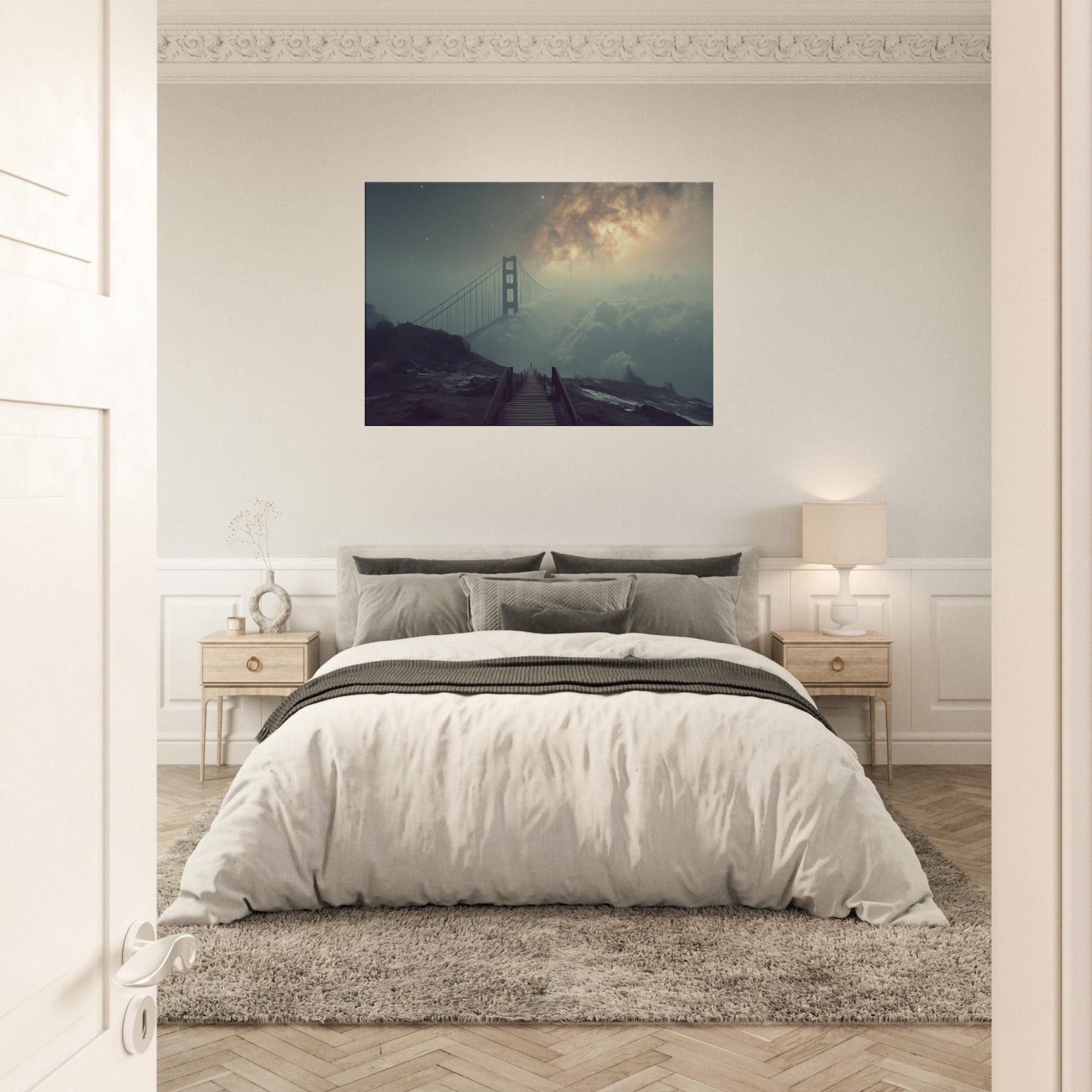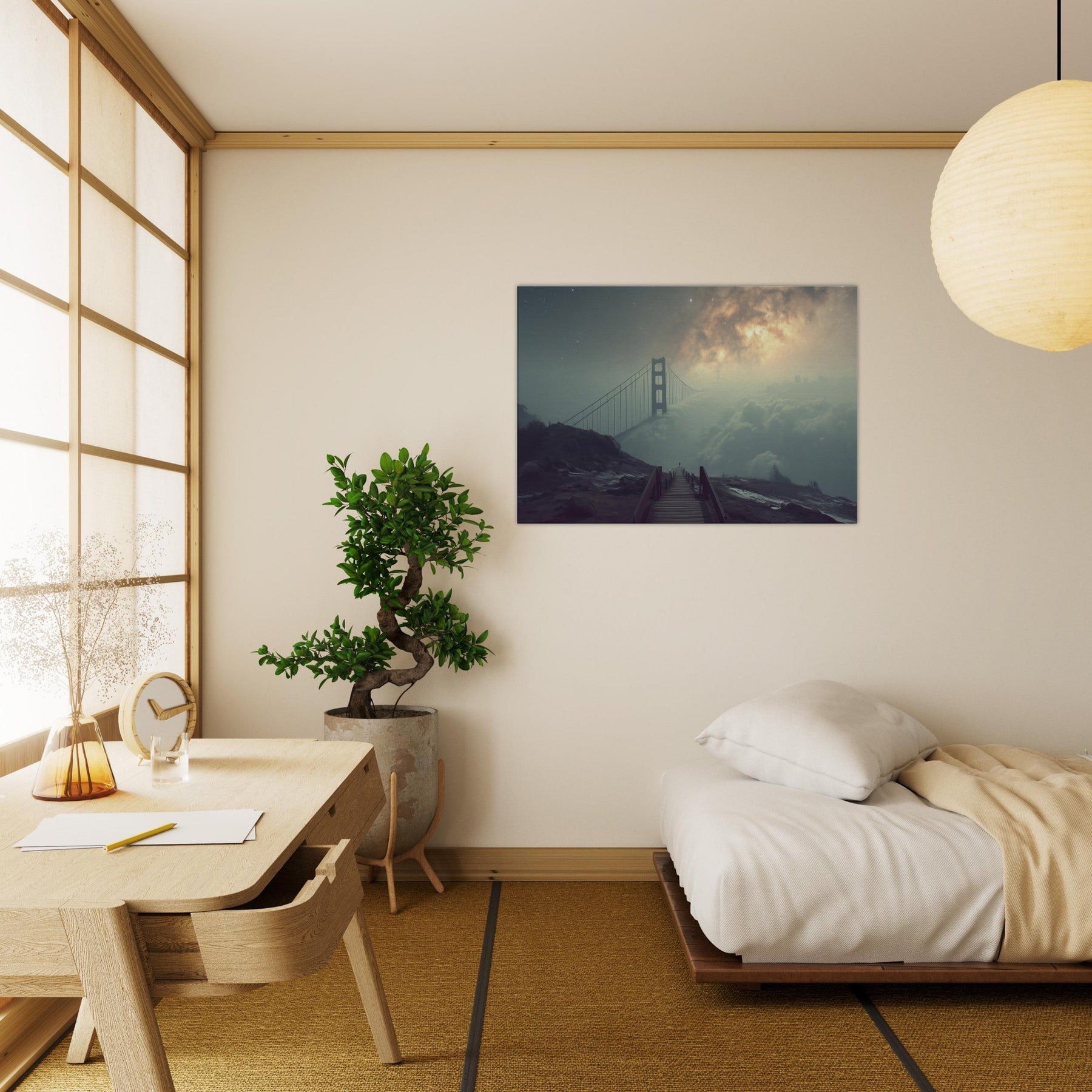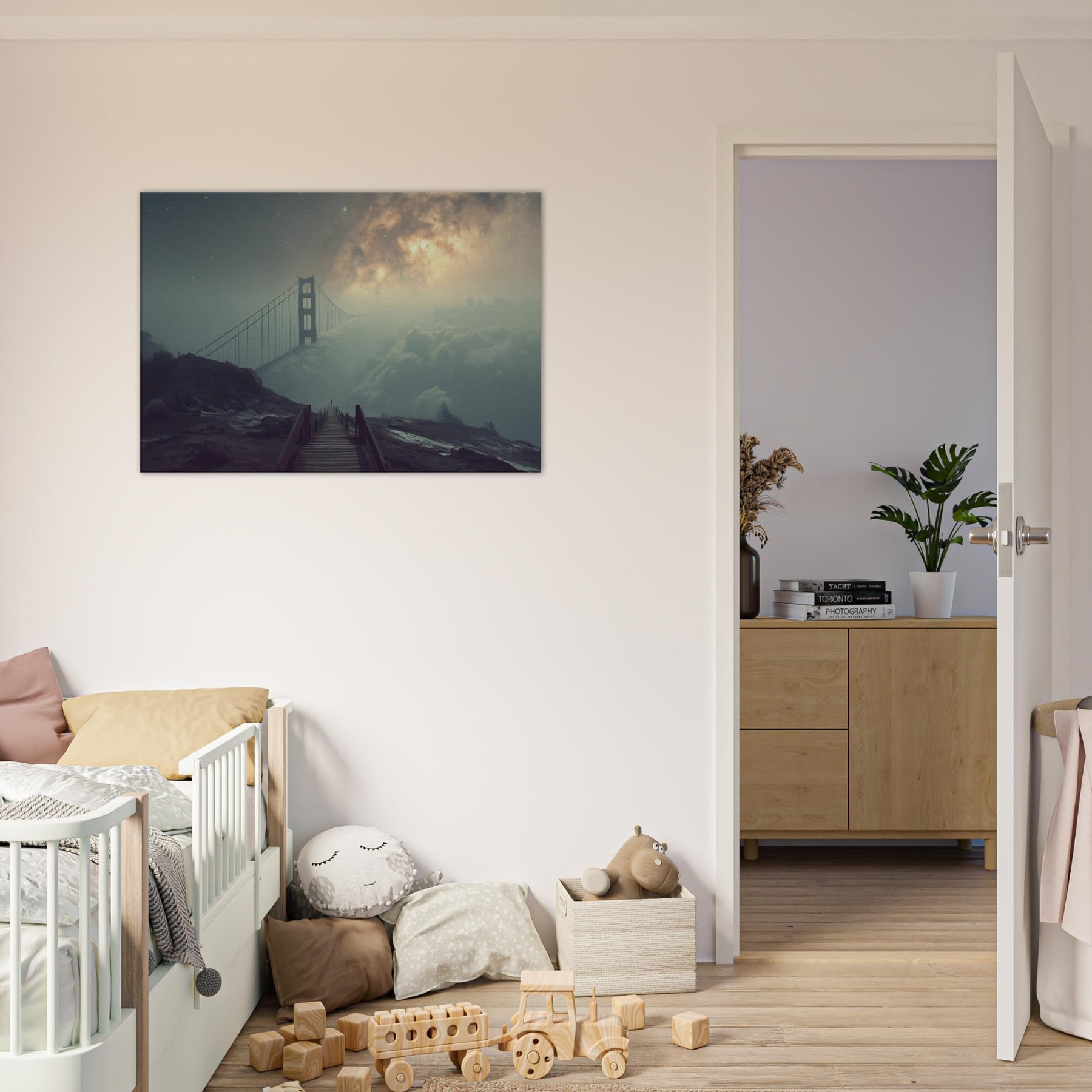 Step into a dream where the Golden Gate Bridge floats above luminous clouds, stitched with starry skies and distant city silhouettes. This surreal scene invites quiet contemplation and a sense of ascent, turning a familiar landmark into a doorway to memory and possibility. The atmosphere blends cool dawn blues with molten sunset golds, making your living space feel expansive yet intimate an ever present horizon you can live inside.