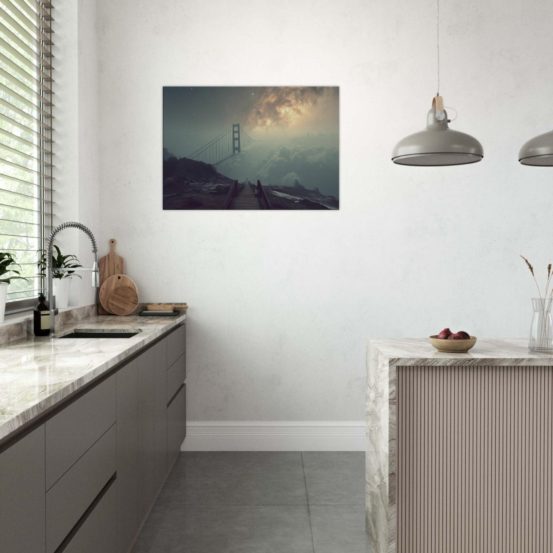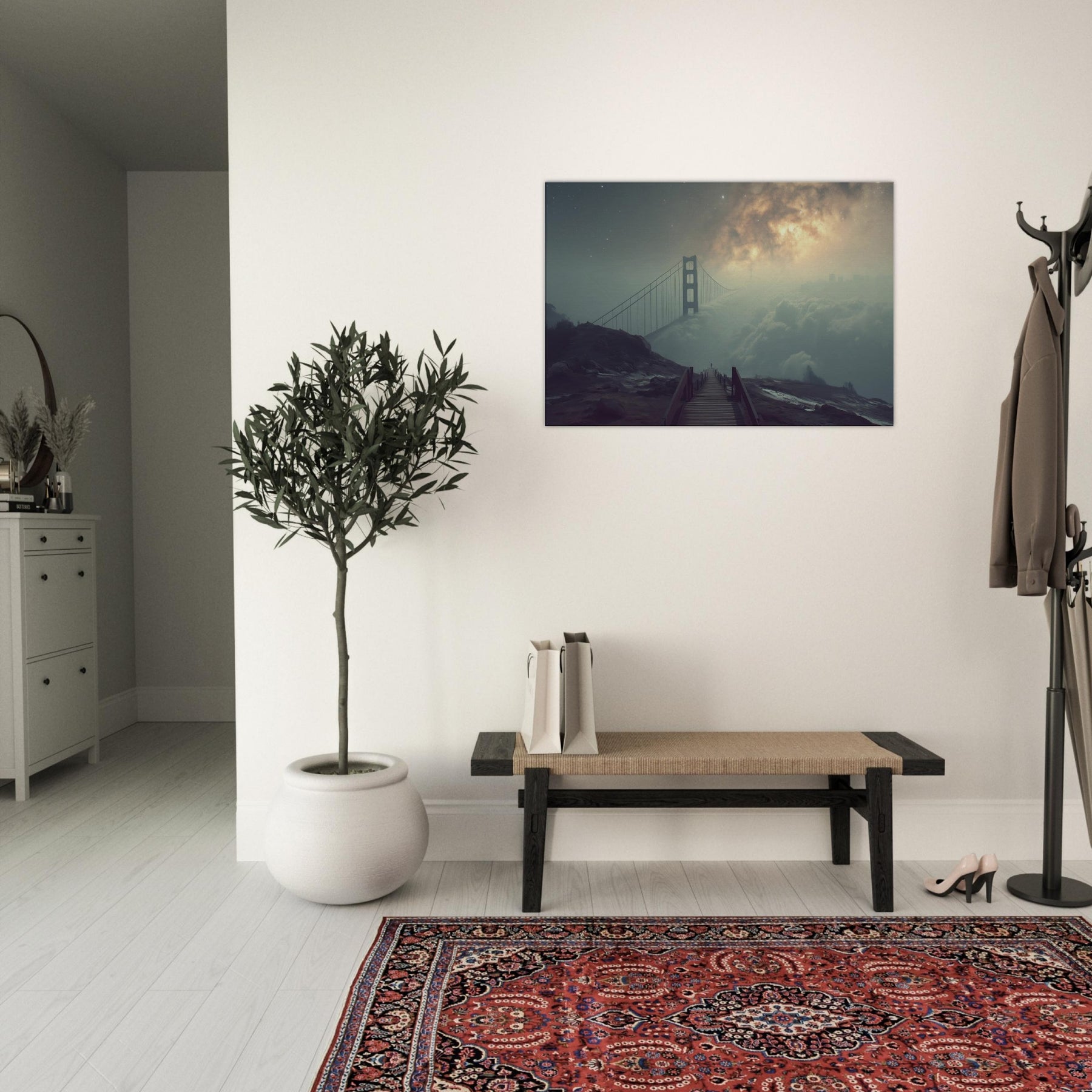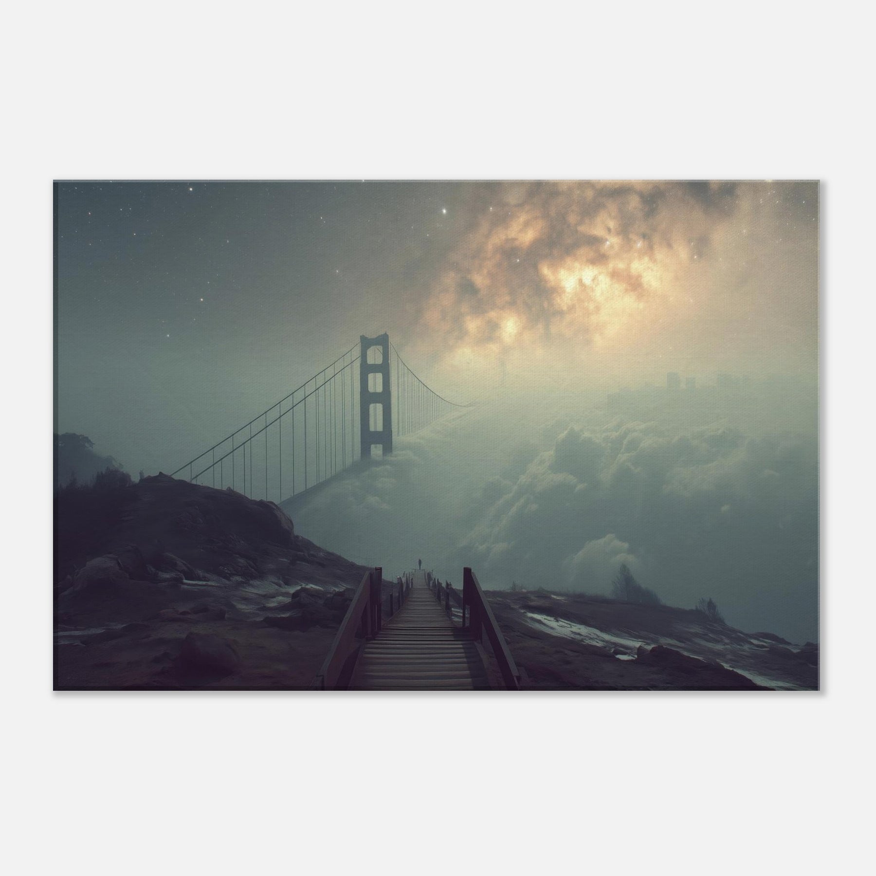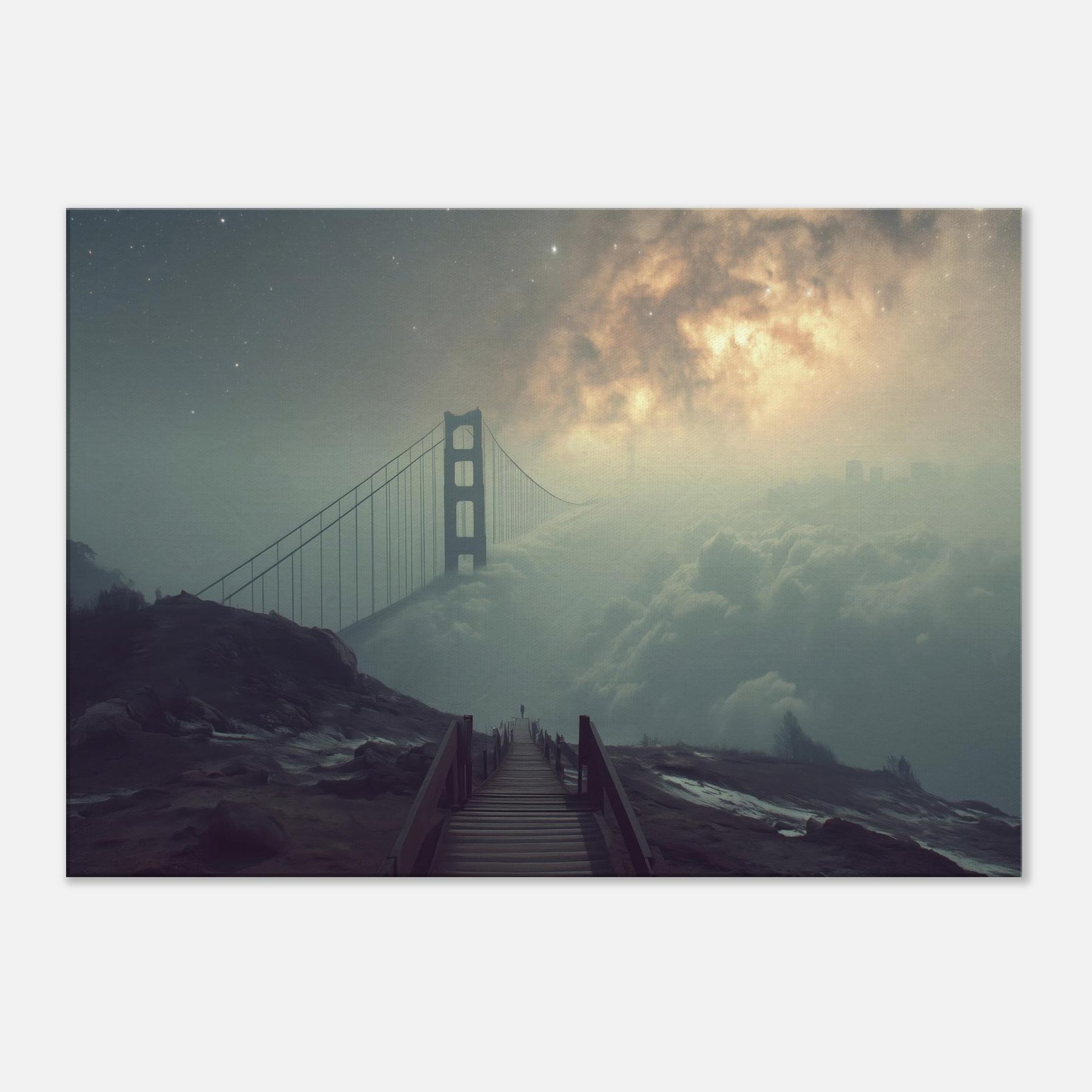 Step into a dream where the Golden Gate Bridge floats above luminous clouds, stitched with starry skies and distant city silhouettes. This surreal scene invites quiet contemplation and a sense of ascent, turning a familiar landmark into a doorway to memory and possibility. The atmosphere blends cool dawn blues with molten sunset golds, making your living space feel expansive yet intimate an ever present horizon you can live inside.