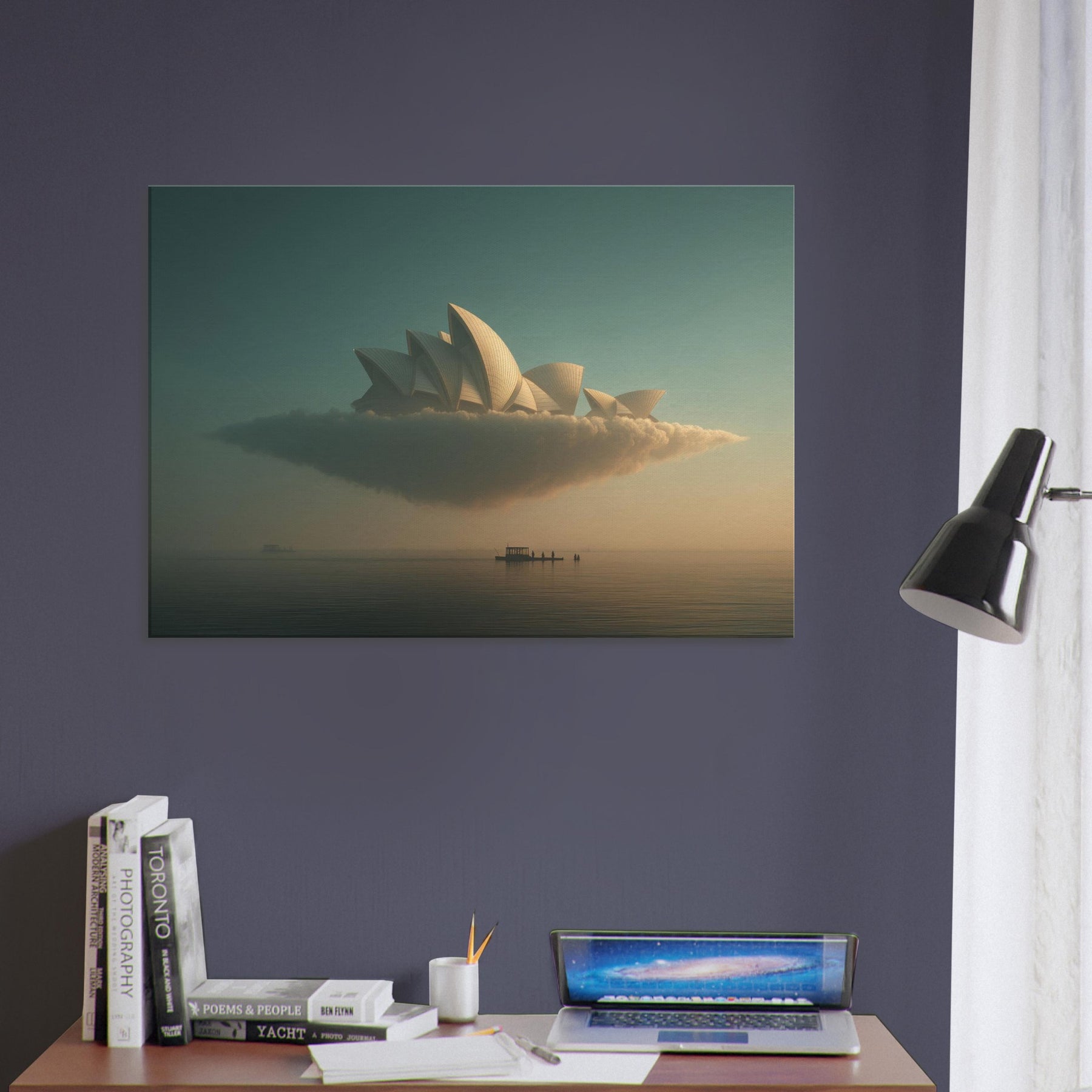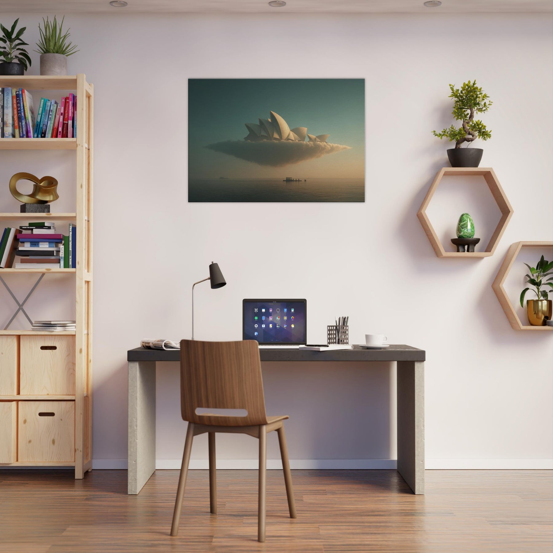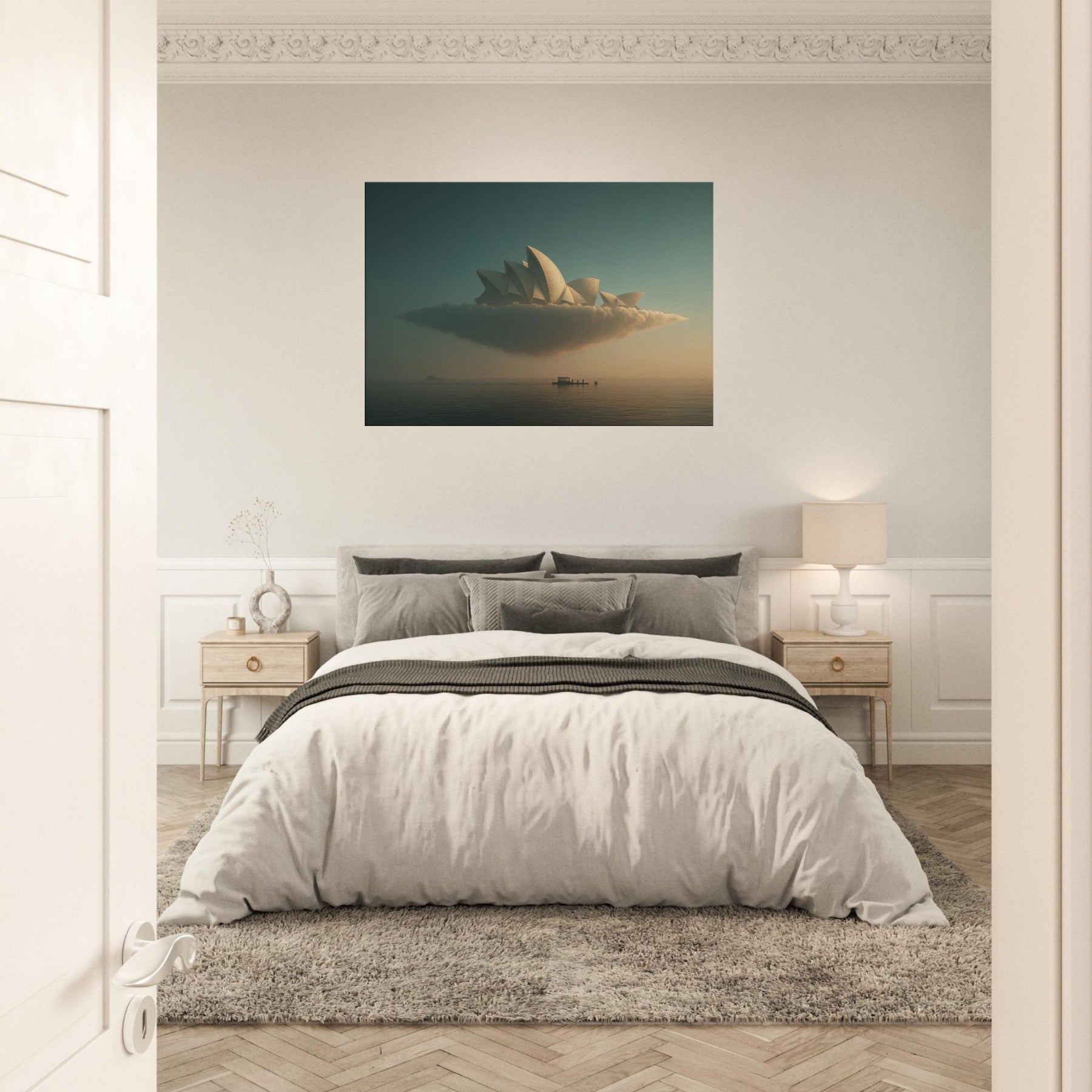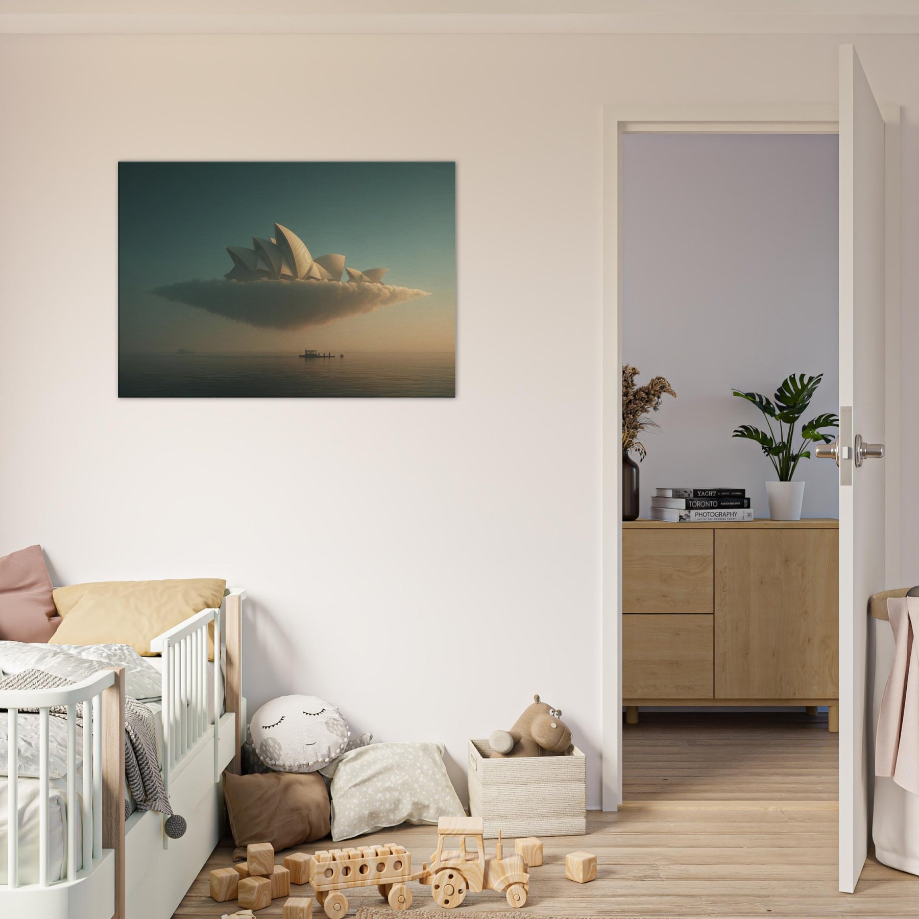 Let your walls dream with the Sydney Opera House aloft on a soft cloud, where architectural curves become celestial sails. This surreal composition bathes the room in dawn rose light, inviting stillness and curiosity in equal measure. The piece blends crisp geometry with mist and air, turning a well known skyline into a whisper of possibility. Hang it above a sofa or desk to anchor conversations and slow mornings, turning everyday space into a lingering, ocean bright reverie.