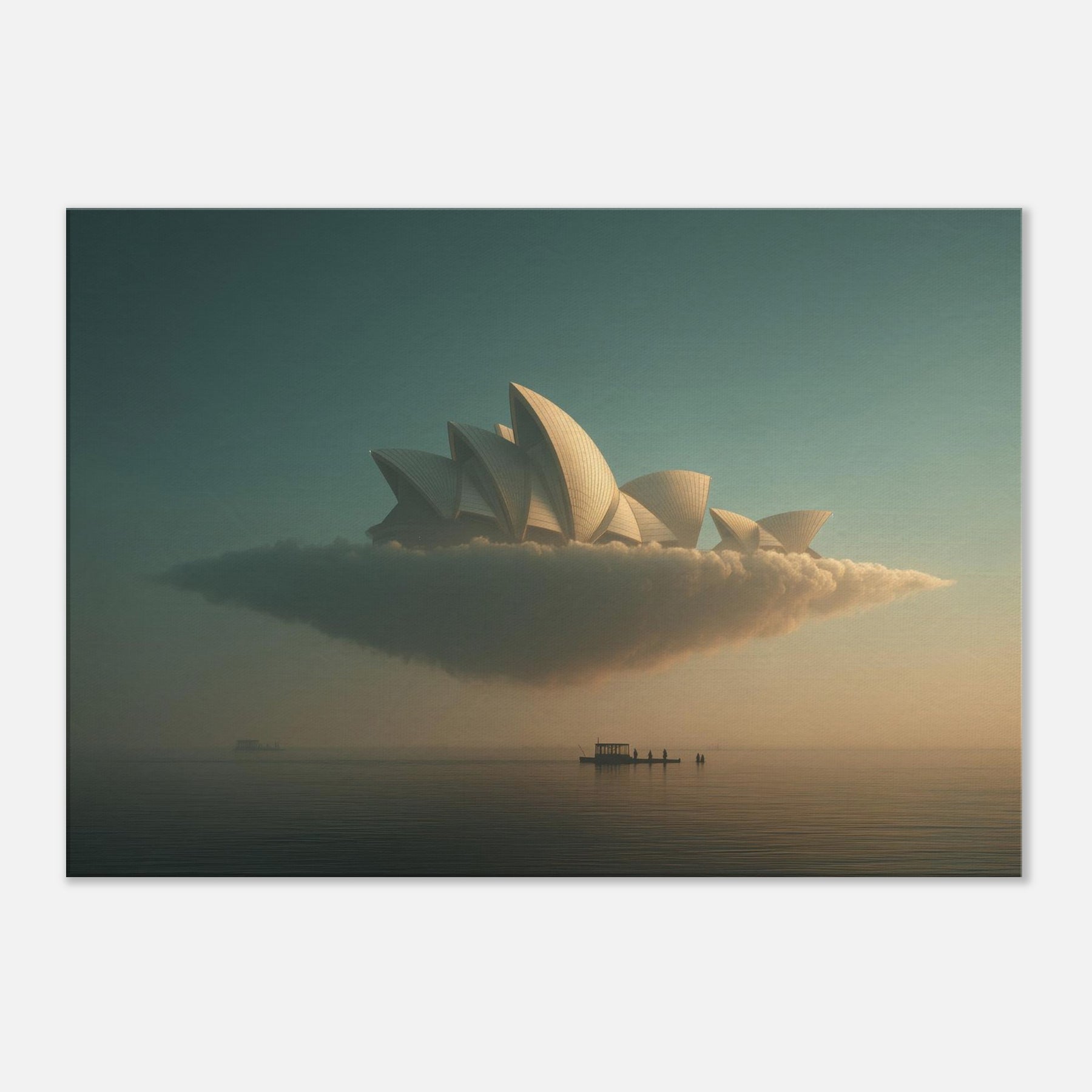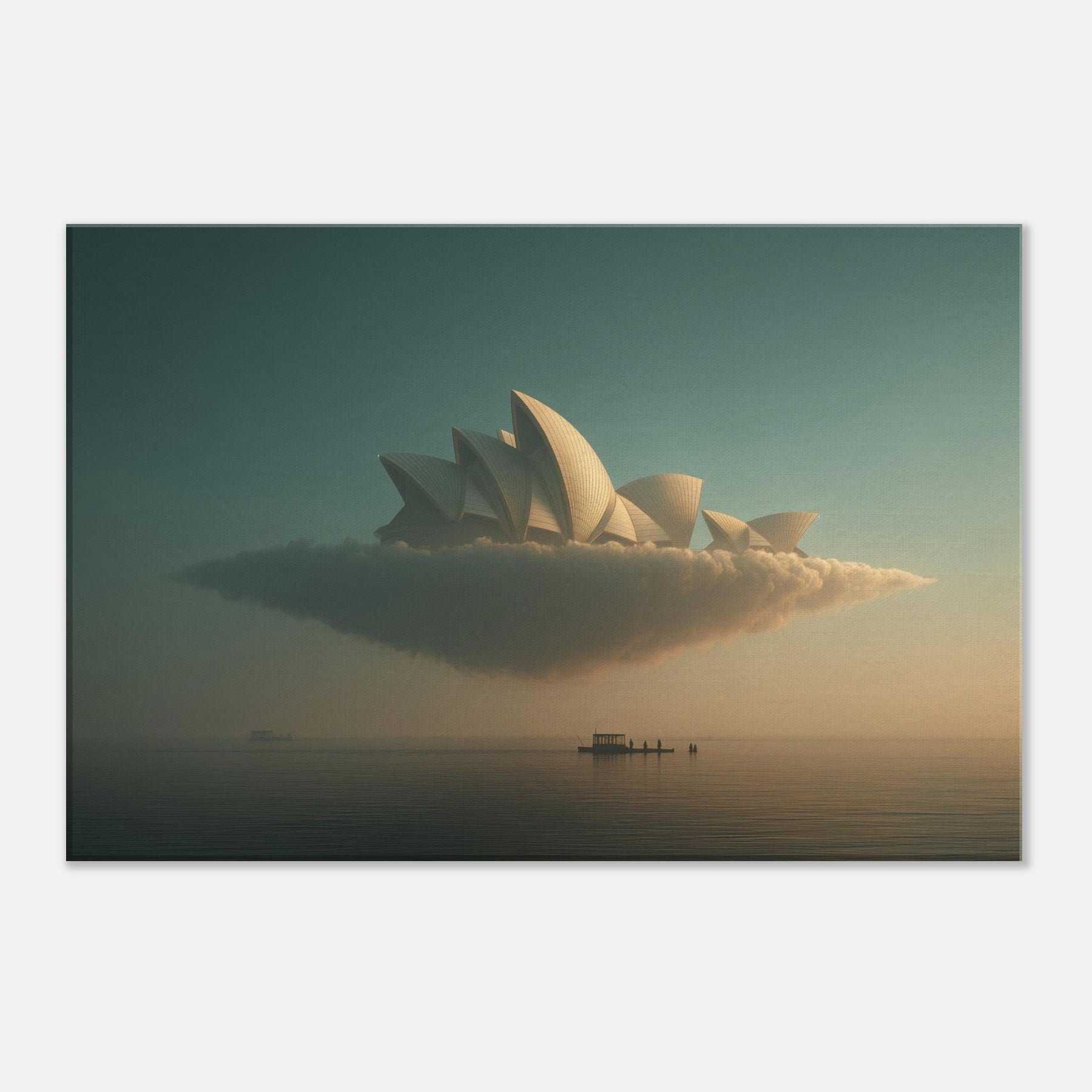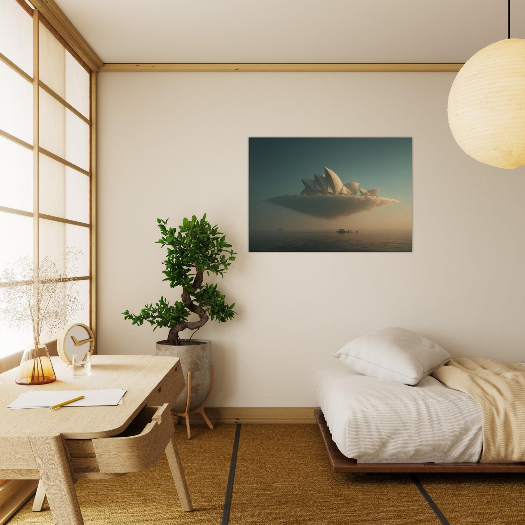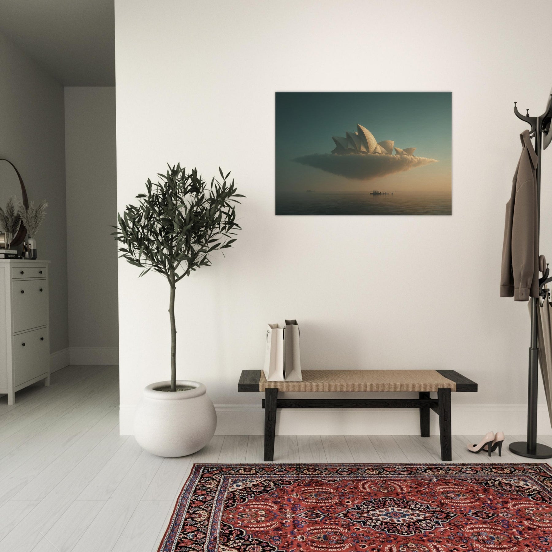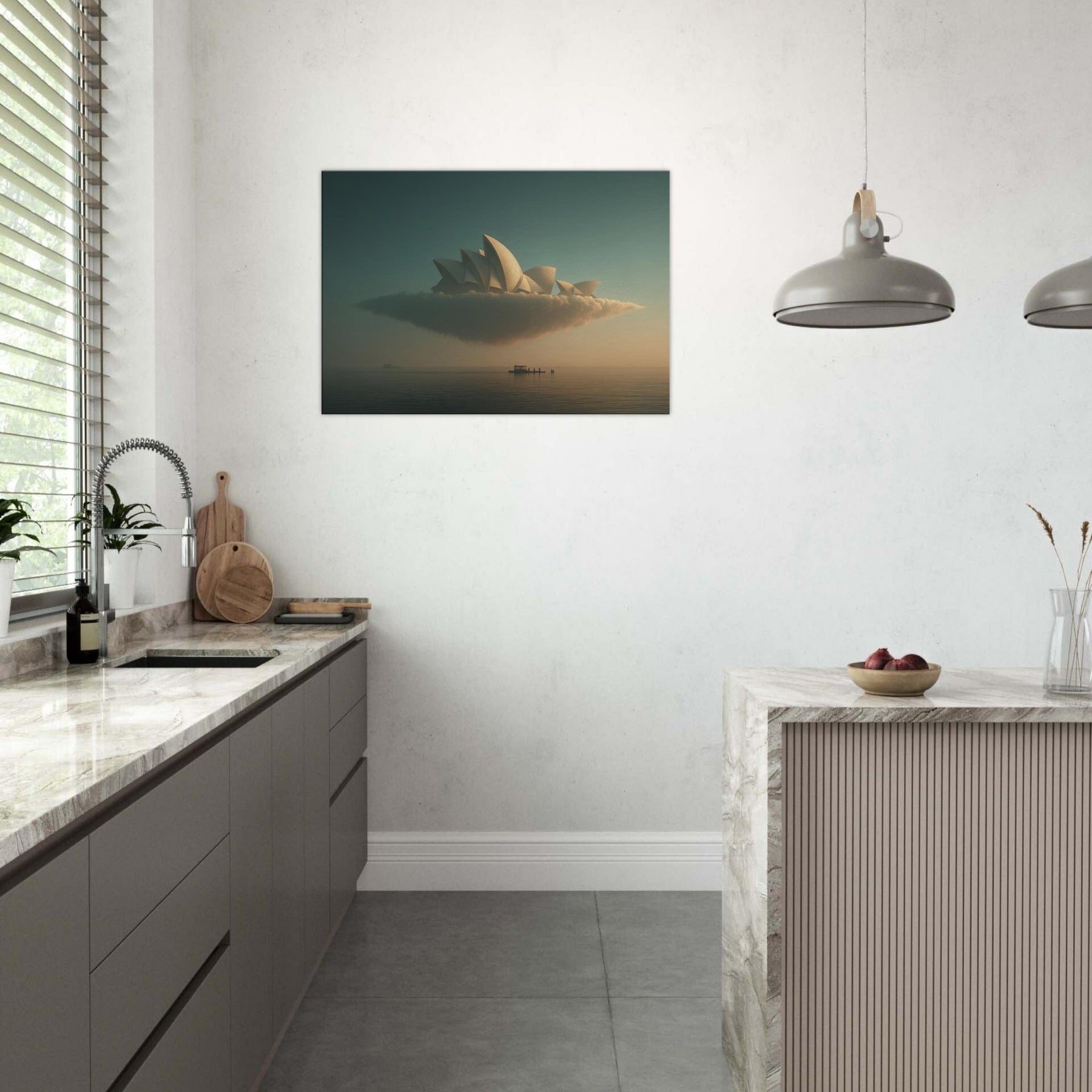Let your walls dream with the Sydney Opera House aloft on a soft cloud, where architectural curves become celestial sails. This surreal composition bathes the room in dawn rose light, inviting stillness and curiosity in equal measure. The piece blends crisp geometry with mist and air, turning a well known skyline into a whisper of possibility. Hang it above a sofa or desk to anchor conversations and slow mornings, turning everyday space into a lingering, ocean bright reverie.