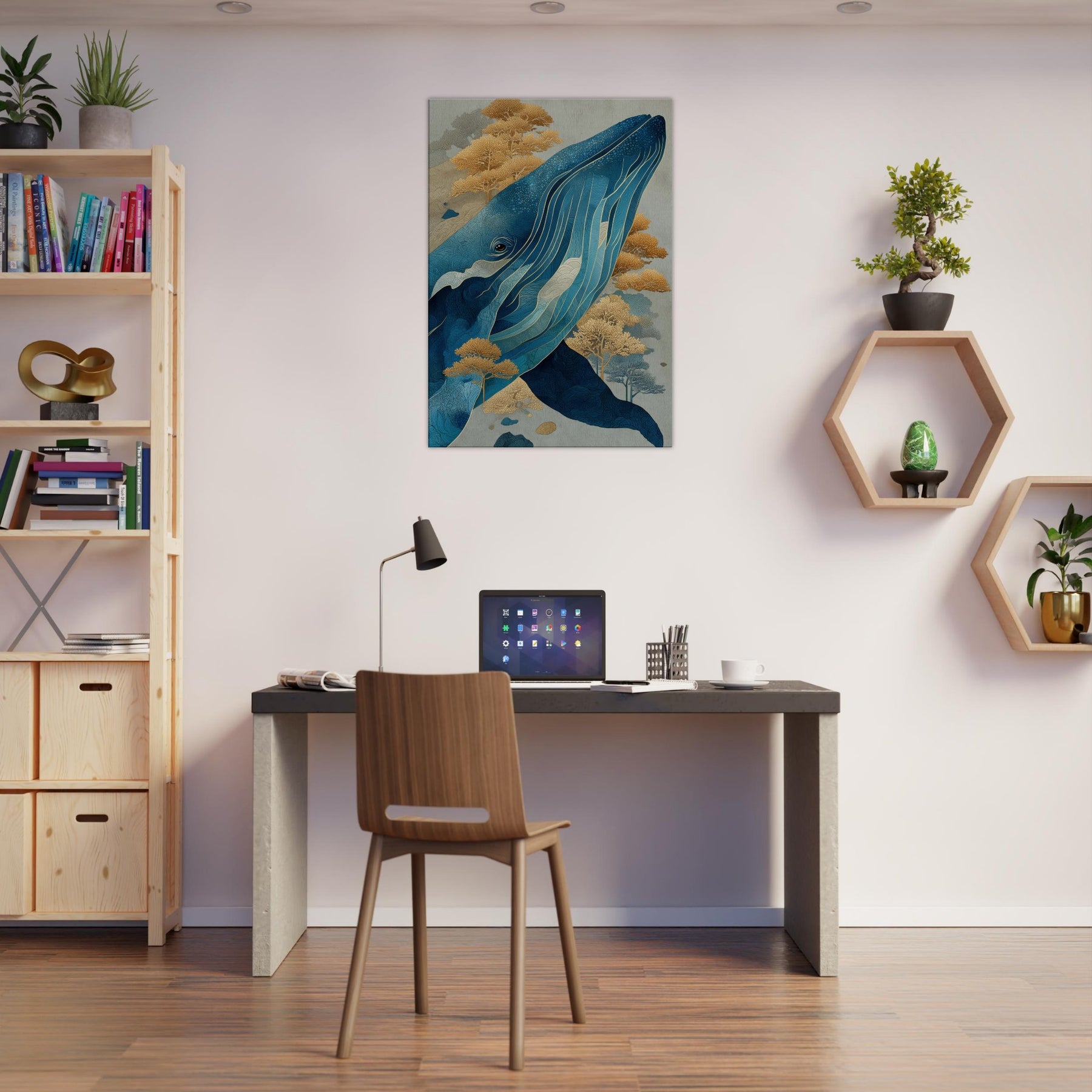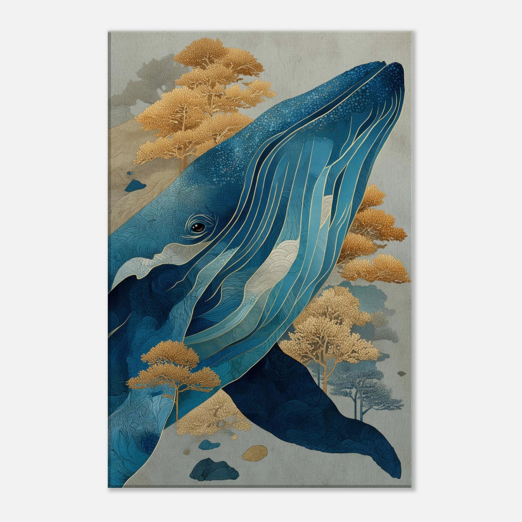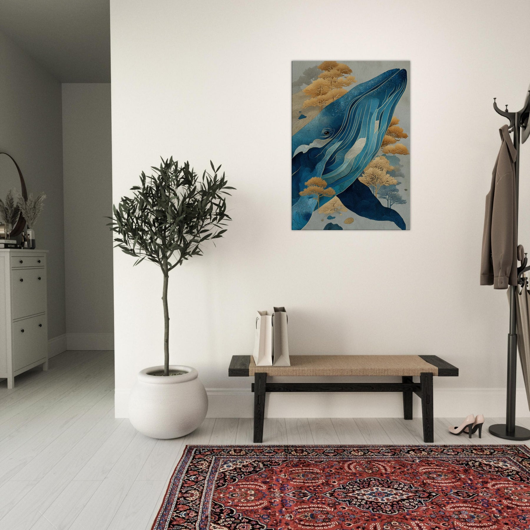 Whale and windless gold drift through a dreamscape where ocean blues meet autumnal trees. This surreal composition folds time as the mighty Whale arcs skyward, its sinewy lines tracing rivers of light. The palette pools in velvet blues and warm ochre, inviting quiet reflection in a bright living room or study. The artwork hums with a delicate tension between depth and height, nature and fantasy, turning walls into a shoreline of memory, where conversation flows as softly as tide washed fog.