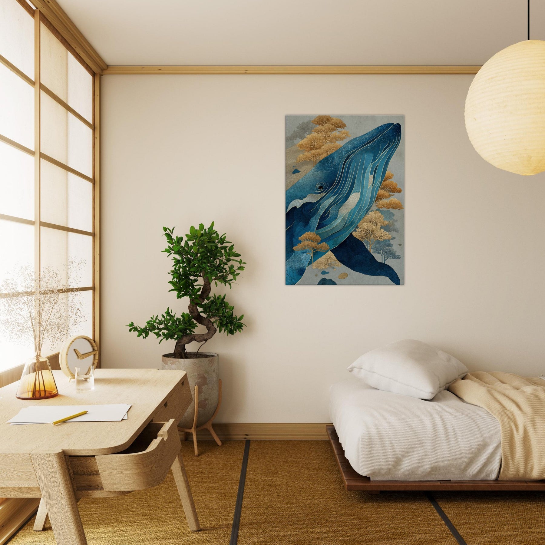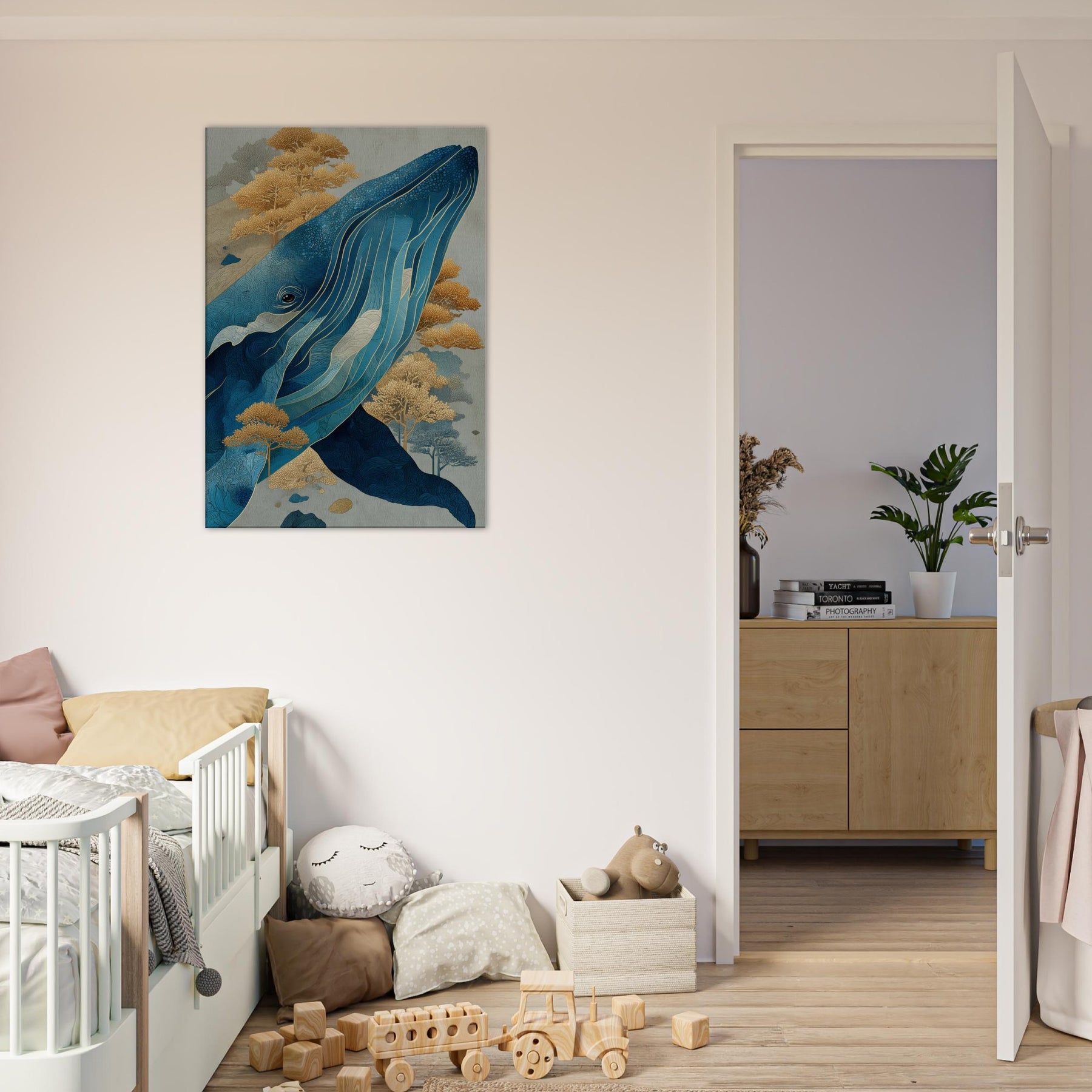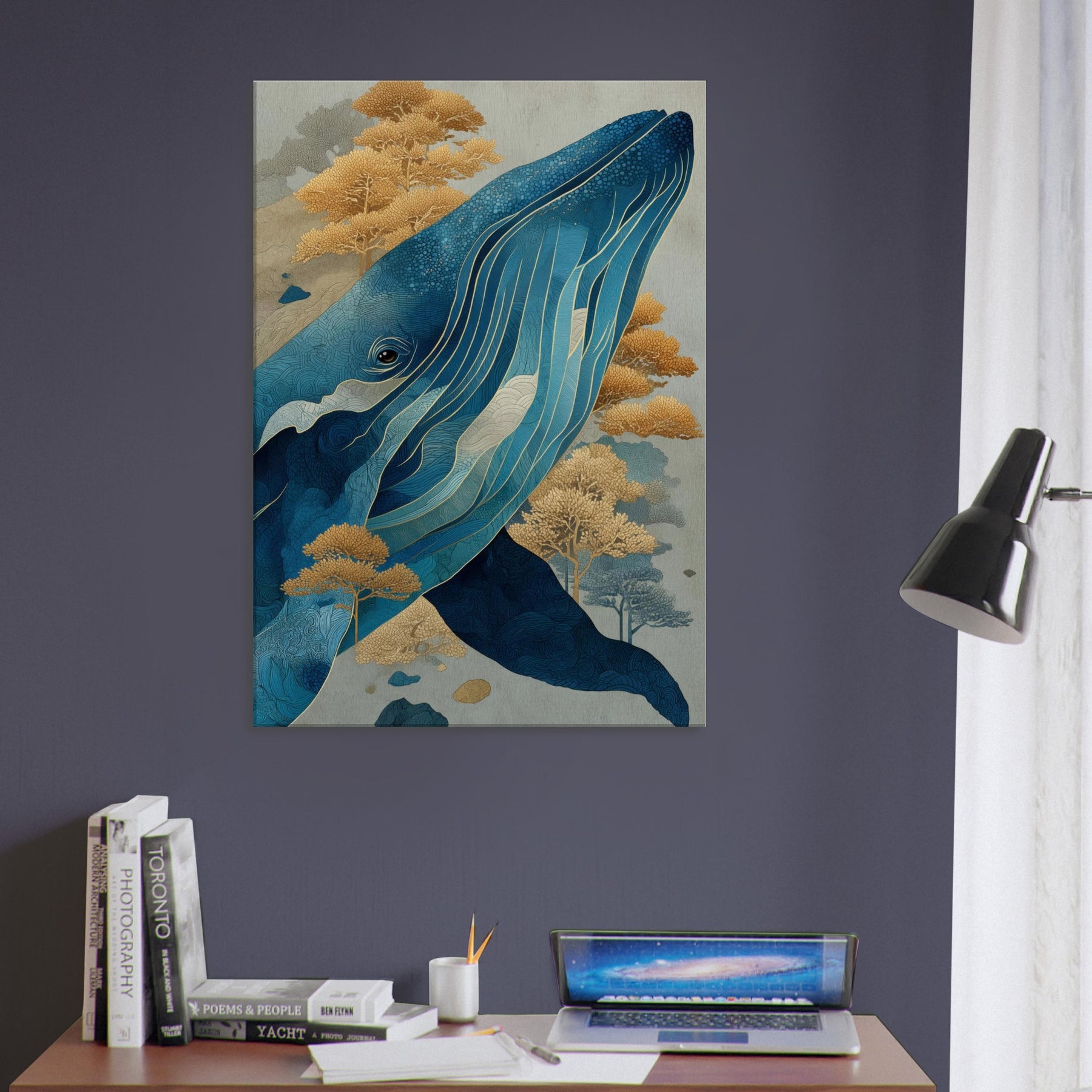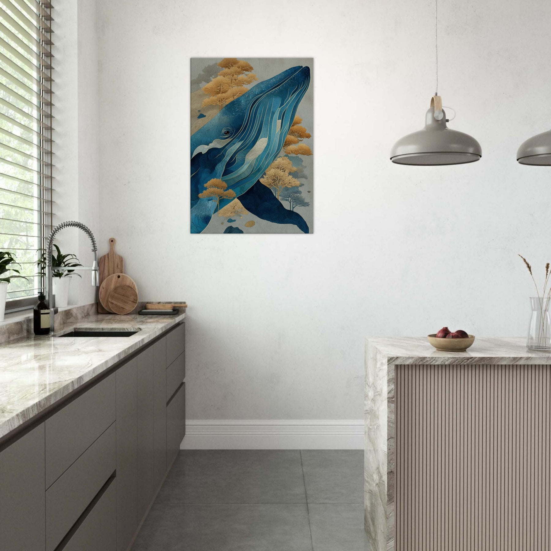Whale and windless gold drift through a dreamscape where ocean blues meet autumnal trees. This surreal composition folds time as the mighty Whale arcs skyward, its sinewy lines tracing rivers of light. The palette pools in velvet blues and warm ochre, inviting quiet reflection in a bright living room or study. The artwork hums with a delicate tension between depth and height, nature and fantasy, turning walls into a shoreline of memory, where conversation flows as softly as tide washed fog.