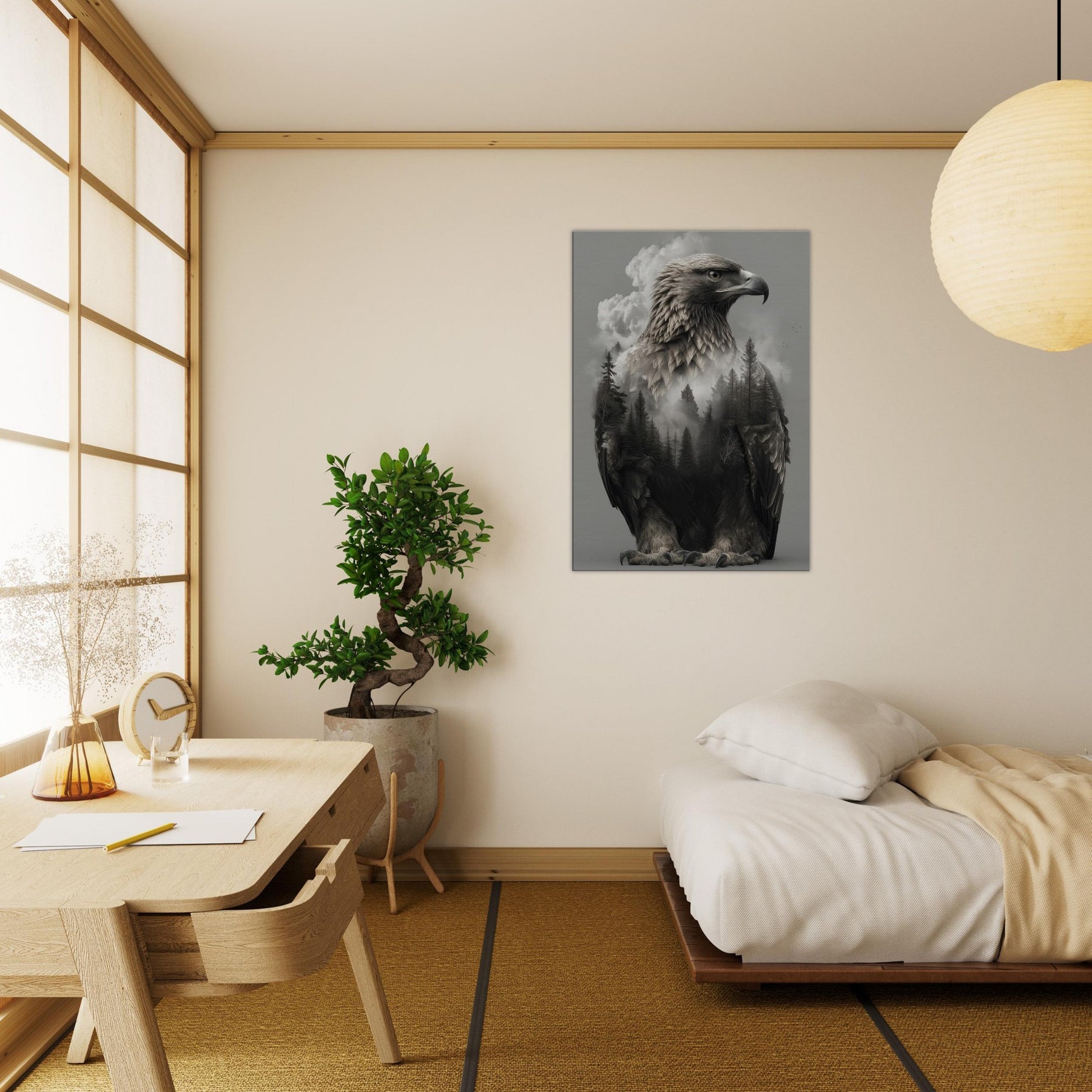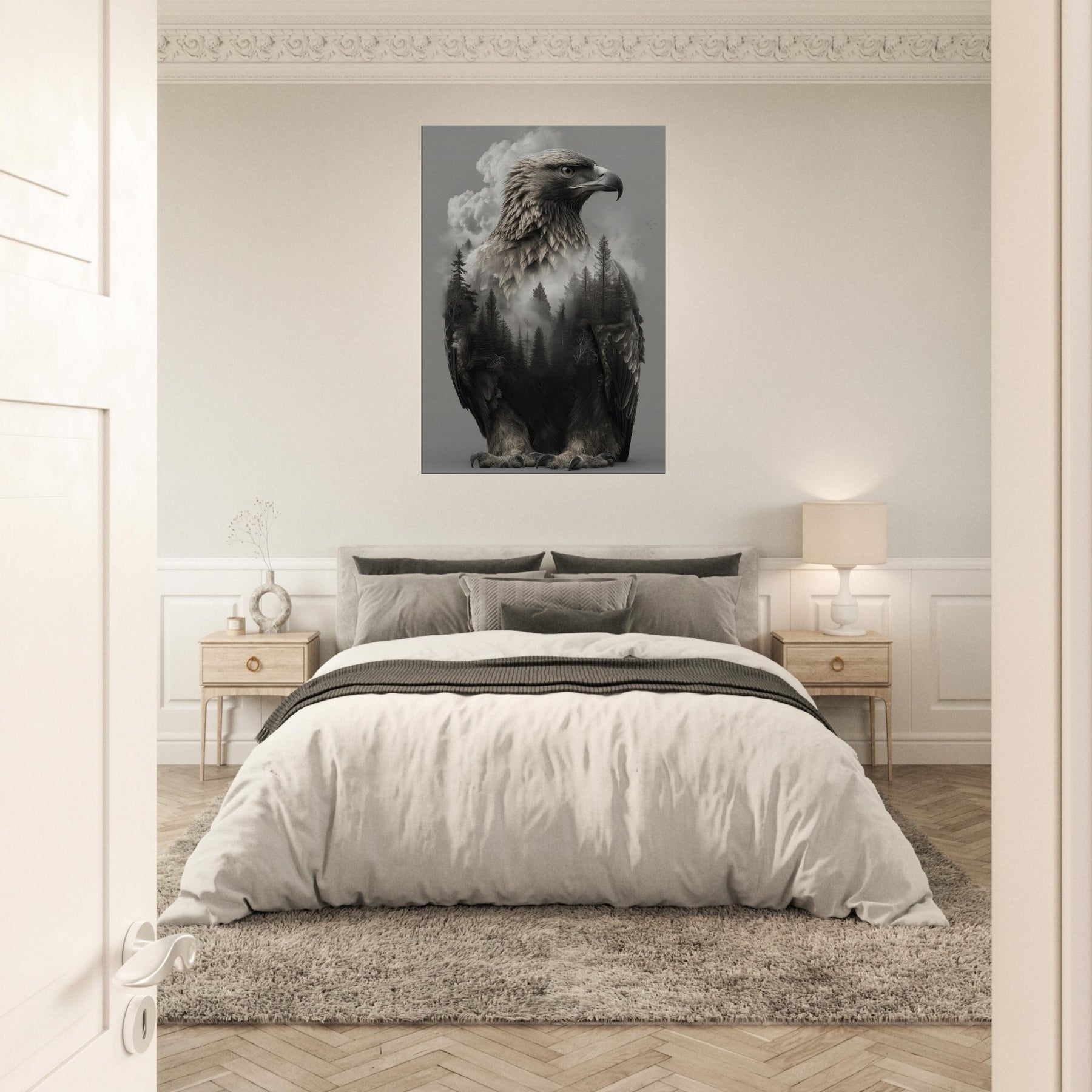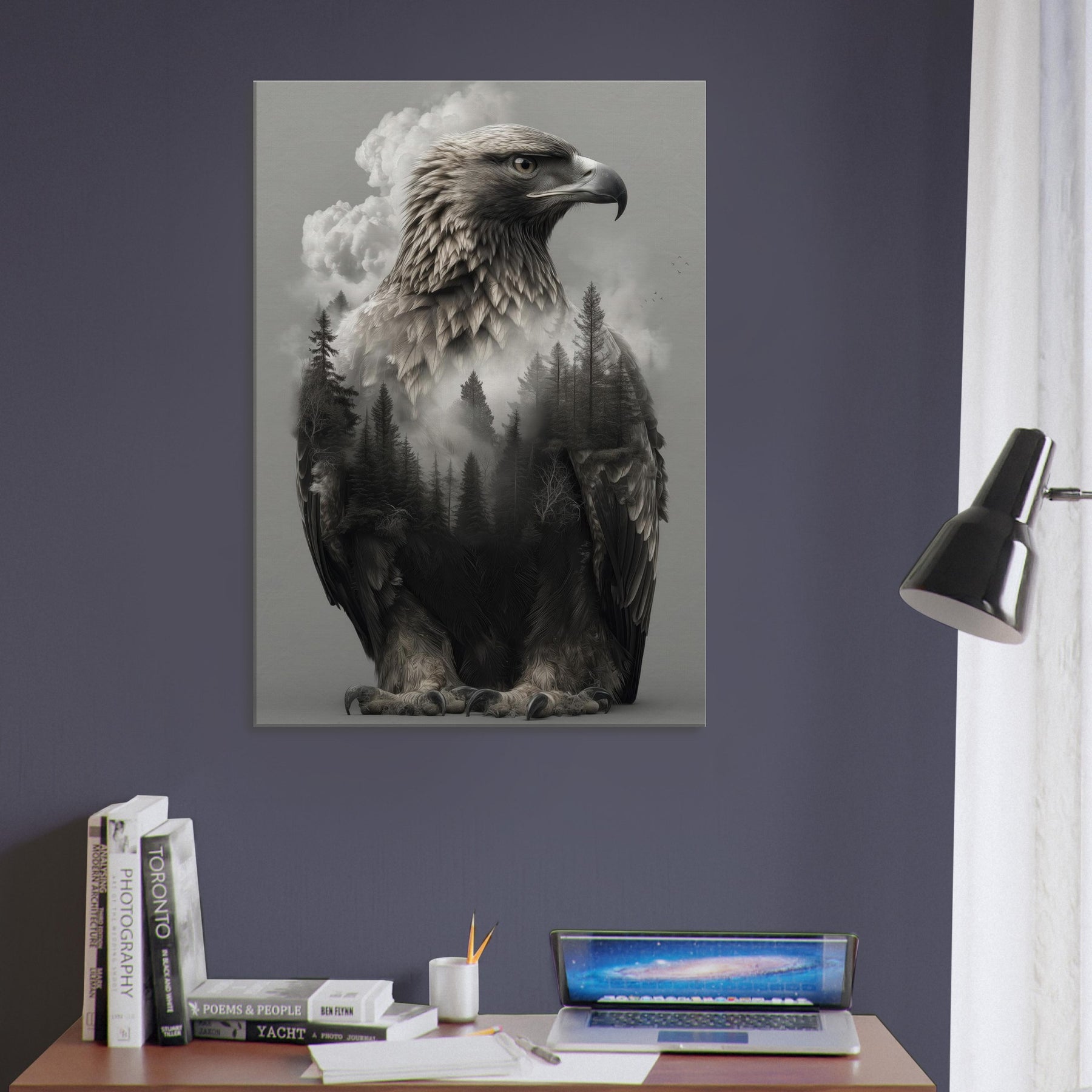 An Eagle gazes through a misty veil, its plumage dissolving into a forest dream that rises from the floor of the frame. This surreal composition wraps the room in cool graphite tones, where pine silhouettes drift like breath and clouds cradle the bird's crown. The atmosphere feels both austere and intimate, a quiet invitation to pause and breathe ideal for a living room or study. Place it where light softens the edges and the home remembers the wild's calm resilience flight, focus, and wonder.