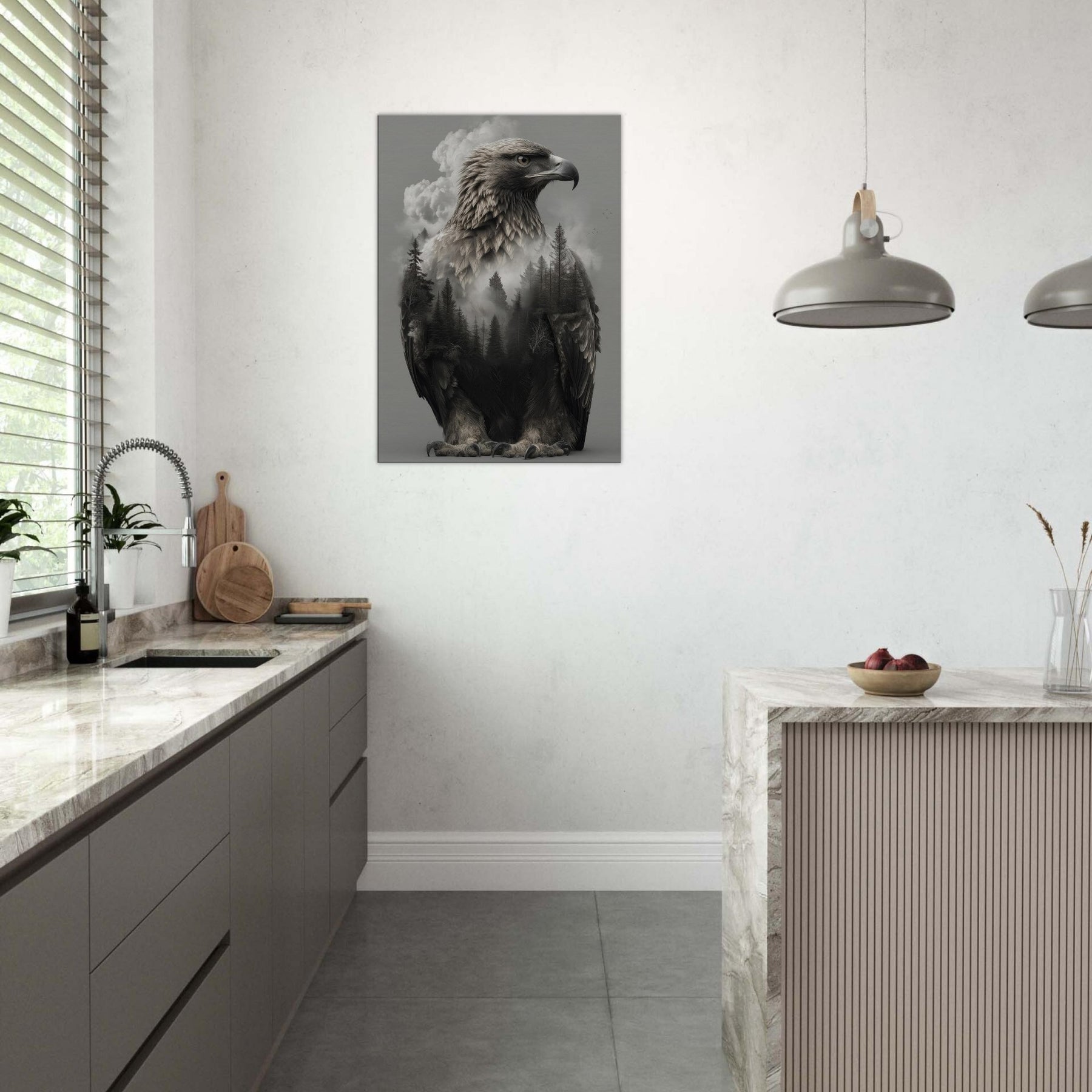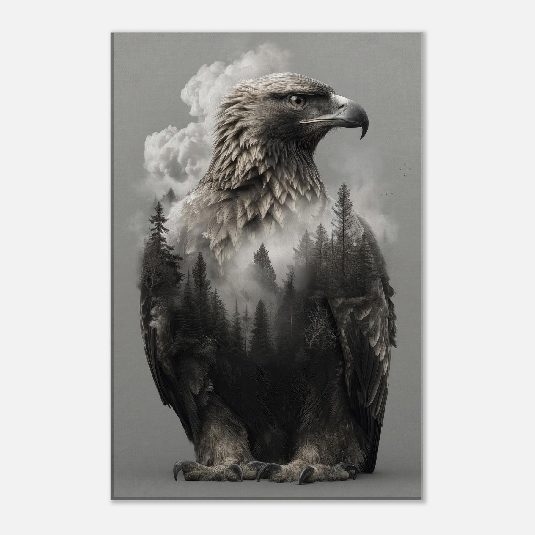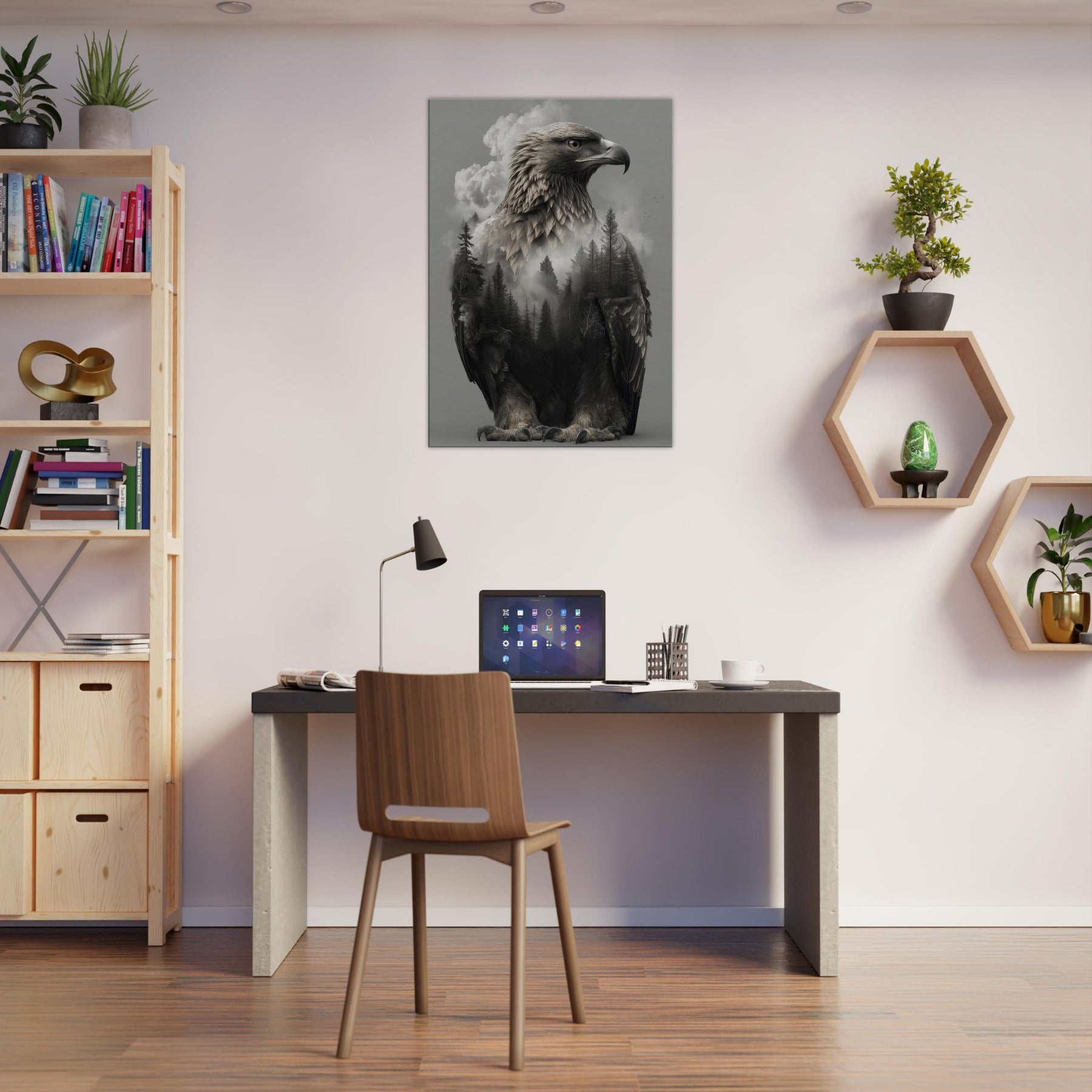 An Eagle gazes through a misty veil, its plumage dissolving into a forest dream that rises from the floor of the frame. This surreal composition wraps the room in cool graphite tones, where pine silhouettes drift like breath and clouds cradle the bird's crown. The atmosphere feels both austere and intimate, a quiet invitation to pause and breathe ideal for a living room or study. Place it where light softens the edges and the home remembers the wild's calm resilience flight, focus, and wonder.