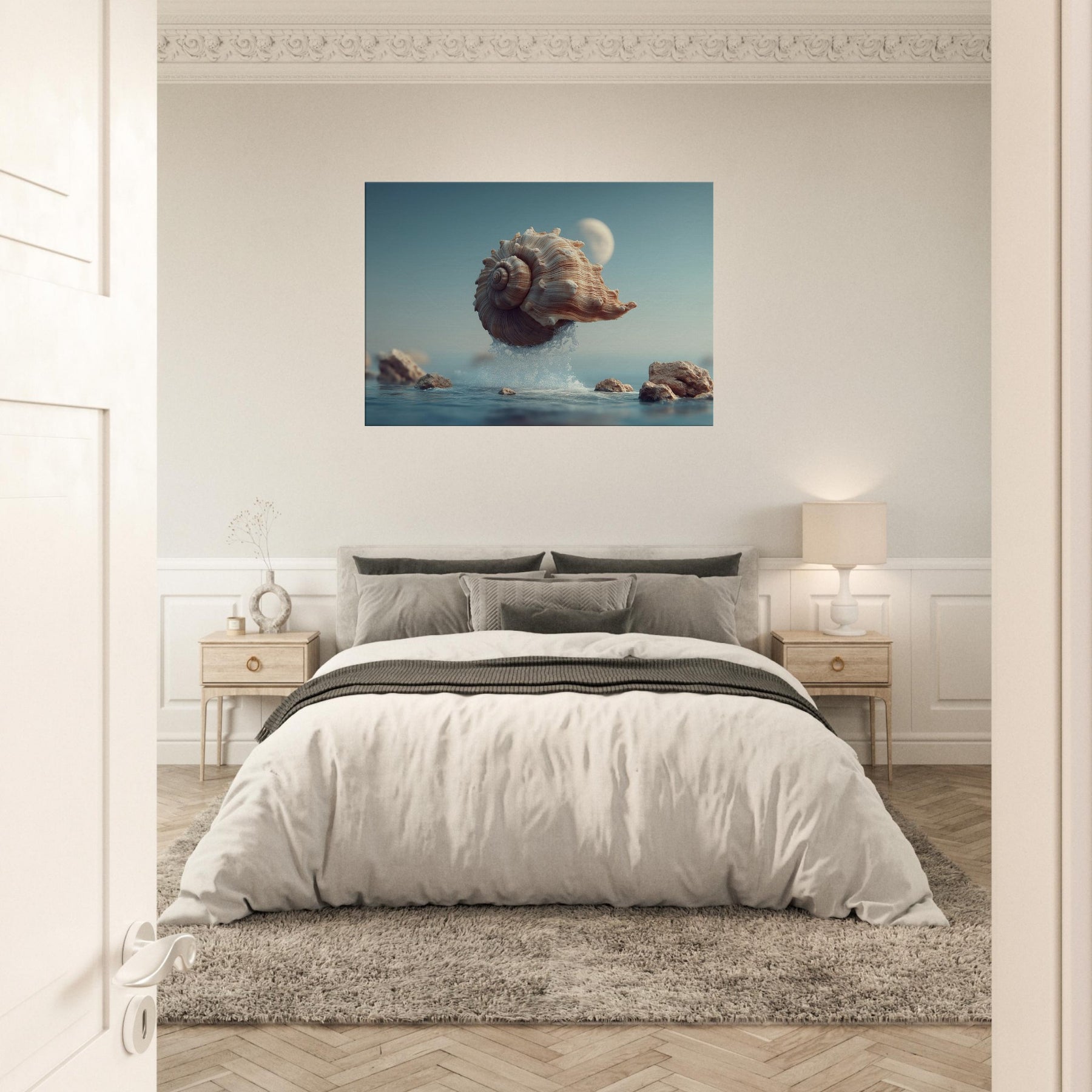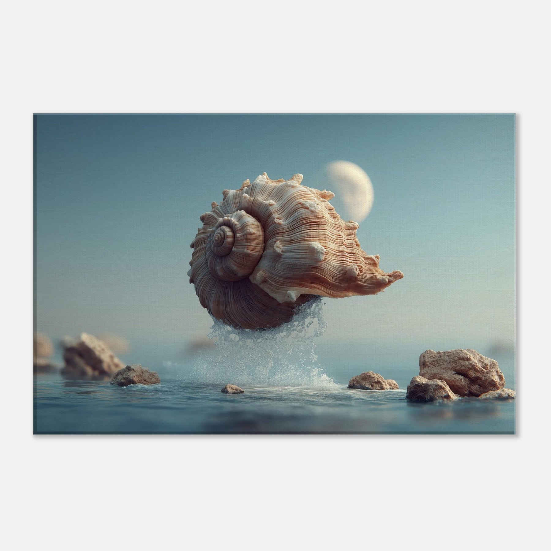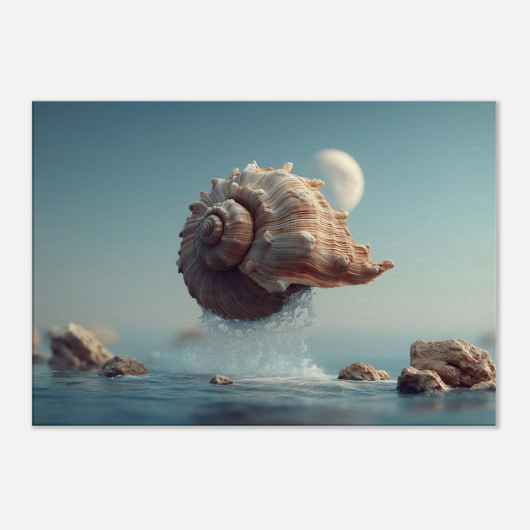 This surreal scene centers a Seashell as it lifts from the surface, alight with moonlit tones and curling ridges that echo whispered currents. Surrounded by crystalline spray and softened rocks, it glides through a quiet, dreamlike horizon an atmosphere of calm, curiosity, and stillness. Perfect for a living room or bedroom, the piece brings organic texture, subtle warmth, and a sense of gentle astonishment, inviting reflective pauses as light changes across its spiraled form.