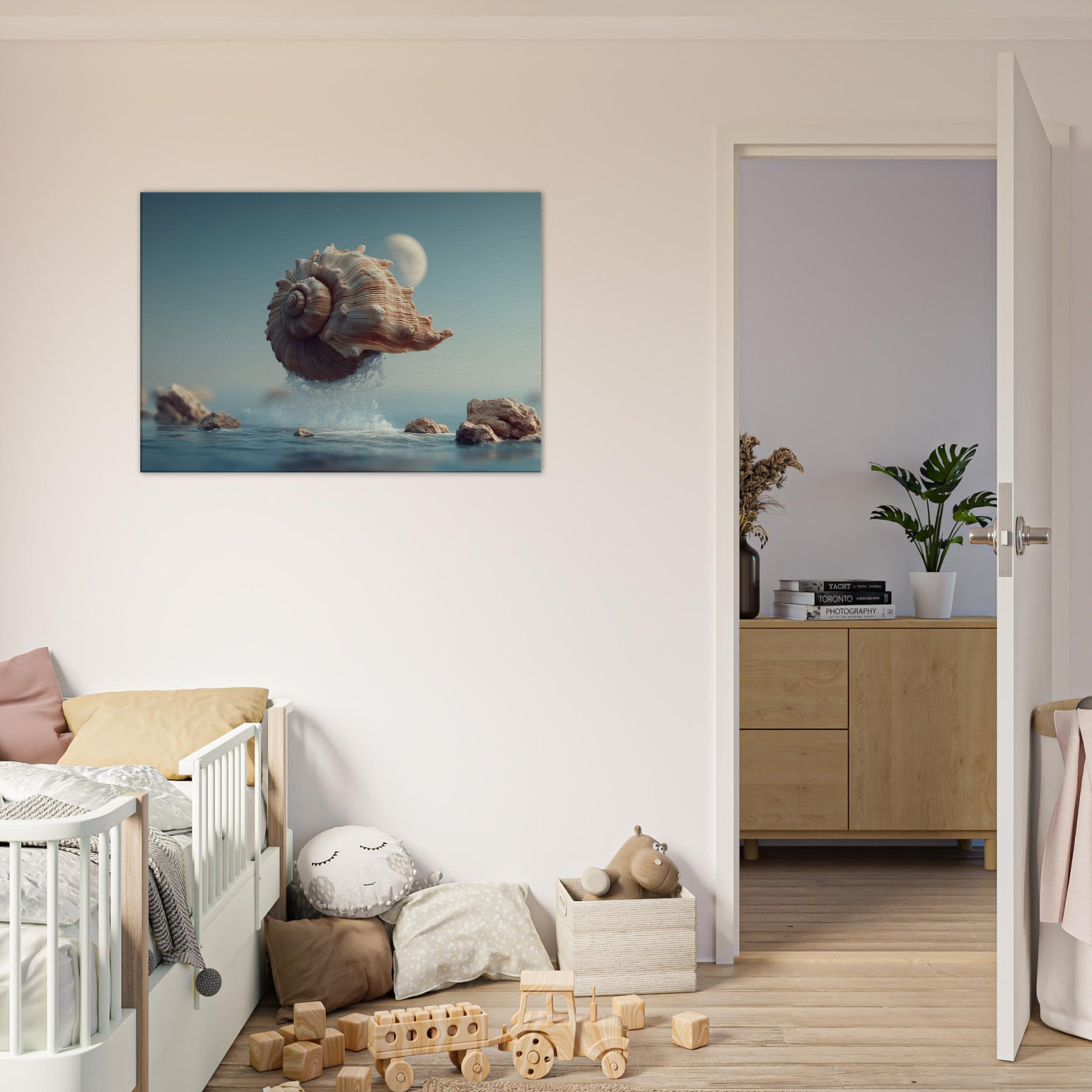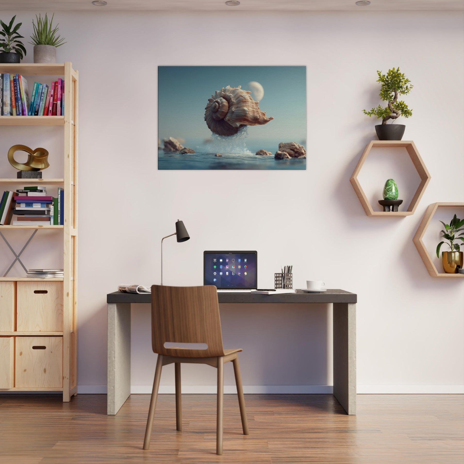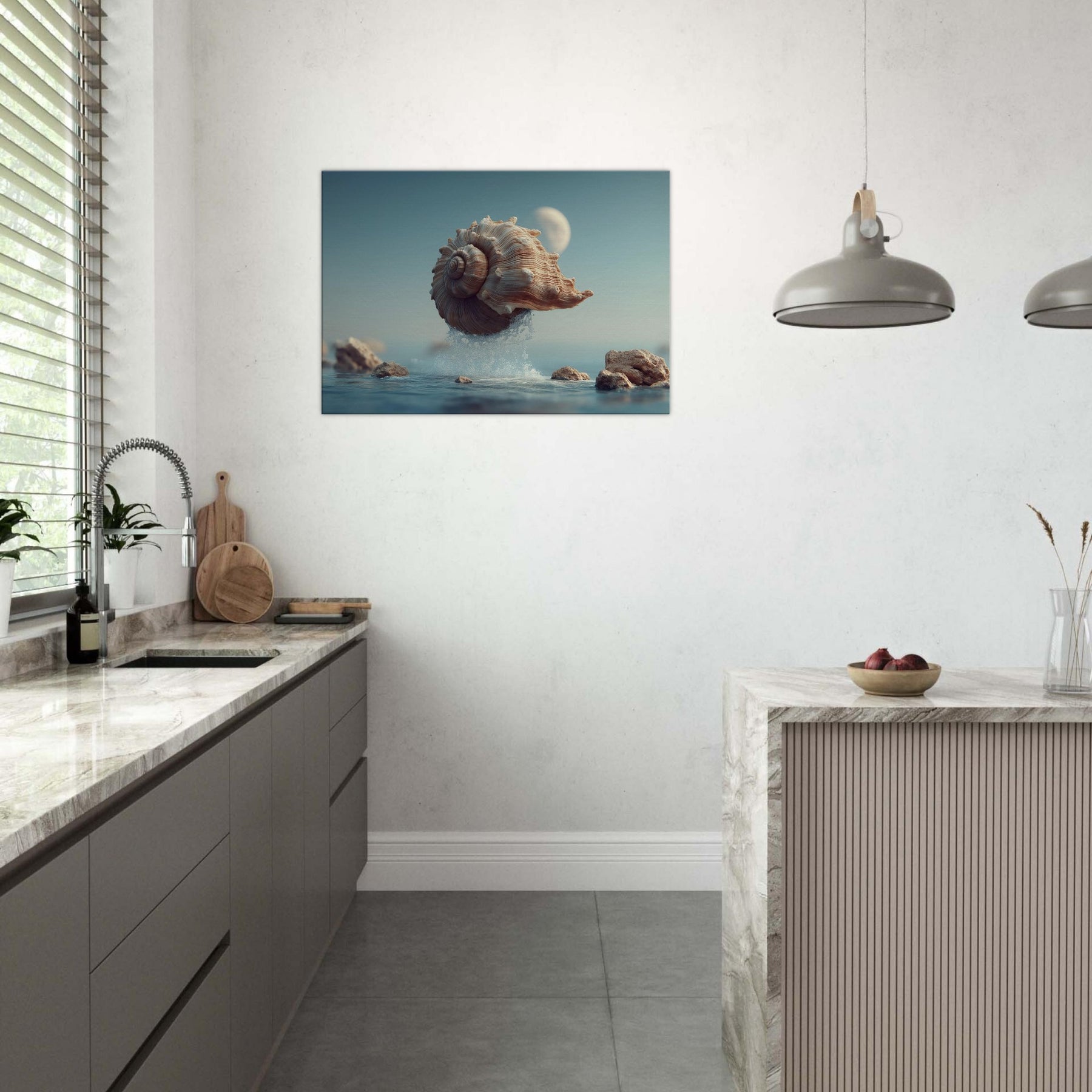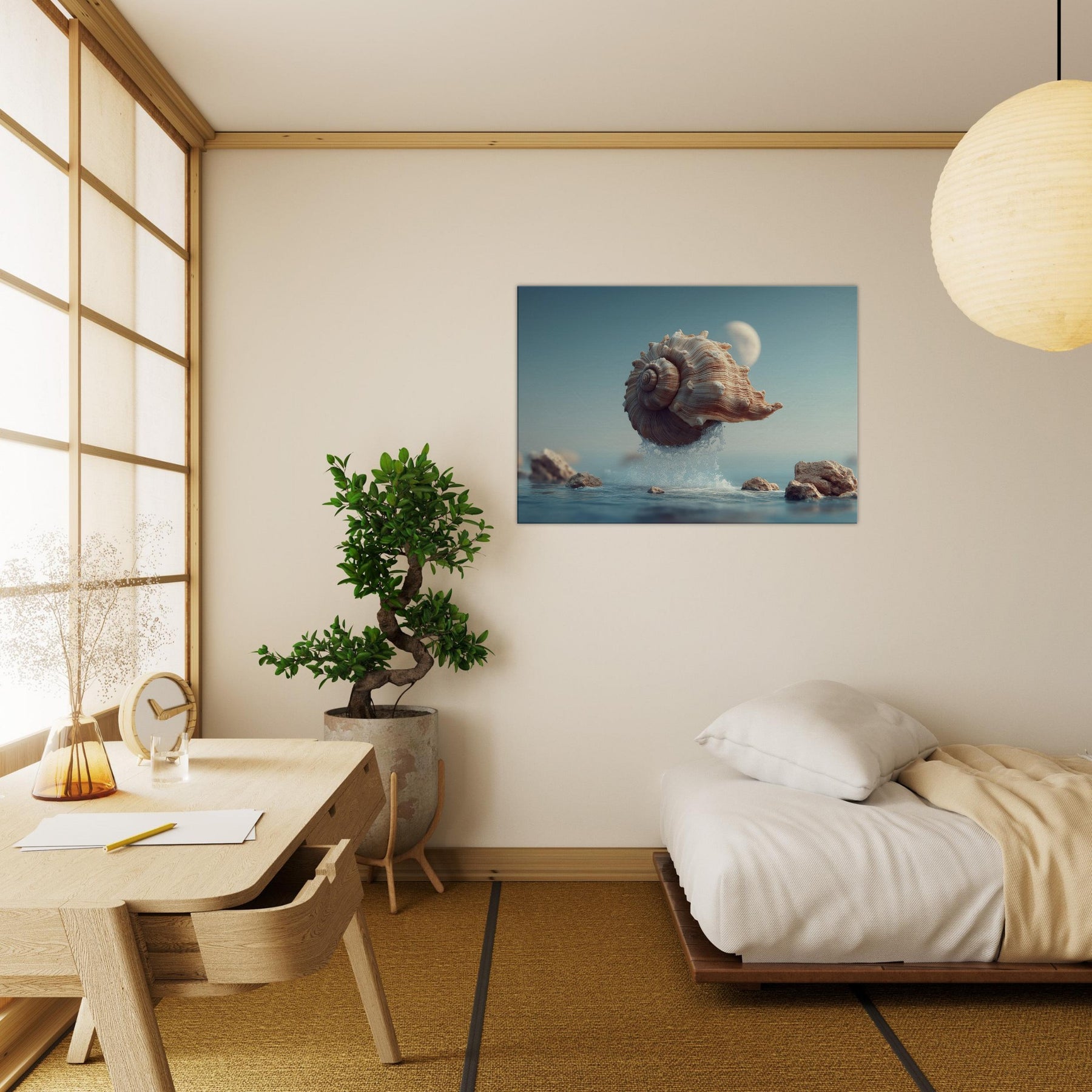 This surreal scene centers a Seashell as it lifts from the surface, alight with moonlit tones and curling ridges that echo whispered currents. Surrounded by crystalline spray and softened rocks, it glides through a quiet, dreamlike horizon an atmosphere of calm, curiosity, and stillness. Perfect for a living room or bedroom, the piece brings organic texture, subtle warmth, and a sense of gentle astonishment, inviting reflective pauses as light changes across its spiraled form.