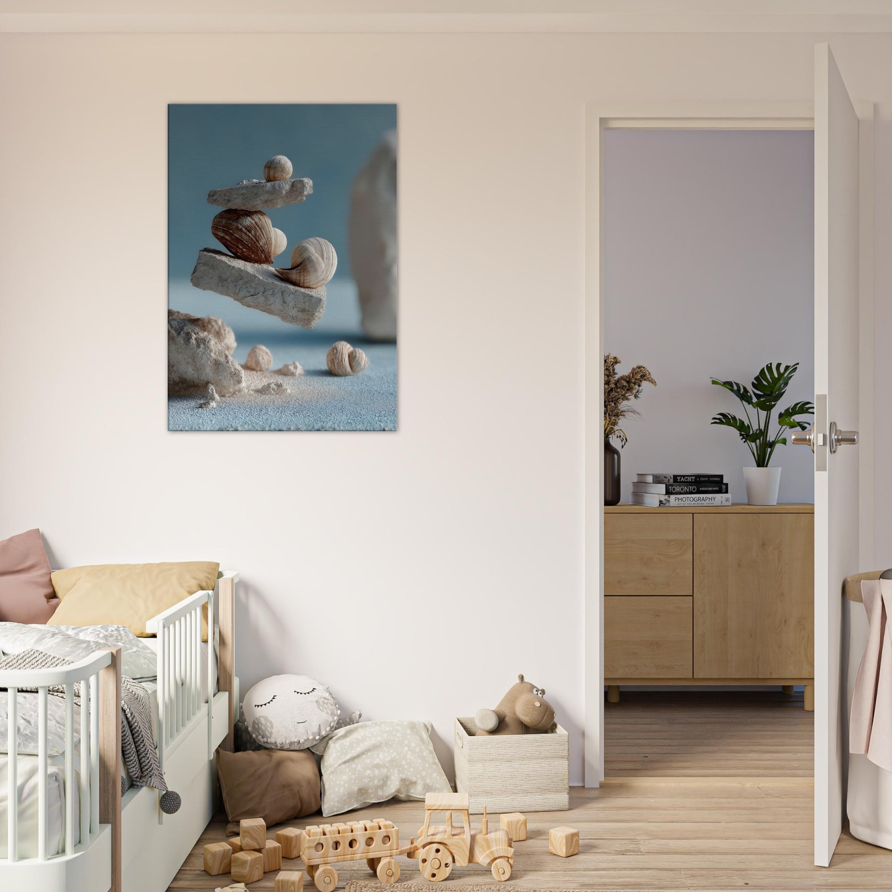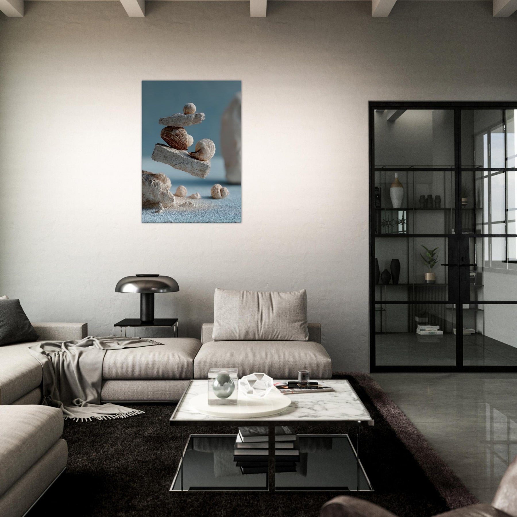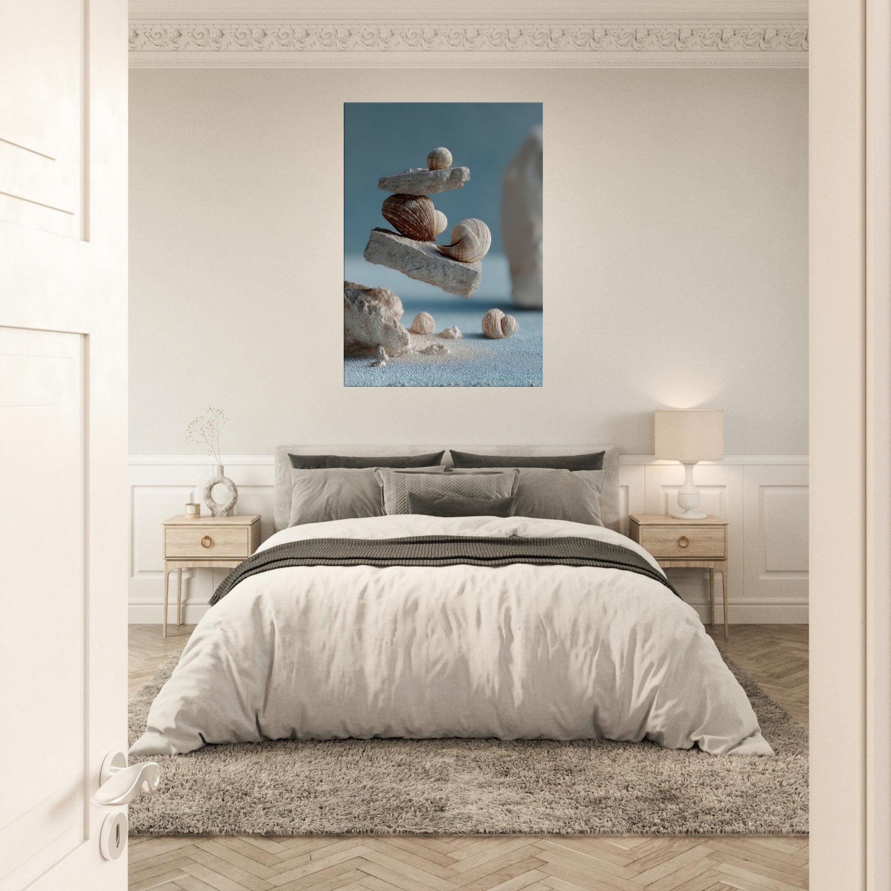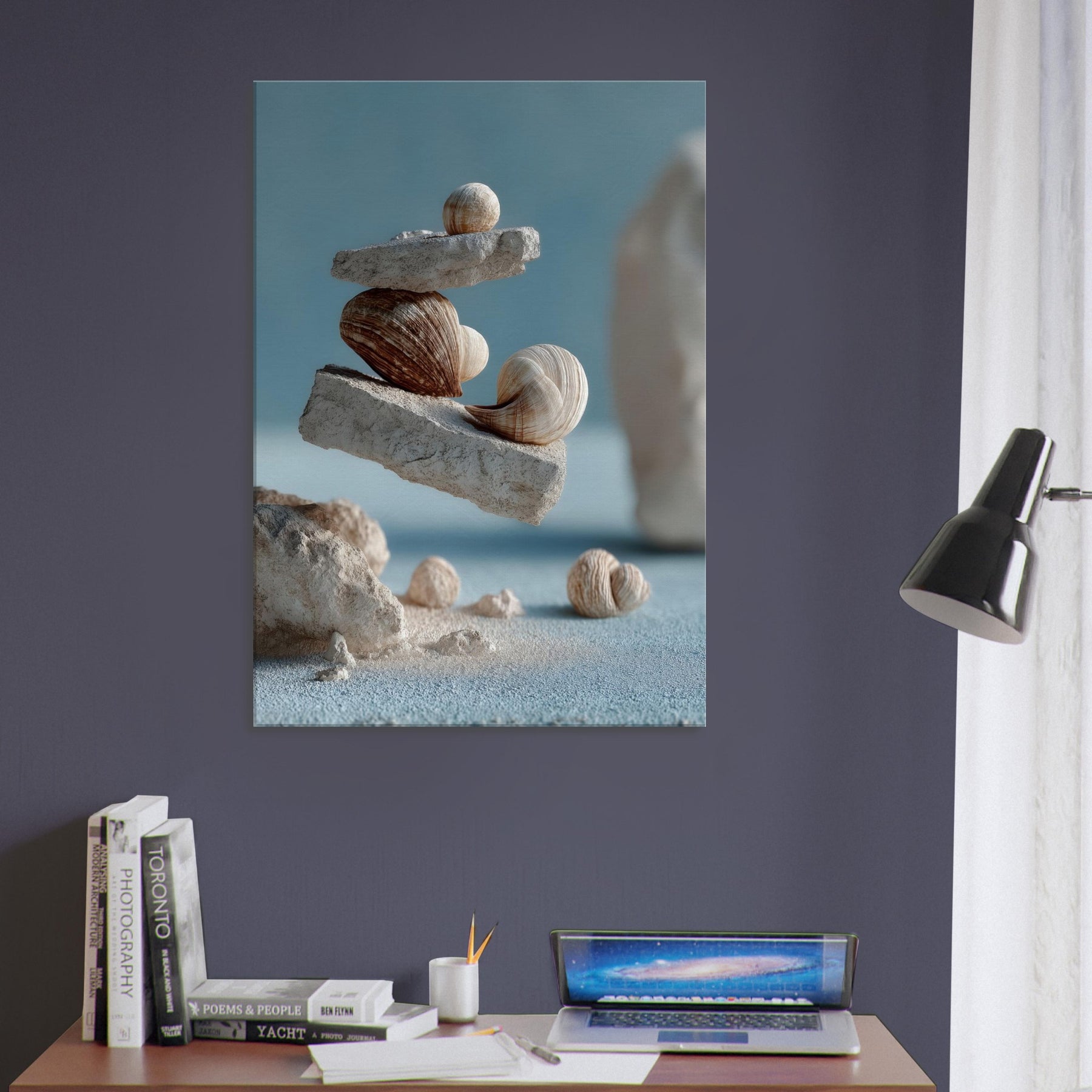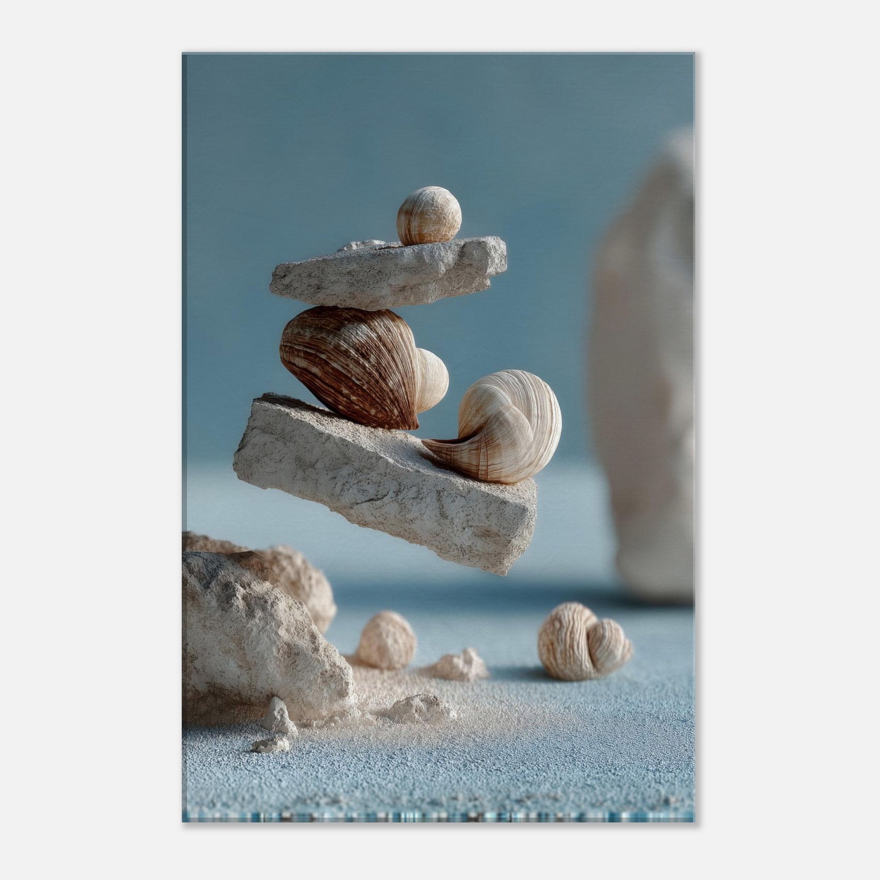 An otherworldly meditation on balance, this surreal composition layers weathered seashells between airy slate blocks, suspended as if gravity has softened its pull. The tactile ridges, sandy tones, and muted blues invite a slow, coastal breath into your living space, turning a wall into a quiet shoreline. In a living room or study, the piece awakens memory of tides and morning light, offering a focal point that glows with quiet wonder and pairs seamlessly with natural textures and mineral neutrals.