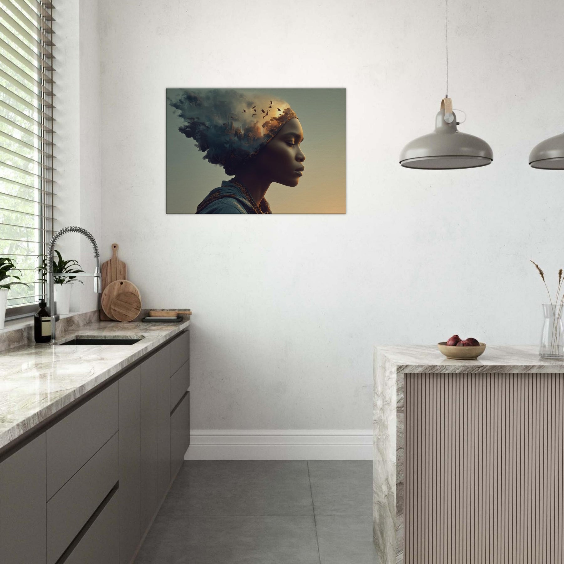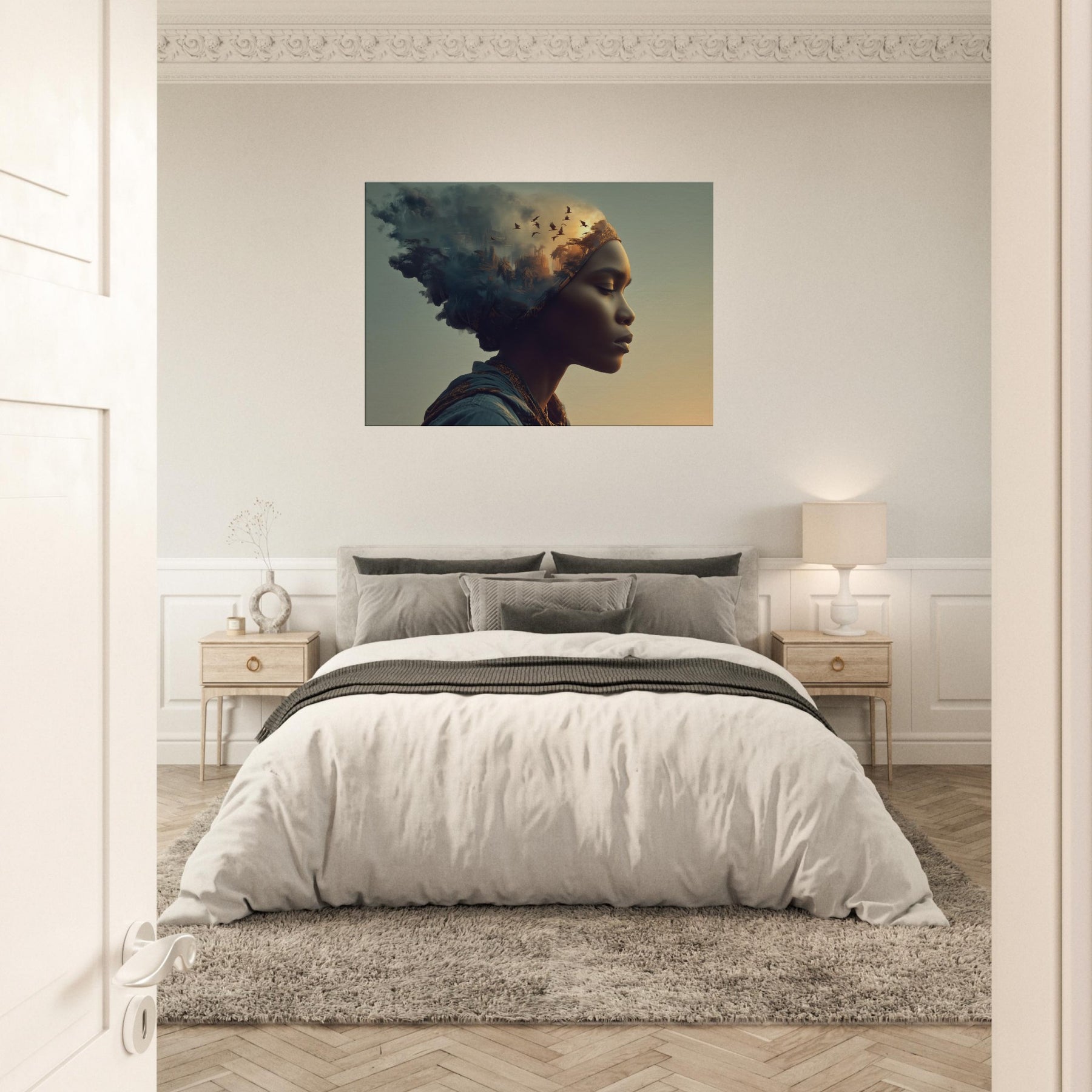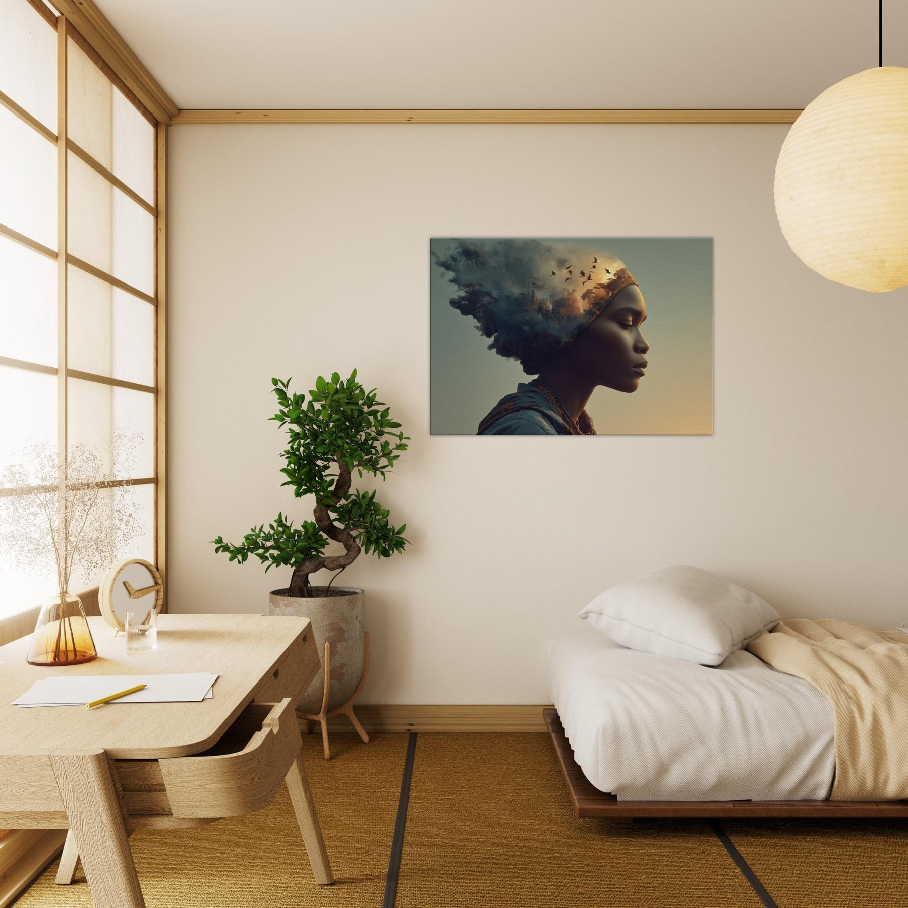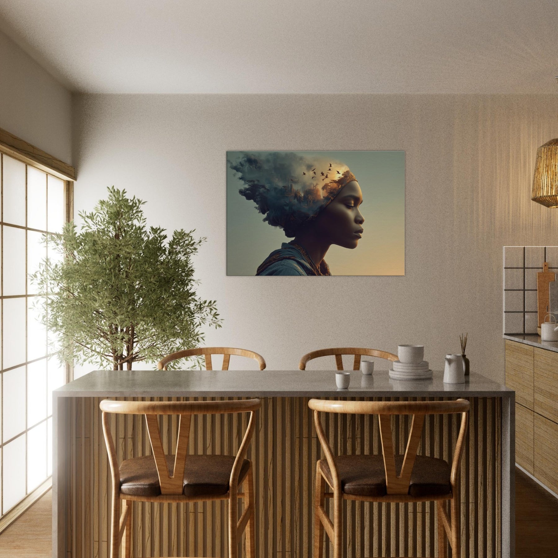 An African Woman unfolds as a living dream soft profile breathing with a of forests, cities, and birds that linger where the forehead meets the crown. The surreal melding of nature and form bathes a room in warm dusk light, inviting quiet contemplation and a sense of expansive calm. This piece elevates any living space with texture, atmosphere, and a poetic pulse that pairs effortlessly with modern furnishings. A striking centerpiece for salons, bedrooms, or study walls, it transforms everyday spaces into imagined journeys.