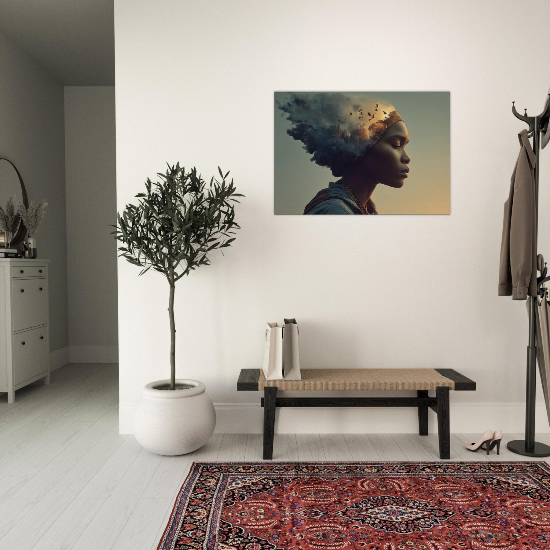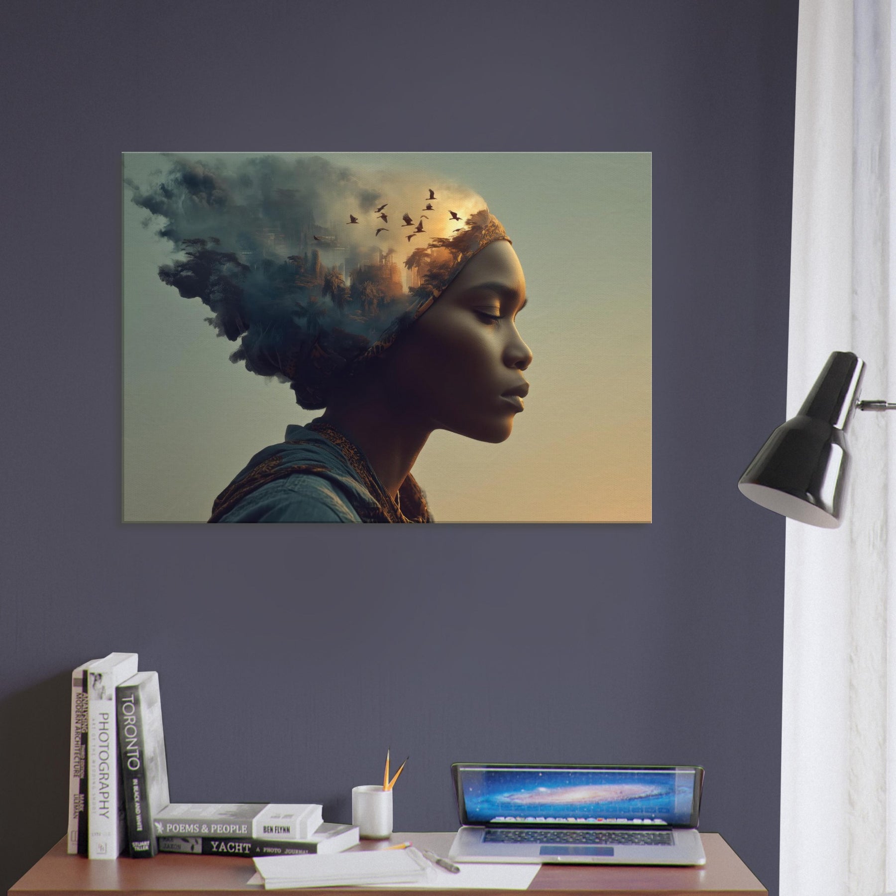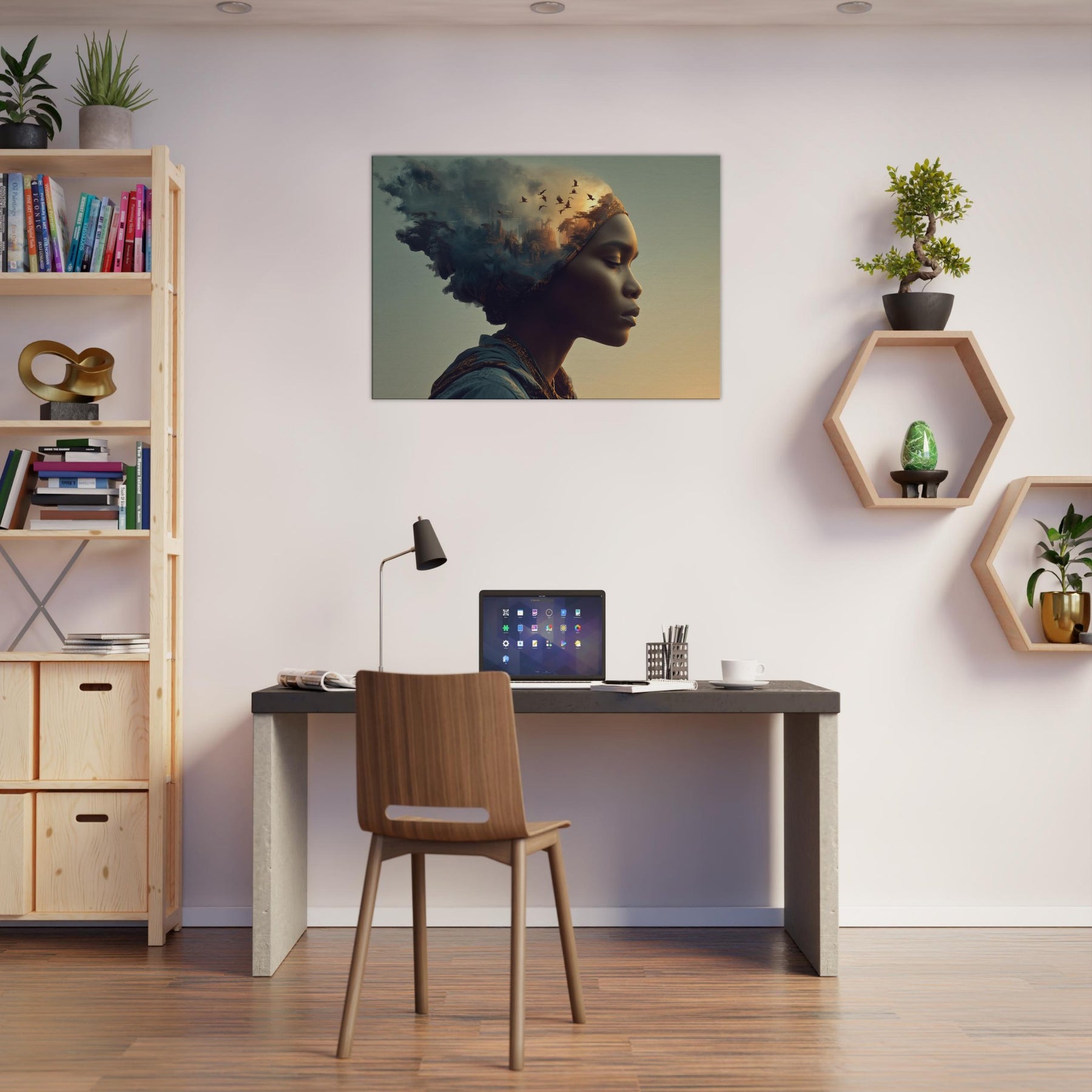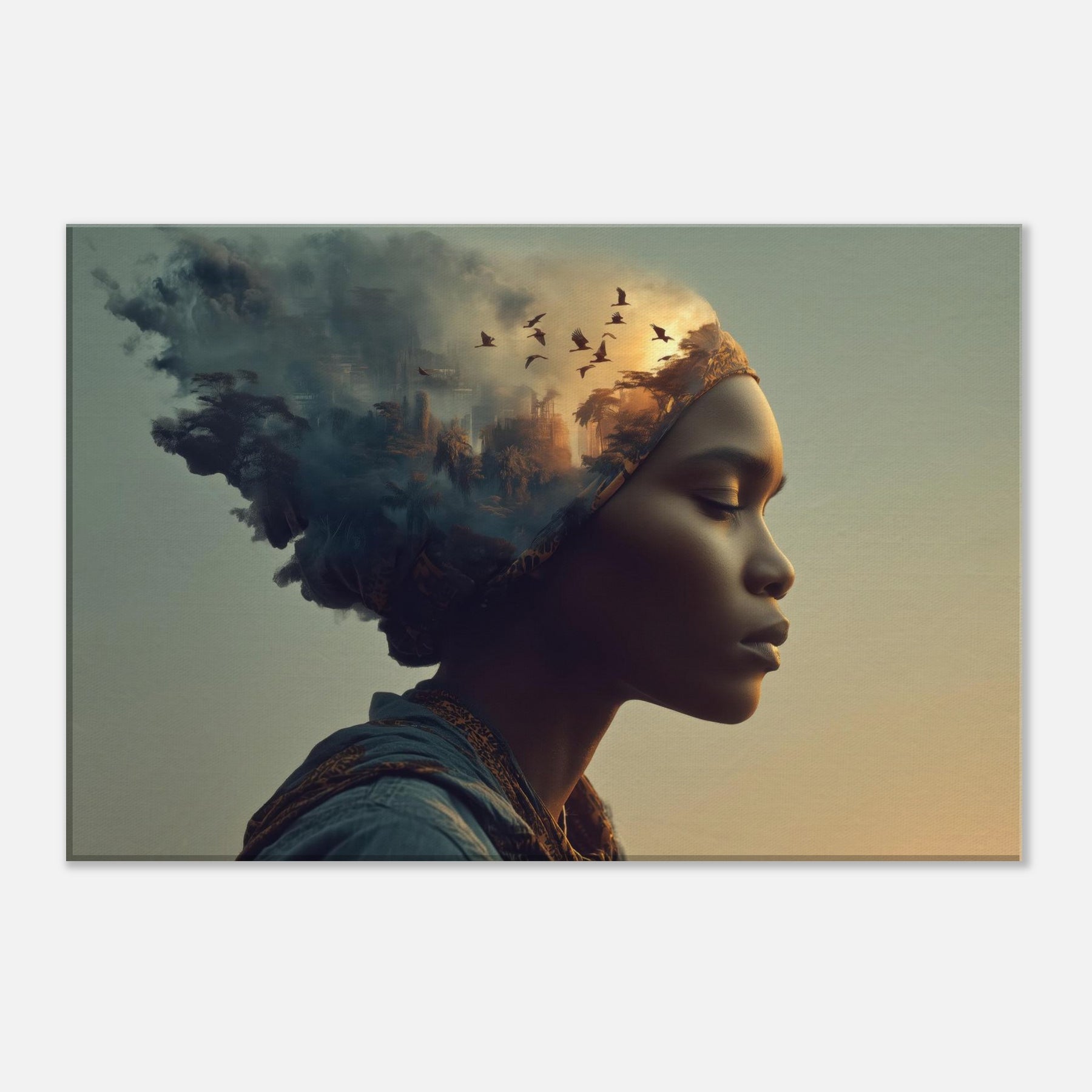 An African Woman unfolds as a living dream soft profile breathing with a of forests, cities, and birds that linger where the forehead meets the crown. The surreal melding of nature and form bathes a room in warm dusk light, inviting quiet contemplation and a sense of expansive calm. This piece elevates any living space with texture, atmosphere, and a poetic pulse that pairs effortlessly with modern furnishings. A striking centerpiece for salons, bedrooms, or study walls, it transforms everyday spaces into imagined journeys.