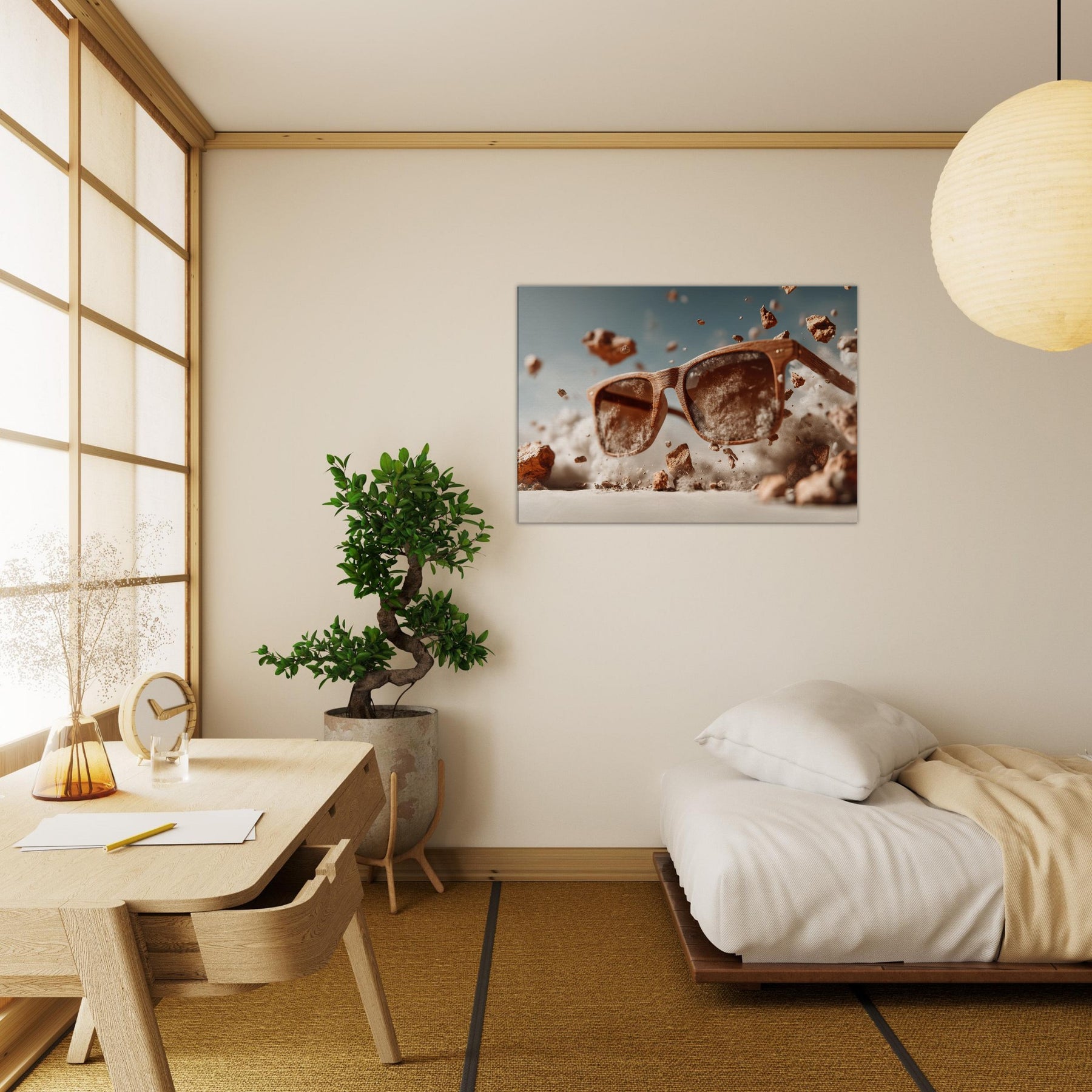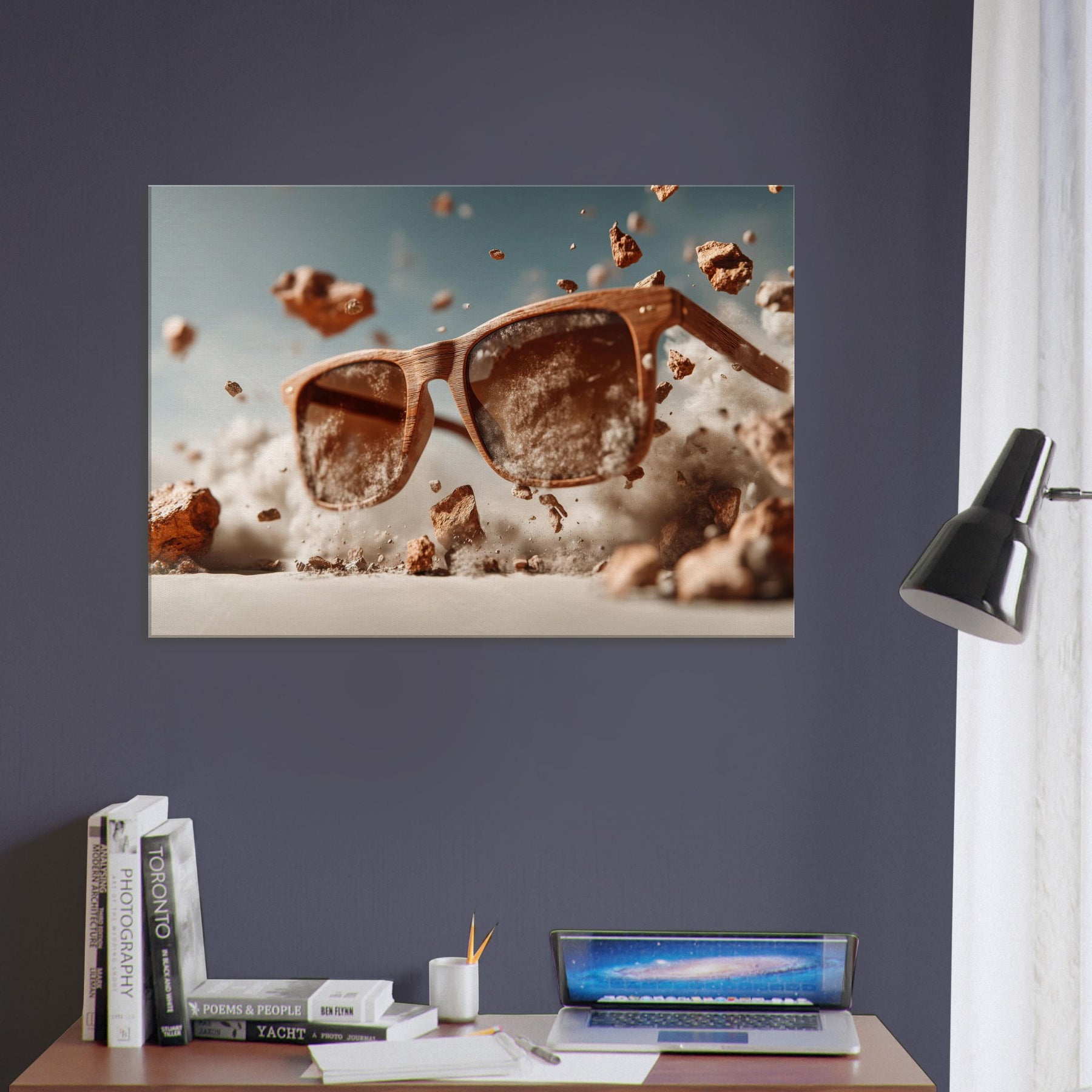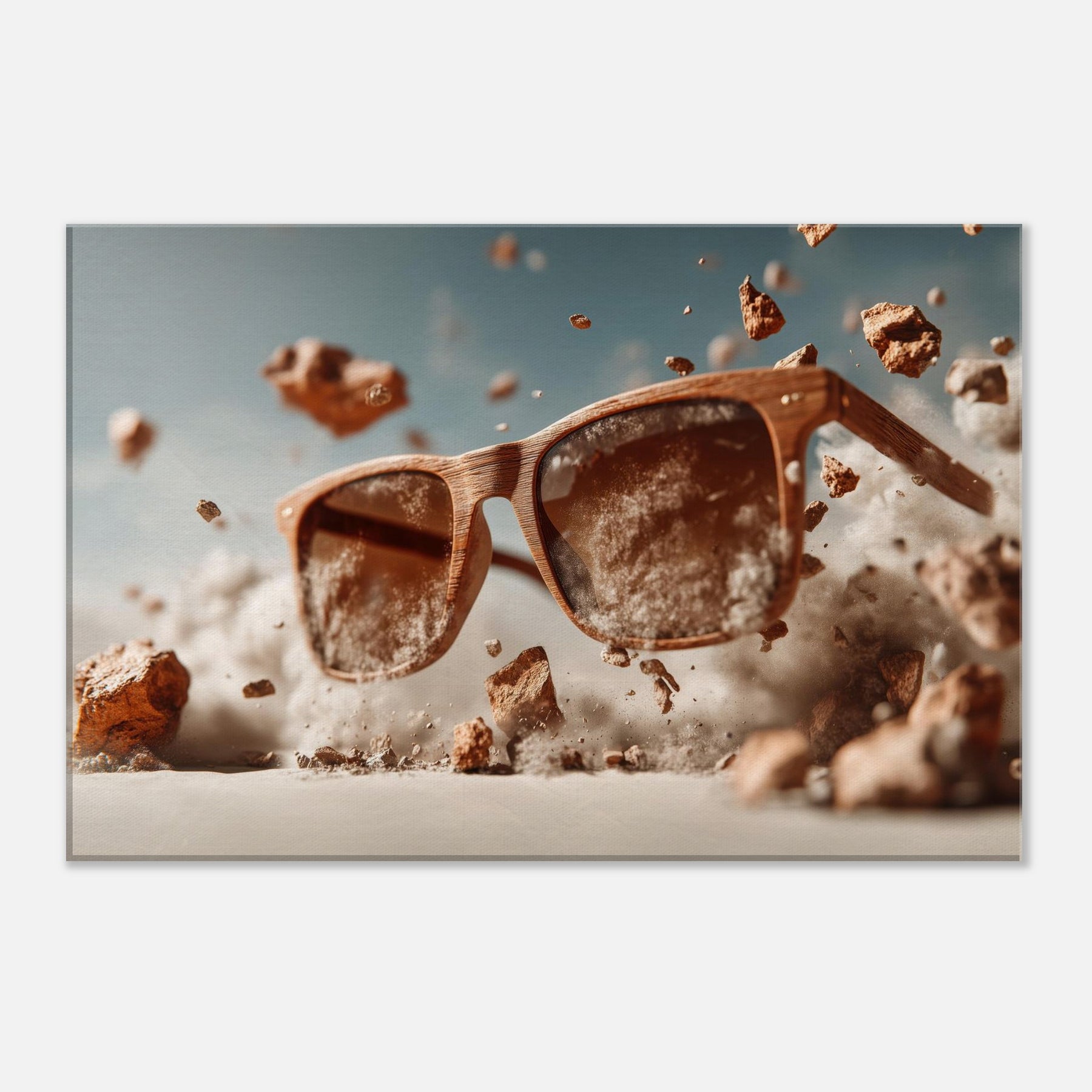 Between function and fantasy, a pair of sunglasses drifts through a wind blown desert of light. The scene suspends the ordinary in mid air, turning a familiar object into a portal for mood and memory. Wooden frames glow with quiet warmth as dust, pebbles, and pale clouds swirl around them, inviting the eye to linger and imagine. This piece invites living spaces to breathe with curiosity, soft shadows, and a touch of daring, transforming everyday scenery into a doorway for reflection and conversation.