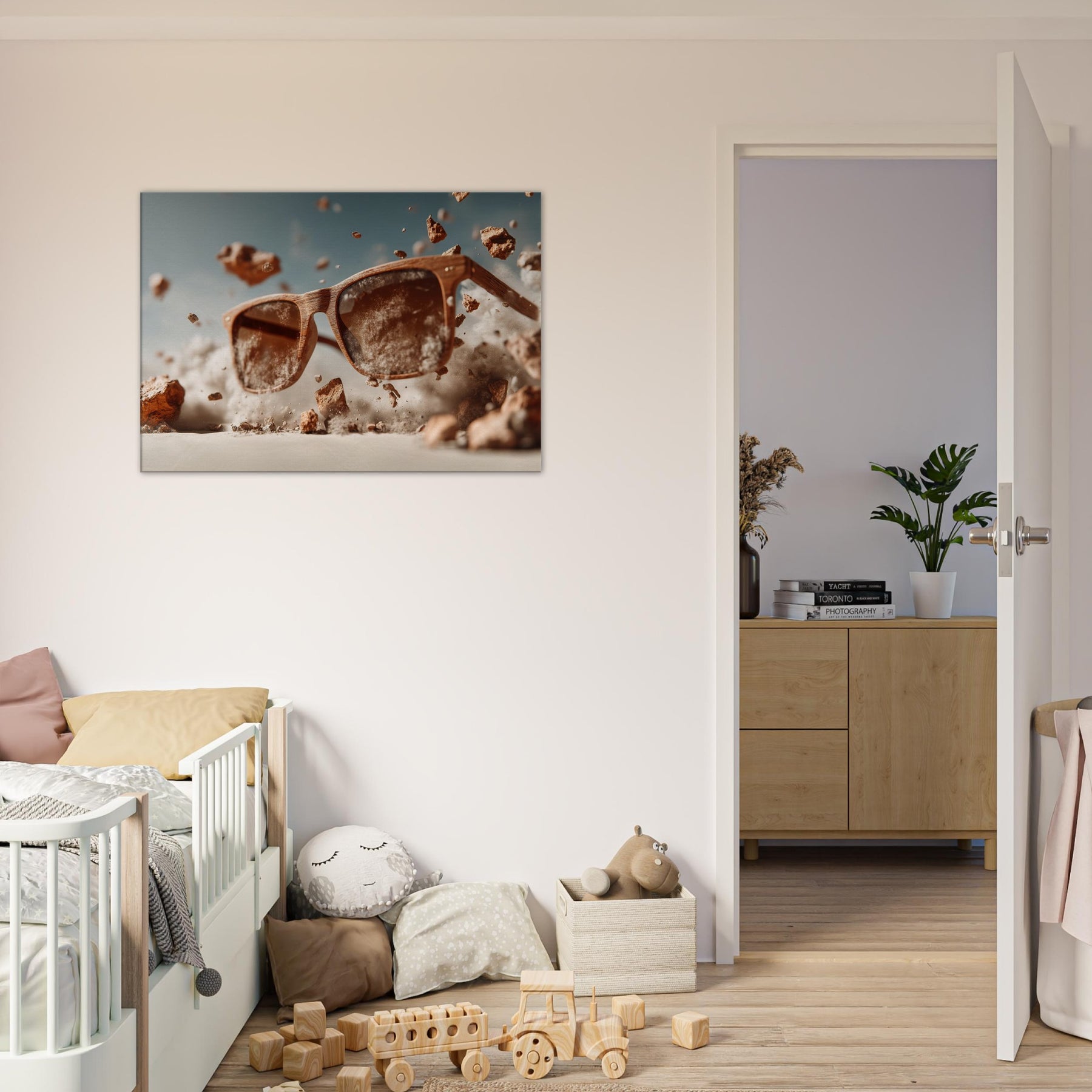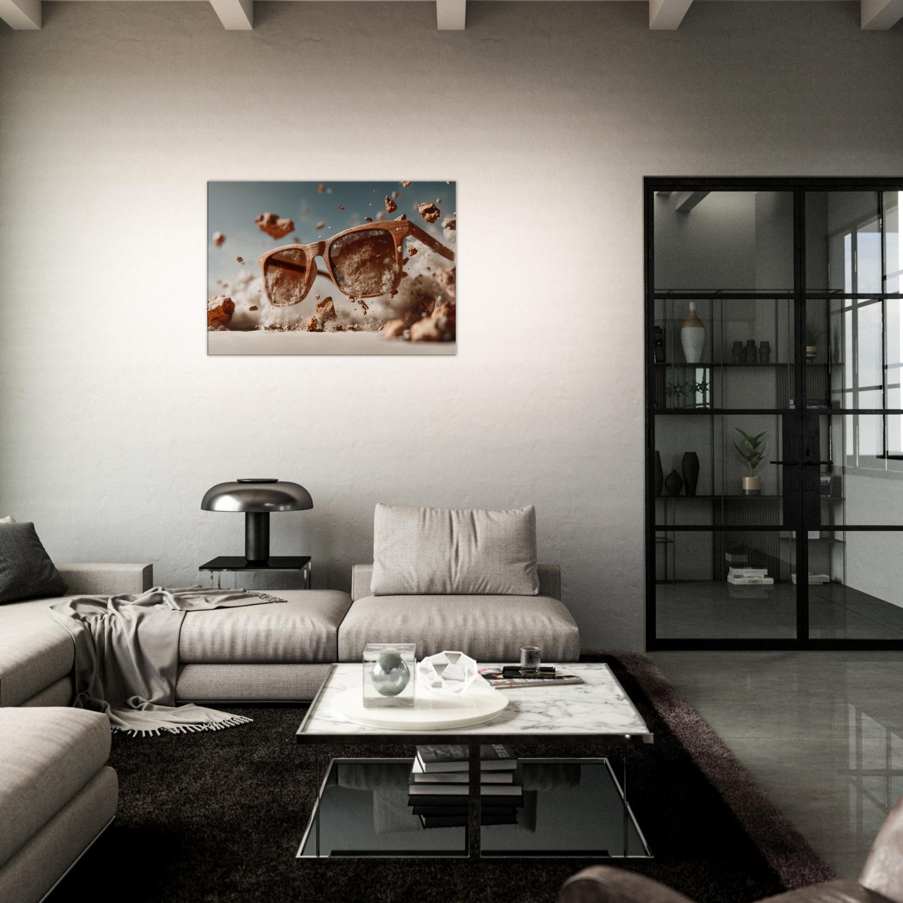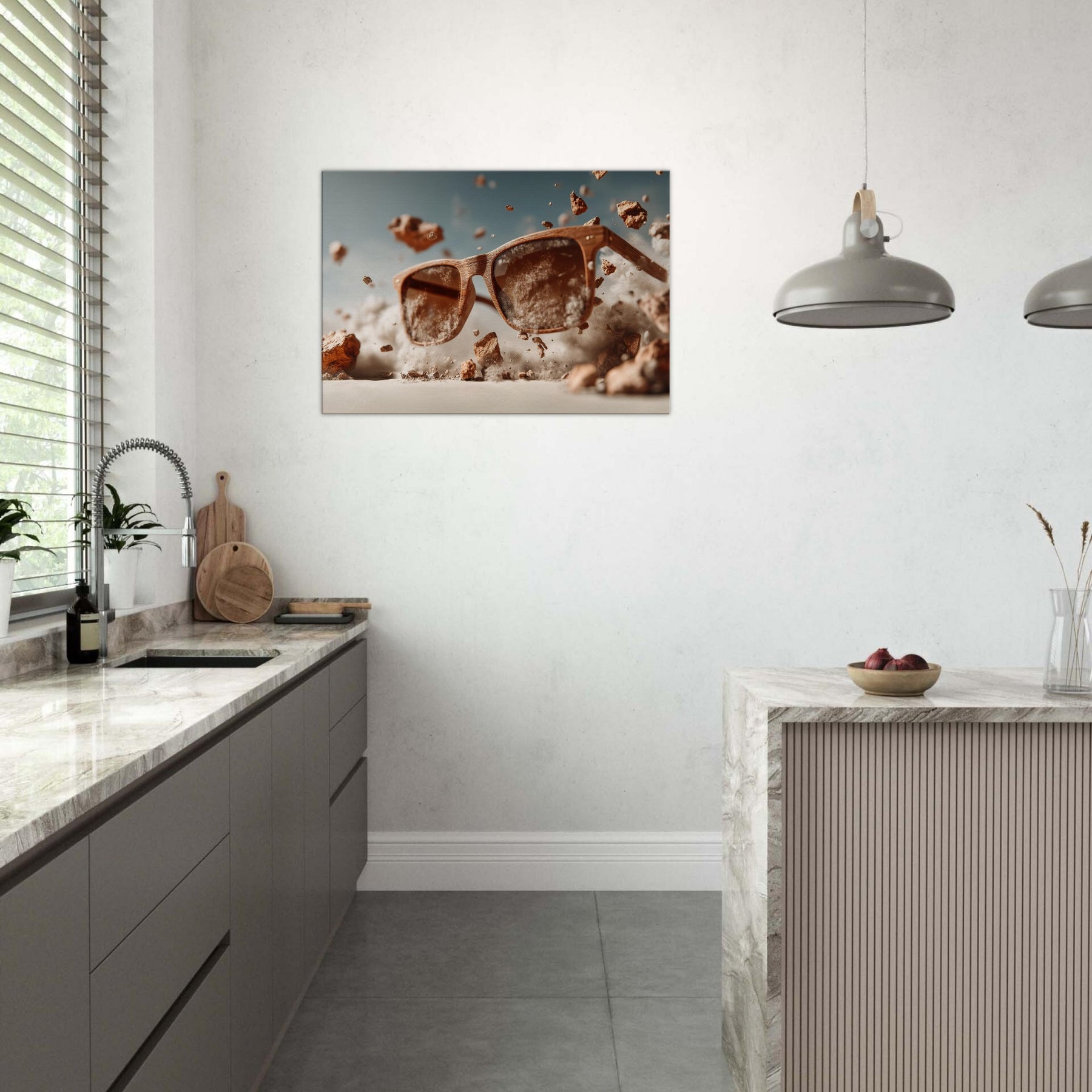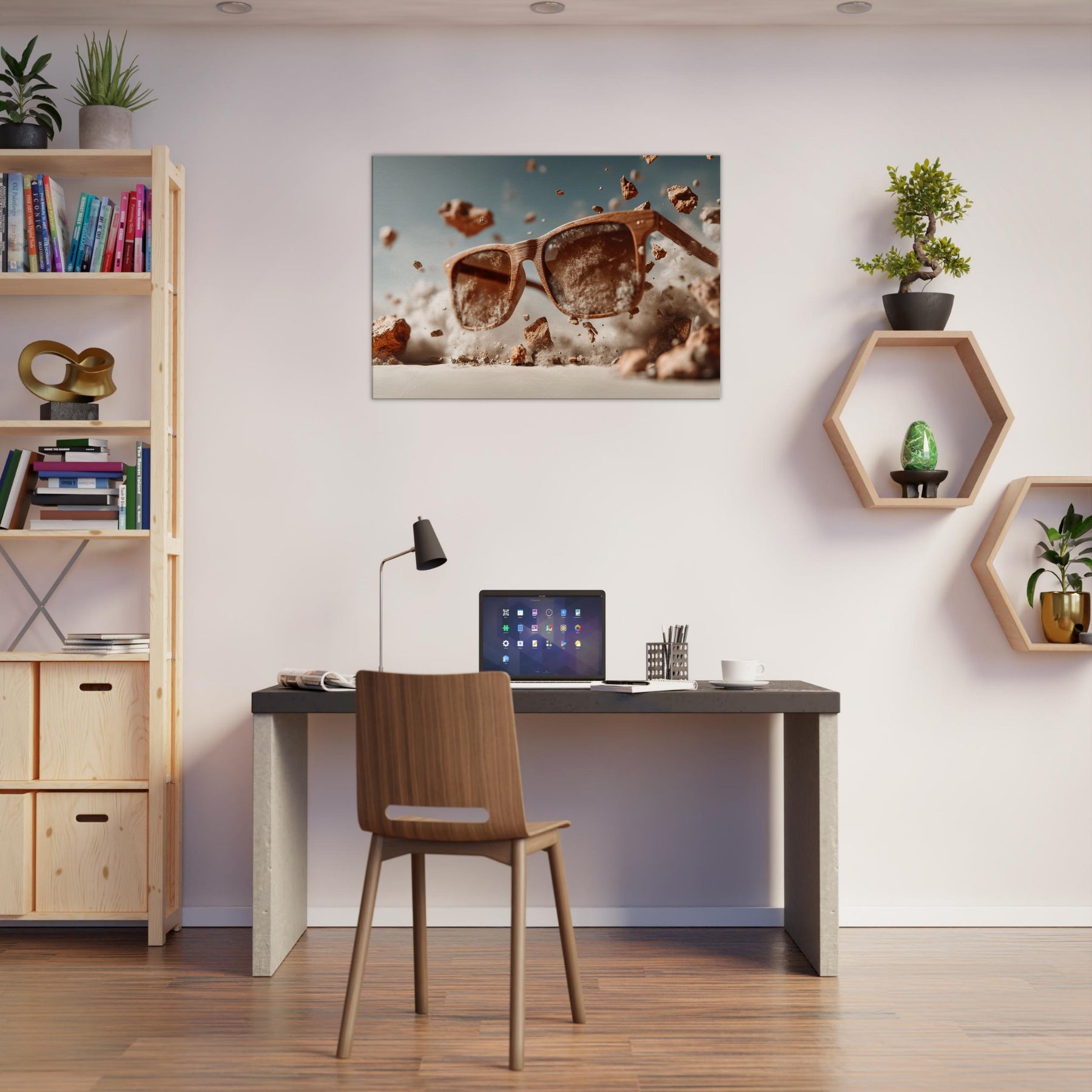 Between function and fantasy, a pair of sunglasses drifts through a wind blown desert of light. The scene suspends the ordinary in mid air, turning a familiar object into a portal for mood and memory. Wooden frames glow with quiet warmth as dust, pebbles, and pale clouds swirl around them, inviting the eye to linger and imagine. This piece invites living spaces to breathe with curiosity, soft shadows, and a touch of daring, transforming everyday scenery into a doorway for reflection and conversation.