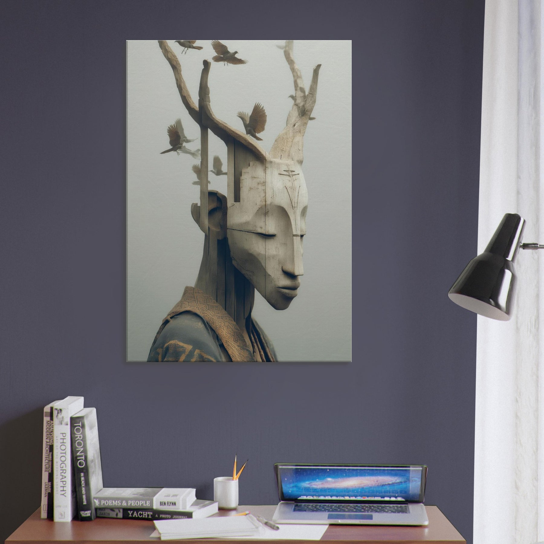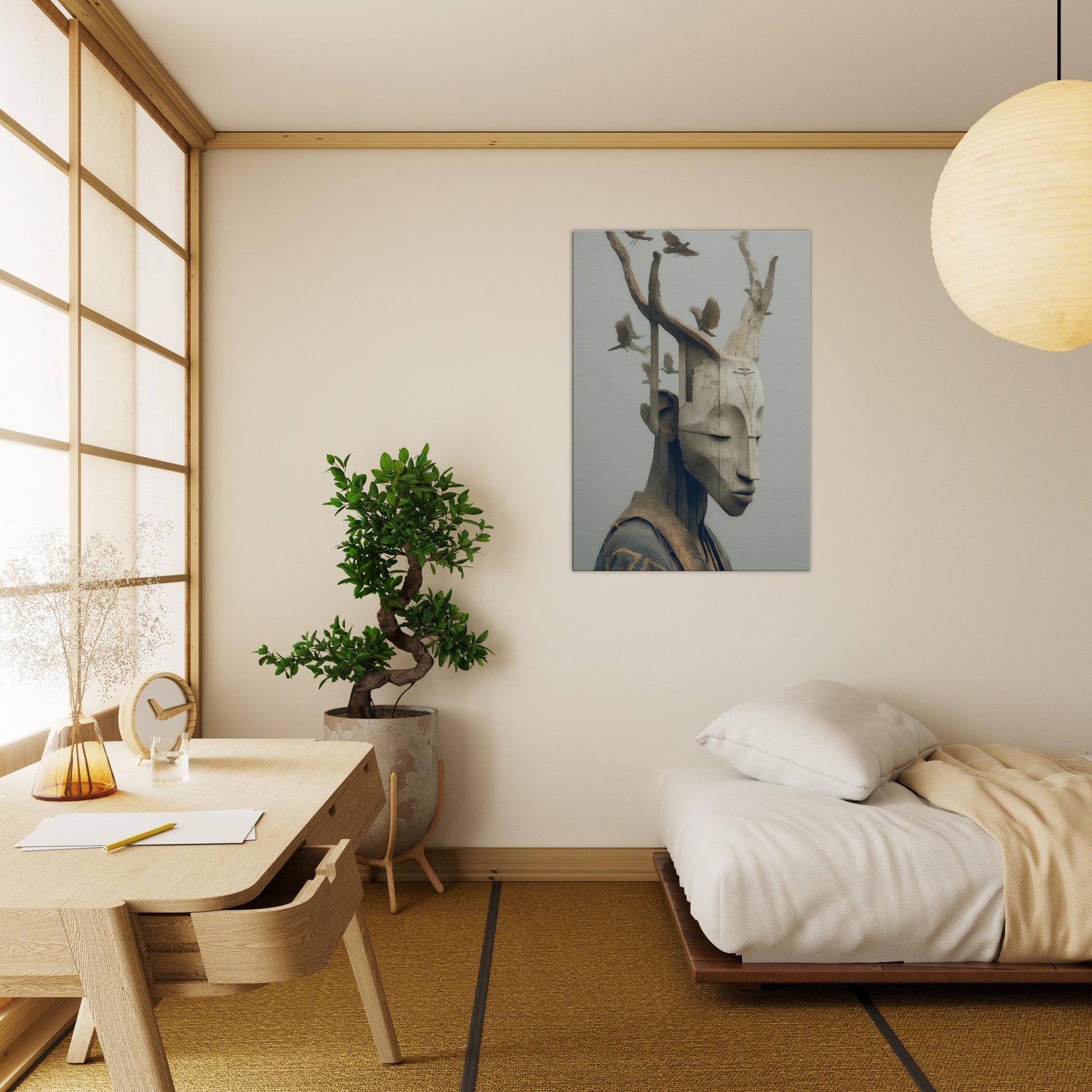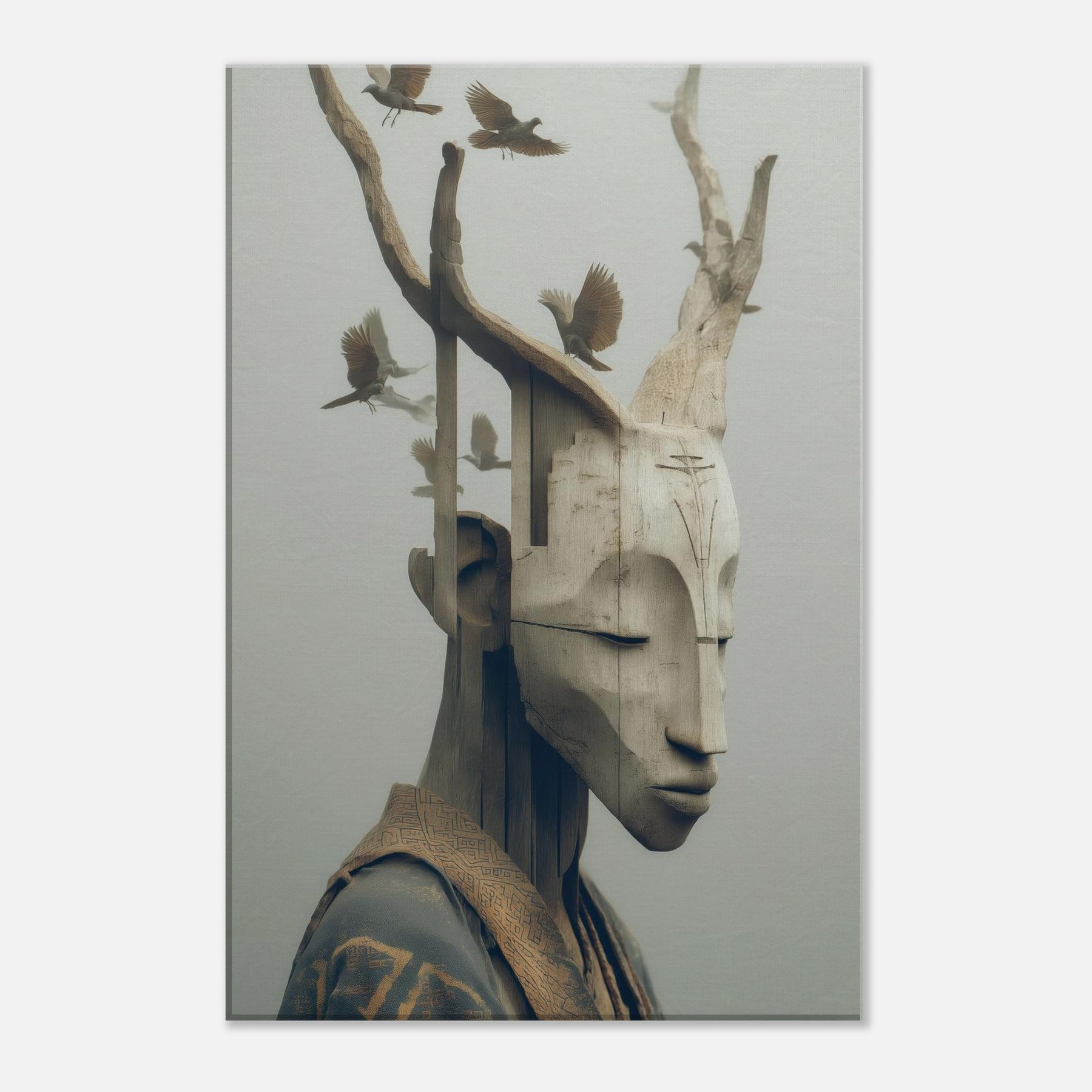An ethereal where a tribal mask becomes a doorway between memory and myth. The carved features soften into pale wood grain as delicate birds take flight from the branches, turning the face into a shifting . This surreal synthesis invites a calm, contemplative atmosphere perfect for a quiet corner, a hallway or above a sofa. The piece lends an organic warmth to modern interiors, catching light with subtle depth and inviting slow, mindful moments as you gather, breathe, and dream.