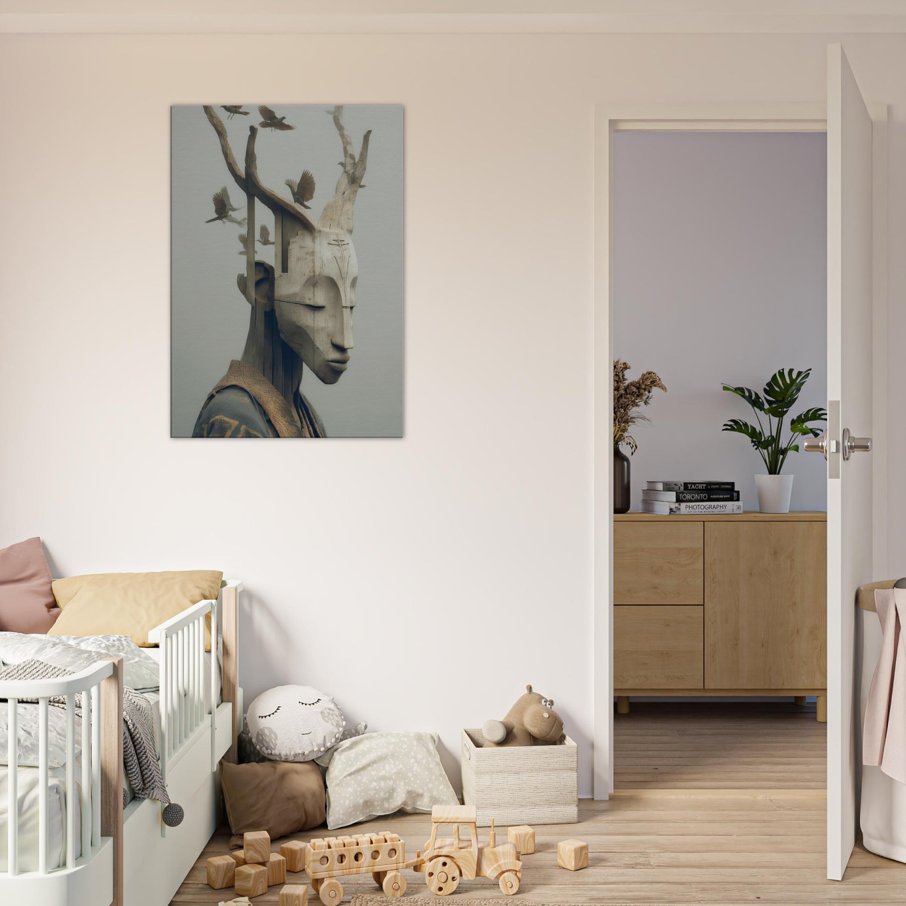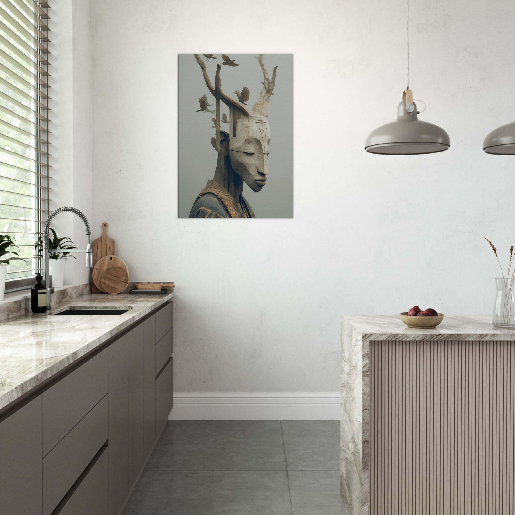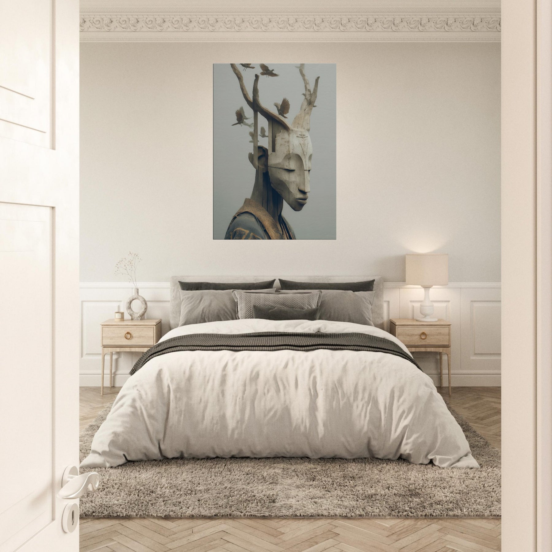 An ethereal where a tribal mask becomes a doorway between memory and myth. The carved features soften into pale wood grain as delicate birds take flight from the branches, turning the face into a shifting . This surreal synthesis invites a calm, contemplative atmosphere perfect for a quiet corner, a hallway or above a sofa. The piece lends an organic warmth to modern interiors, catching light with subtle depth and inviting slow, mindful moments as you gather, breathe, and dream.