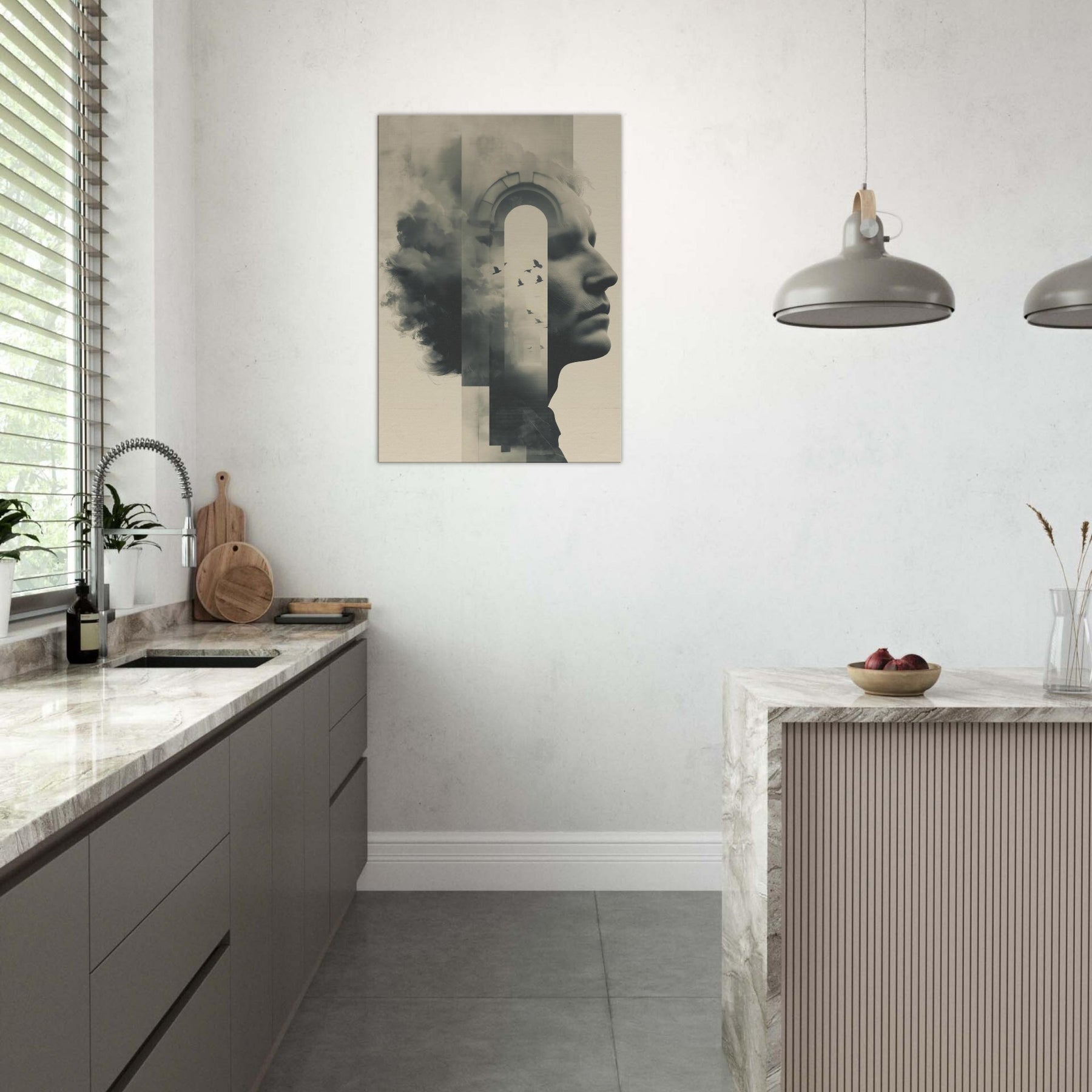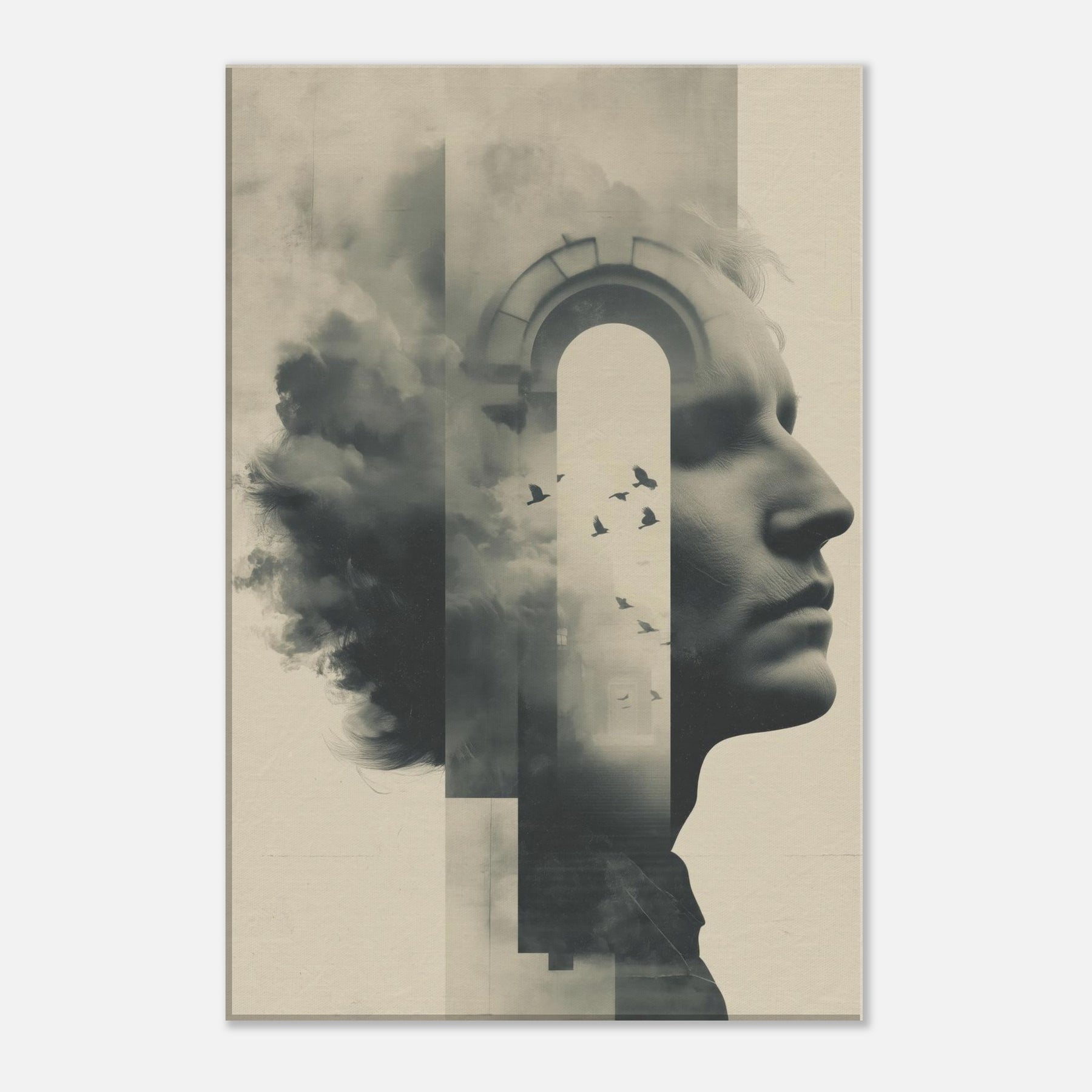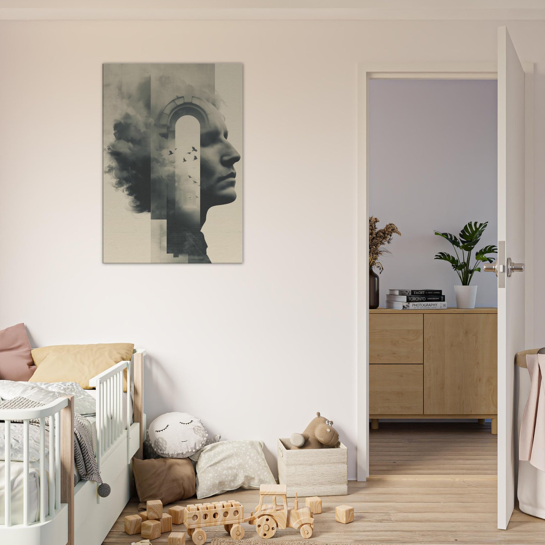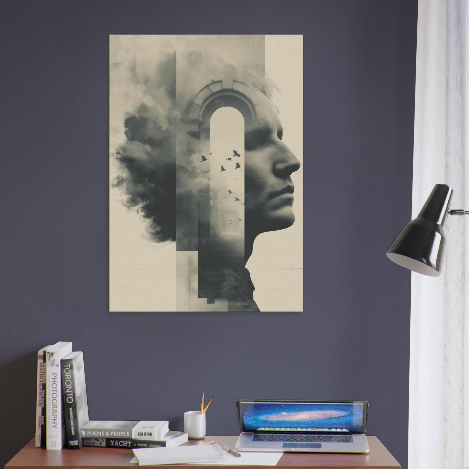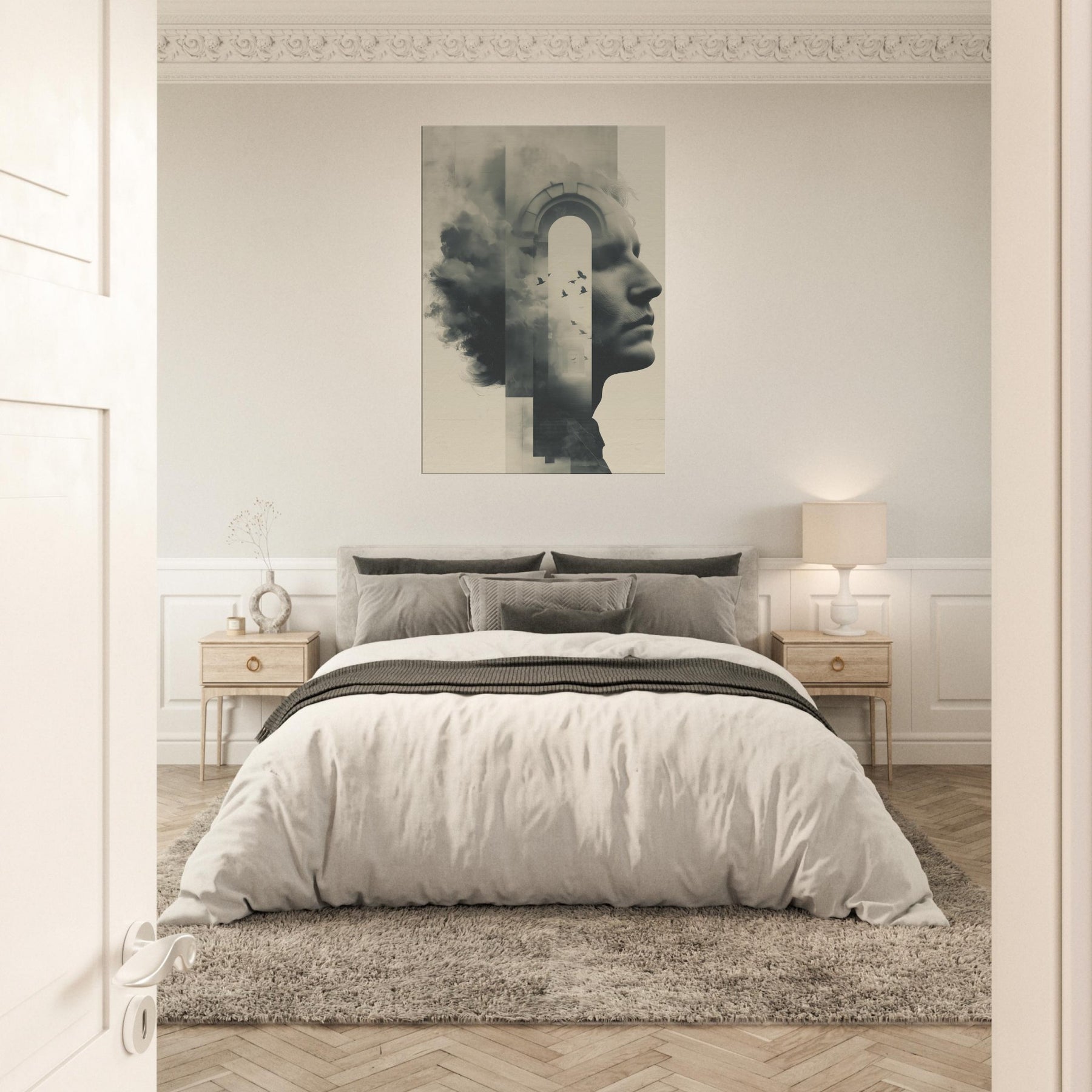 Arches Composition unfurls across a dream tinged plane where a sculpted profile greets drifting clouds and a flock of birds. A towering arch and geometric planes carve space for memory and longing, while muted tones and soft gradients invite stillness. The composition settles like a whisper in a living room, turning walls into a window of contemplation. Perfect for a quiet corner or gallery inspired hallway, it infuses the room with surreal grace, intimate presence, and architectural poetry.